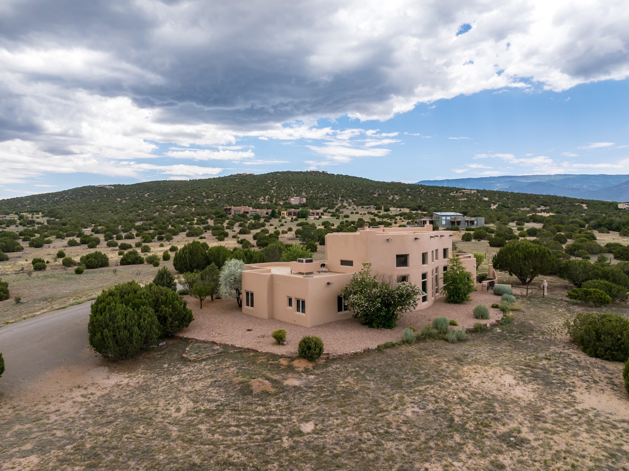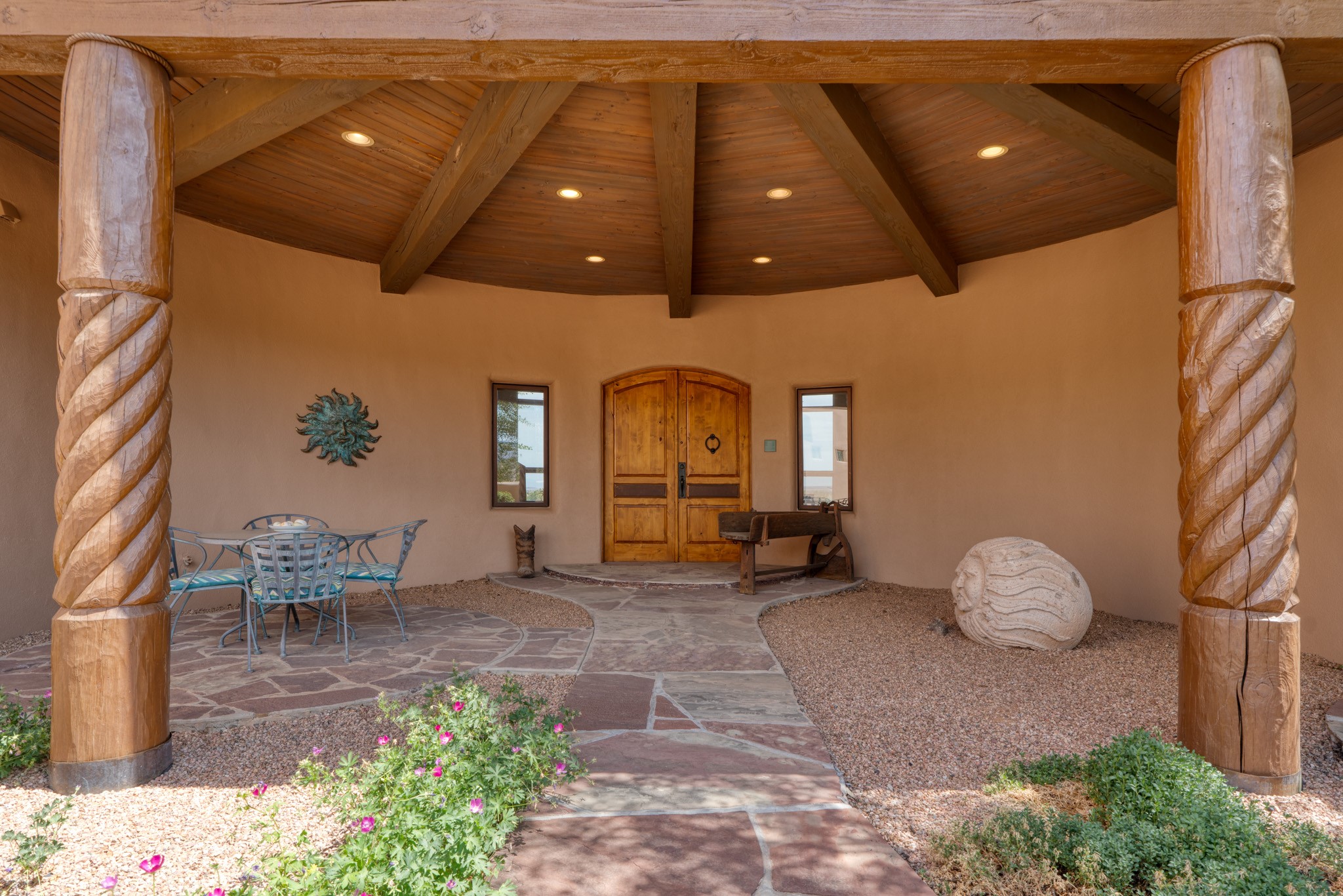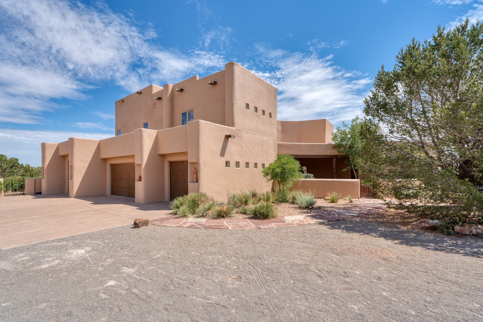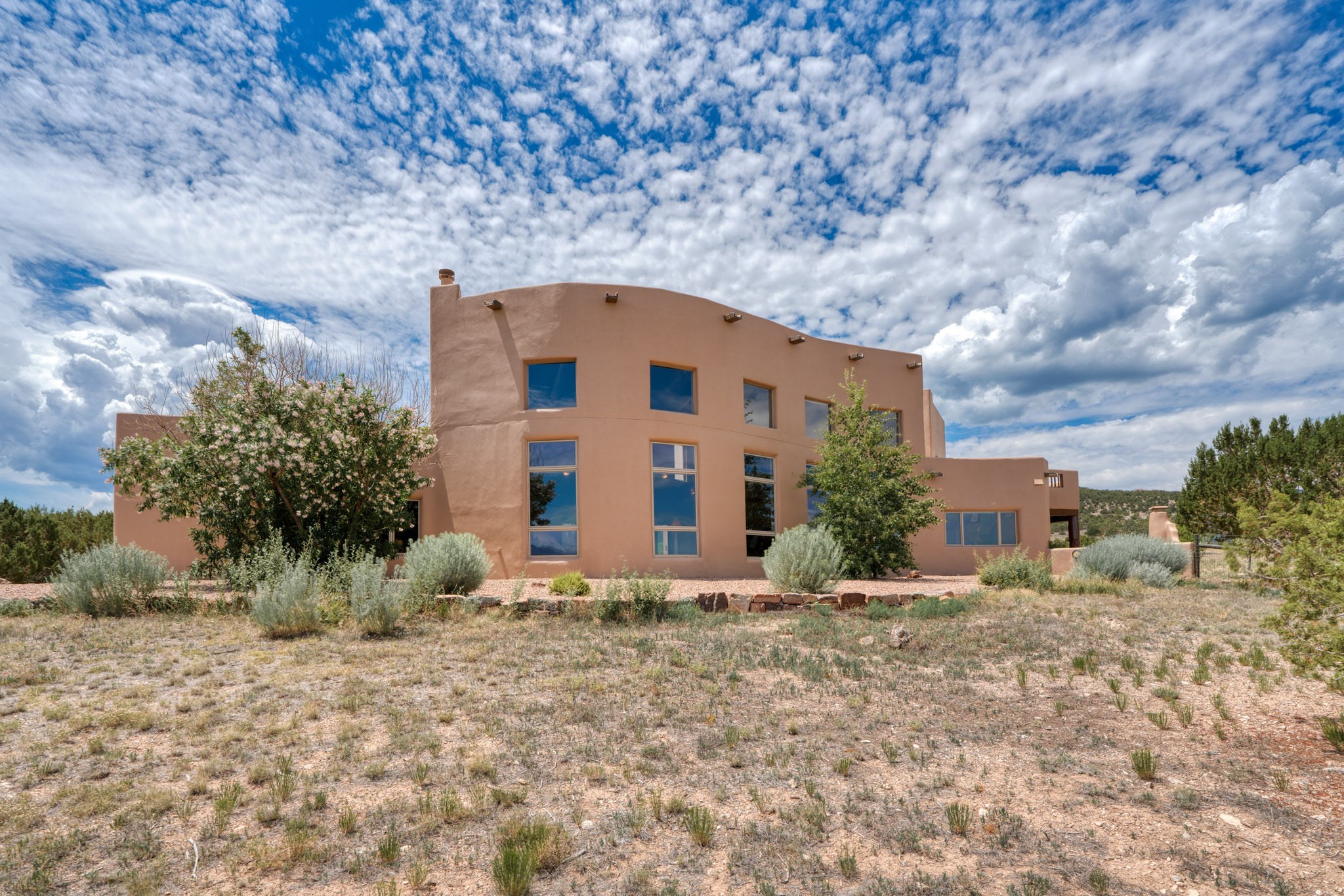 Imagine a home designed to capture the essence of East Mountain living on 10 acres, where expansive walls of glass blur the lines between indoors & out. This custom-built masterpiece boasts soaring ceilings with handcrafted wood beams that amplify light and openness, while every window offers a breathtaking vista. This beauty with a fabulous open floor plan, originally built for the builder, with many custom features. Certified Green Build with ICF Construction and Turkish travertine floors, Pella wood windows, magnificent 22' Kiva in Living room, Chef's kitchen with high-end Kitchen Aid appliances, Thermador Professional range, tons of counter space & butcher block island. Covered patio with kiva fireplace, 4-car oversized garage, fenced yard (2/3 ac) Roof-top deck on 10 acres.