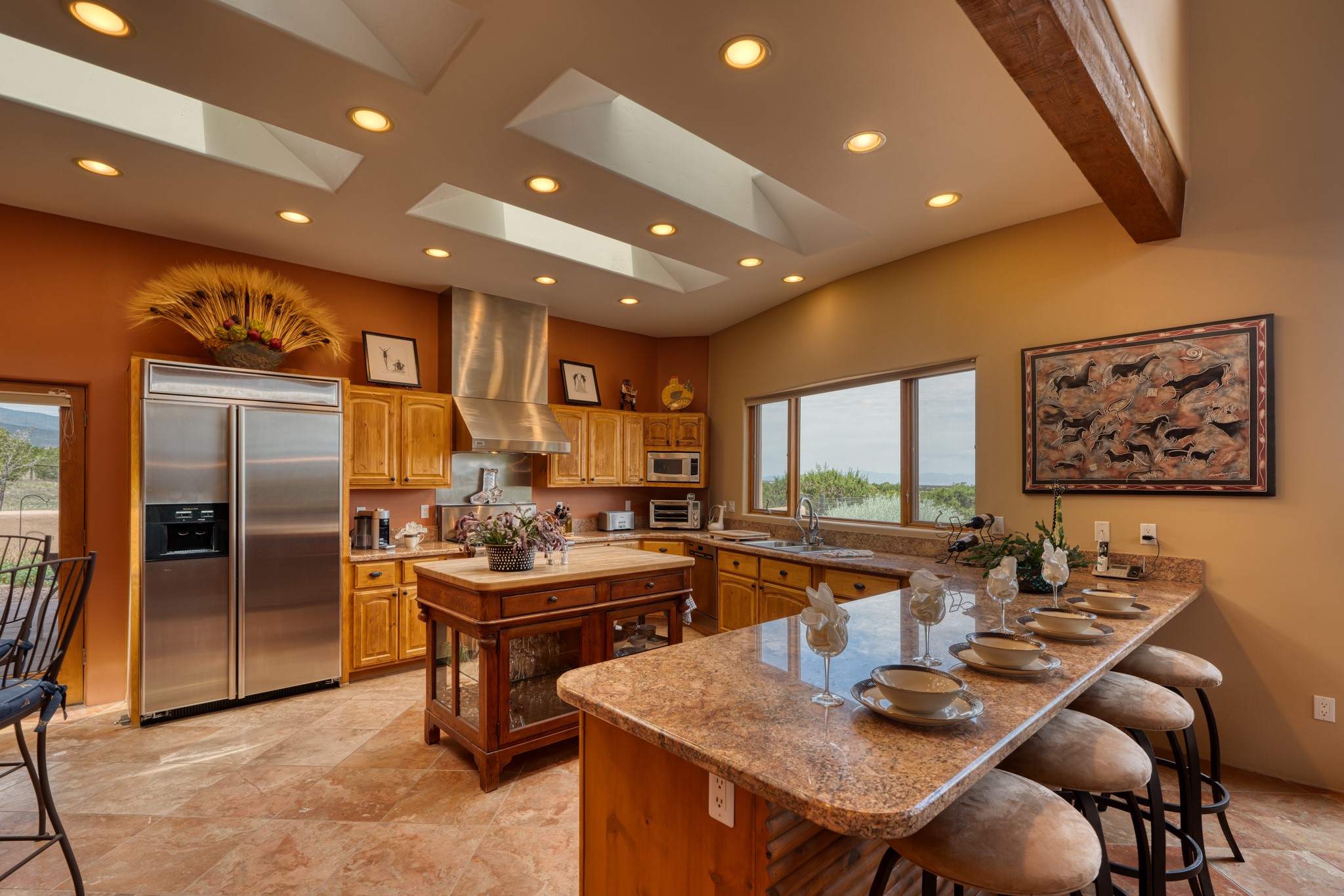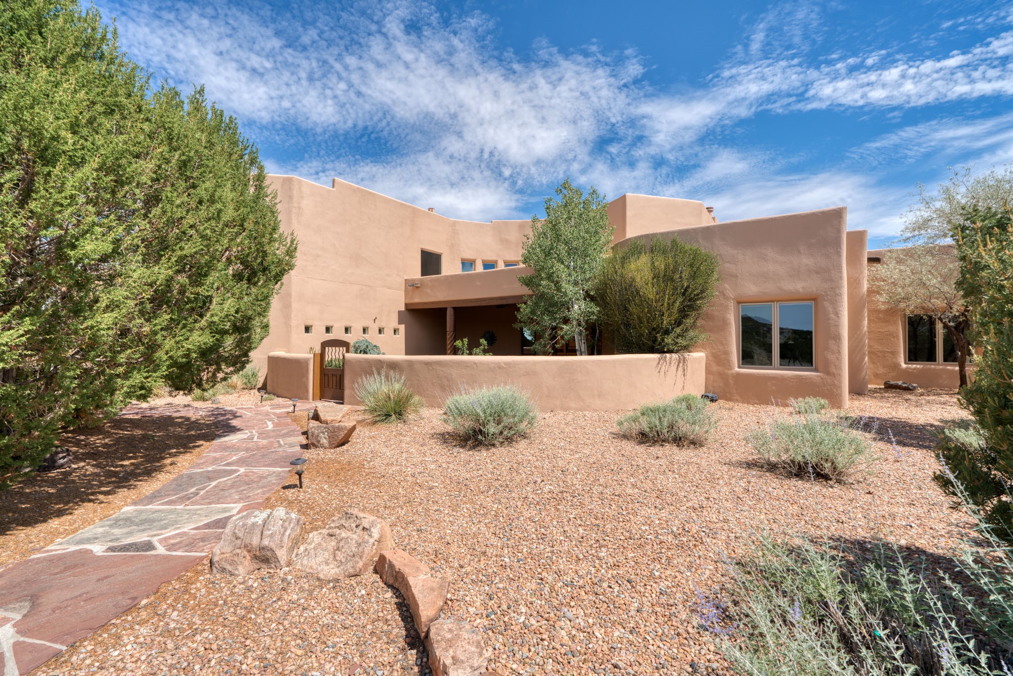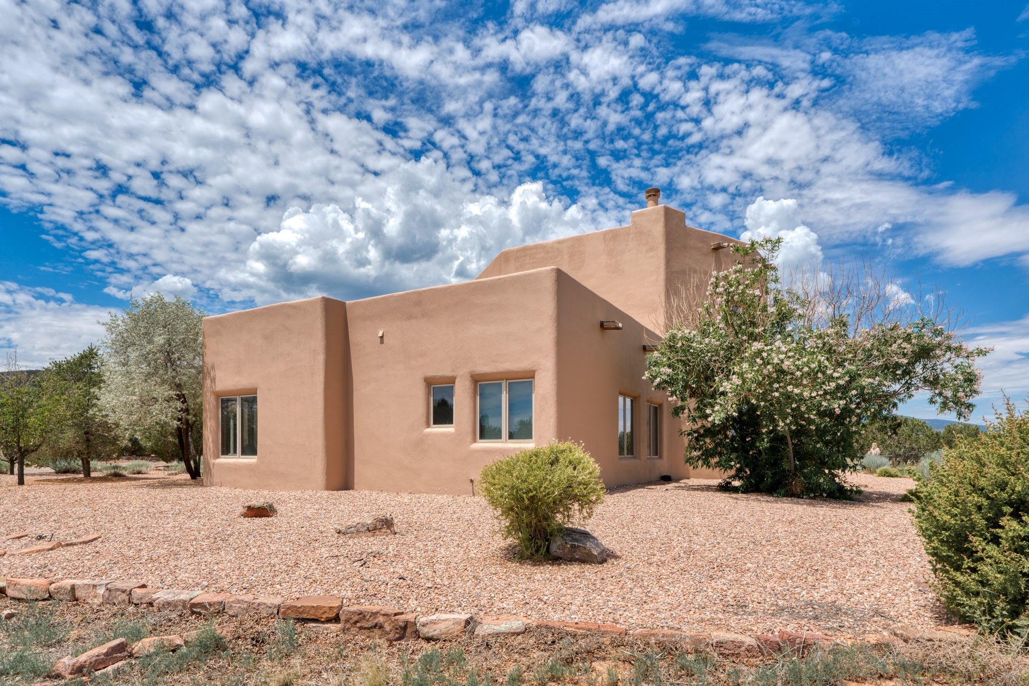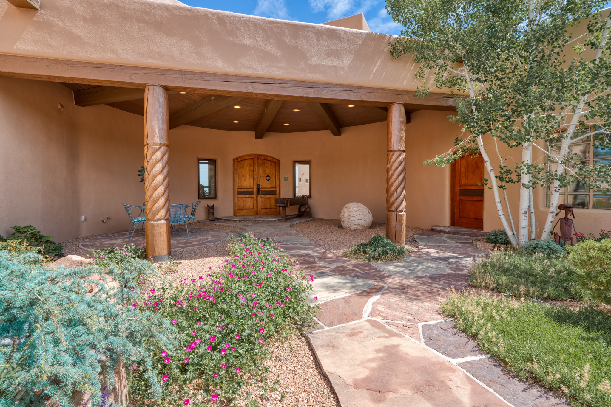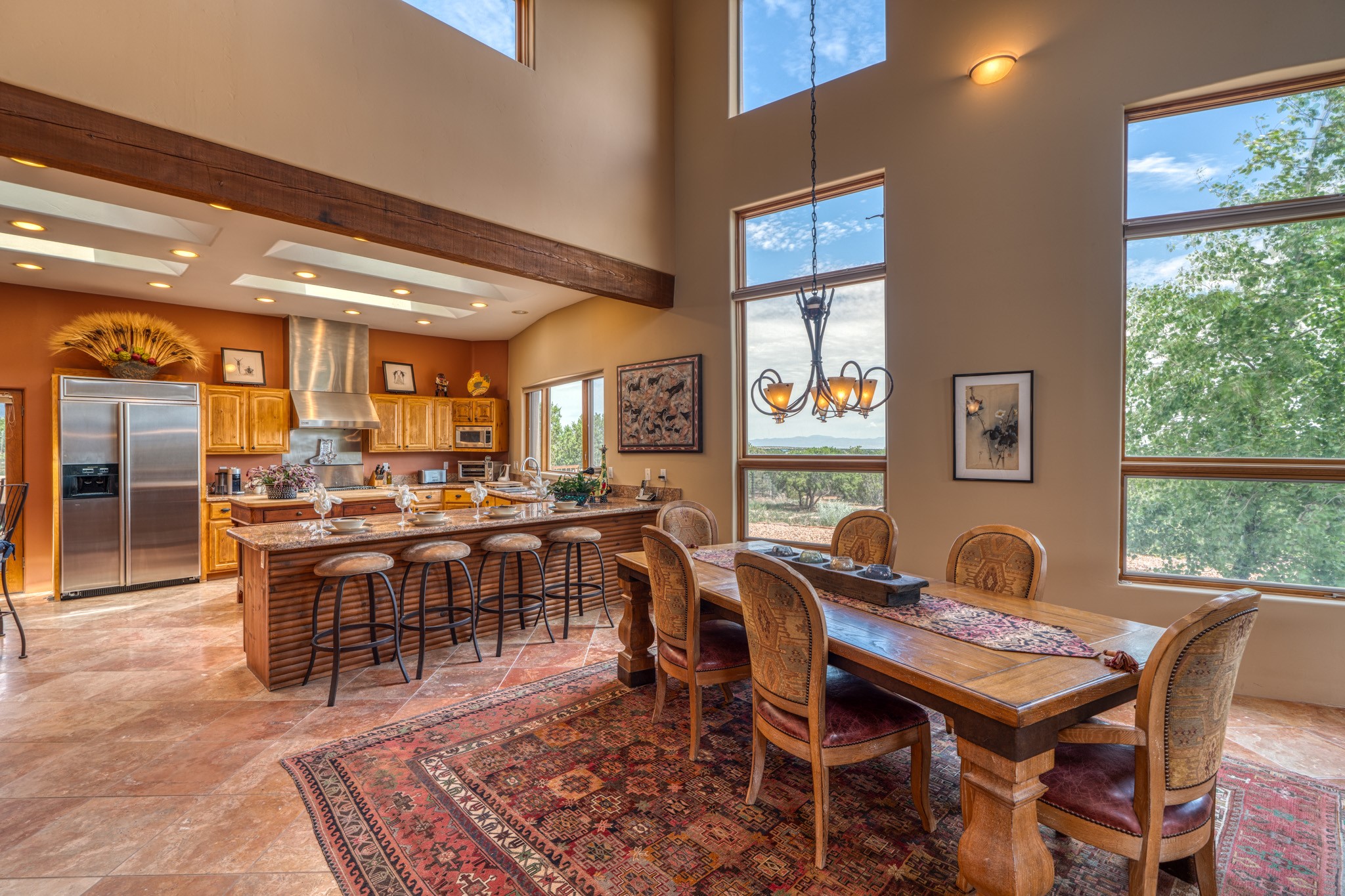 Imagine a home designed to capture the essence of East Mountain living on 10 acres, where expansive walls of glass blur the lines between indoors & out. This custom-built masterpiece boasts soaring ceilings with handcrafted wood beams that amplify light and openness, while every window offers a breathtaking vista. This beauty with a fabulous open floor plan, originally built for the builder, with many custom features. Certified Green Build with ICF Construction and Turkish travertine floors, Pella wood windows, magnificent 22' Kiva in Living room, Chef's kitchen with high-end Kitchen Aid appliances, Thermador Professional range, tons of counter space & butcher block island. Covered patio with kiva fireplace, 4-car oversized garage, fenced yard (2/3 ac) Roof-top deck on 10 acres.
