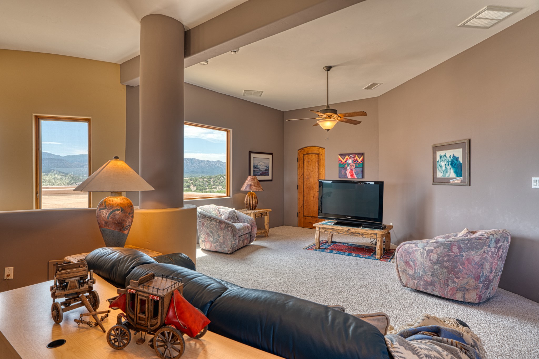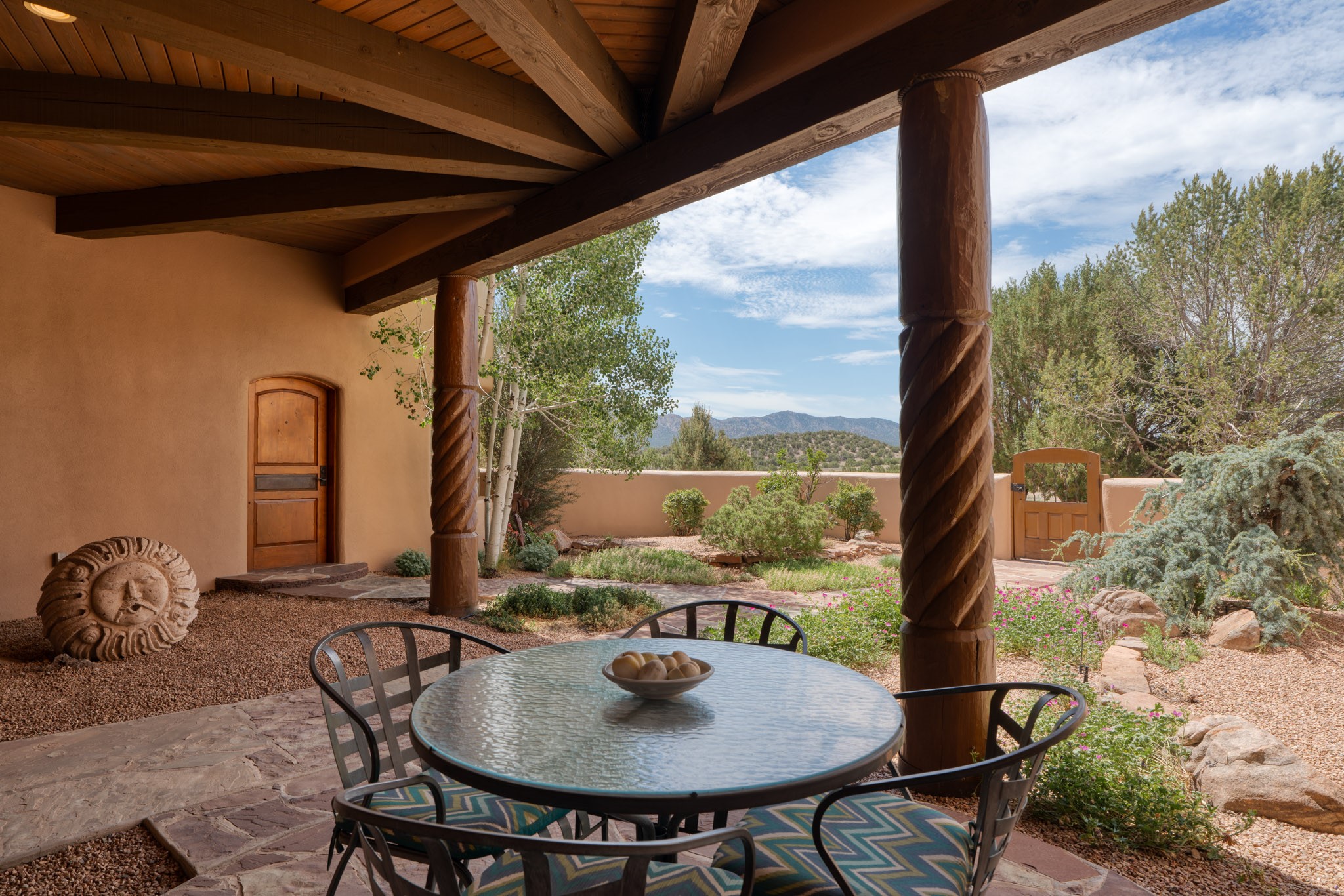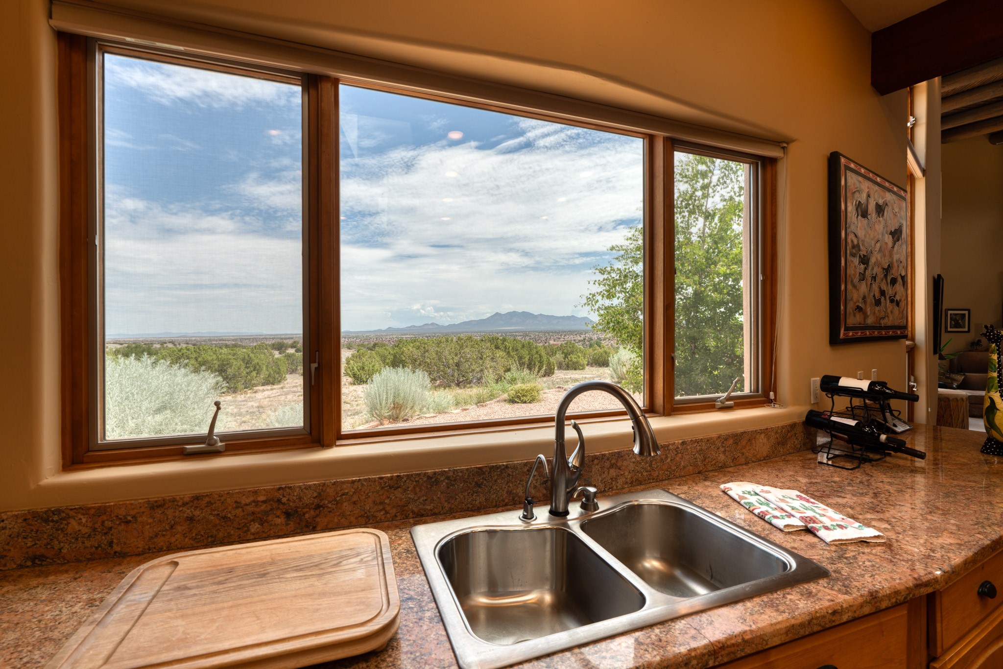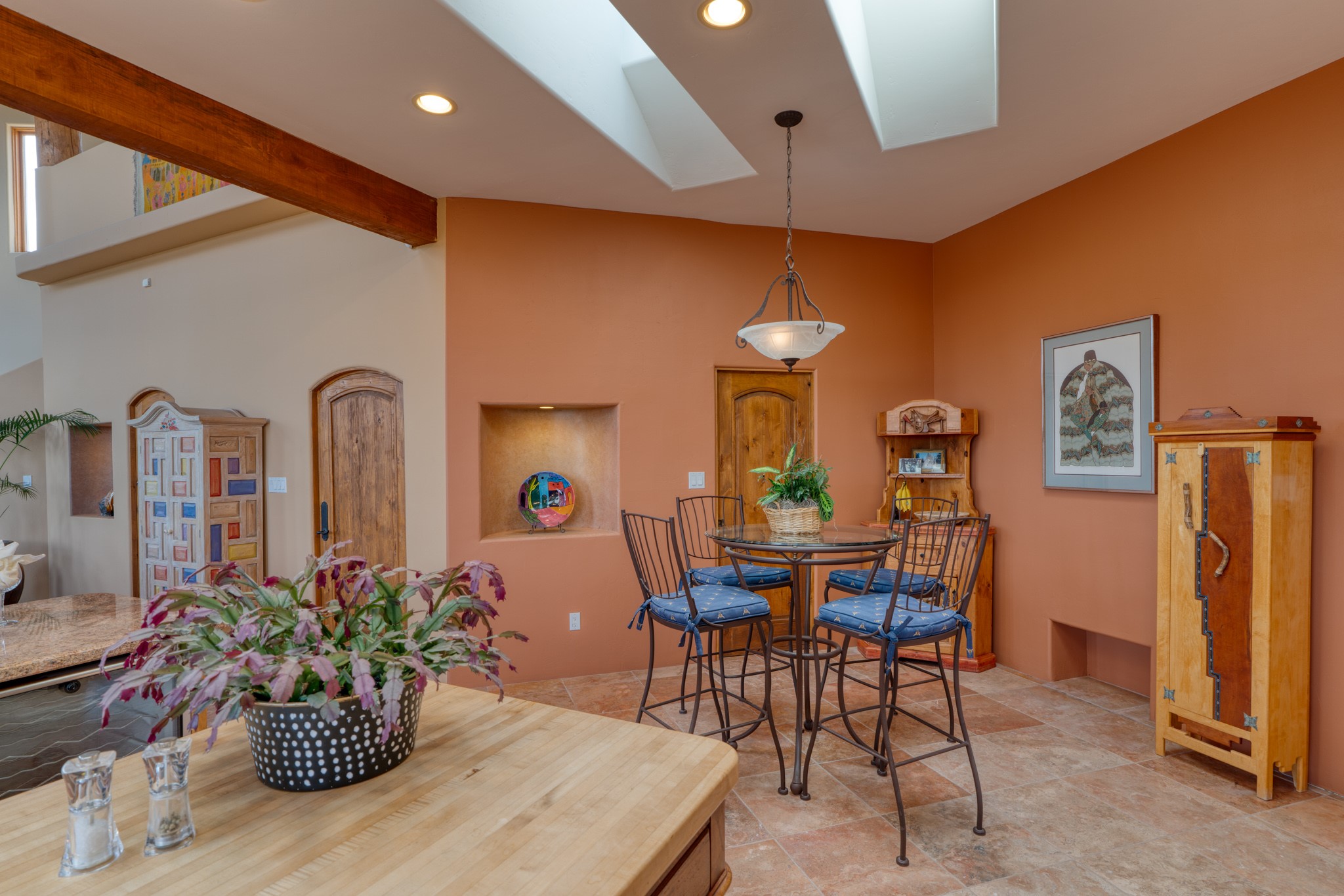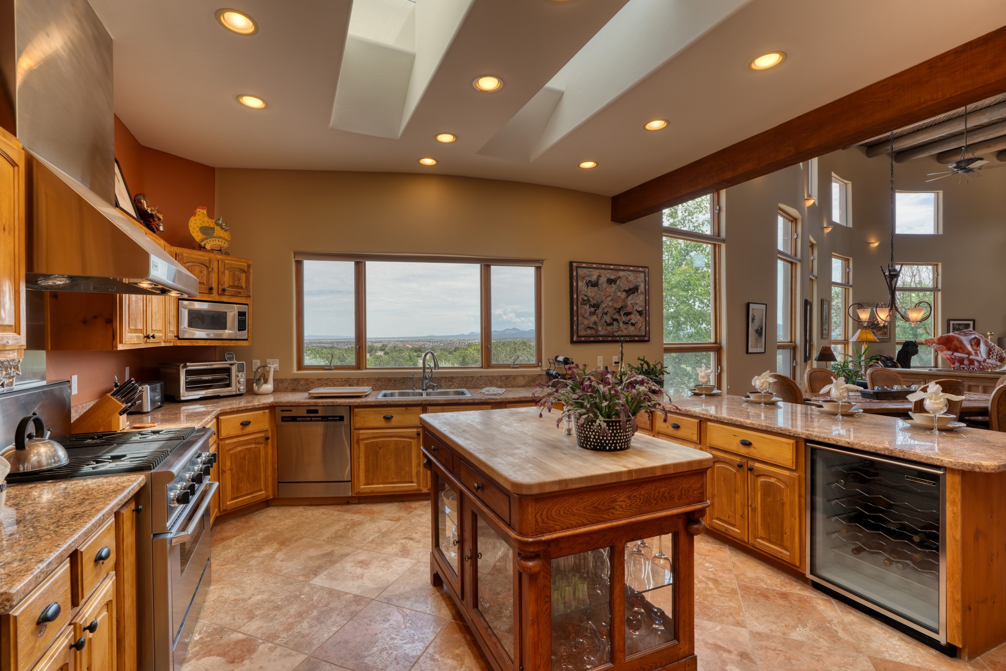 Imagine a home designed to capture the essence of East Mountain living on 10 acres, where expansive walls of glass blur the lines between indoors & out. This custom-built masterpiece boasts soaring ceilings with handcrafted wood beams that amplify light and openness, while every window offers a breathtaking vista. This beauty with a fabulous open floor plan, originally built for the builder, with many custom features. Certified Green Build with ICF Construction and Turkish travertine floors, Pella wood windows, magnificent 22' Kiva in Living room, Chef's kitchen with high-end Kitchen Aid appliances, Thermador Professional range, tons of counter space & butcher block island. Covered patio with kiva fireplace, 4-car oversized garage, fenced yard (2/3 ac) Roof-top deck on 10 acres.