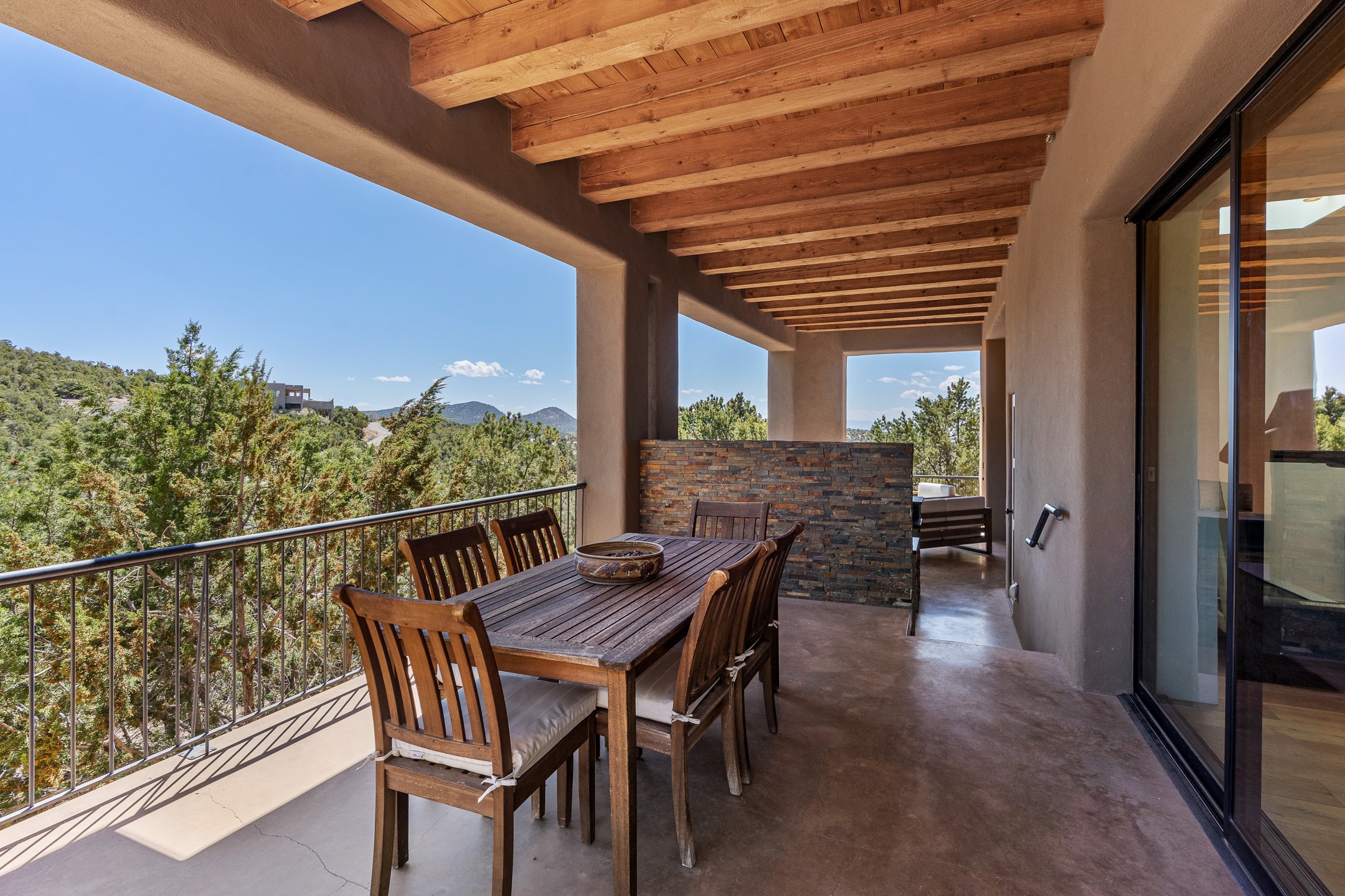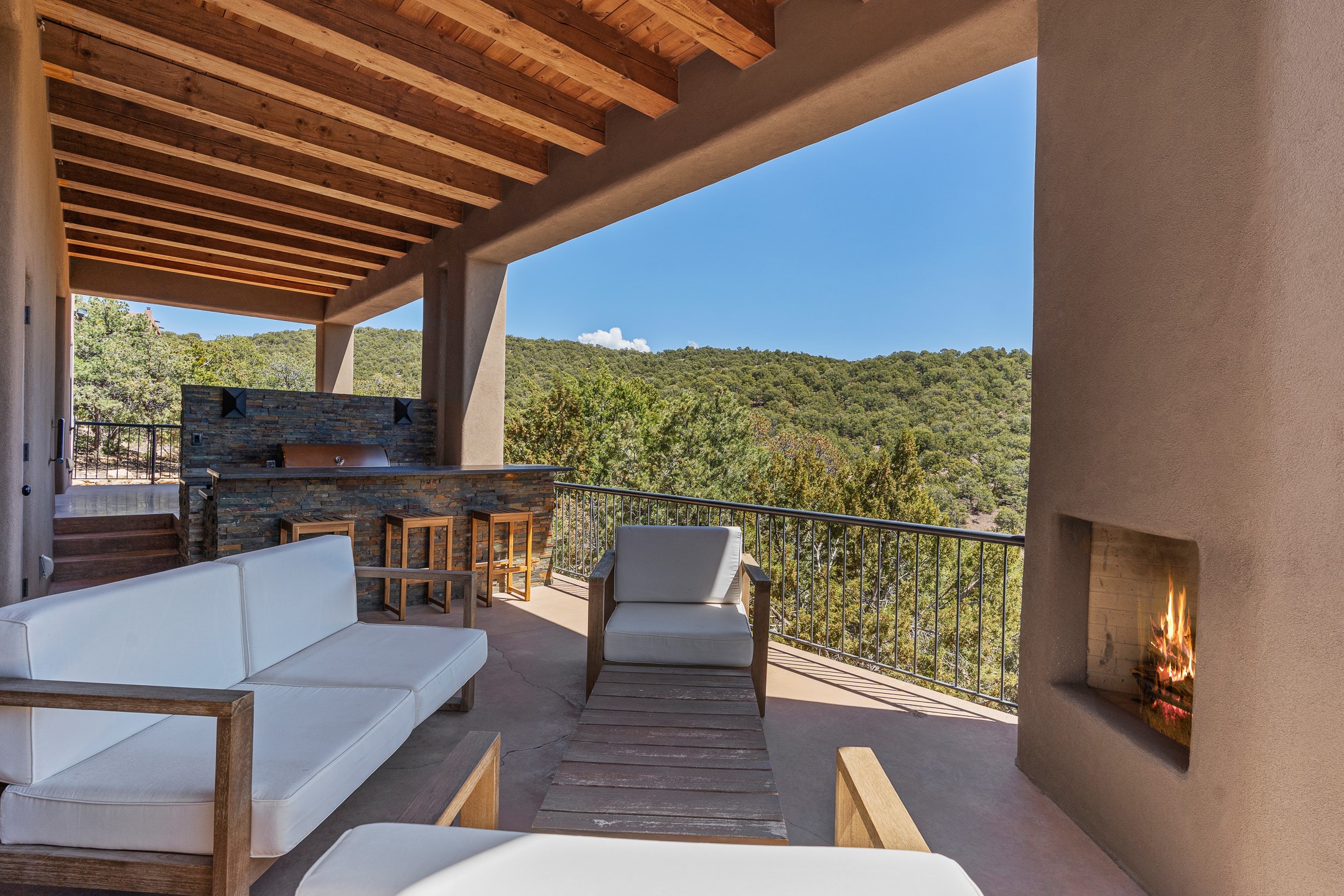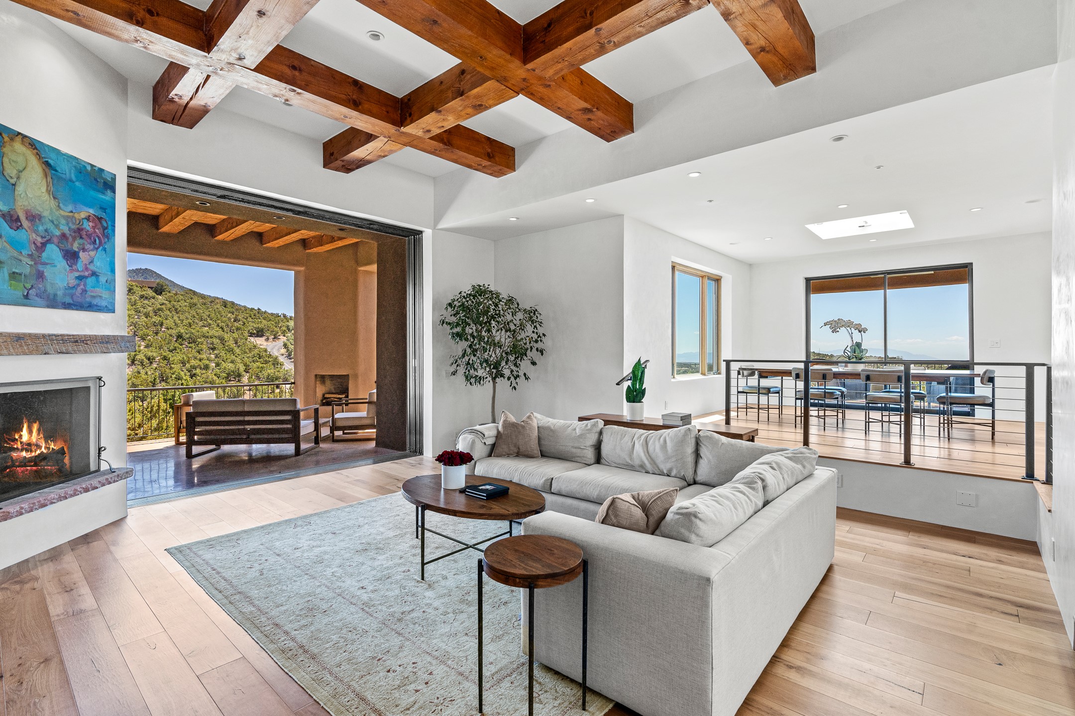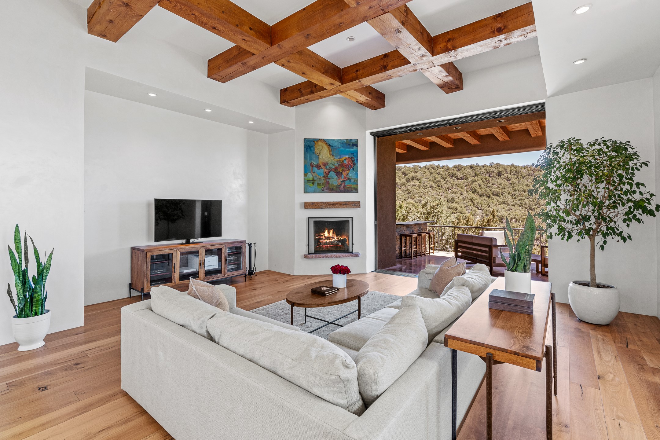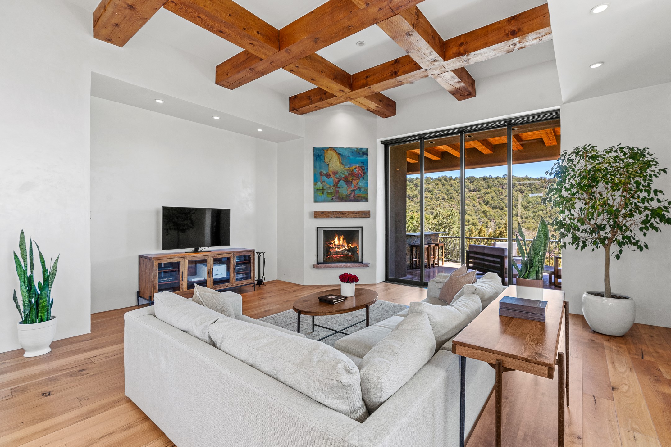 Modern Elegance in the Mountains -- A Sanctuary in the Sky-Built by award winning builder Fred Klein.Perched high above the city in the coveted Cerros Colorados community, find this breathtaking contemporary retreat where clean design meets timeless Santa Fe charm. Every moment in this 2,719- square-foot home is framed by expansive views of Sun and Moon Mountains, sparkling city lights, and the sweeping majesty of Northern New Mexico. For those who crave a connection to nature, this home is perfectly positioned with easy access to the Dale Ball Trails and on the scenic route to the Santa Fe Ski Basin. Inside, this 3-bedroom, 3-bath home has been thoughtfully updated with a modern aesthetic that still honors the spirit of Santa Fe. Wide-plank oak floors and smooth white plaster walls create a calming, gallery-like backdrop for art and life. The living room, with its wood-burning fireplace and rustic cross-beamed ceilings, offers a sense of grounded luxury--especially when the disappearing glass wall opens to a stunning portal that blurs the line between indoors and out. Imagine evenings here: cozying up by the outdoor fireplace, sharing stories around the built-in grill and bar, the scent of pion in the air, and stars stretching across a velvet sky. Just above the living room, a spacious dining area opens to another patio--perfect for dinner with a view. The chef's kitchen is a dream: generous in space, fitted with Wolf and Sub-Zero appliances, new stone countertops, and a tasteful tile backsplash. The primary suite is a private retreat with its own secluded patio--a quiet space to greet the day or wind down under the stars. The ensuite bath is pure indulgence, with double vanities, a deep soaking tub, and beautiful stone and tile finishes. Even the laundry and mudroom are designed with intention, offering a stylish and functional drop zone for gear, coats, and everyday living. Whether you're seeking stillness or adventure, this home offers both in a setting that inspires every day.
