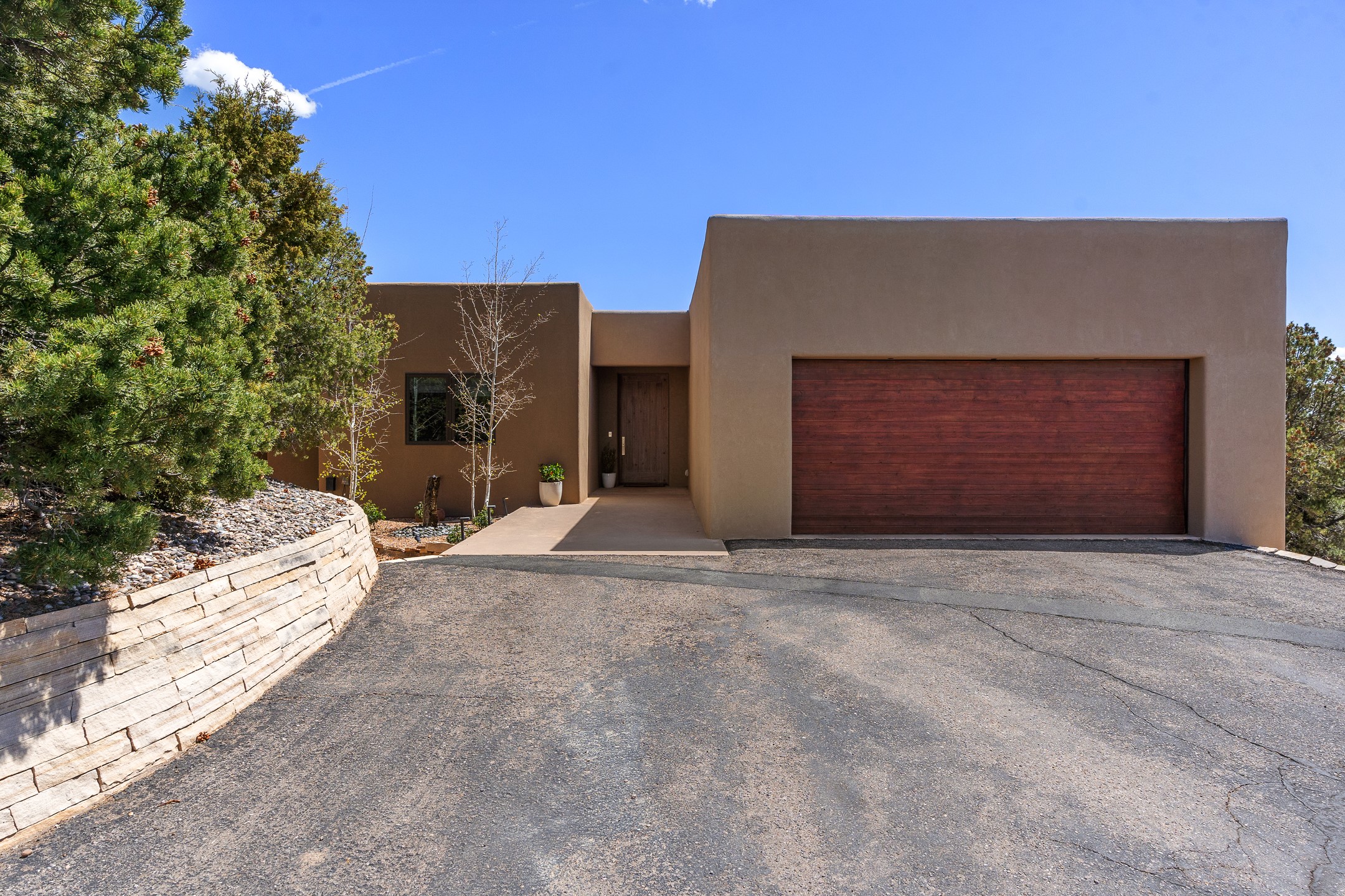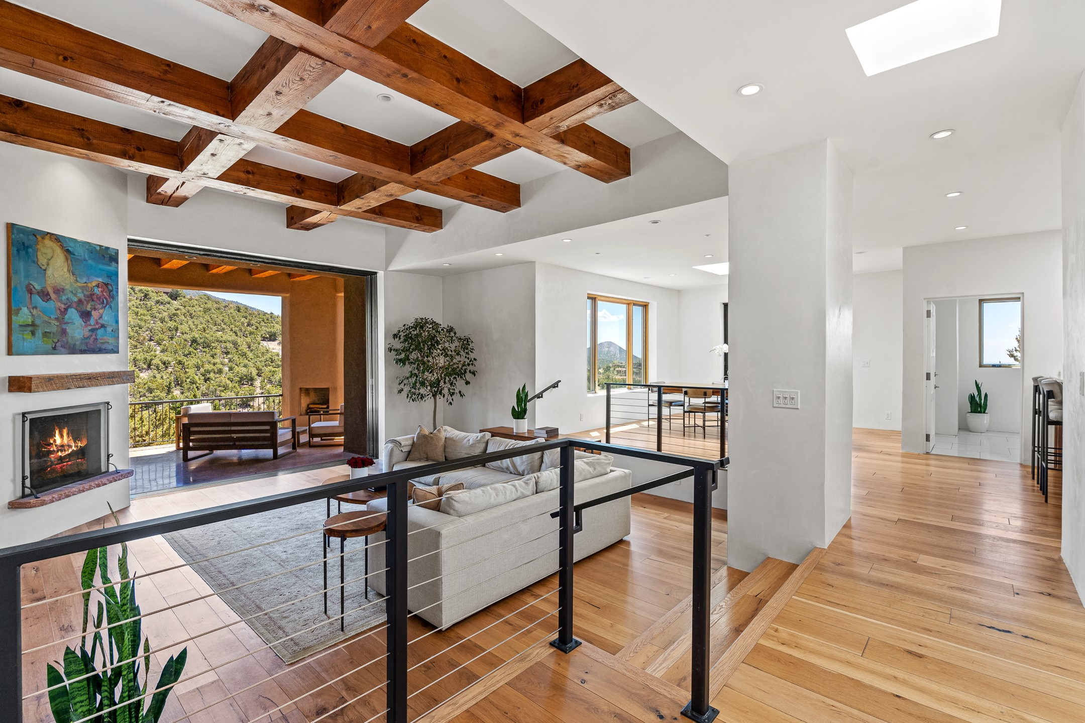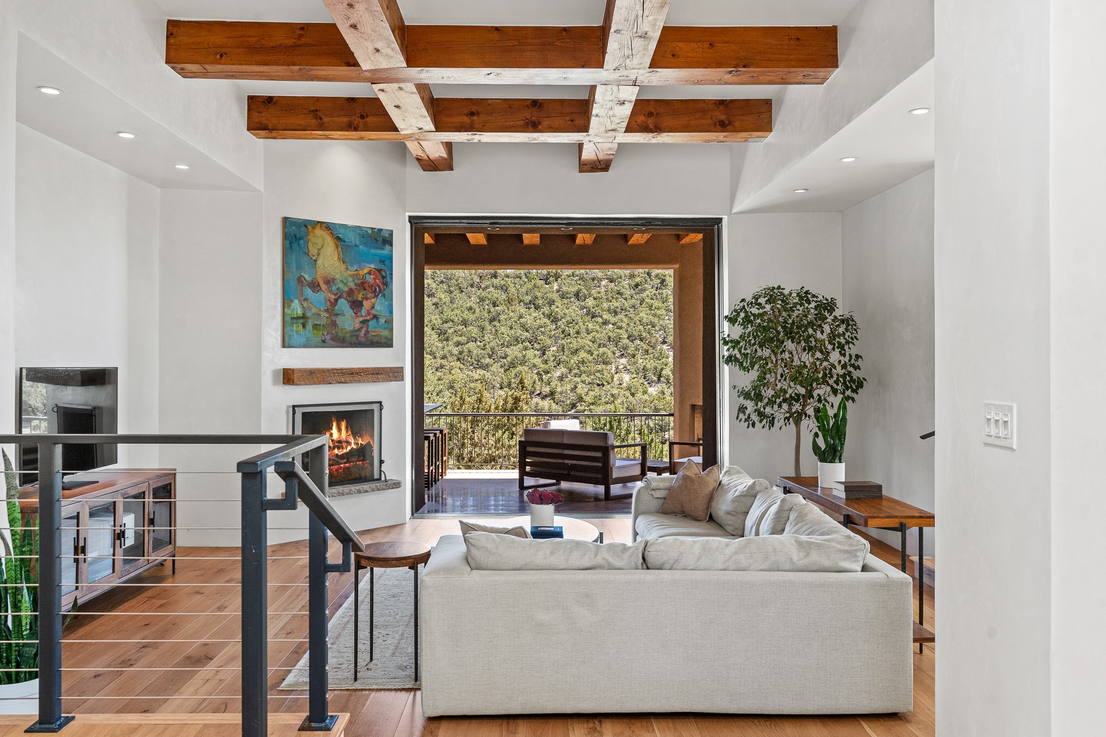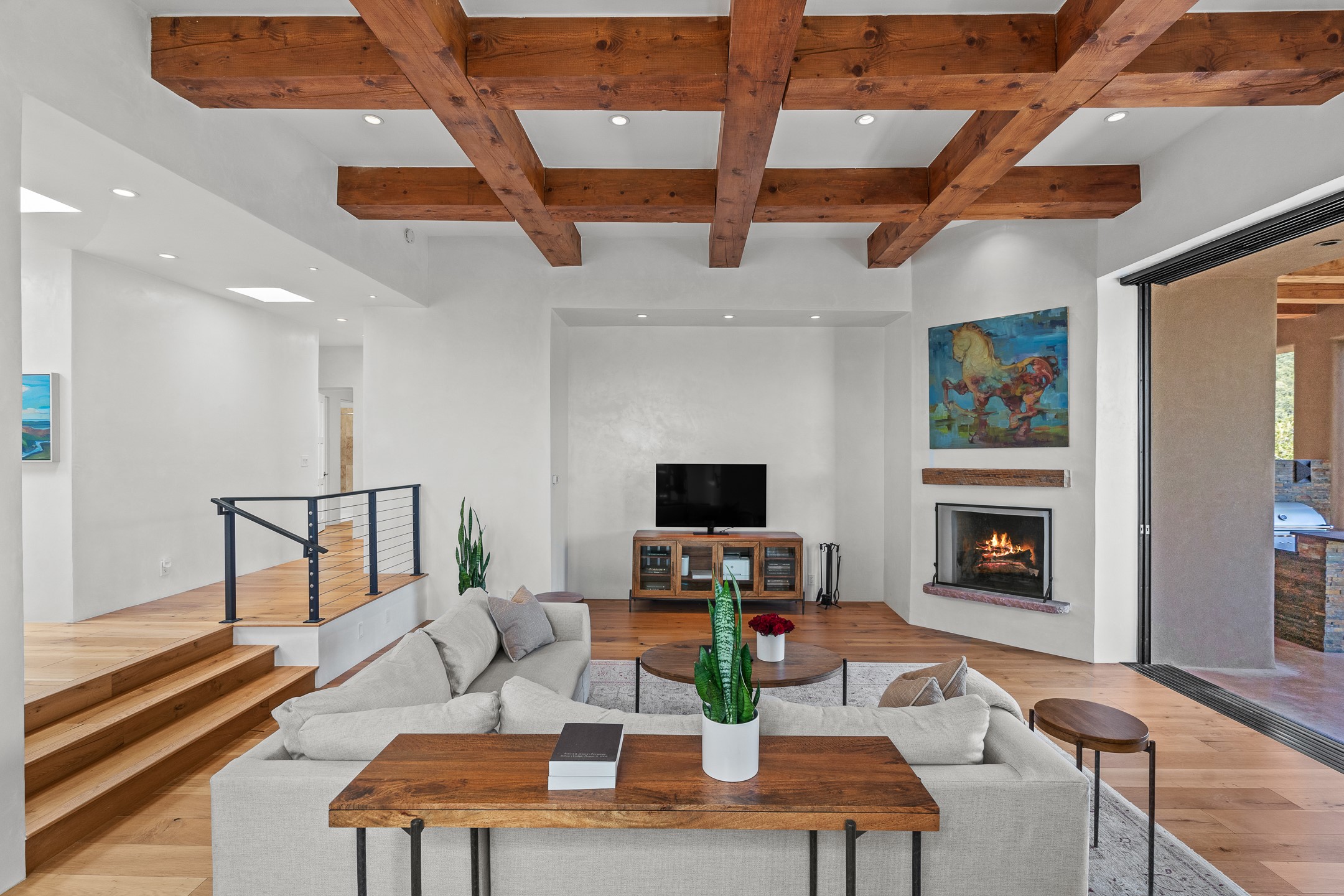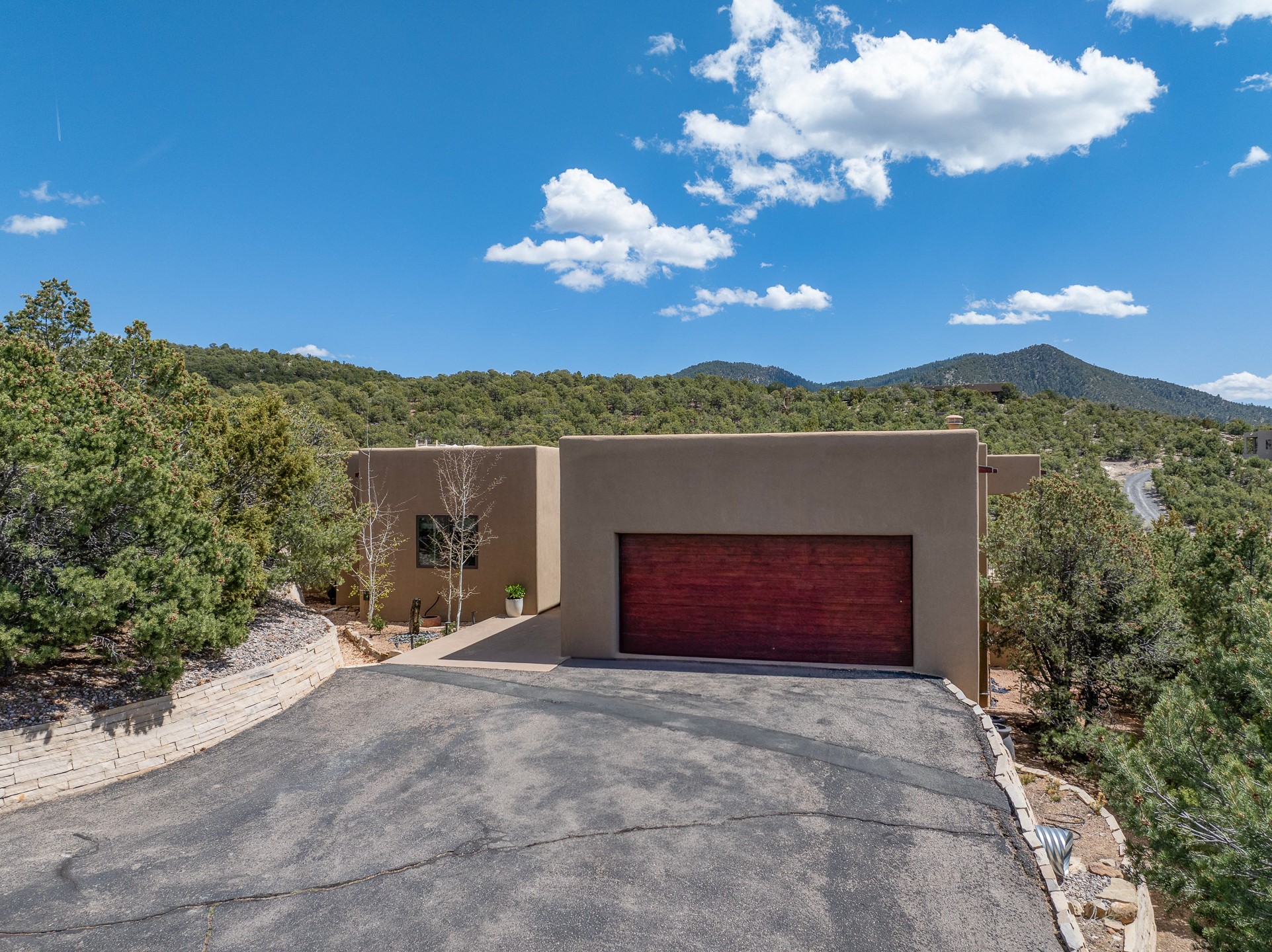 Modern Elegance in the Mountains -- A Sanctuary in the Sky-Built by award winning builder Fred Klein.Perched high above the city in the coveted Cerros Colorados community, find this breathtaking contemporary retreat where clean design meets timeless Santa Fe charm. Every moment in this 2,719- square-foot home is framed by expansive views of Sun and Moon Mountains, sparkling city lights, and the sweeping majesty of Northern New Mexico. For those who crave a connection to nature, this home is perfectly positioned with easy access to the Dale Ball Trails and on the scenic route to the Santa Fe Ski Basin. Inside, this 3-bedroom, 3-bath home has been thoughtfully updated with a modern aesthetic that still honors the spirit of Santa Fe. Wide-plank oak floors and smooth white plaster walls create a calming, gallery-like backdrop for art and life. The living room, with its wood-burning fireplace and rustic cross-beamed ceilings, offers a sense of grounded luxury--especially when the disappearing glass wall opens to a stunning portal that blurs the line between indoors and out. Imagine evenings here: cozying up by the outdoor fireplace, sharing stories around the built-in grill and bar, the scent of pion in the air, and stars stretching across a velvet sky. Just above the living room, a spacious dining area opens to another patio--perfect for dinner with a view. The chef's kitchen is a dream: generous in space, fitted with Wolf and Sub-Zero appliances, new stone countertops, and a tasteful tile backsplash. The primary suite is a private retreat with its own secluded patio--a quiet space to greet the day or wind down under the stars. The ensuite bath is pure indulgence, with double vanities, a deep soaking tub, and beautiful stone and tile finishes. Even the laundry and mudroom are designed with intention, offering a stylish and functional drop zone for gear, coats, and everyday living. Whether you're seeking stillness or adventure, this home offers both in a setting that inspires every day.