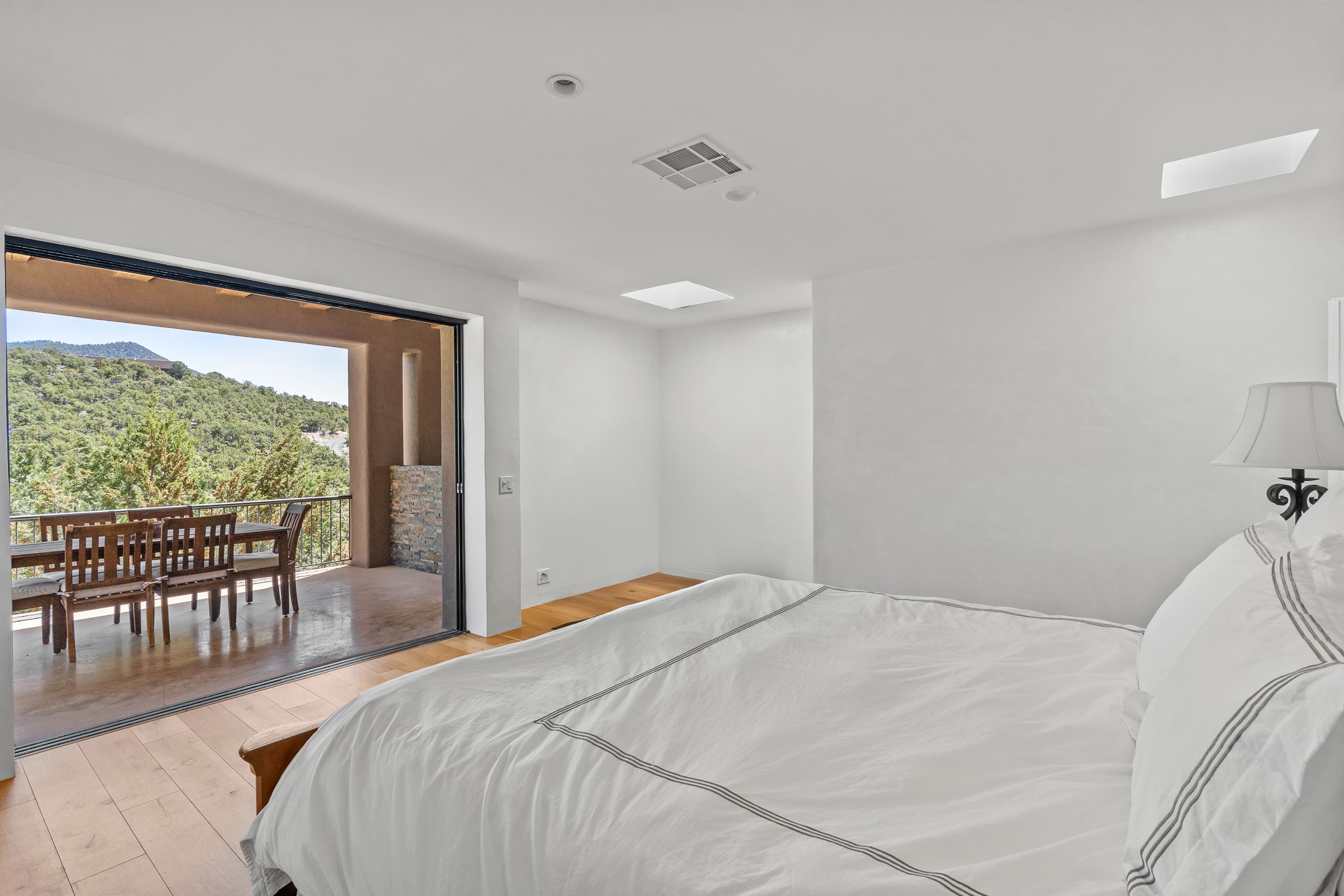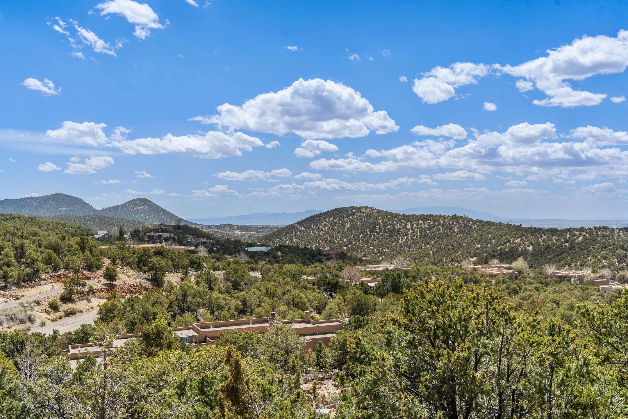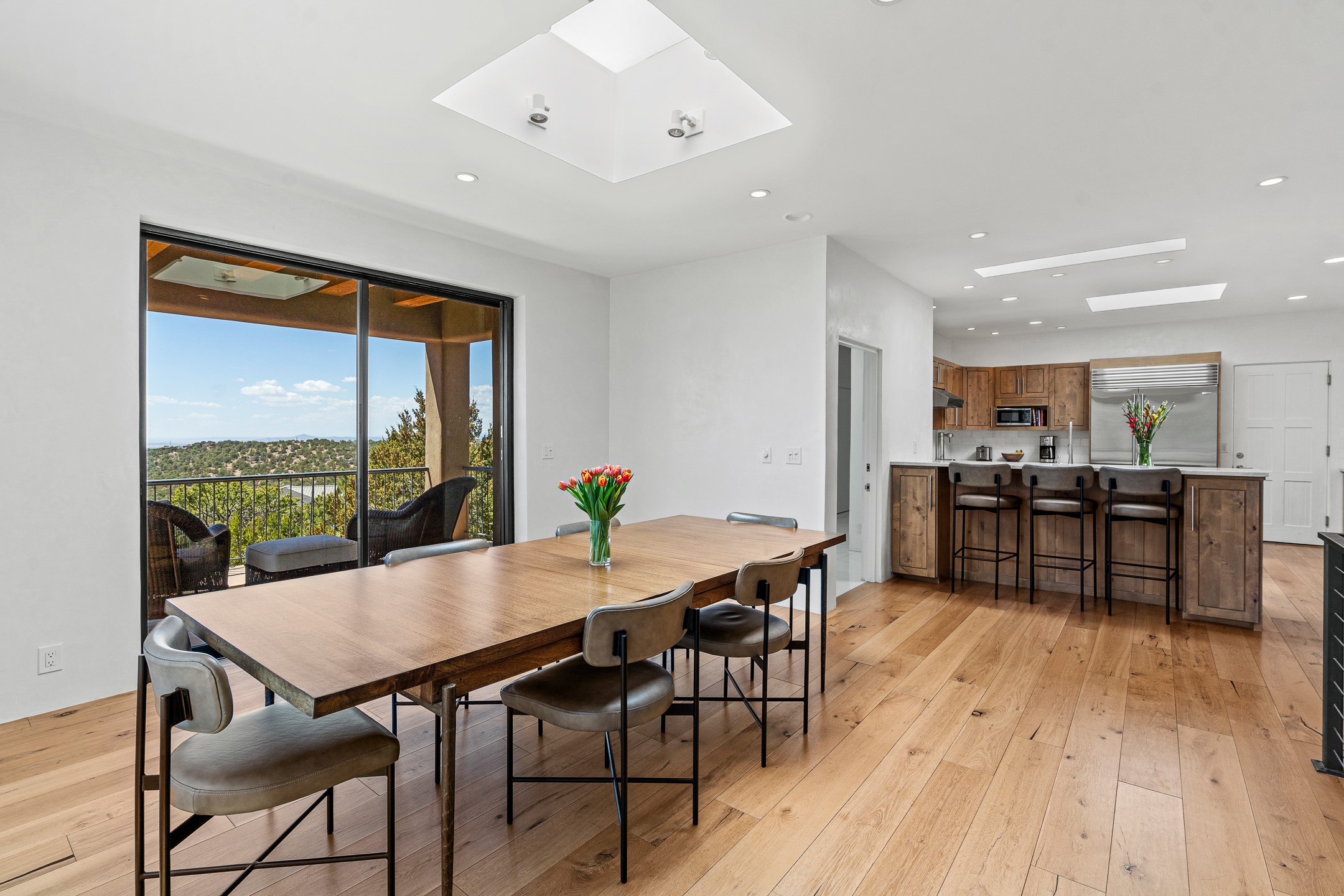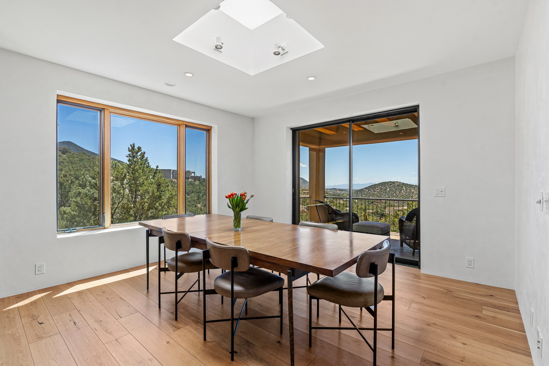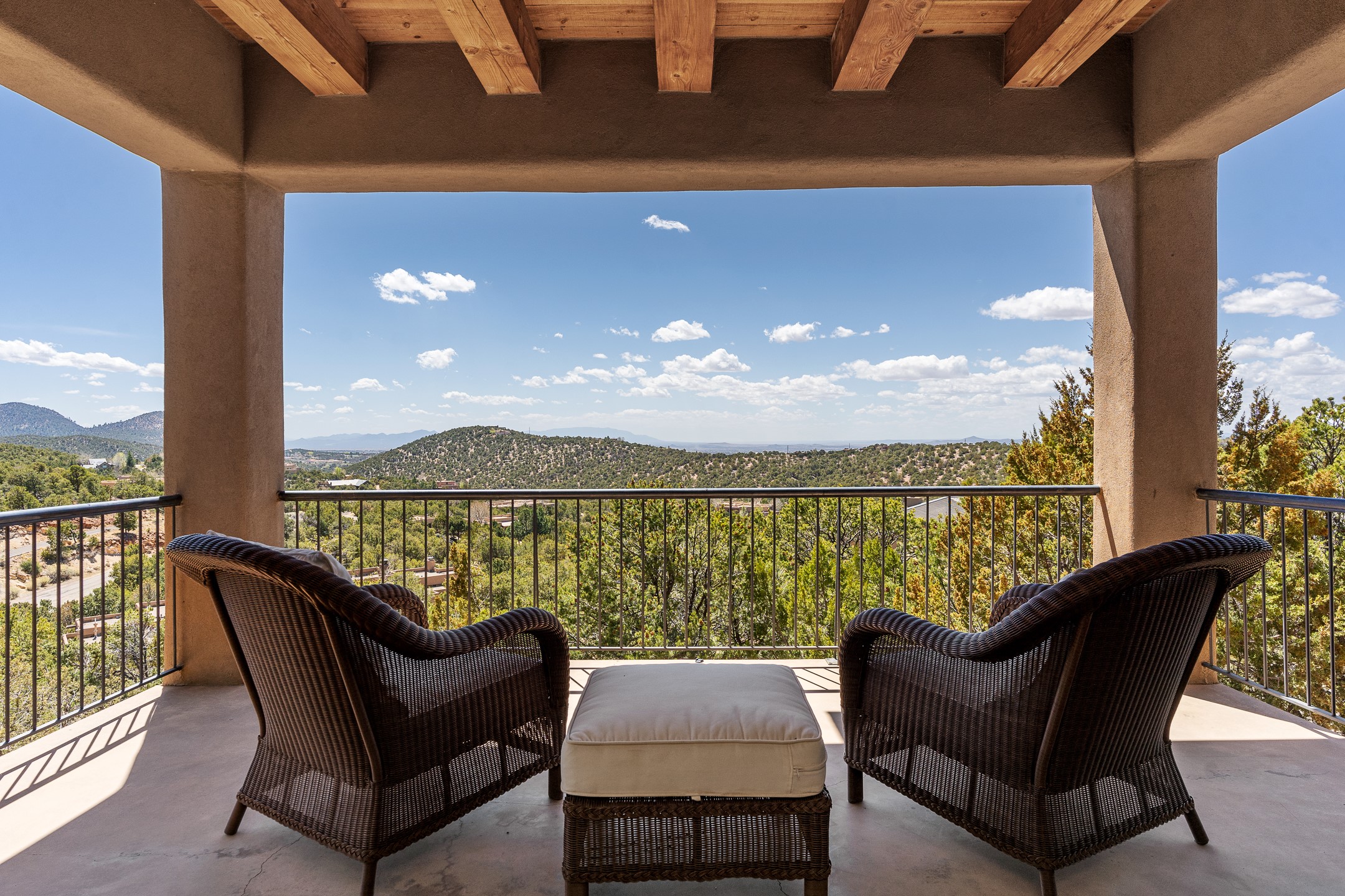 Modern Elegance in the Mountains -- A Sanctuary in the Sky-Built by award winning builder Fred Klein.Perched high above the city in the coveted Cerros Colorados community, find this breathtaking contemporary retreat where clean design meets timeless Santa Fe charm. Every moment in this 2,719- square-foot home is framed by expansive views of Sun and Moon Mountains, sparkling city lights, and the sweeping majesty of Northern New Mexico. For those who crave a connection to nature, this home is perfectly positioned with easy access to the Dale Ball Trails and on the scenic route to the Santa Fe Ski Basin. Inside, this 3-bedroom, 3-bath home has been thoughtfully updated with a modern aesthetic that still honors the spirit of Santa Fe. Wide-plank oak floors and smooth white plaster walls create a calming, gallery-like backdrop for art and life. The living room, with its wood-burning fireplace and rustic cross-beamed ceilings, offers a sense of grounded luxury--especially when the disappearing glass wall opens to a stunning portal that blurs the line between indoors and out. Imagine evenings here: cozying up by the outdoor fireplace, sharing stories around the built-in grill and bar, the scent of pion in the air, and stars stretching across a velvet sky. Just above the living room, a spacious dining area opens to another patio--perfect for dinner with a view. The chef's kitchen is a dream: generous in space, fitted with Wolf and Sub-Zero appliances, new stone countertops, and a tasteful tile backsplash. The primary suite is a private retreat with its own secluded patio--a quiet space to greet the day or wind down under the stars. The ensuite bath is pure indulgence, with double vanities, a deep soaking tub, and beautiful stone and tile finishes. Even the laundry and mudroom are designed with intention, offering a stylish and functional drop zone for gear, coats, and everyday living. Whether you're seeking stillness or adventure, this home offers both in a setting that inspires every day.