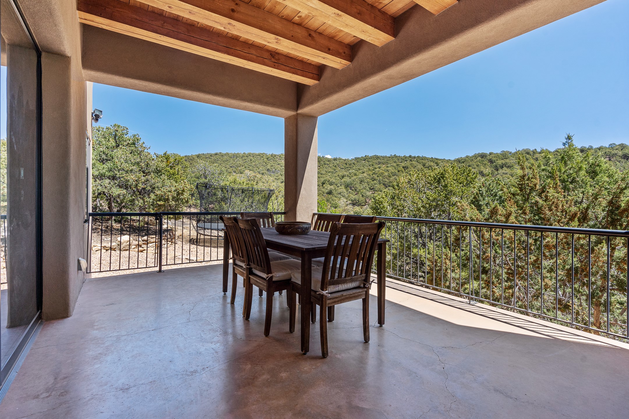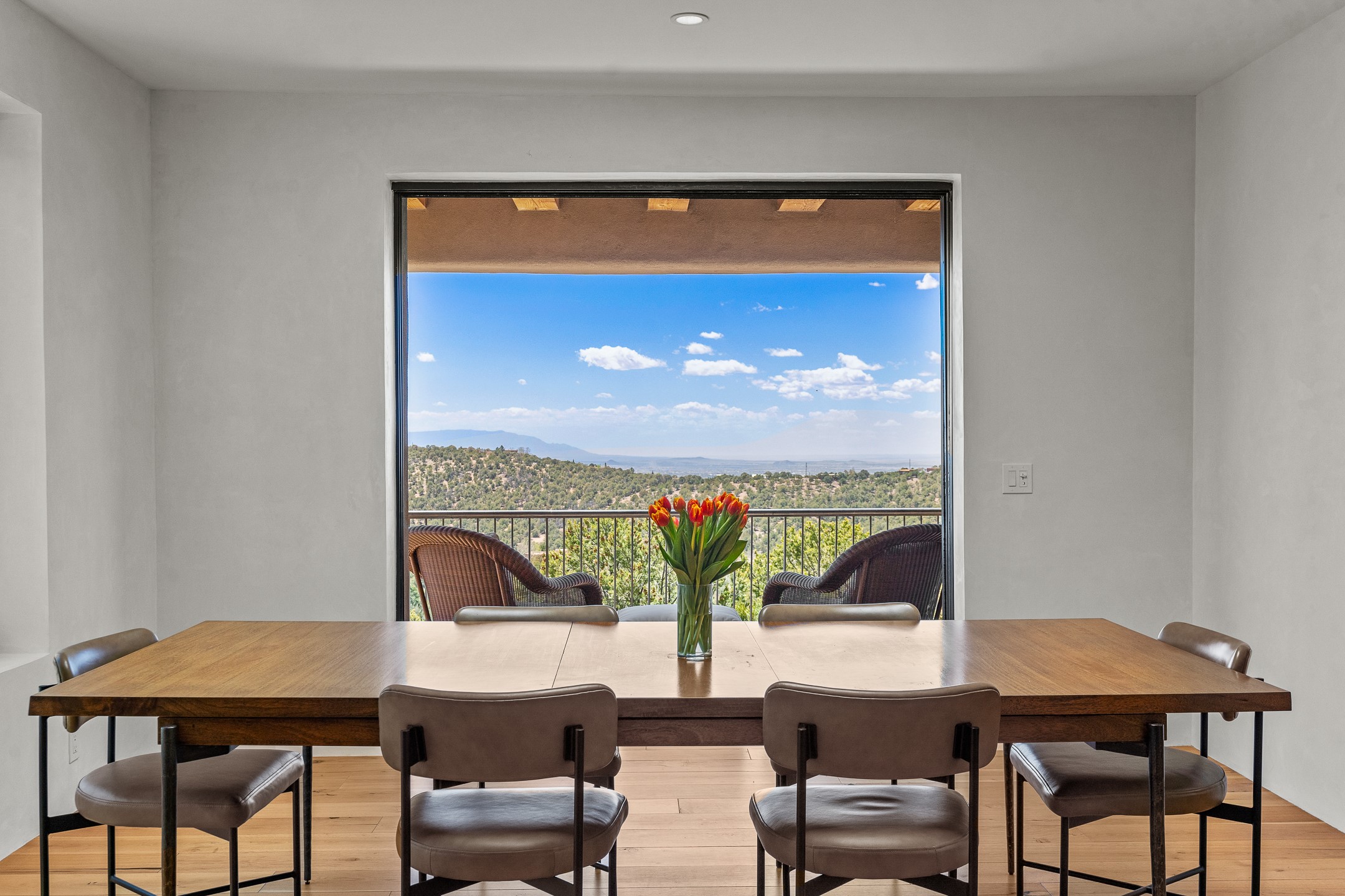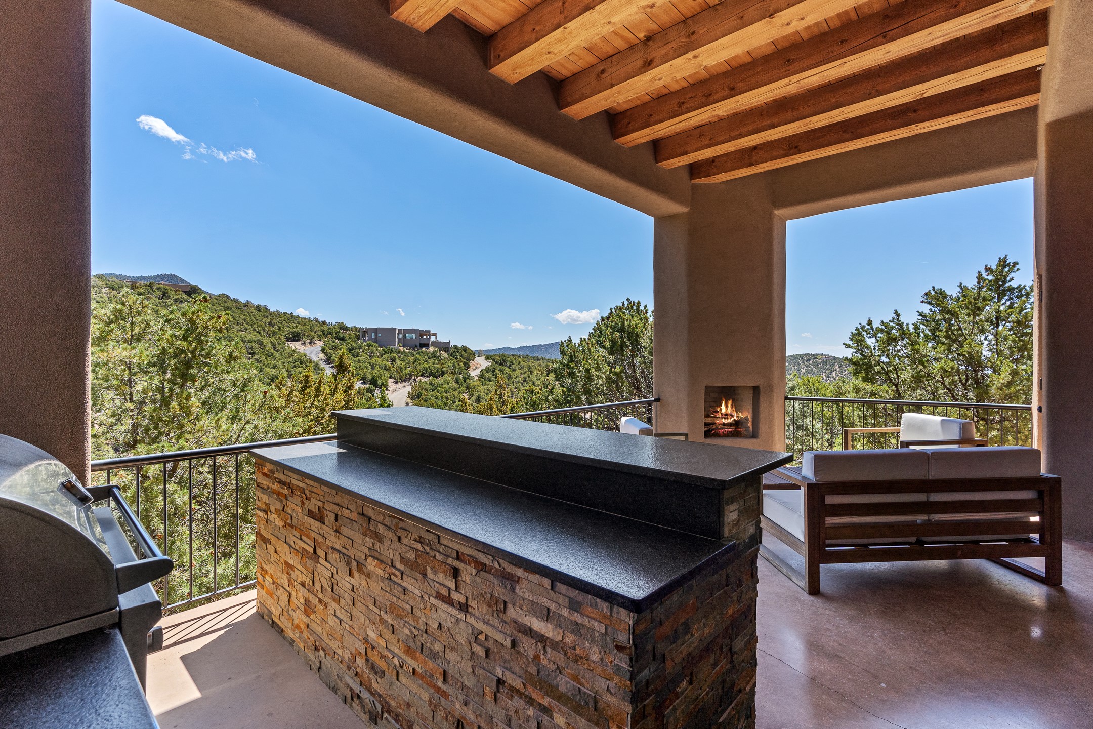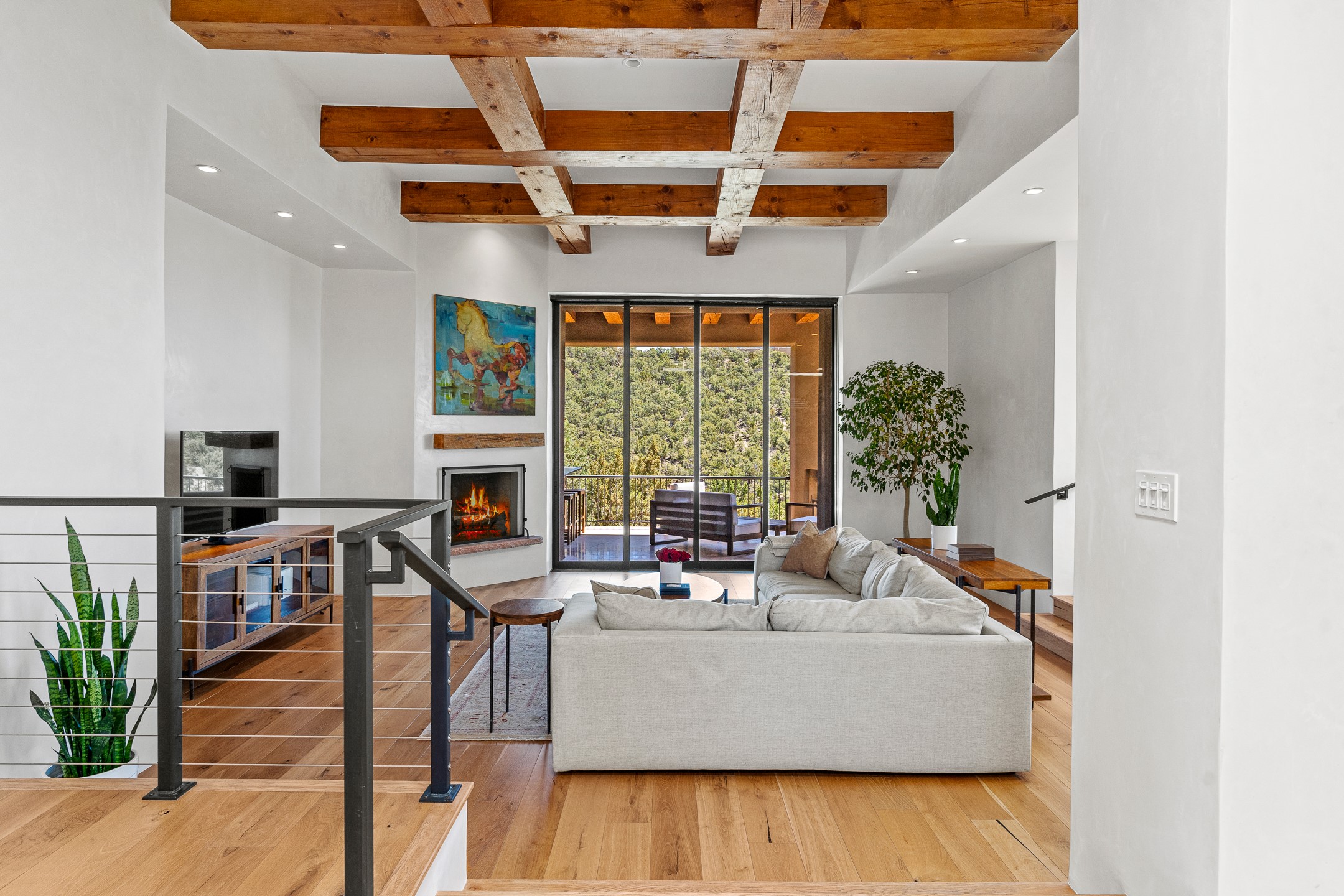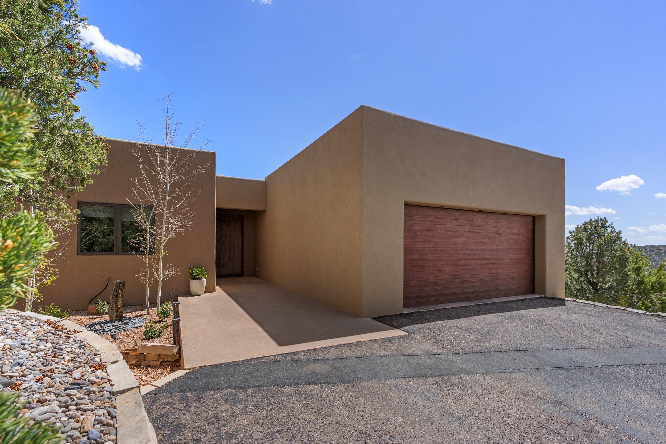 Modern Elegance in the Mountains -- A Sanctuary in the Sky-Built by award winning builder Fred Klein.Perched high above the city in the coveted Cerros Colorados community, find this breathtaking contemporary retreat where clean design meets timeless Santa Fe charm. Every moment in this 2,719- square-foot home is framed by expansive views of Sun and Moon Mountains, sparkling city lights, and the sweeping majesty of Northern New Mexico. For those who crave a connection to nature, this home is perfectly positioned with easy access to the Dale Ball Trails and on the scenic route to the Santa Fe Ski Basin. Inside, this 3-bedroom, 3-bath home has been thoughtfully updated with a modern aesthetic that still honors the spirit of Santa Fe. Wide-plank oak floors and smooth white plaster walls create a calming, gallery-like backdrop for art and life. The living room, with its wood-burning fireplace and rustic cross-beamed ceilings, offers a sense of grounded luxury--especially when the disappearing glass wall opens to a stunning portal that blurs the line between indoors and out. Imagine evenings here: cozying up by the outdoor fireplace, sharing stories around the built-in grill and bar, the scent of pion in the air, and stars stretching across a velvet sky. Just above the living room, a spacious dining area opens to another patio--perfect for dinner with a view. The chef's kitchen is a dream: generous in space, fitted with Wolf and Sub-Zero appliances, new stone countertops, and a tasteful tile backsplash. The primary suite is a private retreat with its own secluded patio--a quiet space to greet the day or wind down under the stars. The ensuite bath is pure indulgence, with double vanities, a deep soaking tub, and beautiful stone and tile finishes. Even the laundry and mudroom are designed with intention, offering a stylish and functional drop zone for gear, coats, and everyday living. Whether you're seeking stillness or adventure, this home offers both in a setting that inspires every day.