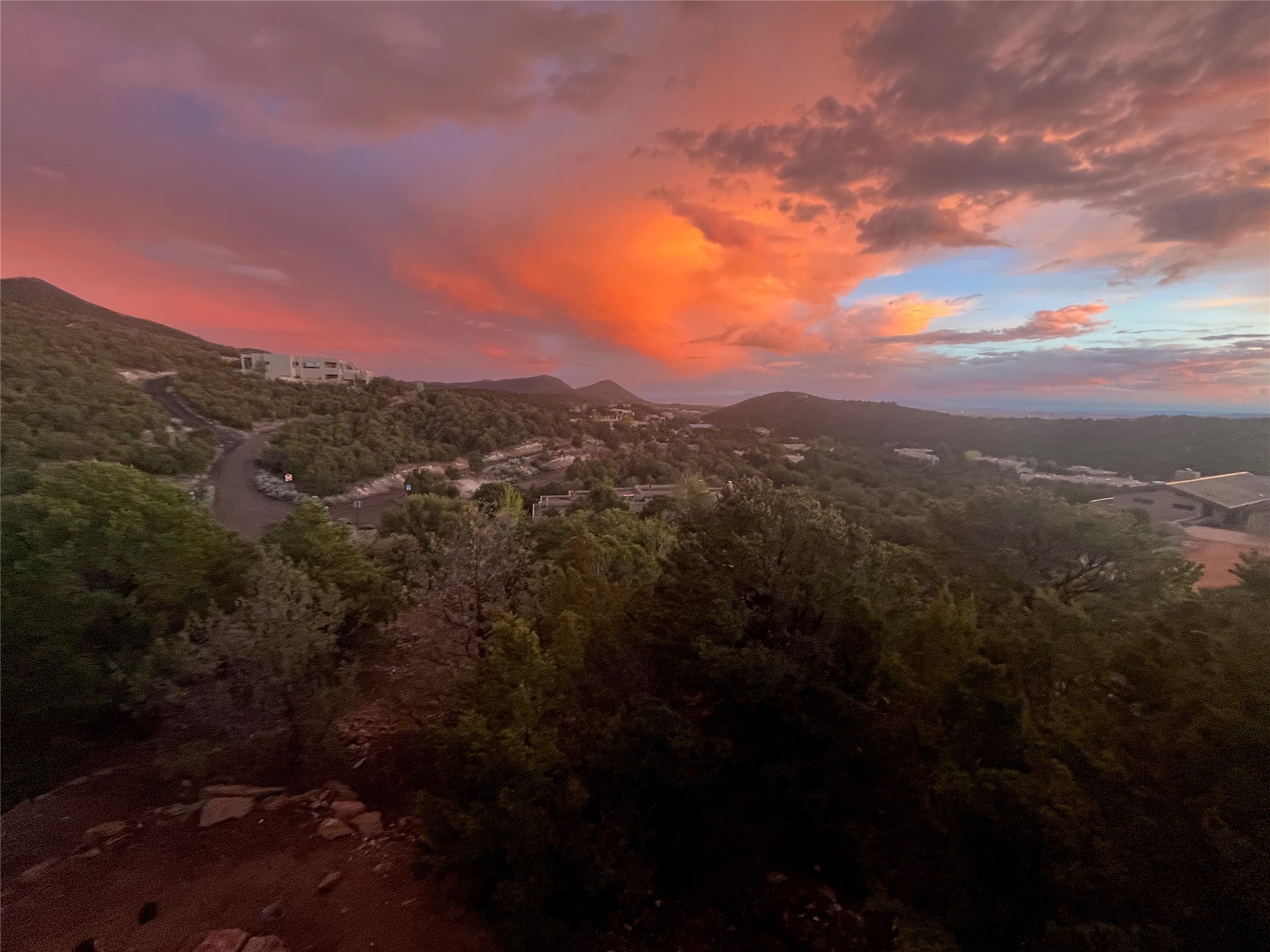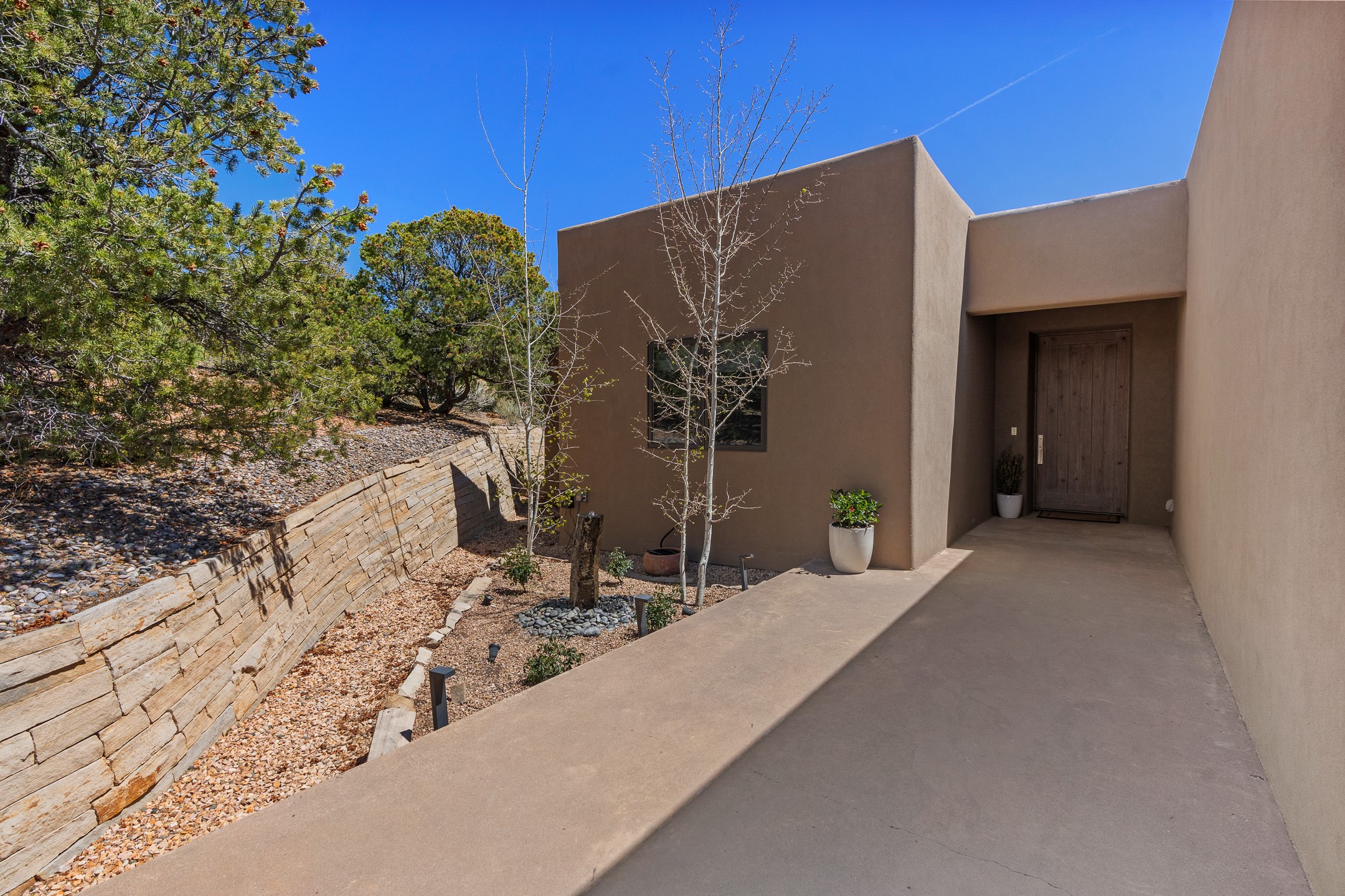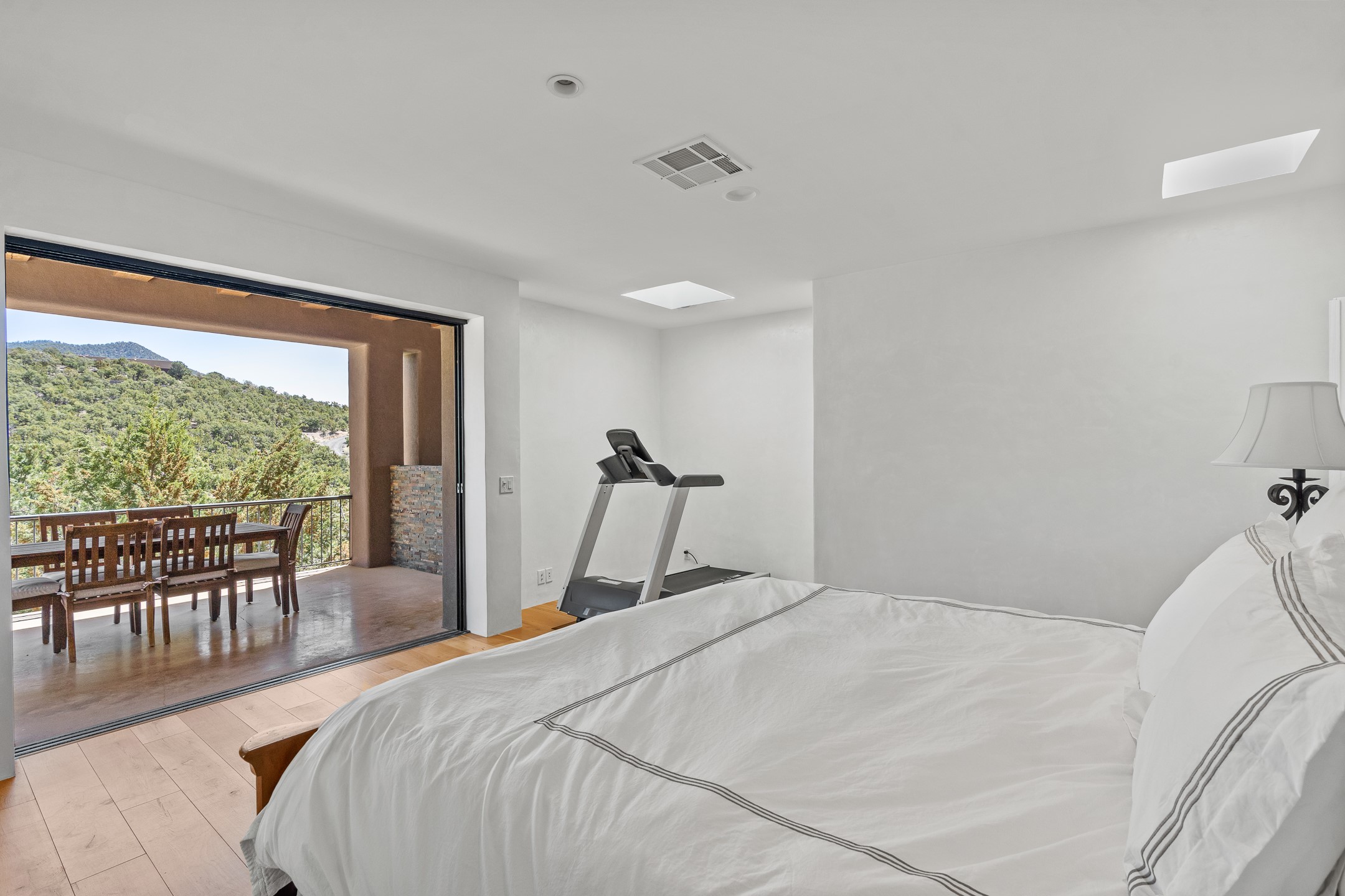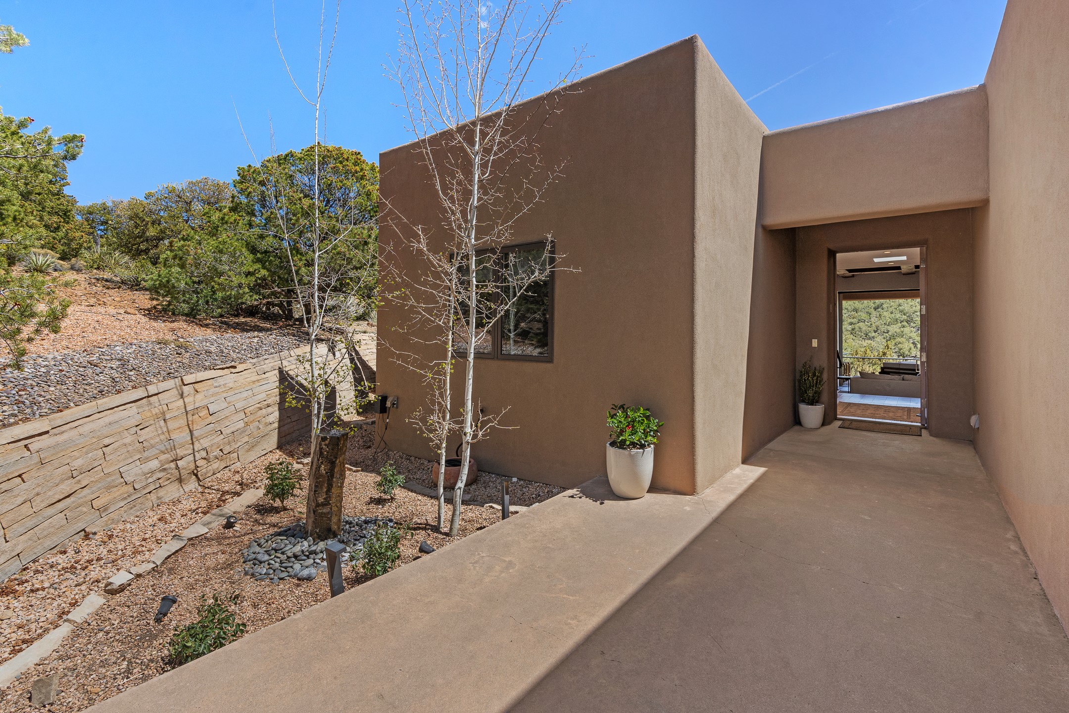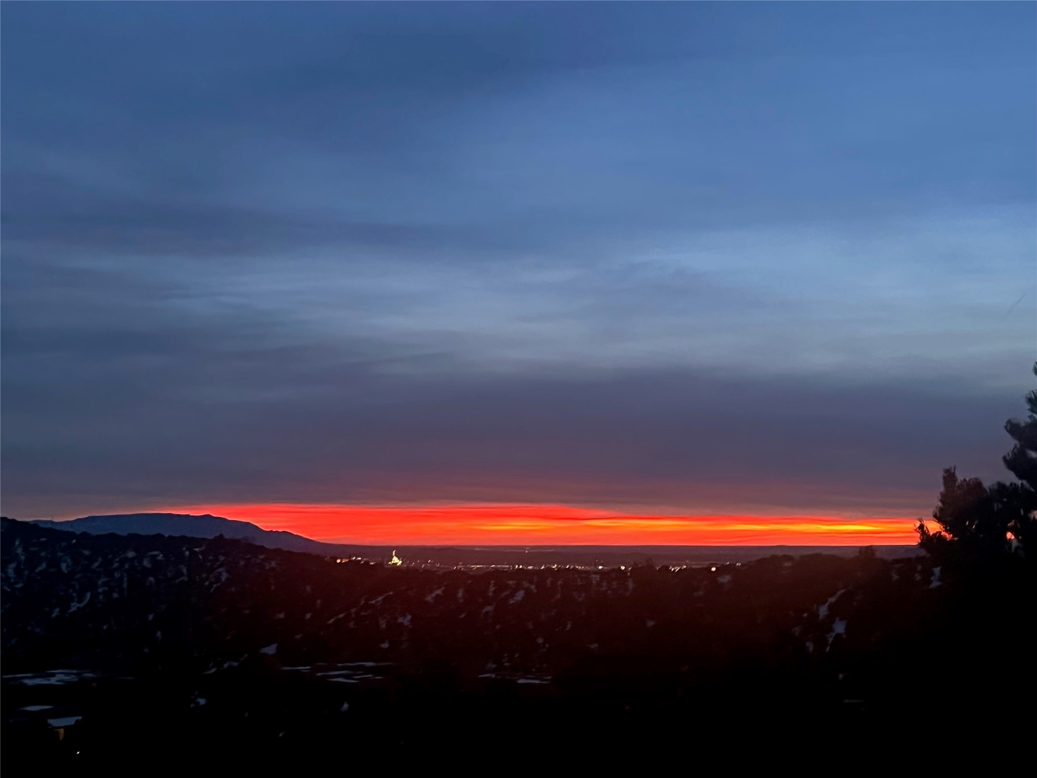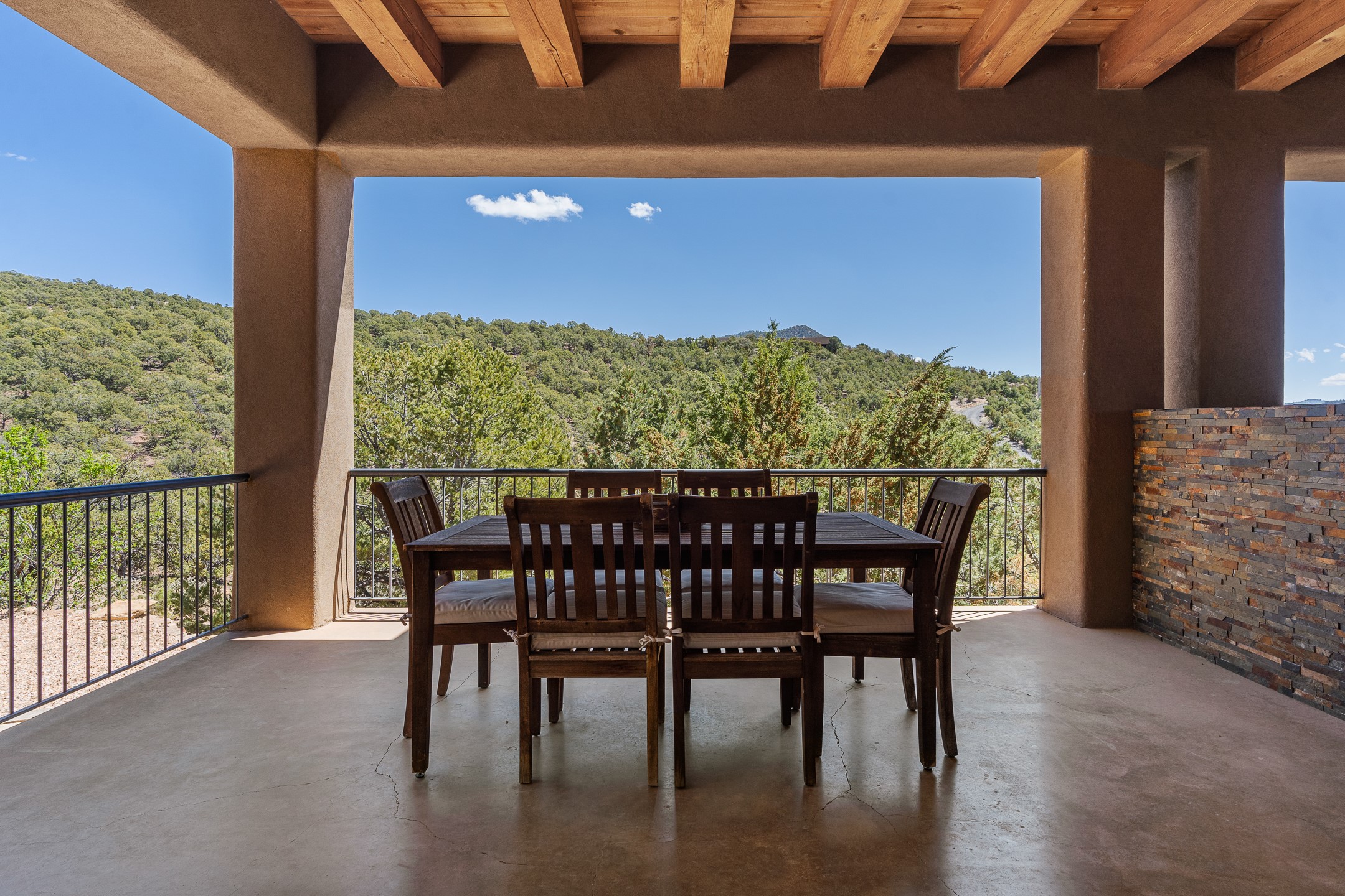 Modern Elegance in the Mountains -- A Sanctuary in the Sky-Built by award winning builder Fred Klein.Perched high above the city in the coveted Cerros Colorados community, find this breathtaking contemporary retreat where clean design meets timeless Santa Fe charm. Every moment in this 2,719- square-foot home is framed by expansive views of Sun and Moon Mountains, sparkling city lights, and the sweeping majesty of Northern New Mexico. For those who crave a connection to nature, this home is perfectly positioned with easy access to the Dale Ball Trails and on the scenic route to the Santa Fe Ski Basin. Inside, this 3-bedroom, 3-bath home has been thoughtfully updated with a modern aesthetic that still honors the spirit of Santa Fe. Wide-plank oak floors and smooth white plaster walls create a calming, gallery-like backdrop for art and life. The living room, with its wood-burning fireplace and rustic cross-beamed ceilings, offers a sense of grounded luxury--especially when the disappearing glass wall opens to a stunning portal that blurs the line between indoors and out. Imagine evenings here: cozying up by the outdoor fireplace, sharing stories around the built-in grill and bar, the scent of pion in the air, and stars stretching across a velvet sky. Just above the living room, a spacious dining area opens to another patio--perfect for dinner with a view. The chef's kitchen is a dream: generous in space, fitted with Wolf and Sub-Zero appliances, new stone countertops, and a tasteful tile backsplash. The primary suite is a private retreat with its own secluded patio--a quiet space to greet the day or wind down under the stars. The ensuite bath is pure indulgence, with double vanities, a deep soaking tub, and beautiful stone and tile finishes. Even the laundry and mudroom are designed with intention, offering a stylish and functional drop zone for gear, coats, and everyday living. Whether you're seeking stillness or adventure, this home offers both in a setting that inspires every day.