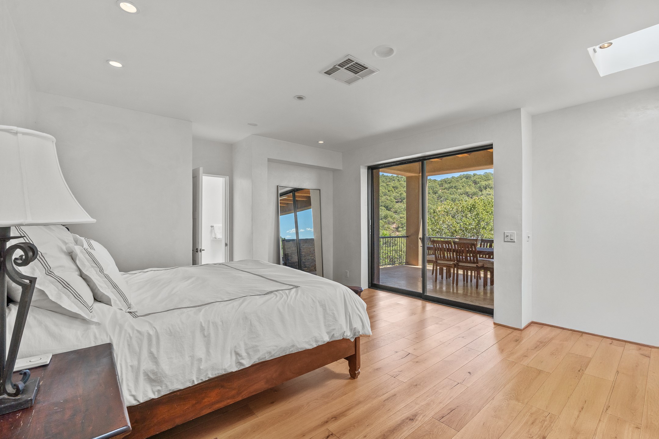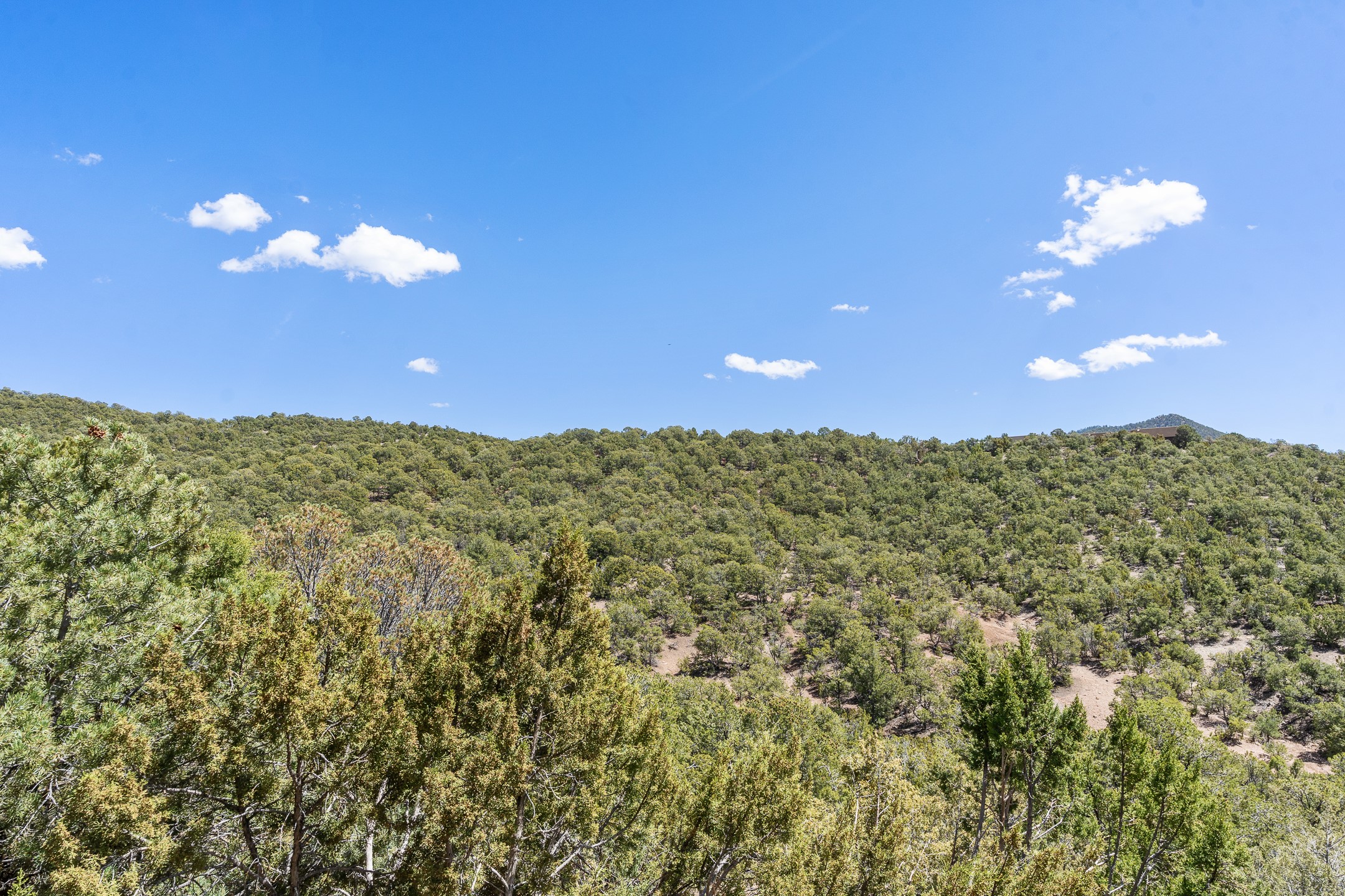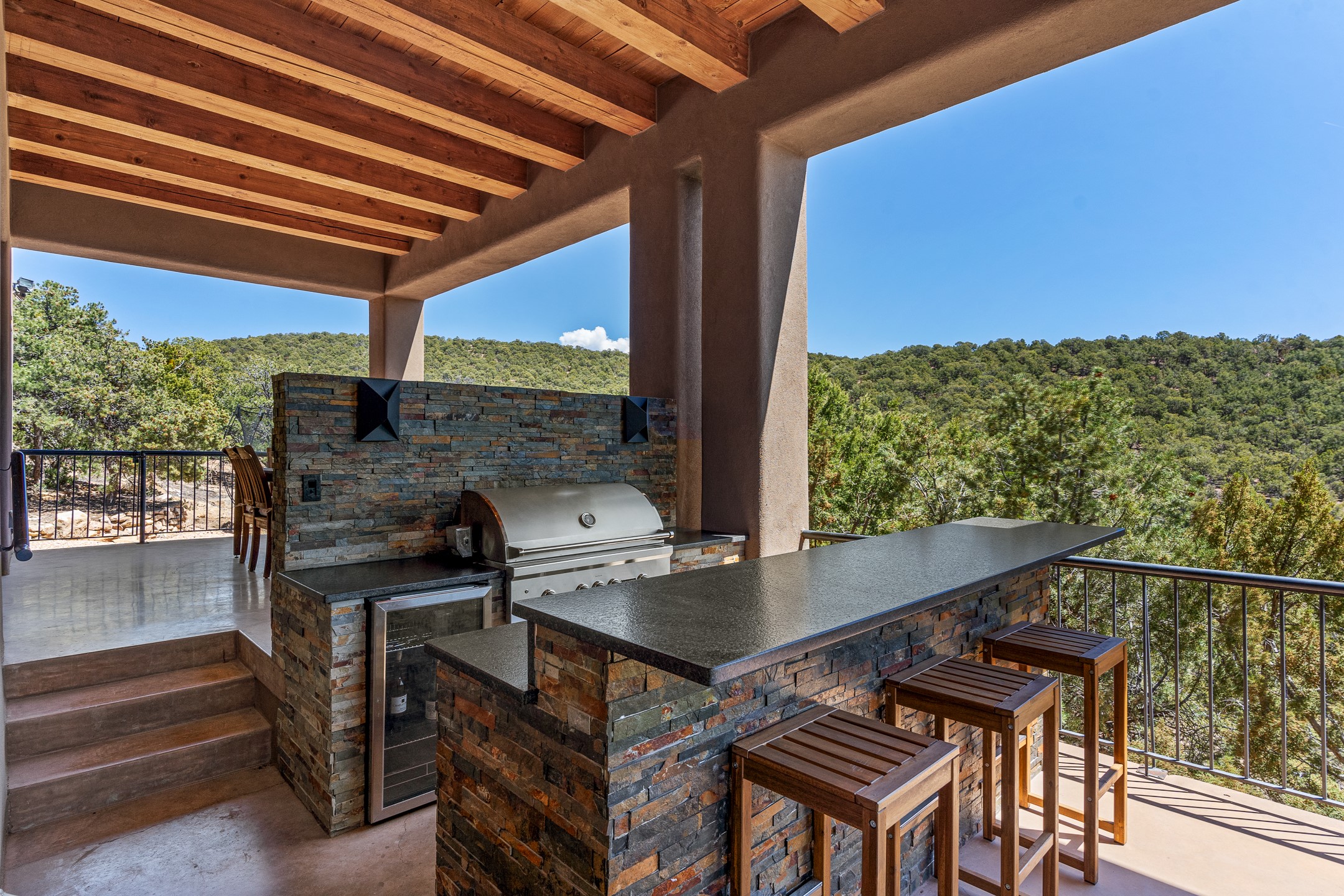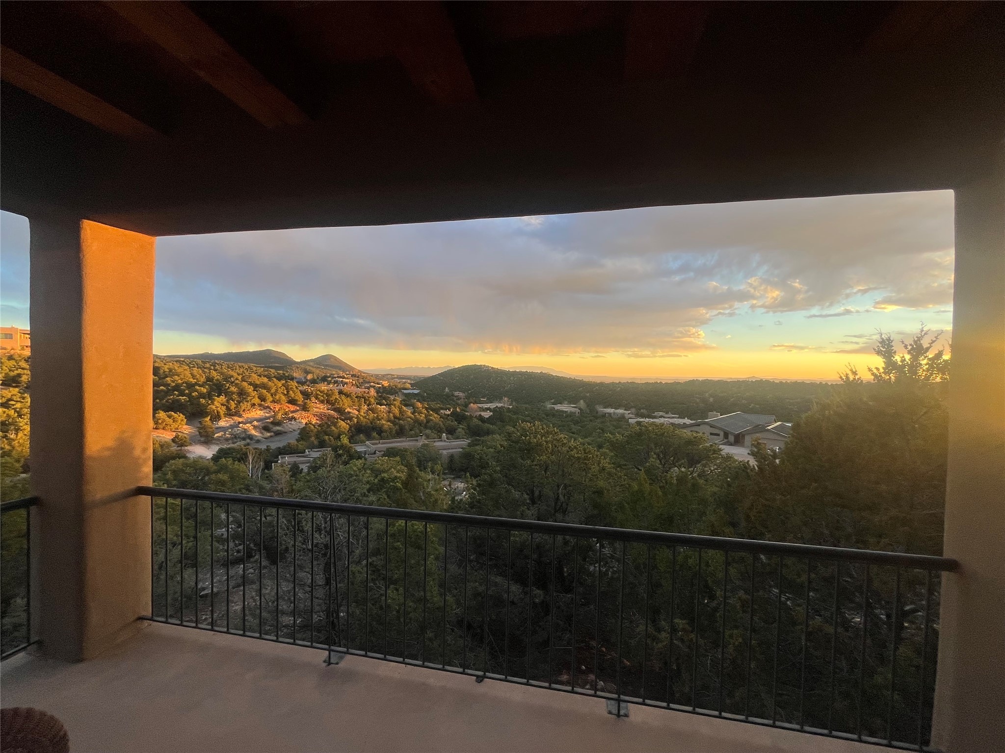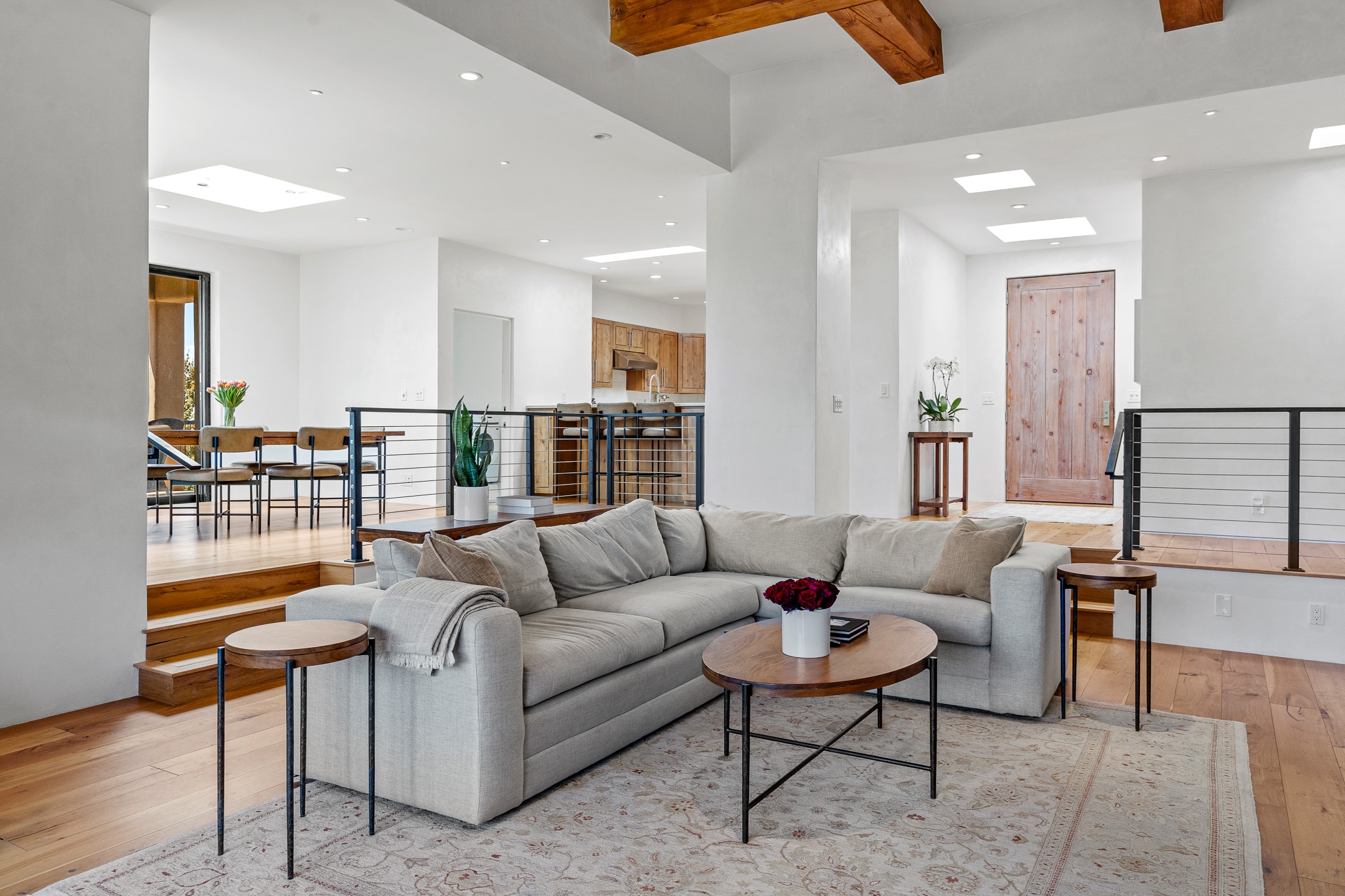 Modern Elegance in the Mountains -- A Sanctuary in the Sky-Built by award winning builder Fred Klein.Perched high above the city in the coveted Cerros Colorados community, find this breathtaking contemporary retreat where clean design meets timeless Santa Fe charm. Every moment in this 2,719- square-foot home is framed by expansive views of Sun and Moon Mountains, sparkling city lights, and the sweeping majesty of Northern New Mexico. For those who crave a connection to nature, this home is perfectly positioned with easy access to the Dale Ball Trails and on the scenic route to the Santa Fe Ski Basin. Inside, this 3-bedroom, 3-bath home has been thoughtfully updated with a modern aesthetic that still honors the spirit of Santa Fe. Wide-plank oak floors and smooth white plaster walls create a calming, gallery-like backdrop for art and life. The living room, with its wood-burning fireplace and rustic cross-beamed ceilings, offers a sense of grounded luxury--especially when the disappearing glass wall opens to a stunning portal that blurs the line between indoors and out. Imagine evenings here: cozying up by the outdoor fireplace, sharing stories around the built-in grill and bar, the scent of pion in the air, and stars stretching across a velvet sky. Just above the living room, a spacious dining area opens to another patio--perfect for dinner with a view. The chef's kitchen is a dream: generous in space, fitted with Wolf and Sub-Zero appliances, new stone countertops, and a tasteful tile backsplash. The primary suite is a private retreat with its own secluded patio--a quiet space to greet the day or wind down under the stars. The ensuite bath is pure indulgence, with double vanities, a deep soaking tub, and beautiful stone and tile finishes. Even the laundry and mudroom are designed with intention, offering a stylish and functional drop zone for gear, coats, and everyday living. Whether you're seeking stillness or adventure, this home offers both in a setting that inspires every day.