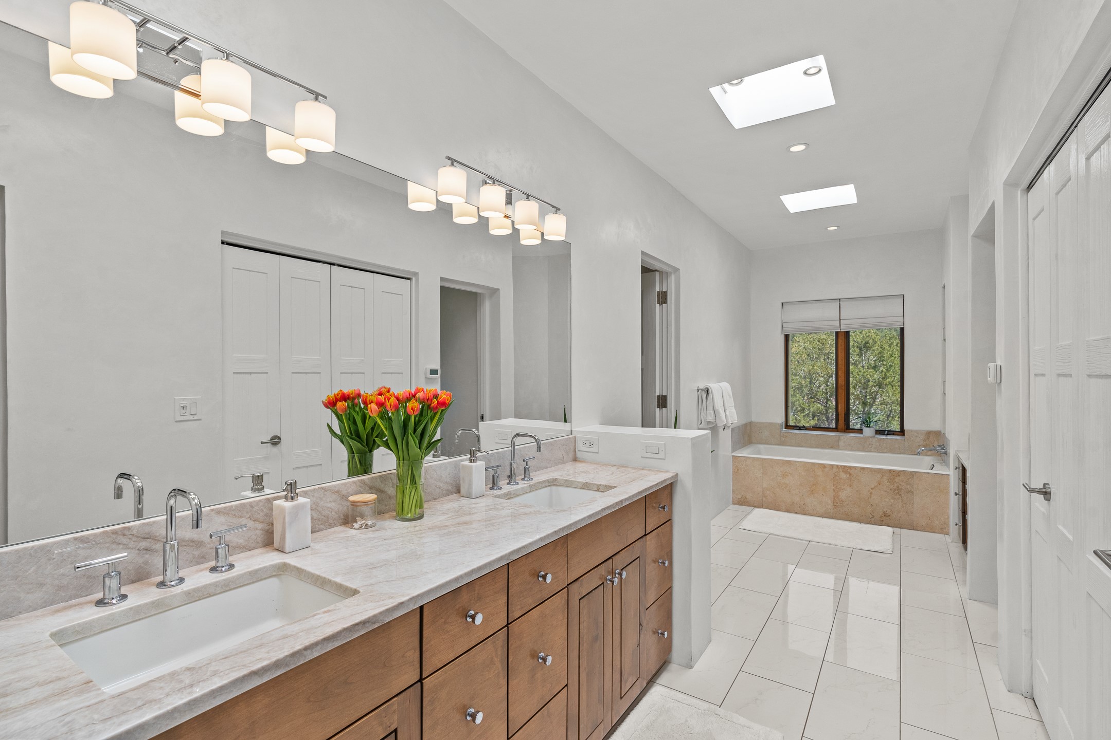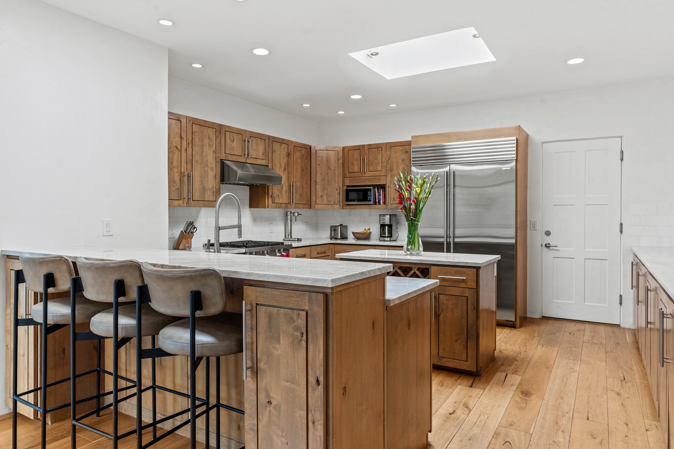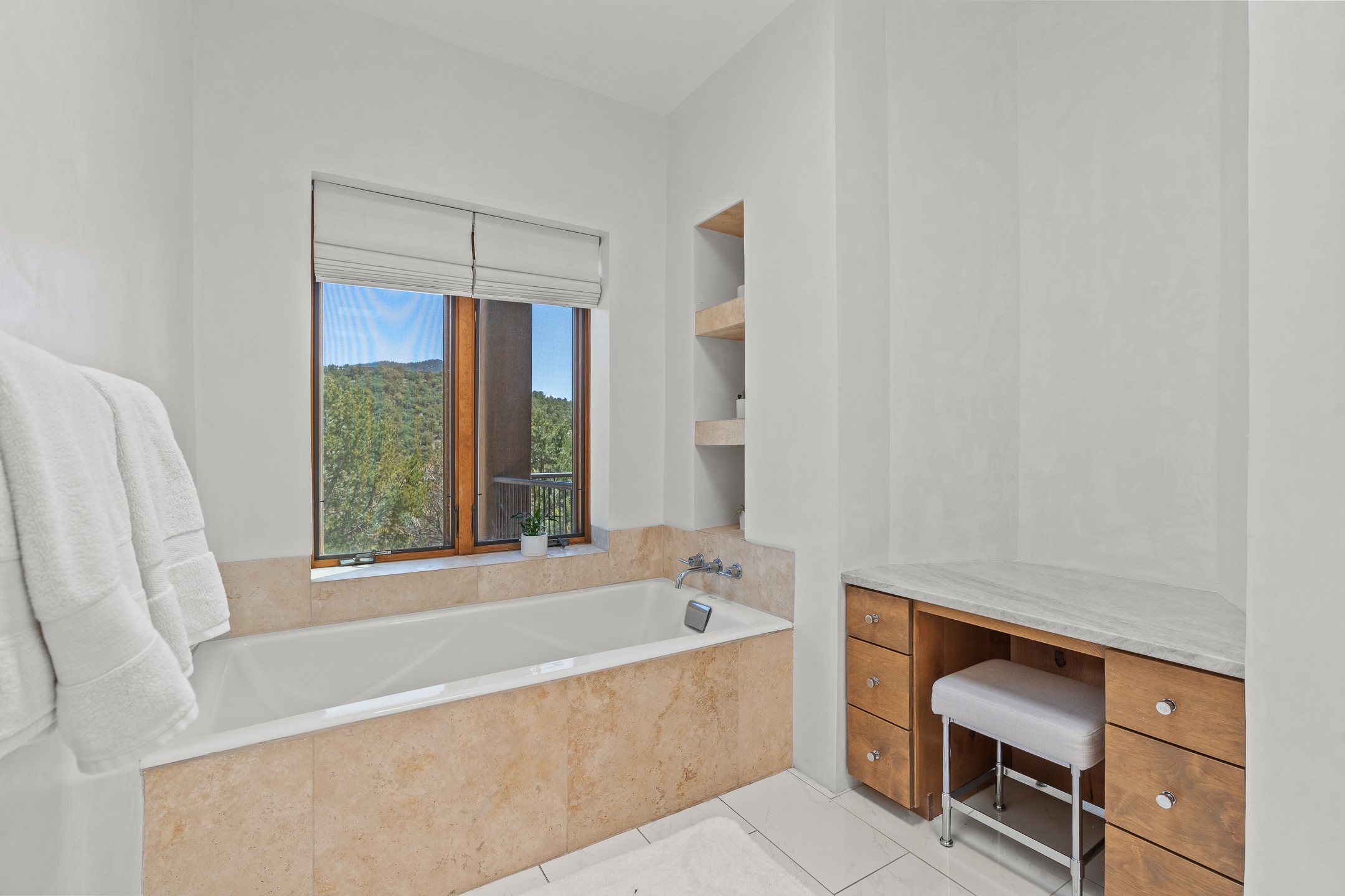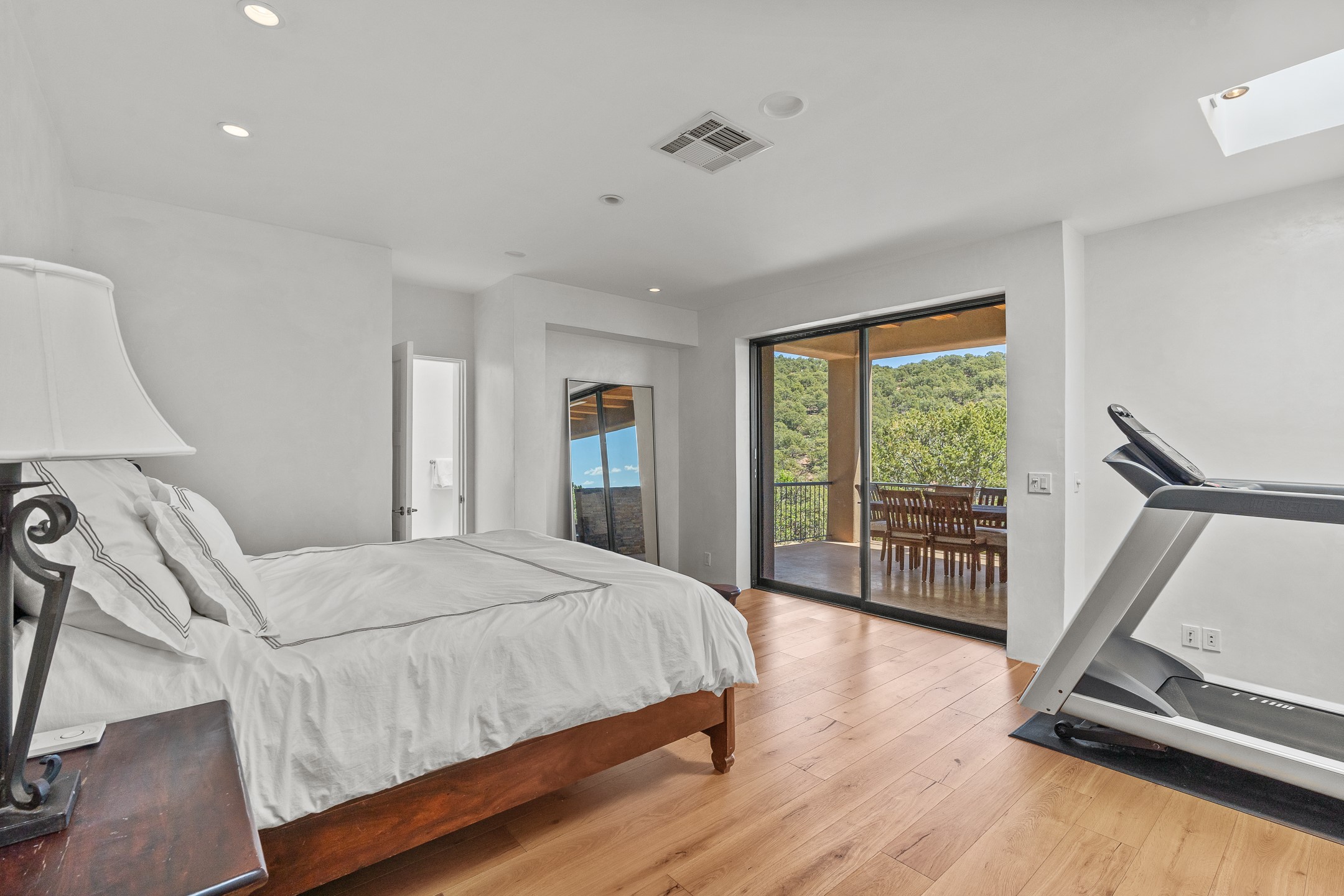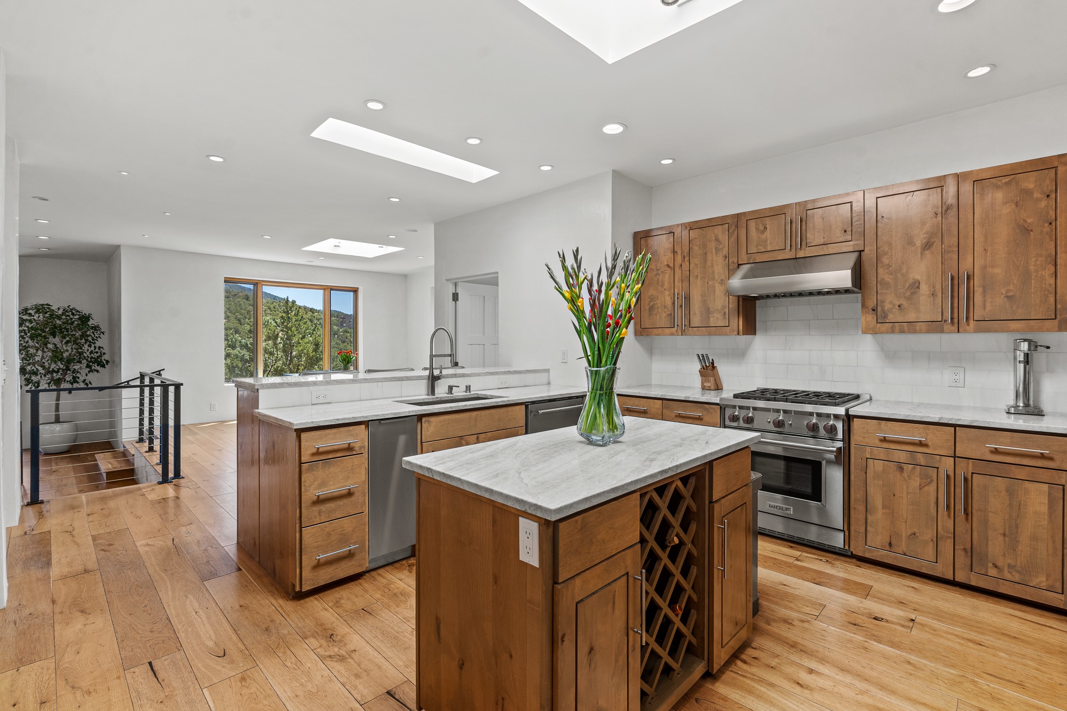 Modern Elegance in the Mountains -- A Sanctuary in the Sky-Built by award winning builder Fred Klein.Perched high above the city in the coveted Cerros Colorados community, find this breathtaking contemporary retreat where clean design meets timeless Santa Fe charm. Every moment in this 2,719- square-foot home is framed by expansive views of Sun and Moon Mountains, sparkling city lights, and the sweeping majesty of Northern New Mexico. For those who crave a connection to nature, this home is perfectly positioned with easy access to the Dale Ball Trails and on the scenic route to the Santa Fe Ski Basin. Inside, this 3-bedroom, 3-bath home has been thoughtfully updated with a modern aesthetic that still honors the spirit of Santa Fe. Wide-plank oak floors and smooth white plaster walls create a calming, gallery-like backdrop for art and life. The living room, with its wood-burning fireplace and rustic cross-beamed ceilings, offers a sense of grounded luxury--especially when the disappearing glass wall opens to a stunning portal that blurs the line between indoors and out. Imagine evenings here: cozying up by the outdoor fireplace, sharing stories around the built-in grill and bar, the scent of pion in the air, and stars stretching across a velvet sky. Just above the living room, a spacious dining area opens to another patio--perfect for dinner with a view. The chef's kitchen is a dream: generous in space, fitted with Wolf and Sub-Zero appliances, new stone countertops, and a tasteful tile backsplash. The primary suite is a private retreat with its own secluded patio--a quiet space to greet the day or wind down under the stars. The ensuite bath is pure indulgence, with double vanities, a deep soaking tub, and beautiful stone and tile finishes. Even the laundry and mudroom are designed with intention, offering a stylish and functional drop zone for gear, coats, and everyday living. Whether you're seeking stillness or adventure, this home offers both in a setting that inspires every day.
