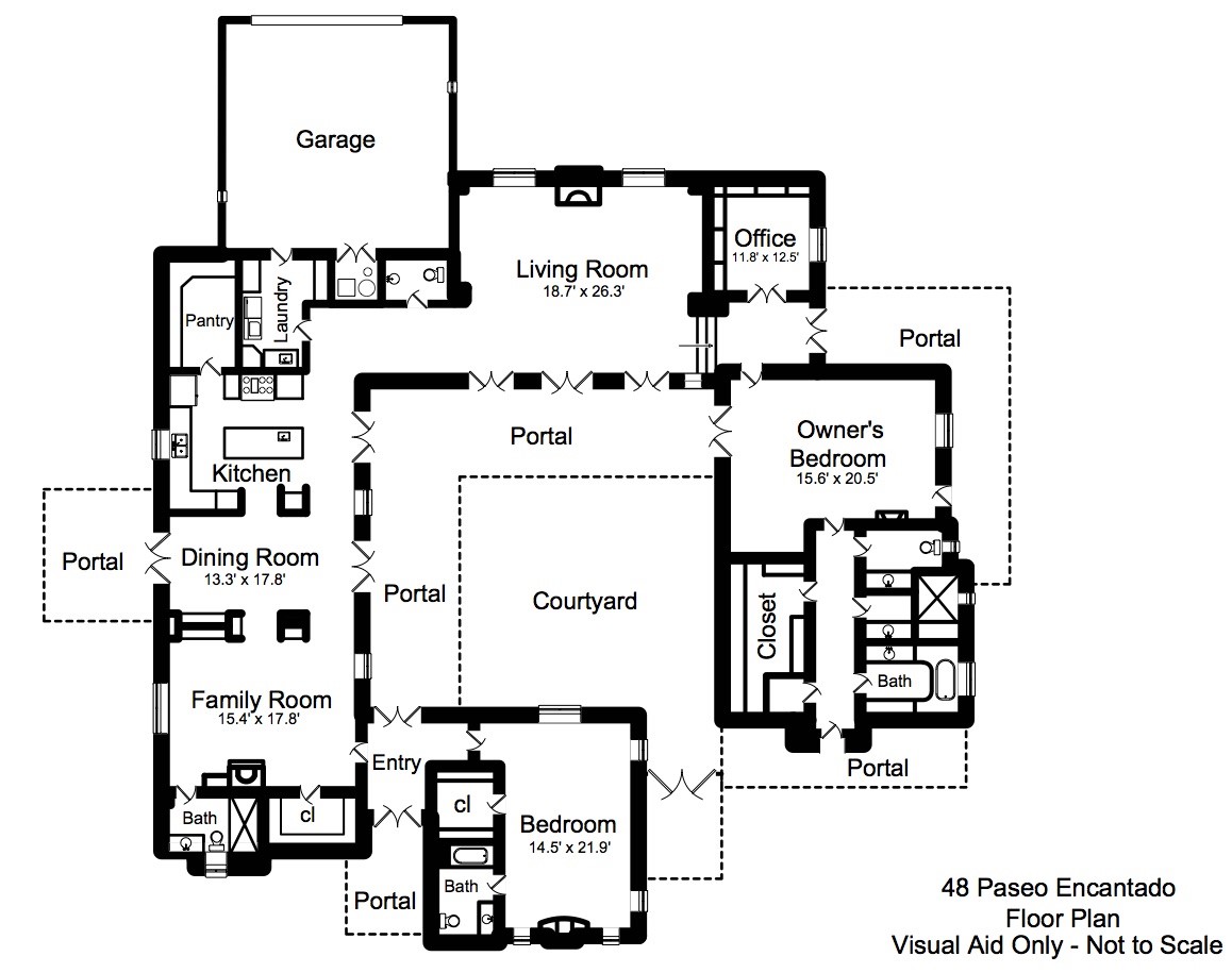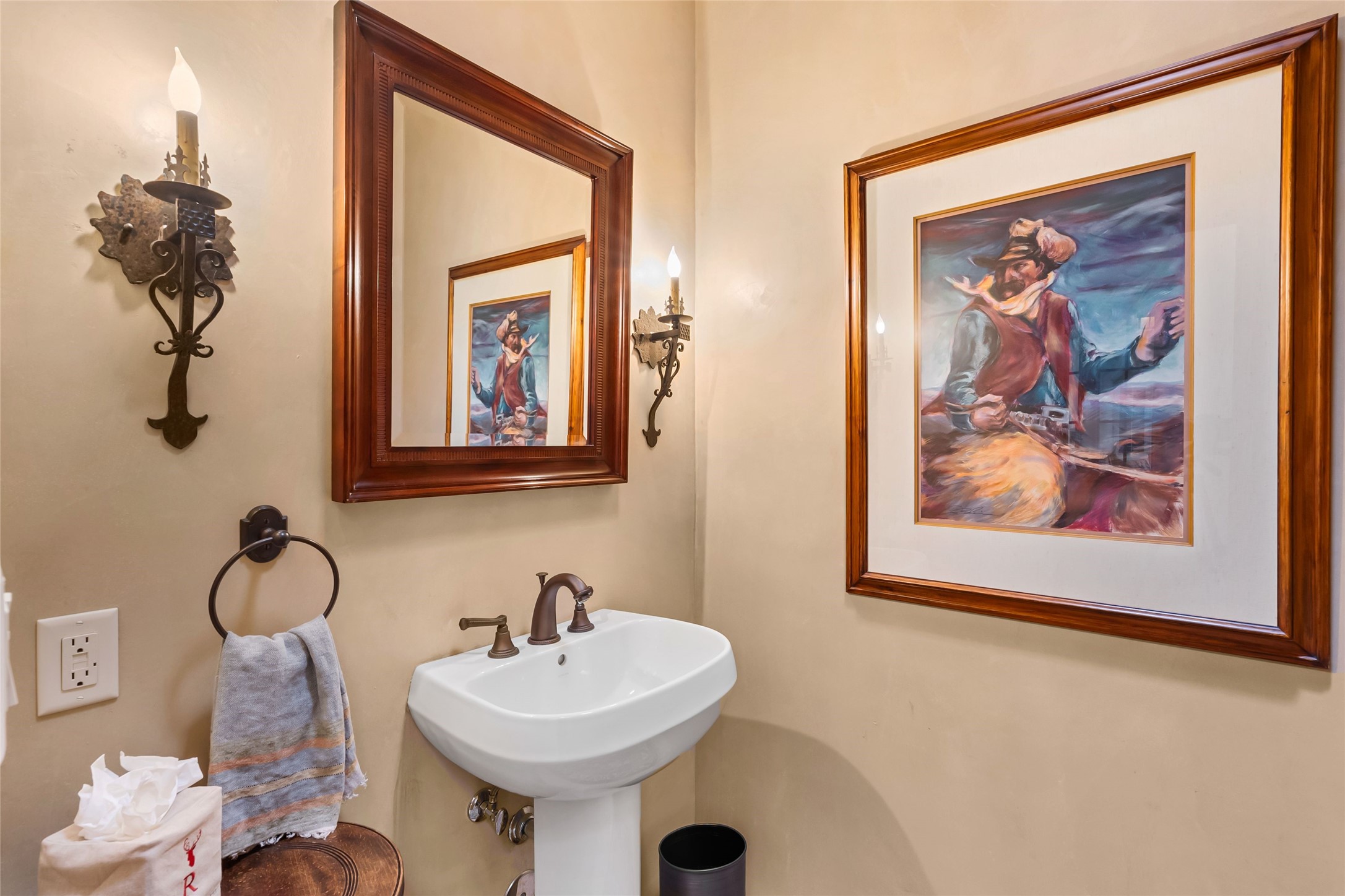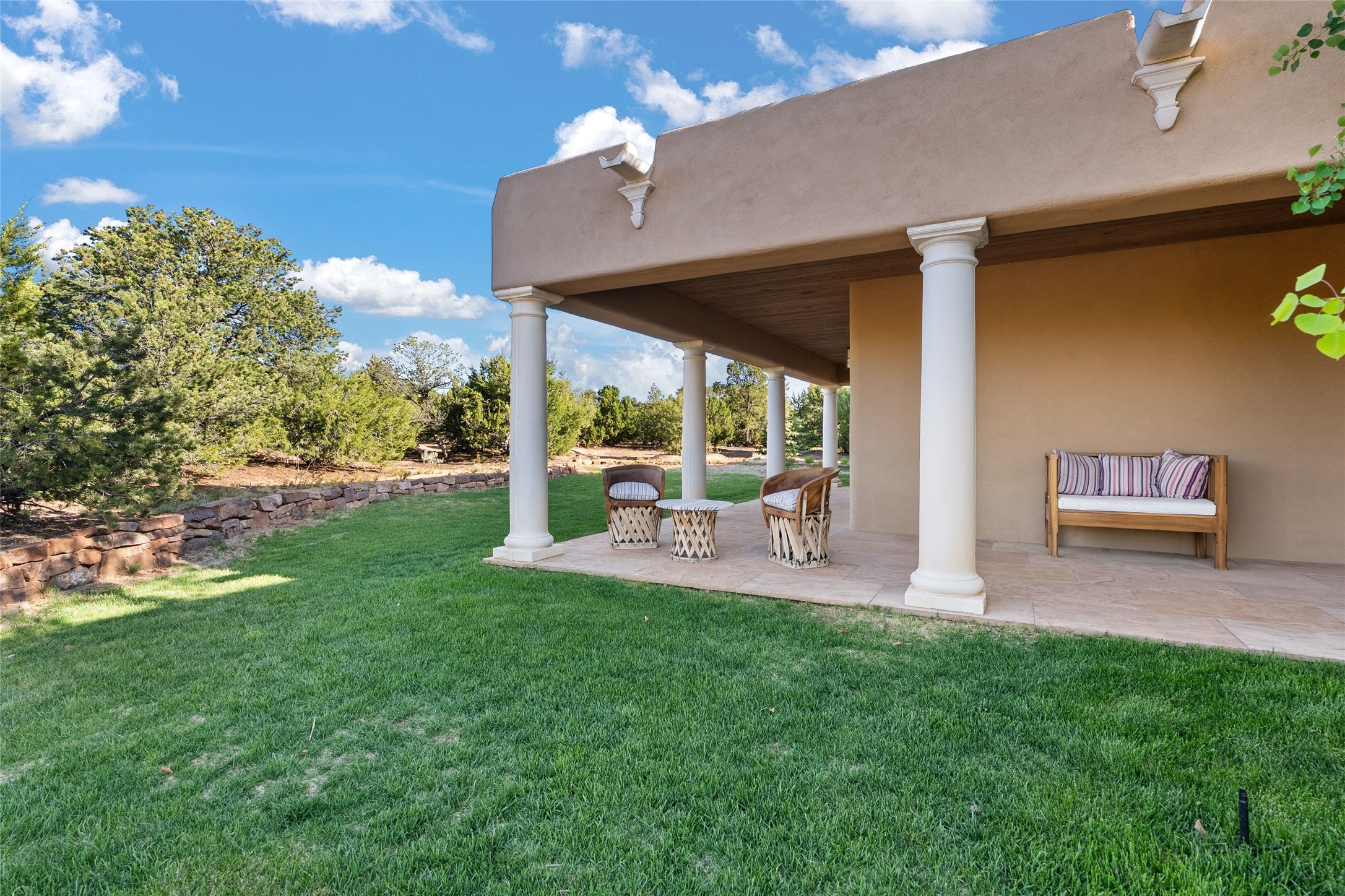 This gated 5.2-acre estate in the Sangre de Cristo foothills is only 18 minutes from the Santa Fe Plaza and offers panoramic views of the Sangres, Jemez Mountains, and Badlands. 4,752 sf living, 802 sf 2-car garage, 5 portals totaling 1,820 sf. of outdoor living space! 880 sf portal wraps the central, Aspen shaded courtyard with large stone fountain. Beds and gardens are filled with a vibrant array of flowers, grasses, and trees. West facing portal offers dramatic sunsets with lovely outdoor eating area. A private walled garden off the primary suite includes a smaller portal and outdoor fireplace. Interiors are warm, and light filled with a wide choice of cozy private and formal entertainment spaces. Rich interior finishes focus on traditional and timeless New Mexican details, beamed and wood plank ceilings, meticulously cut flagstone floors, Diamond plaster walls, 4 interior fireplaces, custom cabinetry, granite, sandstone counters and 10 skylights. Constructed with 2' to 4' thick Pumice-Crete walls, a labor-intensive, fireproof building method that beautifully replicates the look and feel of traditional triple-stacked adobe and is noted for its beauty, stability, noise reduction, and energy efficient qualities. Radiant floor heating, recently installed high efficiency AC condenser system save energy by preheating water for the propane fired boiler and converts to a chilled floor cooling system during summer months! Low profile solar panel system produces more power than the residence uses yielding monthly electric bills less than $12.00/month! A cozy family room, formal dining, kitchen, and spacious great room, all access the courtyard for spectacular entertaining or intimate gatherings. Two separated primarysuites plus office with tasteful built-ins. New improvements include stone planters and driveway borders, native trees, grasses, shrubs and flowers, new landscape irrigation system, new roof with extended warranty,new skylights, refreshed exterior stucco.