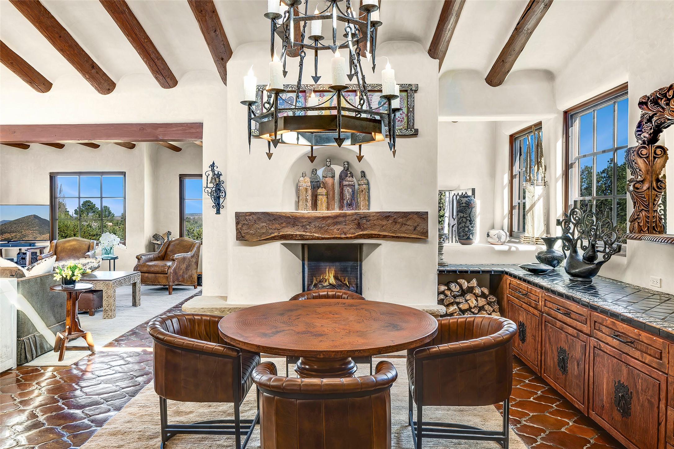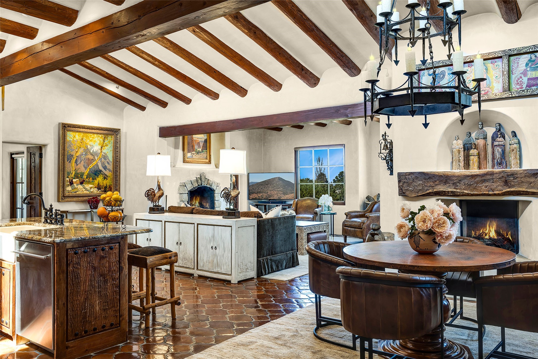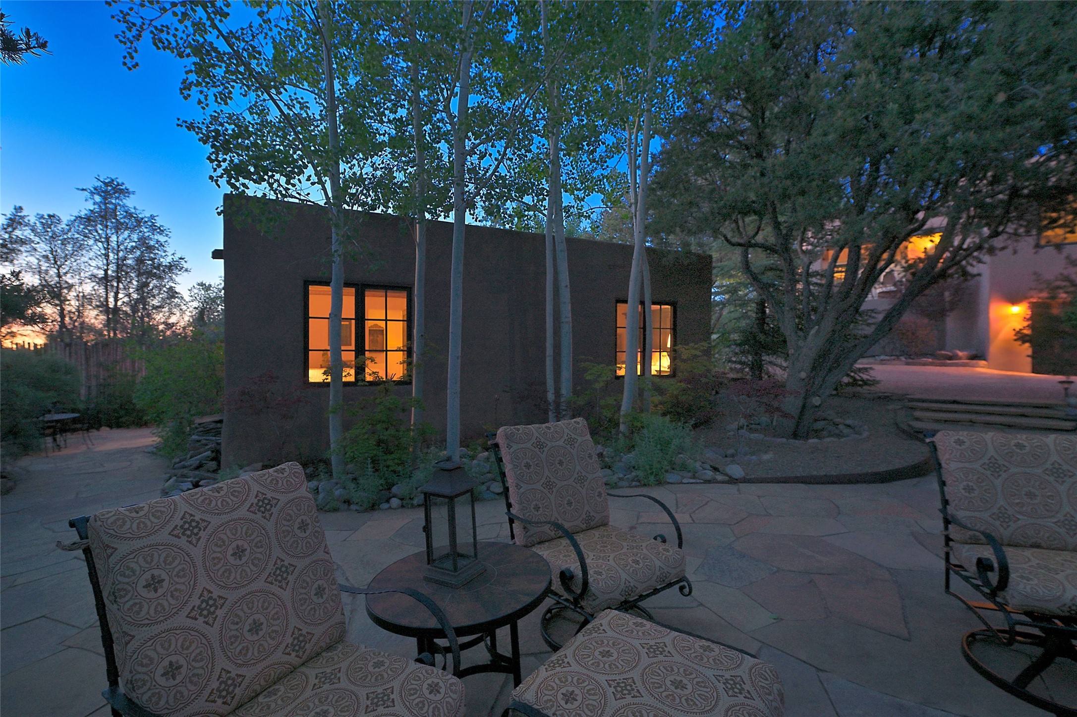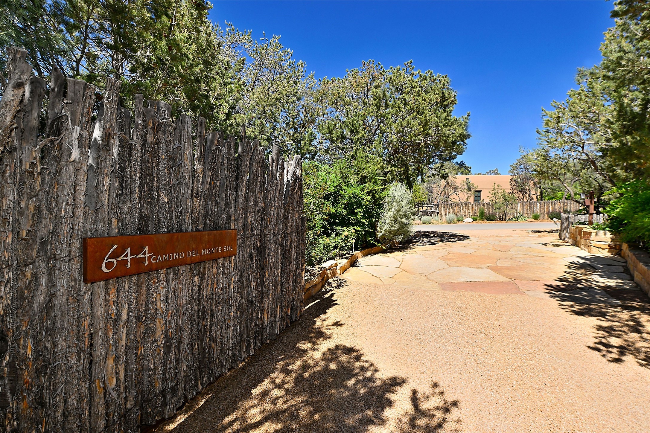Experience the Santa Fe Dream on Camino del Monte Sol. This exceptional Eastside compound offers the quintessential Santa Fe lifestyle on a desirable, elevated half-acre lot, blocks from the famed Canyon Road. Enter through the electric gate with latillas, meander through the tree grove down the gravel drive and ascend the stone steps, leaving the world behind. Aspens whisper in the breeze above, leading you to a beautifully appointed home boasting a great room with vigas, plaster walls, coved ceilings, abundant natural light, a center piece fireplace and ample room for your art. Culinary enthusiasts will appreciate the island kitchen with custom wood-carved cabinets, Wolf range and Sub-Zero refrigerator, while the open dining room features its own romantic fireplace. Each living space and bedroom in the main house is anchored by a fireplace, creating a warm and inviting ambiance during the cooler months. The great room and primary suite with large awning windows both open to a treetop level covered portal with kiva fireplace. All of these spaces overlook the landscaped grounds with aspens, Japanese red maples, blue spruces, roses, peonies, pinions and junipers. From the house, enjoy breathtaking city lights, Jemez Mountain and sunset views. Beyond the main residence, a charming and private two-bedroom, two-bath casita with the same fine appointments of the main home and private stone patio offers ease of entertaining. Indulge in relaxation and recreation with a freestanding lap pool featuring resistance jets and hot tub. A stacked stone outdoor fireplace and multiple patios are designed for both grand entertaining and intimate moments. Practical features include generous parking for both the main house and casita, a convenient attached two car garage and a fully fenced yard. The property seamlessly blends seclusion with convenience, offering easy access to Santa Fe's renowned shopping, dining, entertainment and hiking trails, within the heart of the Historic Eastside.