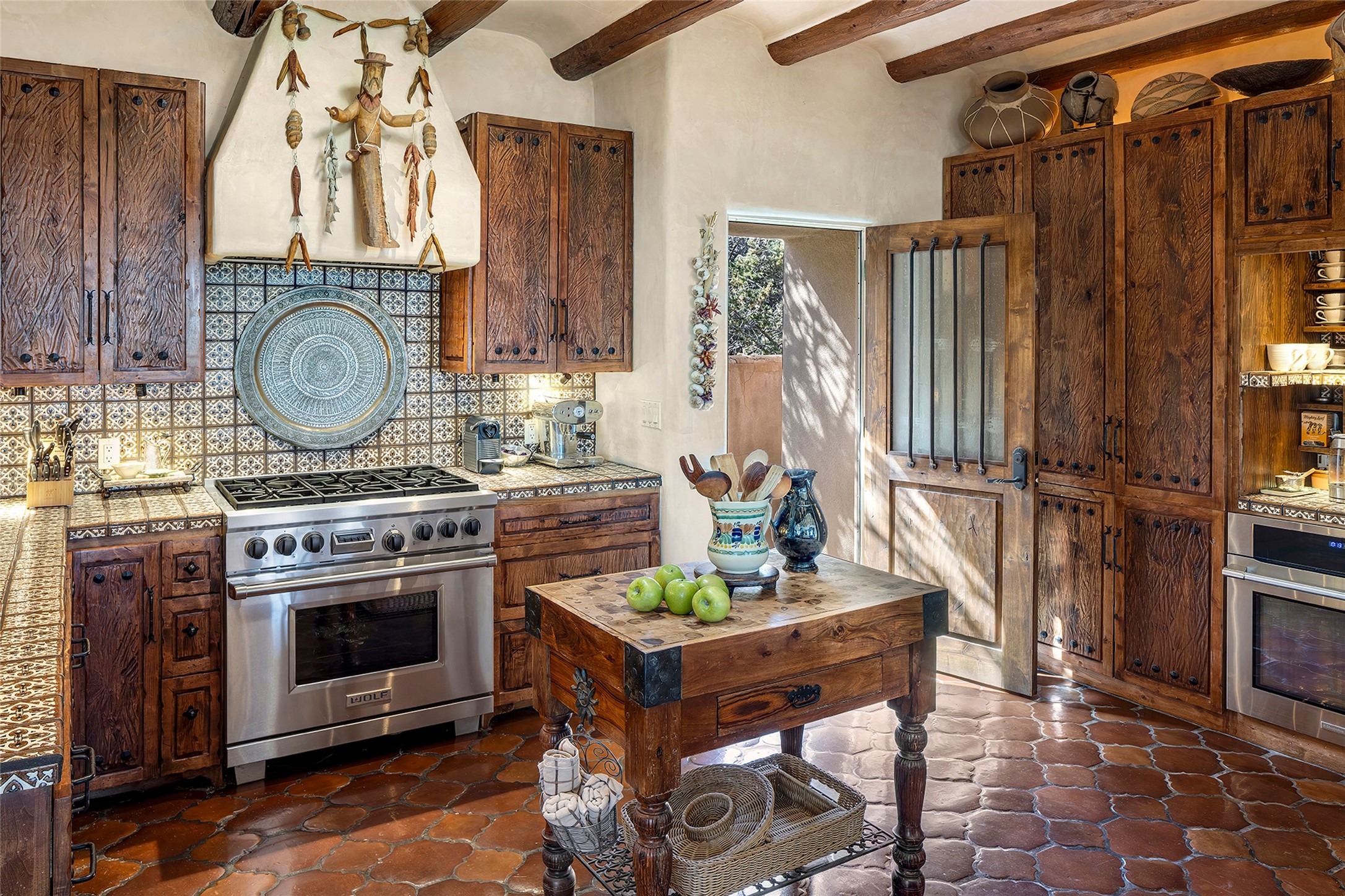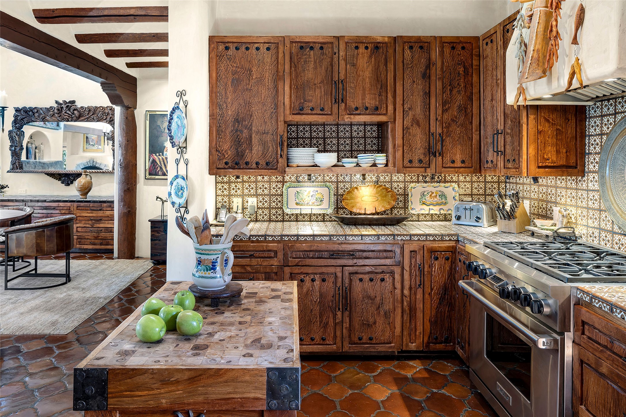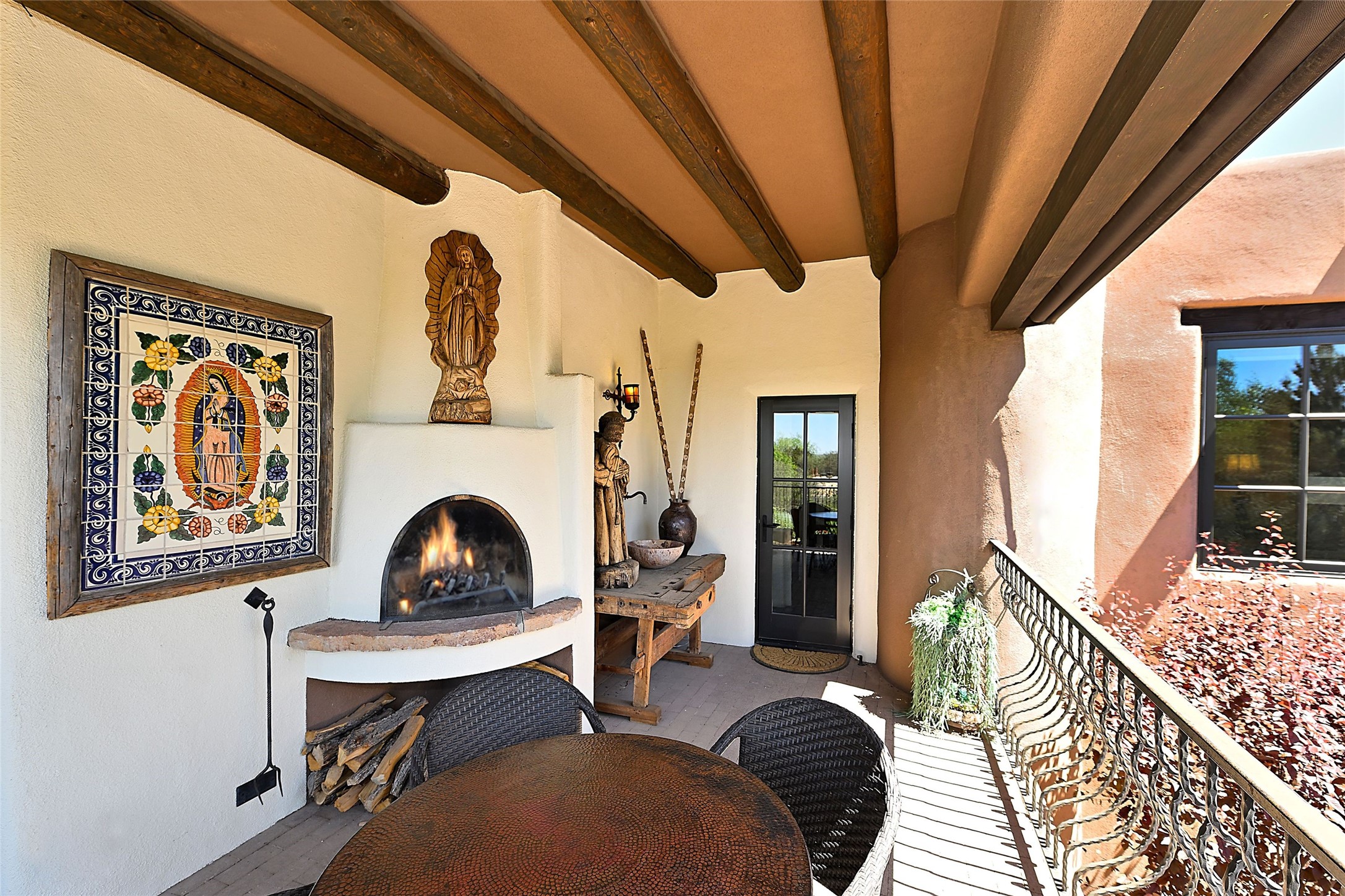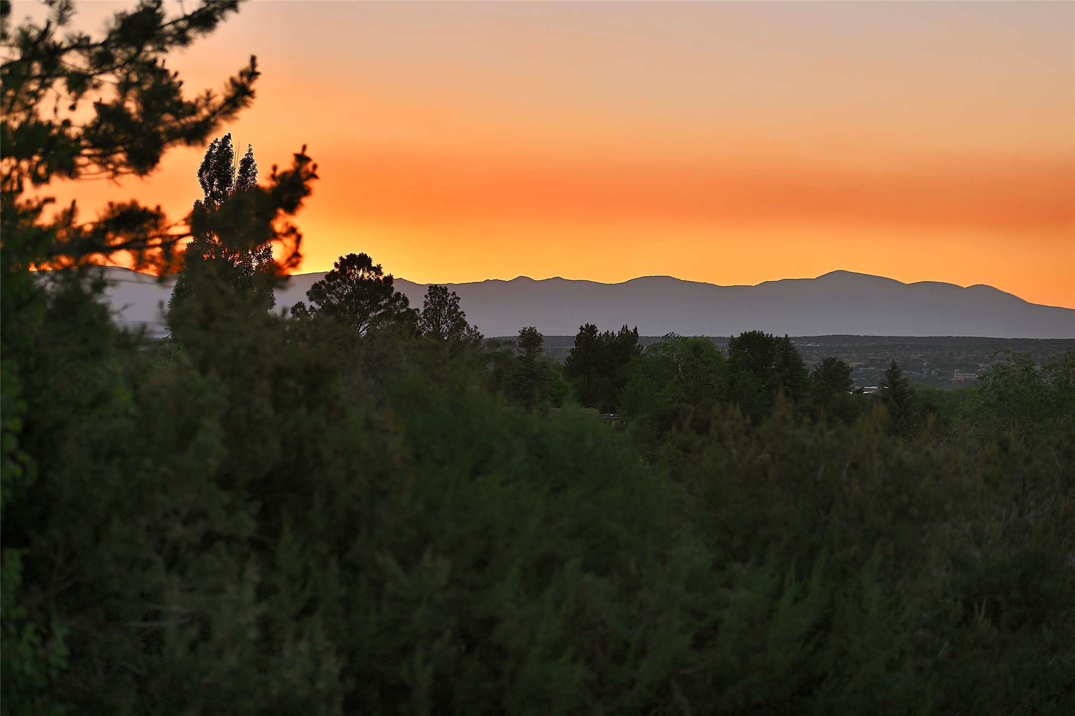Experience the Santa Fe Dream on Camino del Monte Sol. This exceptional Eastside compound offers the quintessential Santa Fe lifestyle on a desirable, elevated half-acre lot, blocks from the famed Canyon Road. Enter through the electric gate with latillas, meander through the tree grove down the gravel drive and ascend the stone steps, leaving the world behind. Aspens whisper in the breeze above, leading you to a beautifully appointed home boasting a great room with vigas, plaster walls, coved ceilings, abundant natural light, a center piece fireplace and ample room for your art. Culinary enthusiasts will appreciate the island kitchen with custom wood-carved cabinets, Wolf range and Sub-Zero refrigerator, while the open dining room features its own romantic fireplace. Each living space and bedroom in the main house is anchored by a fireplace, creating a warm and inviting ambiance during the cooler months. The great room and primary suite with large awning windows both open to a treetop level covered portal with kiva fireplace. All of these spaces overlook the landscaped grounds with aspens, Japanese red maples, blue spruces, roses, peonies, pinions and junipers. From the house, enjoy breathtaking city lights, Jemez Mountain and sunset views. Beyond the main residence, a charming and private two-bedroom, two-bath casita with the same fine appointments of the main home and private stone patio offers ease of entertaining. Indulge in relaxation and recreation with a freestanding lap pool featuring resistance jets and hot tub. A stacked stone outdoor fireplace and multiple patios are designed for both grand entertaining and intimate moments. Practical features include generous parking for both the main house and casita, a convenient attached two car garage and a fully fenced yard. The property seamlessly blends seclusion with convenience, offering easy access to Santa Fe's renowned shopping, dining, entertainment and hiking trails, within the heart of the Historic Eastside.
