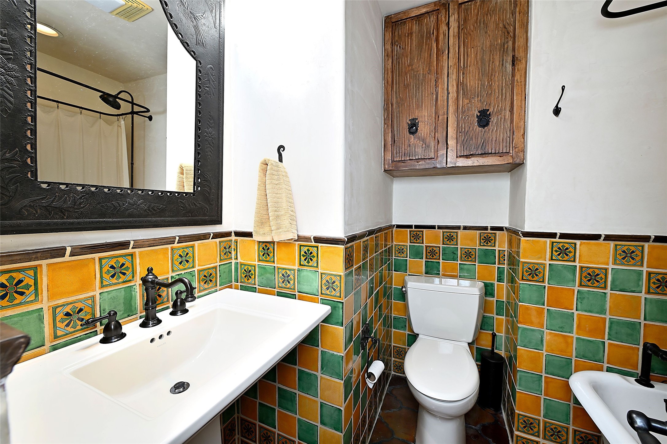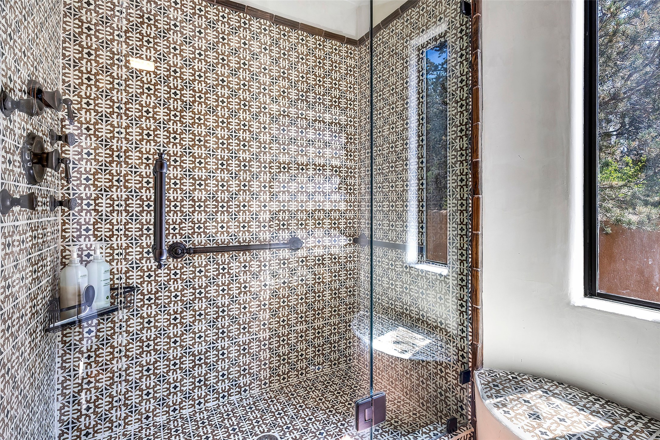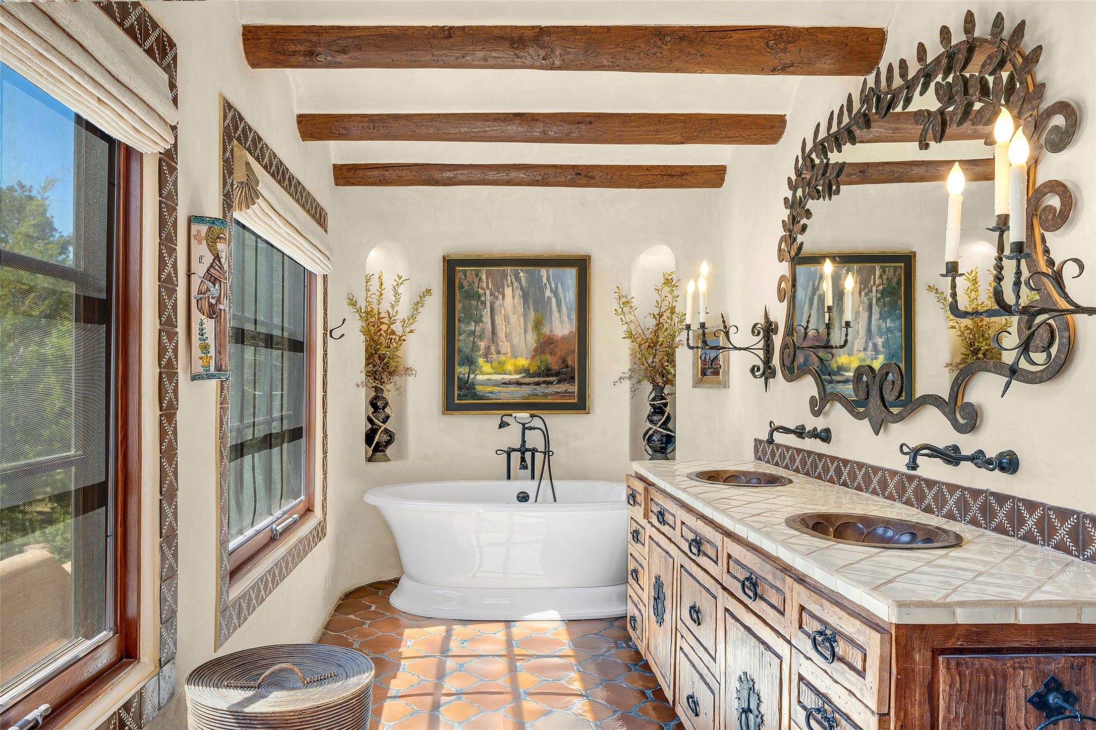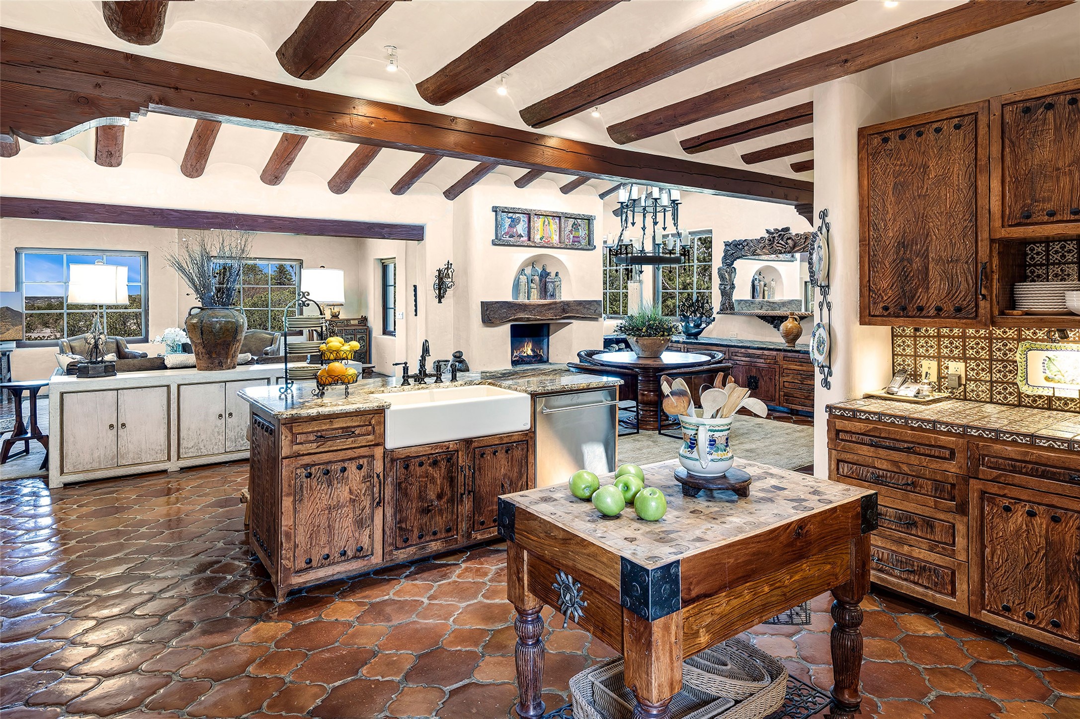Experience the Santa Fe Dream on Camino del Monte Sol. This exceptional Eastside compound offers the quintessential Santa Fe lifestyle on a desirable, elevated half-acre lot, blocks from the famed Canyon Road. Enter through the electric gate with latillas, meander through the tree grove down the gravel drive and ascend the stone steps, leaving the world behind. Aspens whisper in the breeze above, leading you to a beautifully appointed home boasting a great room with vigas, plaster walls, coved ceilings, abundant natural light, a center piece fireplace and ample room for your art. Culinary enthusiasts will appreciate the island kitchen with custom wood-carved cabinets, Wolf range and Sub-Zero refrigerator, while the open dining room features its own romantic fireplace. Each living space and bedroom in the main house is anchored by a fireplace, creating a warm and inviting ambiance during the cooler months. The great room and primary suite with large awning windows both open to a treetop level covered portal with kiva fireplace. All of these spaces overlook the landscaped grounds with aspens, Japanese red maples, blue spruces, roses, peonies, pinions and junipers. From the house, enjoy breathtaking city lights, Jemez Mountain and sunset views. Beyond the main residence, a charming and private two-bedroom, two-bath casita with the same fine appointments of the main home and private stone patio offers ease of entertaining. Indulge in relaxation and recreation with a freestanding lap pool featuring resistance jets and hot tub. A stacked stone outdoor fireplace and multiple patios are designed for both grand entertaining and intimate moments. Practical features include generous parking for both the main house and casita, a convenient attached two car garage and a fully fenced yard. The property seamlessly blends seclusion with convenience, offering easy access to Santa Fe's renowned shopping, dining, entertainment and hiking trails, within the heart of the Historic Eastside.