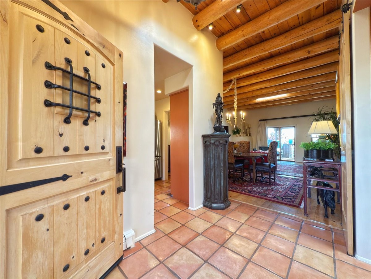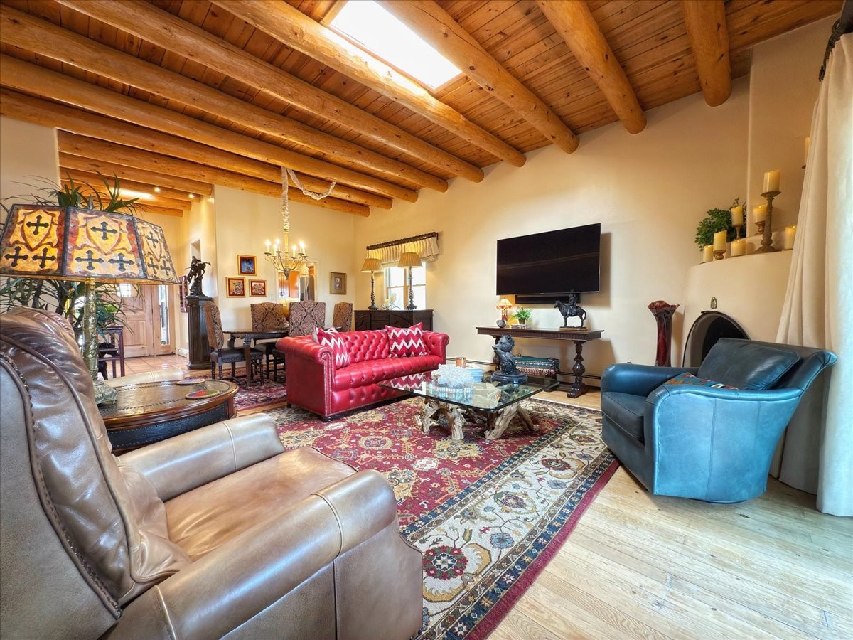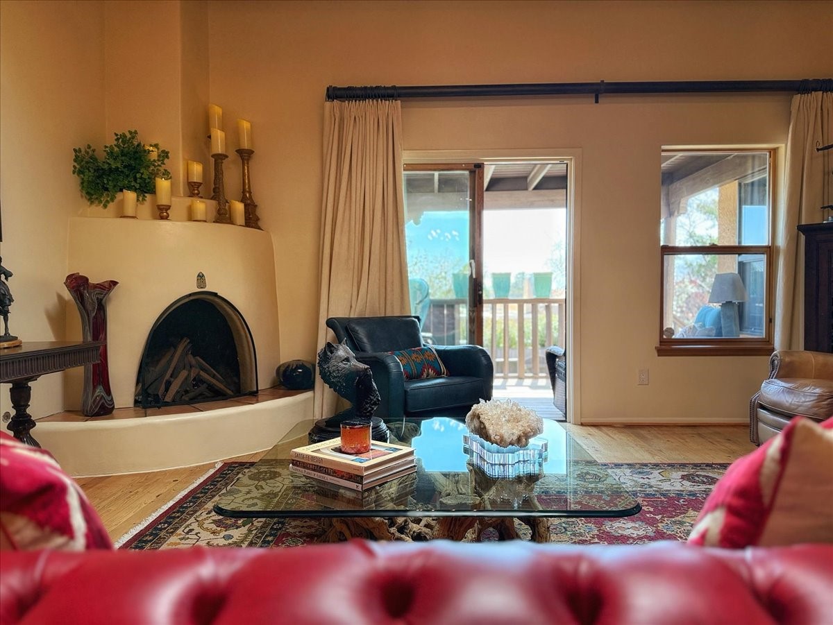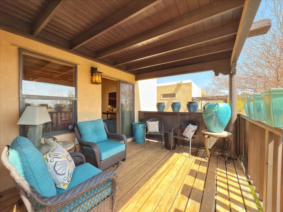 No attention to detail has been spared on this lovely, sophisticated home in the highly desirable Park Plaza community. With two bedrooms, a study and two full baths, this home features beautiful Saltillo tile and custom carpeting in the bedrooms, high ceilings with vigas, separate kitchen with breakfast area and an open dining and living room with a gas Kiva fireplace as a focal point. Other amenities include a dual-fuel range/oven with a warming drawer and a Jacuzzi-style tub in the primary bedroom. Enjoy the outdoors with a beautifully landscaped front courtyard with fountain and a generously sized back patio and fenced backyard. All pots/fountains will remain with the property. Both the front and back yard have top-of-the-line and easy-to-maintain artificial turf. In addition, this gracious home offers a good-sized two-car garage with built-in storage. The home has been well-maintained with updated forced heat and air, tankless water heater, well-cared for roof and stucco and updated appliances. Park Plazas is one of Santa Fe's most desirable communities with walking trails, outdoor fitness, tennis courts and more, plus 10 minutes to the historic Plaza and shopping.