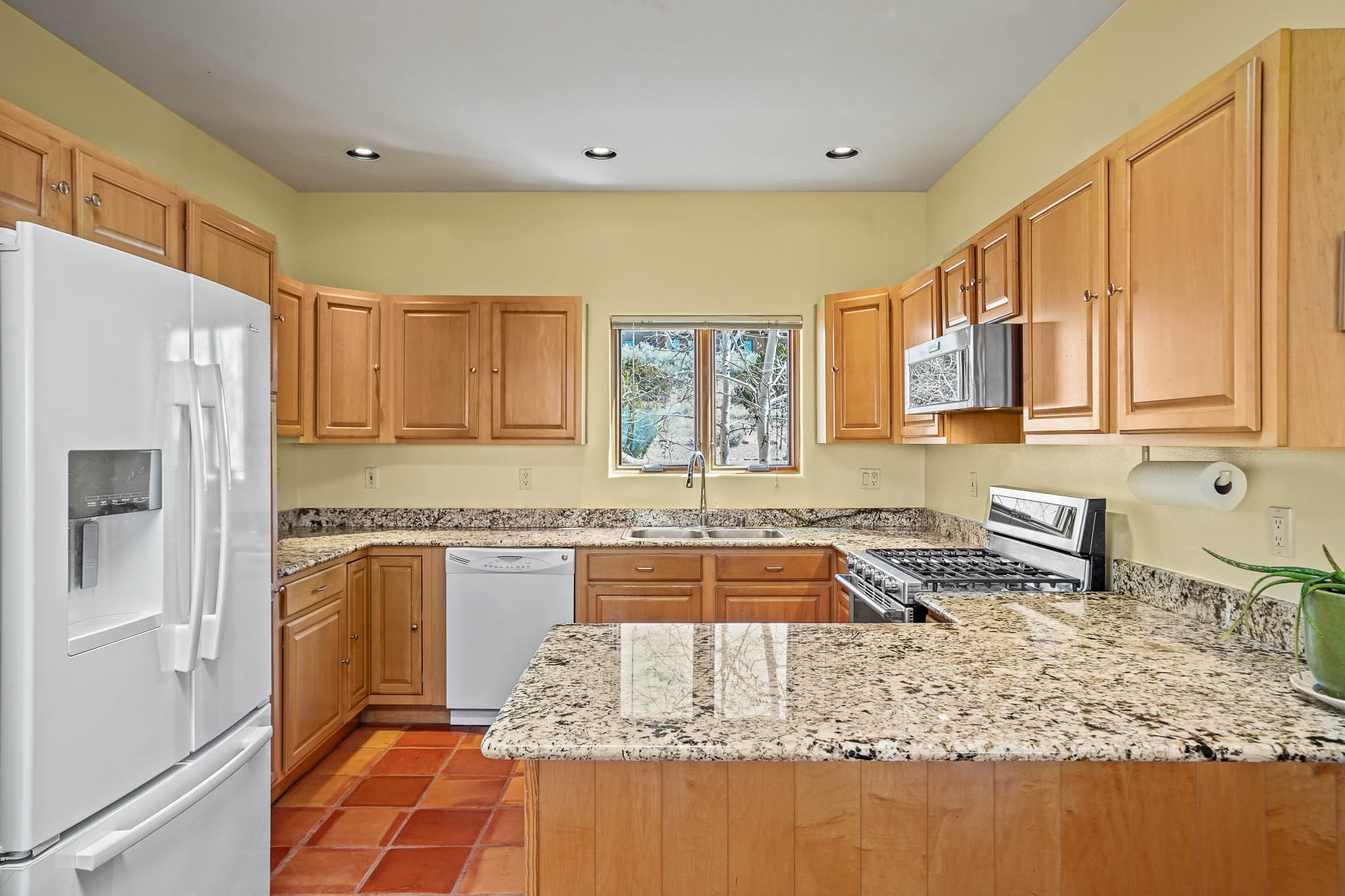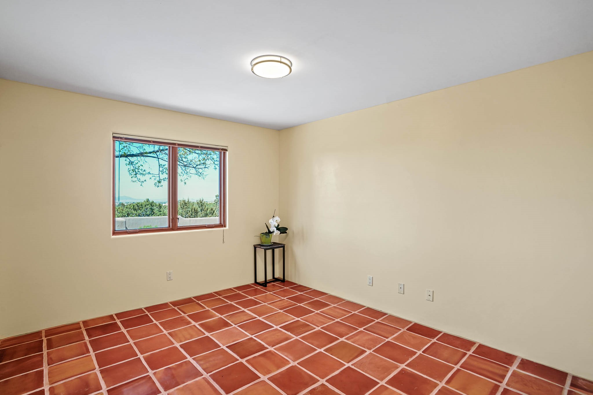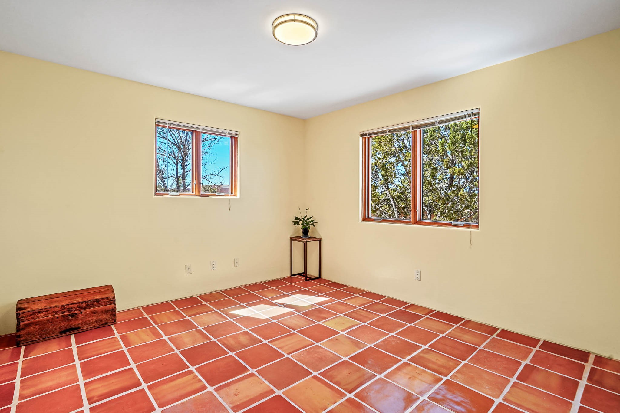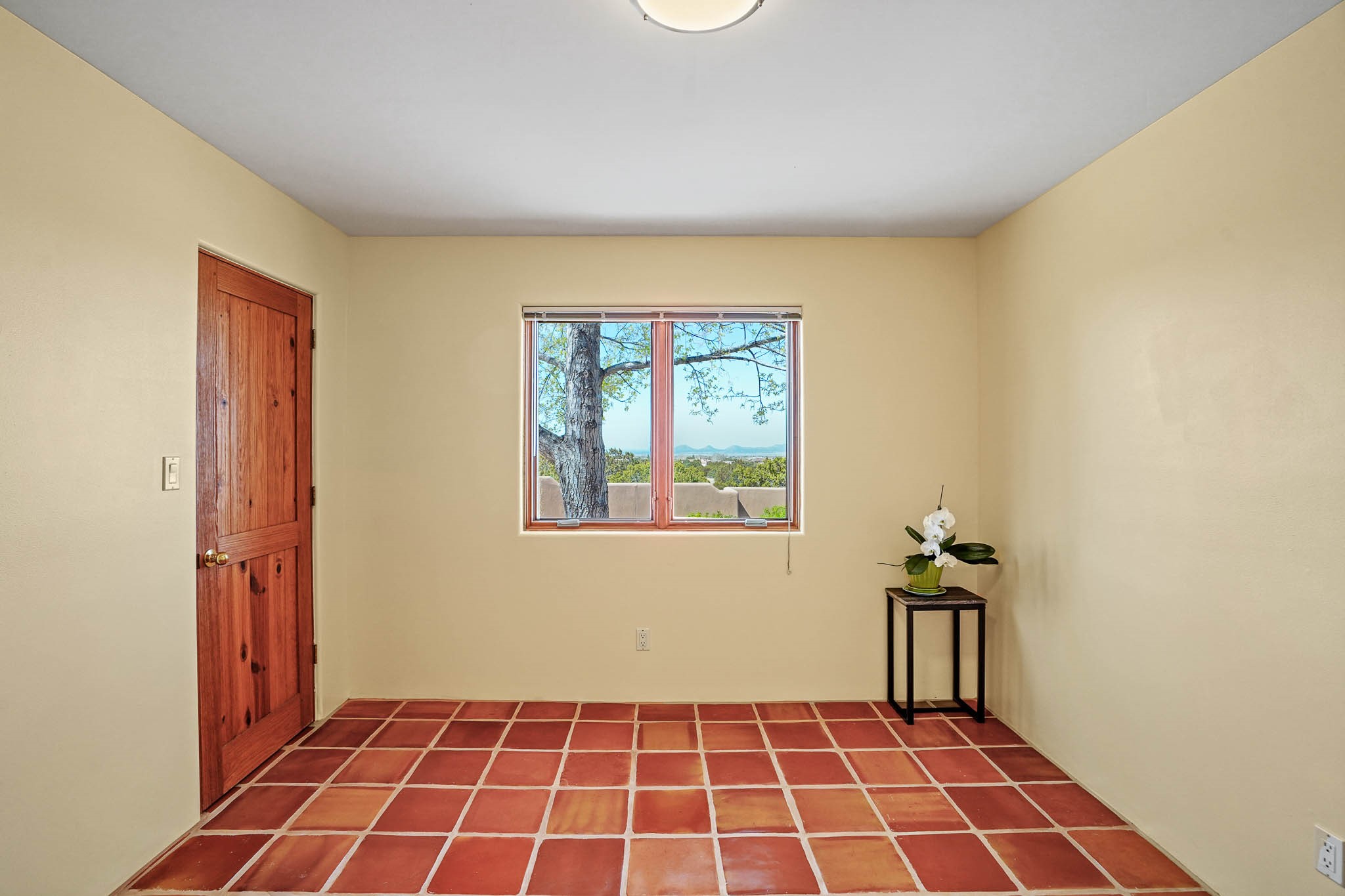 Enjoy breathtaking southwestern mountain views of the Ortiz, Sandia, and the Cerrillos Hills, plus valley views with fabulous sunsets from this classic Santa Fe home on 2.77 acres. The light-filled living area boasts high viga ceilings and a kiva fireplace. Featuring Saltillo tile throughout and radiant heat for cozy comfort. Offering bedroom separation plus a versatile fourth bedroom/office option. Relax in the master suite; featuring another kiva fireplace and a full bath with soaking tub. French doors lead to a generous walled yard with multiple block wall flower terraces, a seasonal outdoor kitchen, and low-maintenance landscaping. Benefit from recirculating hot water, a newer hot water heater, a new roof, and new stucco in 2019. A 3-car garage includes a 220V outlet in the 3rd bay. Enjoy the convenience of nearby local amenities including a grocery store, library, senior center, coffee shop, brew pub, trail system, and elementary school. Abundant wildlife adds to the peaceful setting. Call to schedule your showing today!