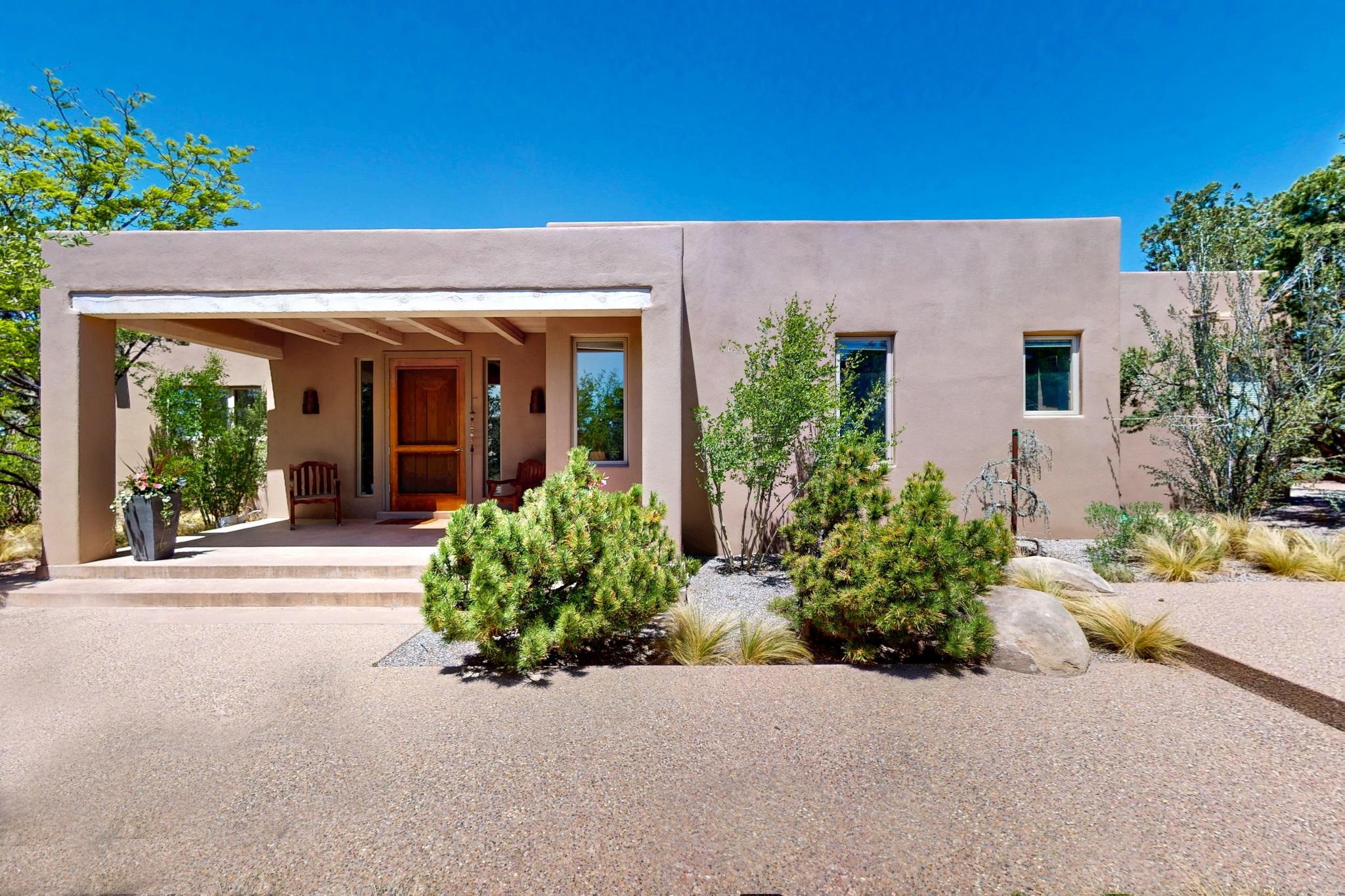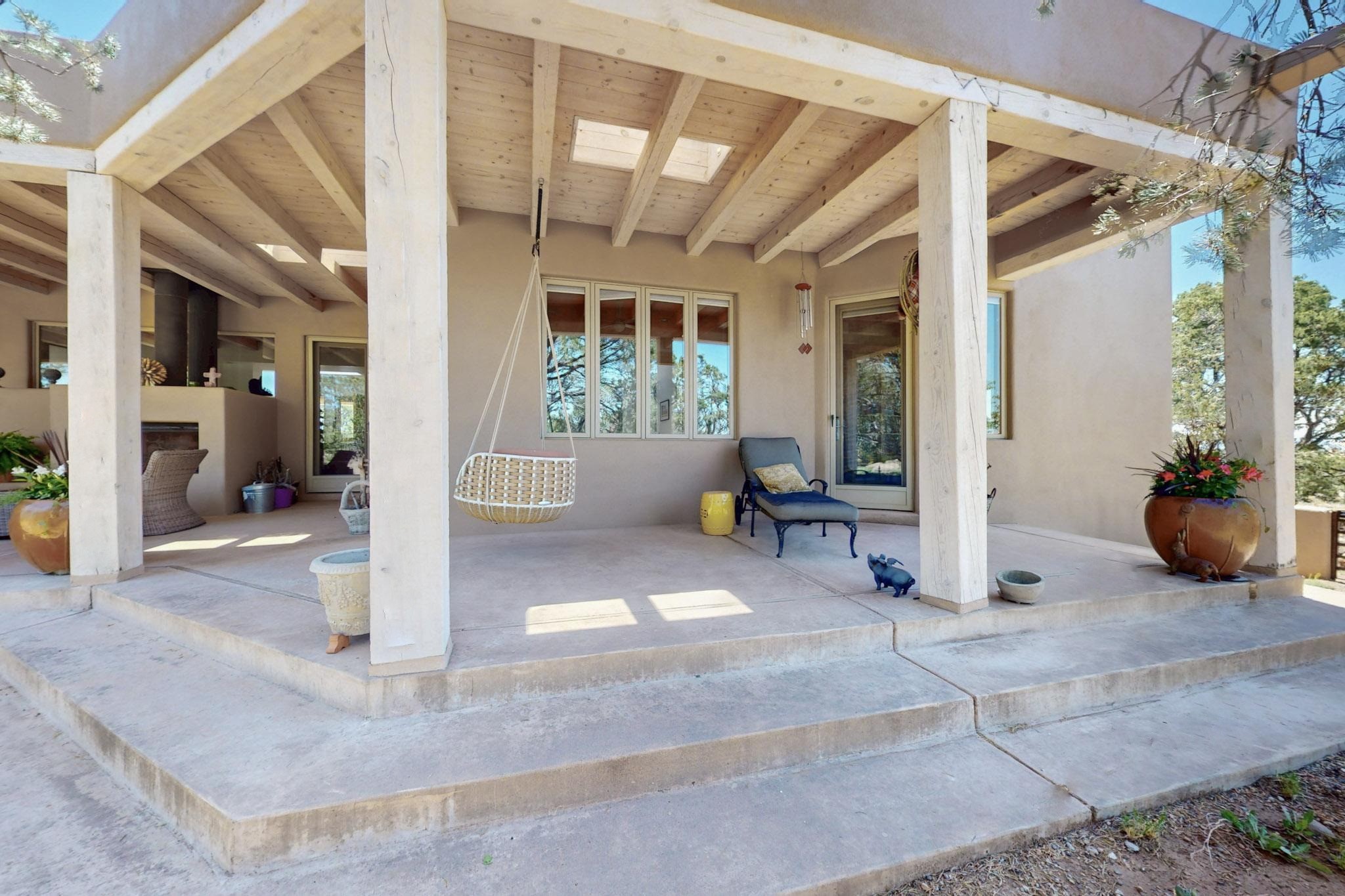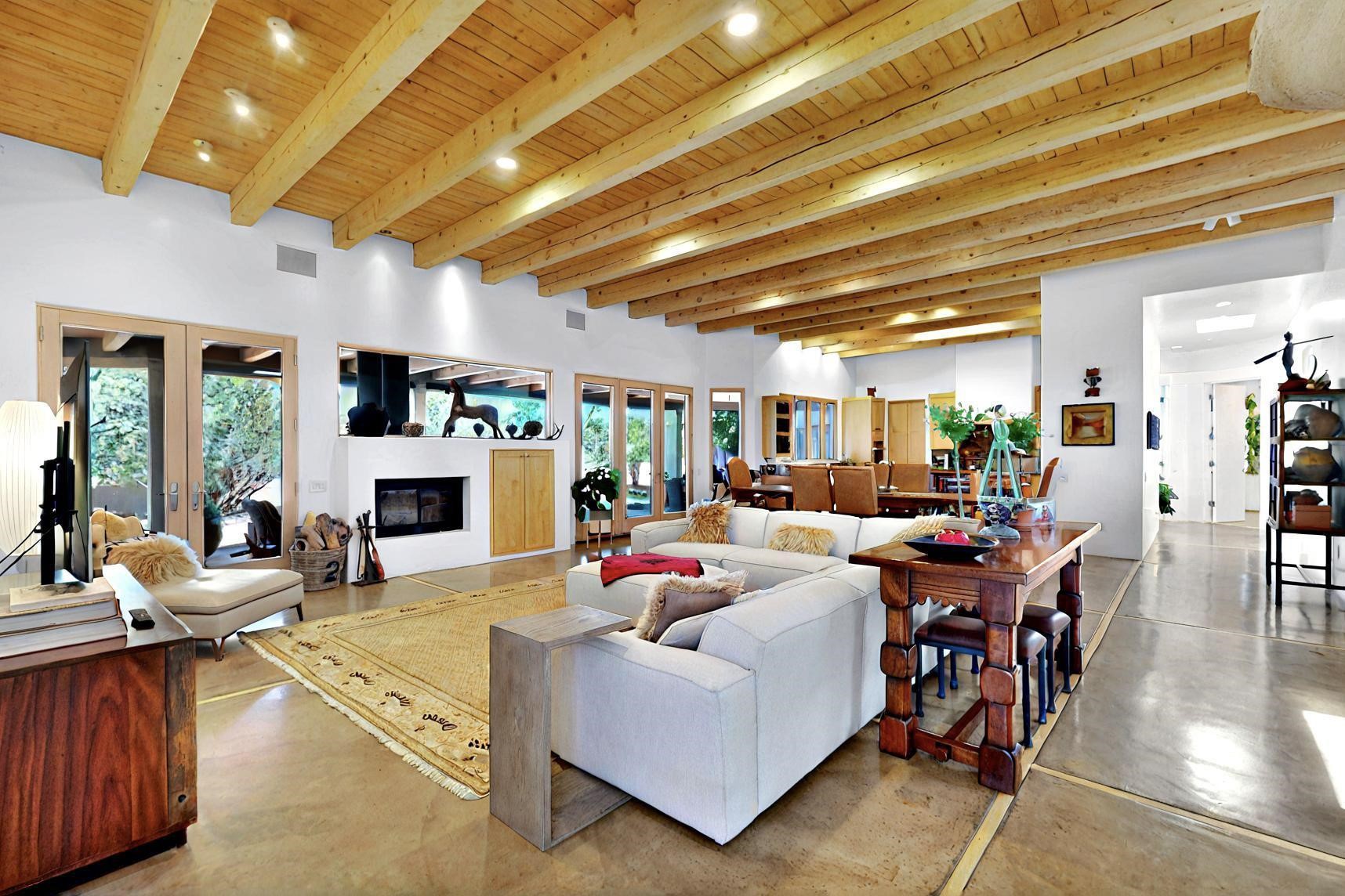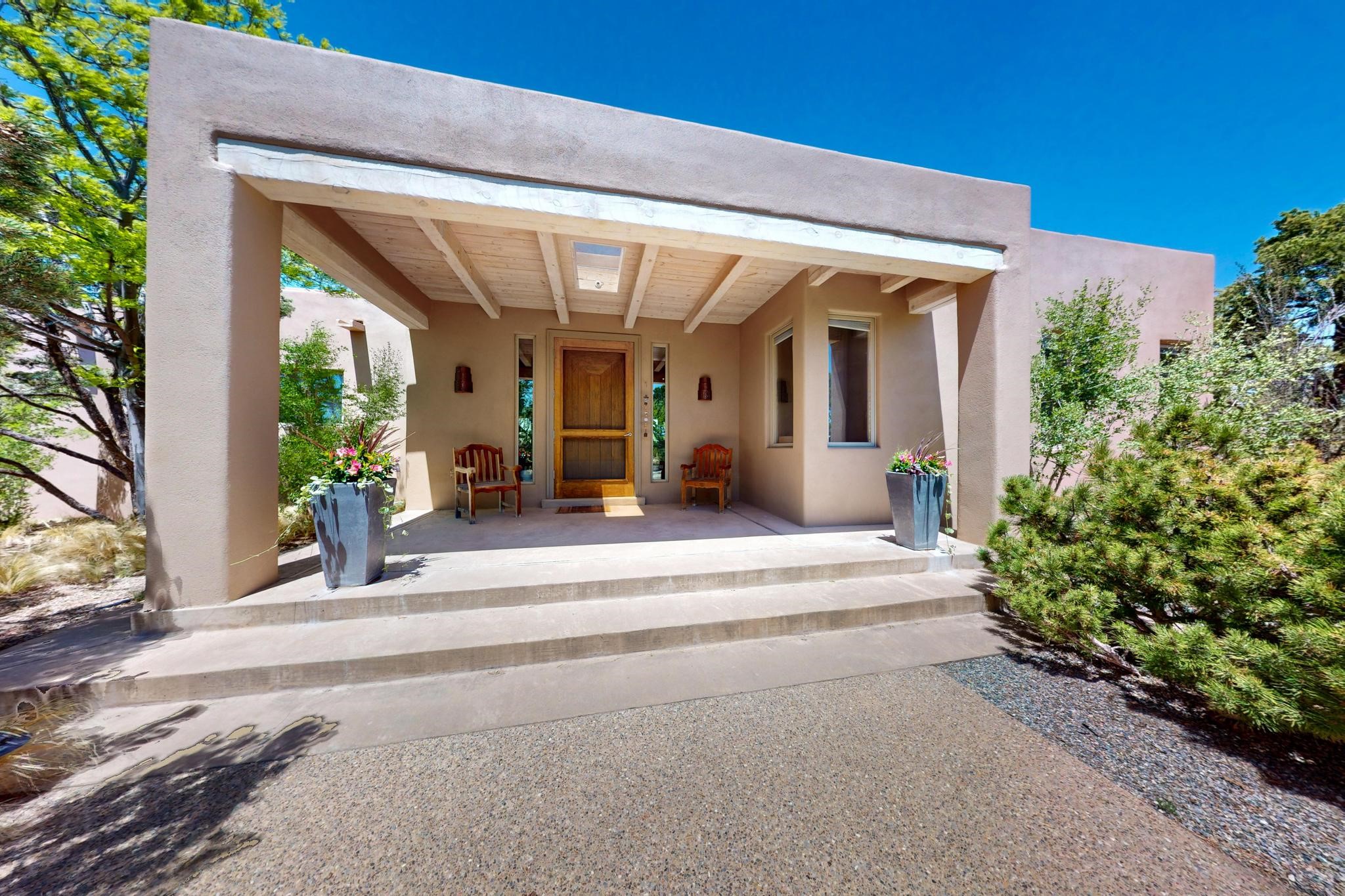 This 4 bedroom, 4 bath home, of which 1 Bedroom and 1 Bath are in an attached guest suite, is perfectly located with proximity to the Las Campanas clubhouse, spa, golf course, and equestrian center. The contemporary style with exposed beams, high ceilings, 4 fireplaces, and open floor plan enhance the spaciousness of the home. The primary suite is spacious and secluded with two separate bathrooms connected by a large shower. The guest spaces are at the other end of the home for privacy. The living area flows to a large portal with fireplace for easy living and entertaining. The portal overlooks a fully enclosed garden space from which to enjoy sunset and mountain views. Enjoy more views and stargaze from the roof deck. The spacious kitchen with pantry is an entertainer's and chef's delight with prep sink, two islands, double ovens, two dishwashers, a 6-burner gas cooktop with griddle, wine cooler, drink refrigerator and a Sub-Zero refrigerator. The attached 2 car heated garage has direct access to the home and guest spaces.