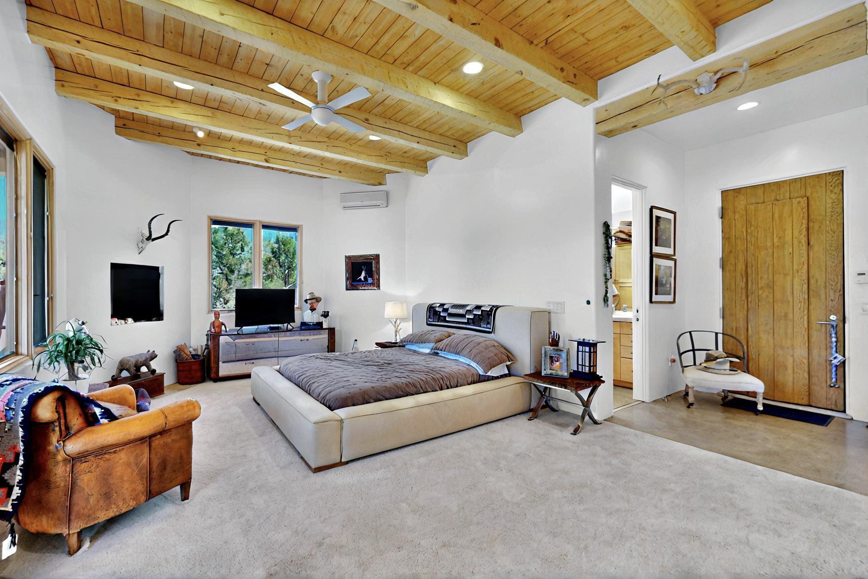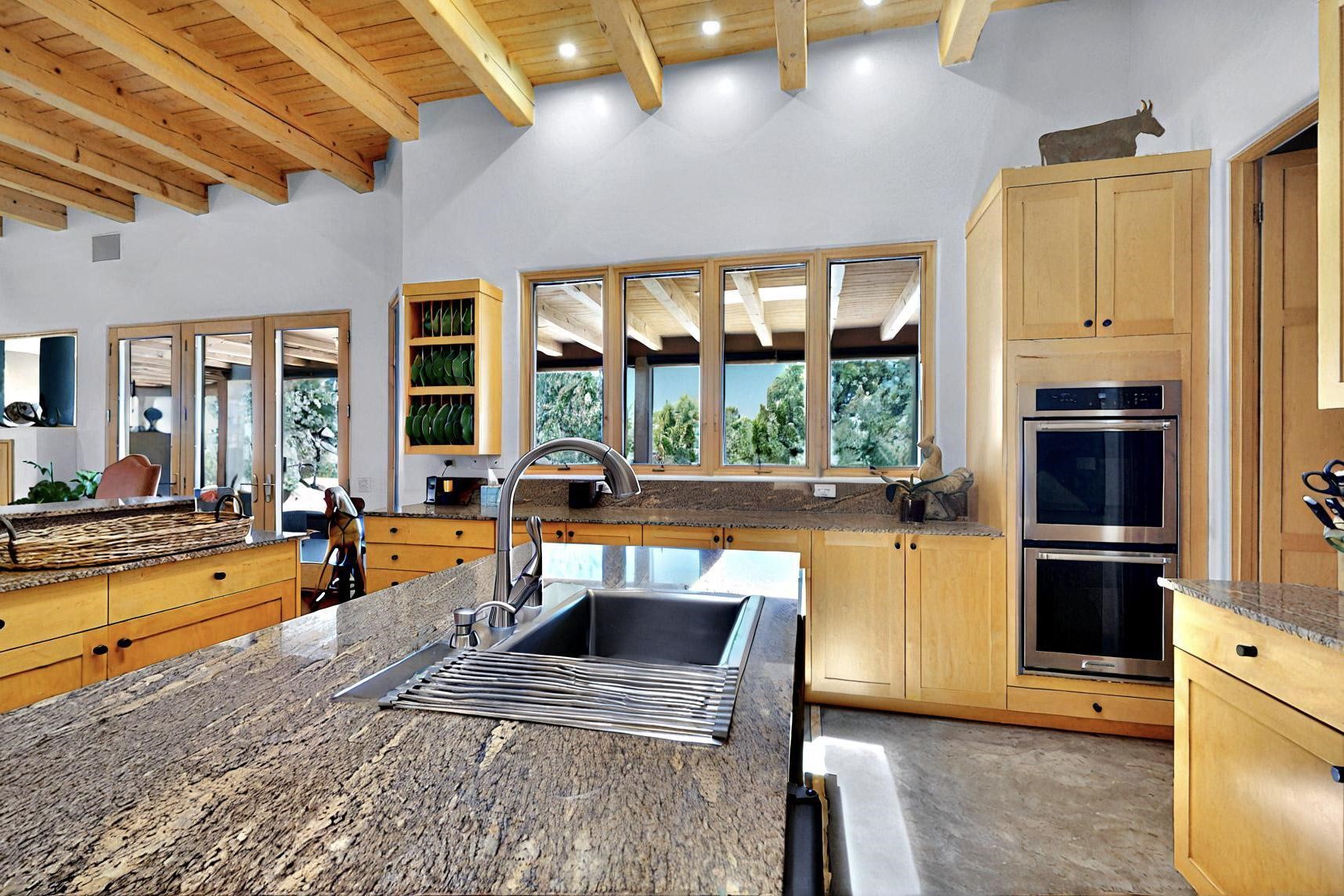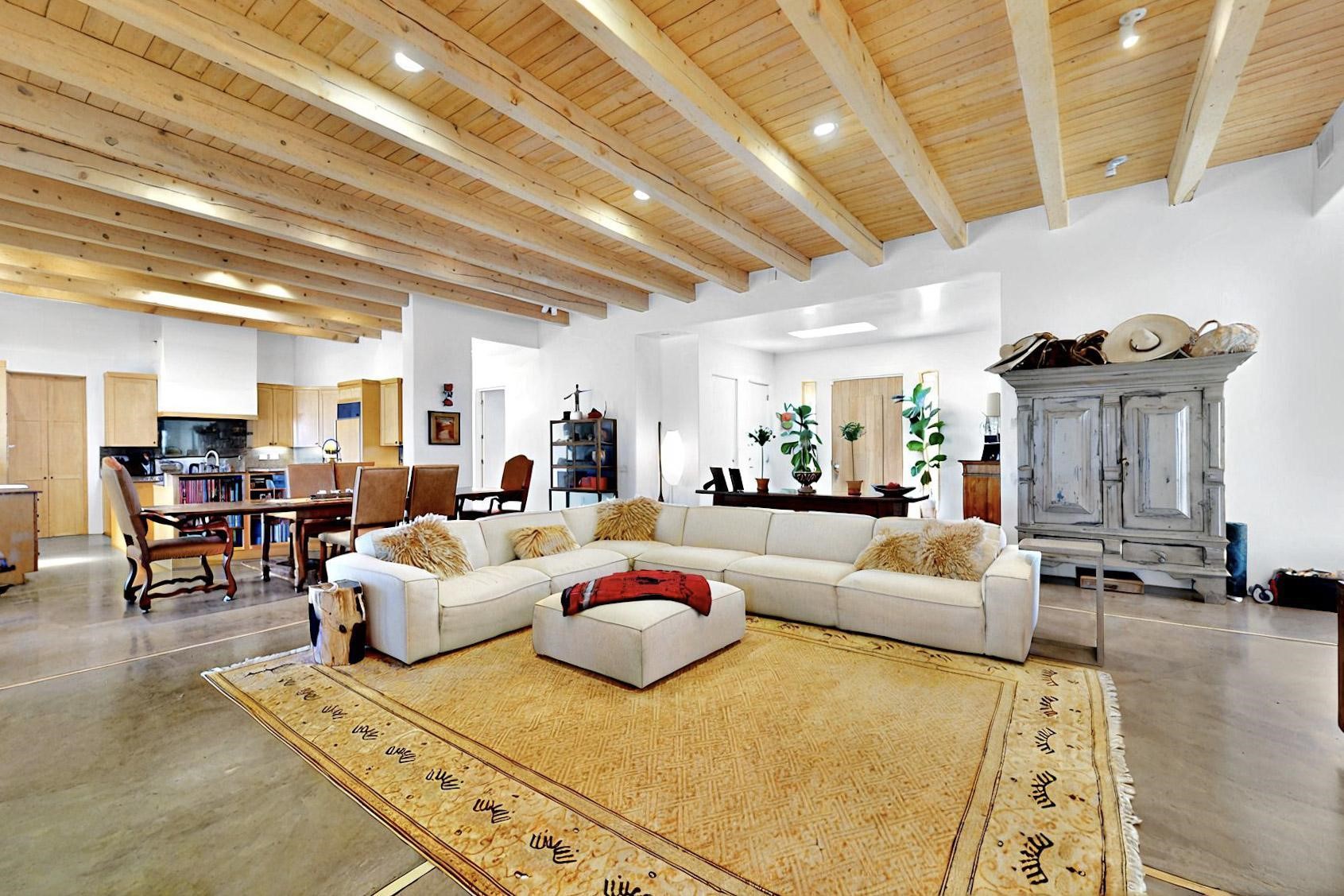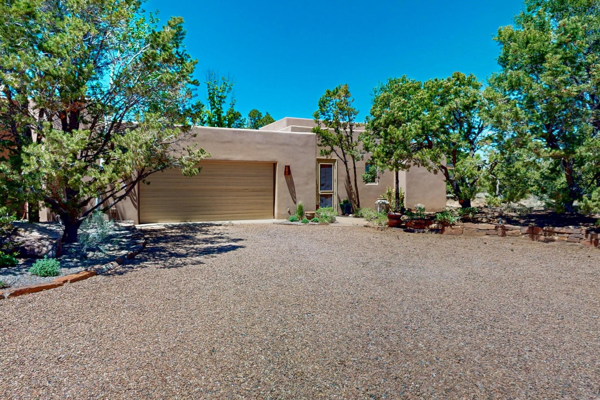 This 4 bedroom, 4 bath home, of which 1 Bedroom and 1 Bath are in an attached guest suite, is perfectly located with proximity to the Las Campanas clubhouse, spa, golf course, and equestrian center. The contemporary style with exposed beams, high ceilings, 4 fireplaces, and open floor plan enhance the spaciousness of the home. The primary suite is spacious and secluded with two separate bathrooms connected by a large shower. The guest spaces are at the other end of the home for privacy. The living area flows to a large portal with fireplace for easy living and entertaining. The portal overlooks a fully enclosed garden space from which to enjoy sunset and mountain views. Enjoy more views and stargaze from the roof deck. The spacious kitchen with pantry is an entertainer's and chef's delight with prep sink, two islands, double ovens, two dishwashers, a 6-burner gas cooktop with griddle, wine cooler, drink refrigerator and a Sub-Zero refrigerator. The attached 2 car heated garage has direct access to the home and guest spaces.