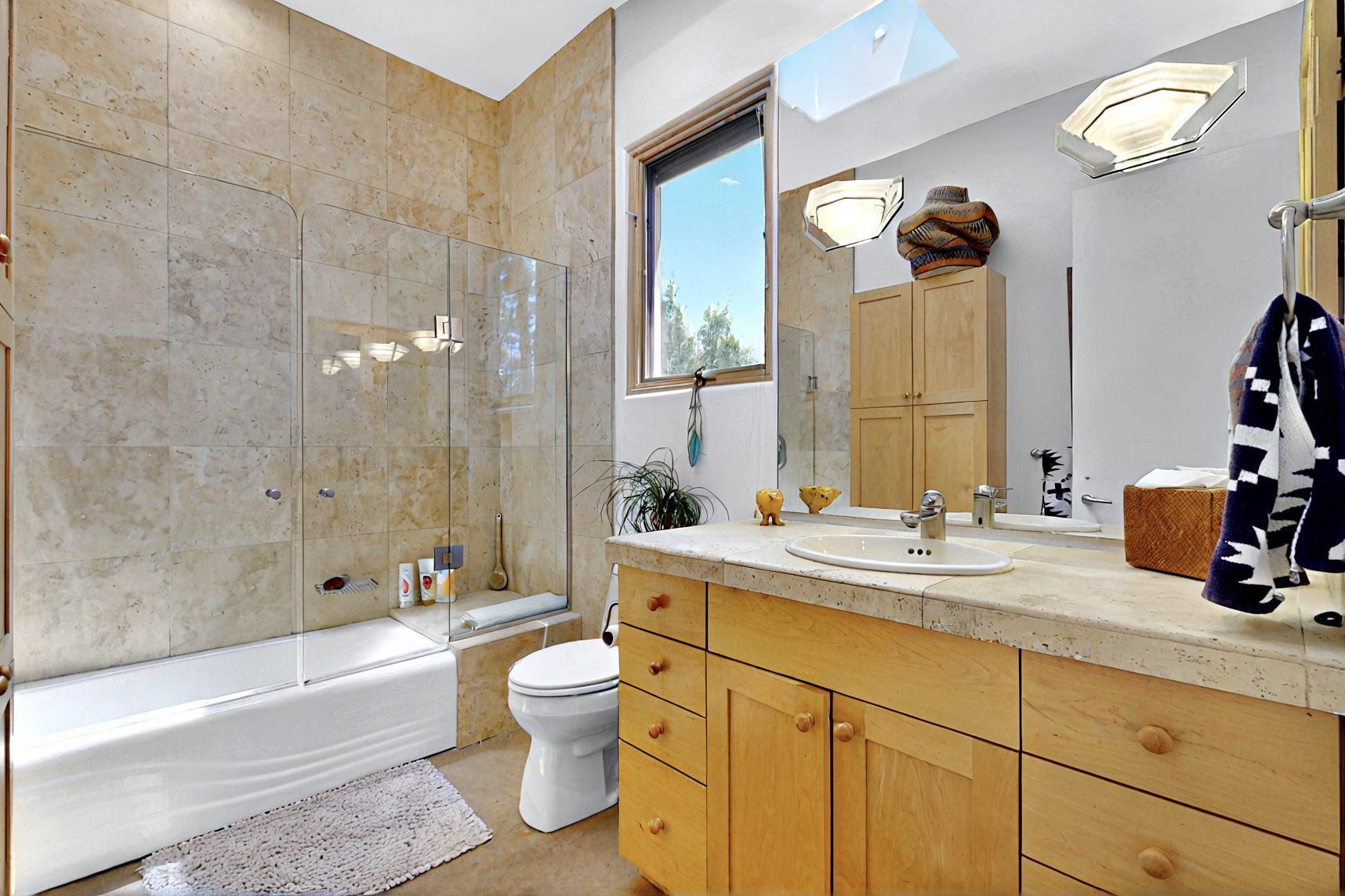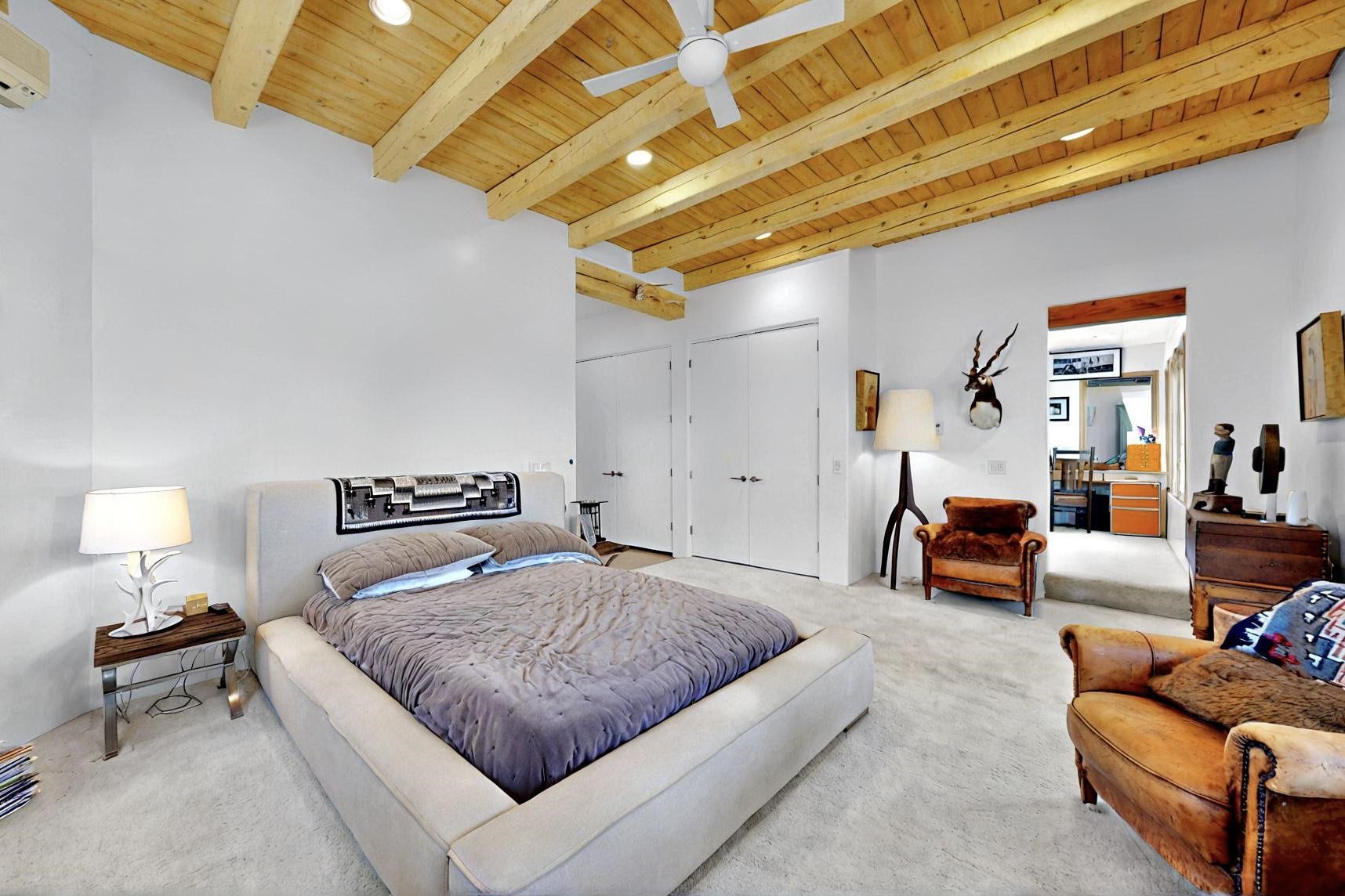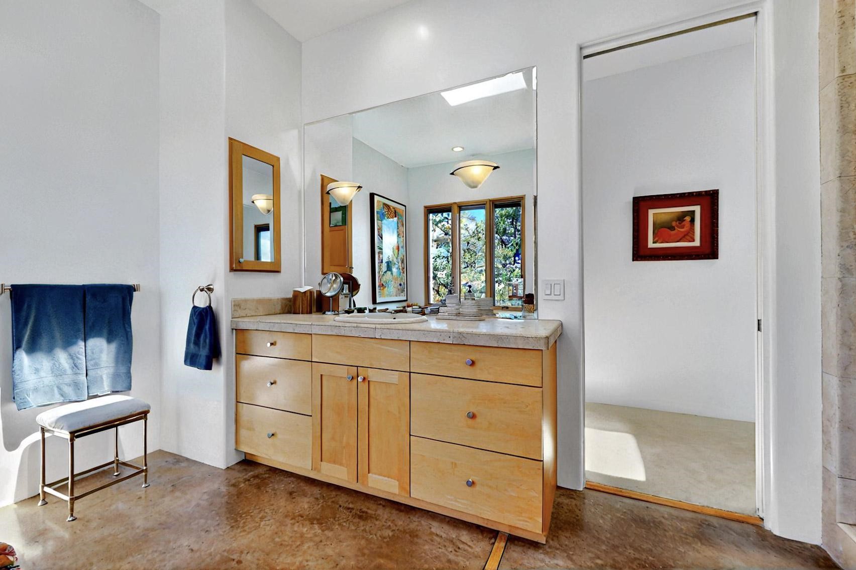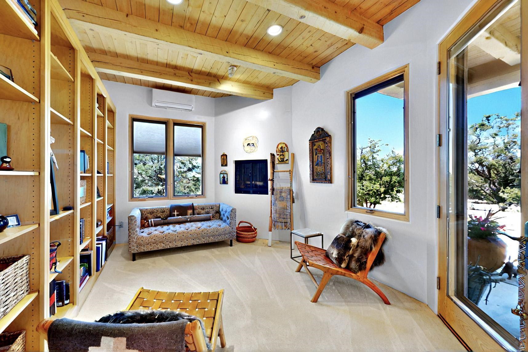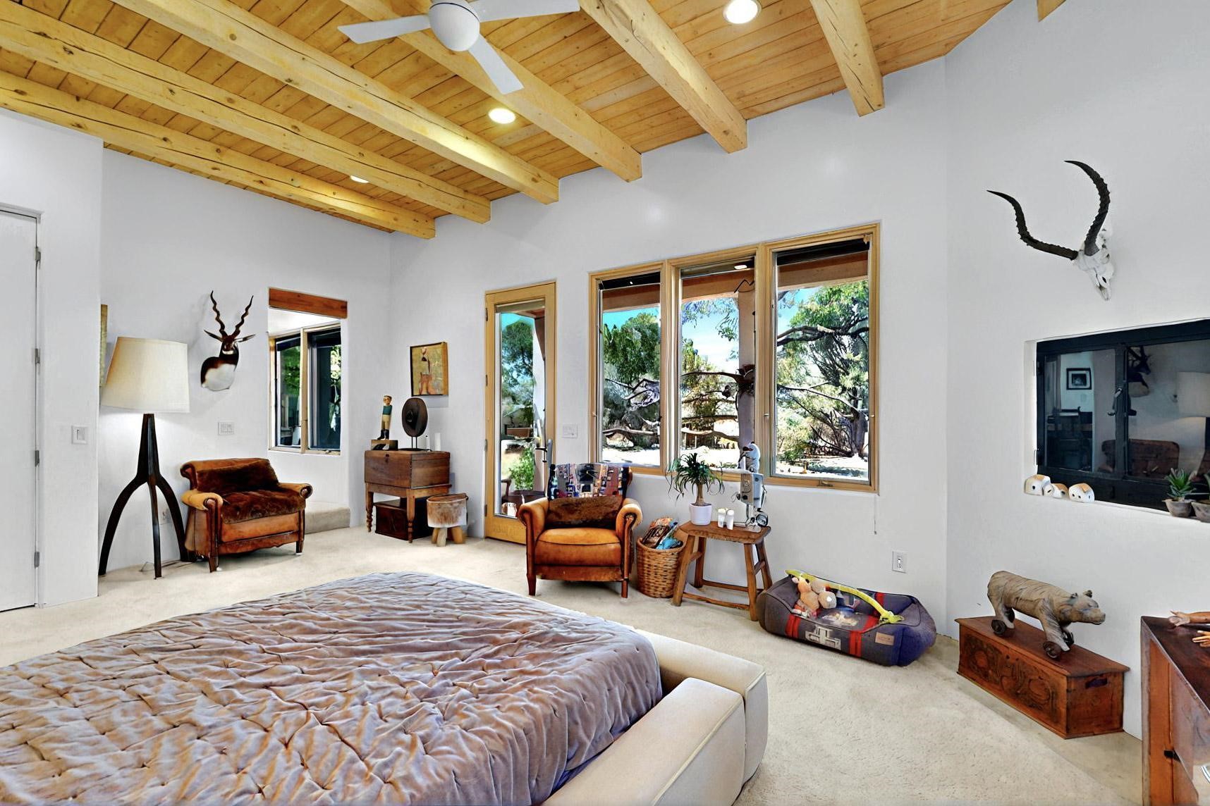 This 4 bedroom, 4 bath home, of which 1 Bedroom and 1 Bath are in an attached guest suite, is perfectly located with proximity to the Las Campanas clubhouse, spa, golf course, and equestrian center. The contemporary style with exposed beams, high ceilings, 4 fireplaces, and open floor plan enhance the spaciousness of the home. The primary suite is spacious and secluded with two separate bathrooms connected by a large shower. The guest spaces are at the other end of the home for privacy. The living area flows to a large portal with fireplace for easy living and entertaining. The portal overlooks a fully enclosed garden space from which to enjoy sunset and mountain views. Enjoy more views and stargaze from the roof deck. The spacious kitchen with pantry is an entertainer's and chef's delight with prep sink, two islands, double ovens, two dishwashers, a 6-burner gas cooktop with griddle, wine cooler, drink refrigerator and a Sub-Zero refrigerator. The attached 2 car heated garage has direct access to the home and guest spaces.