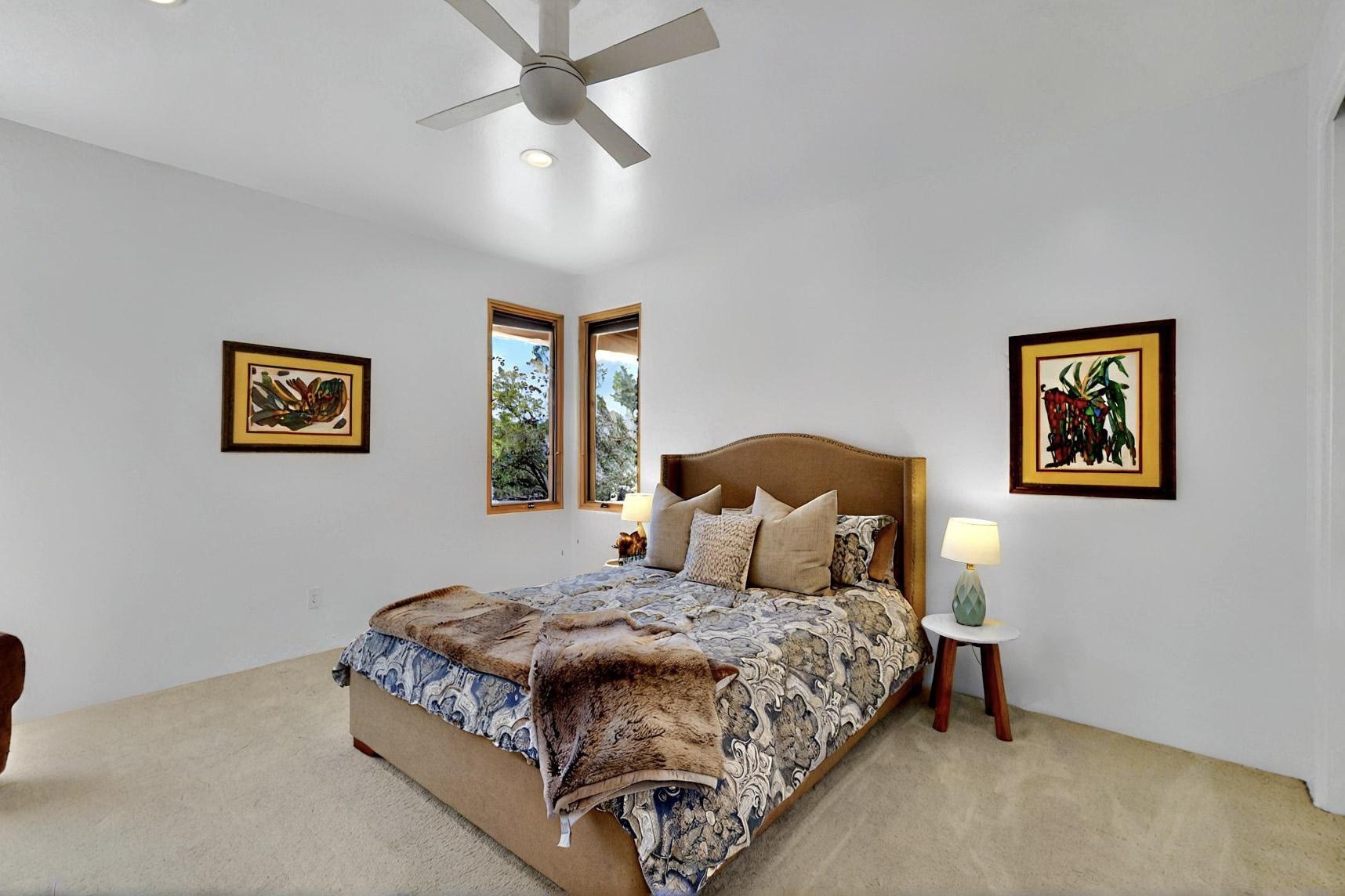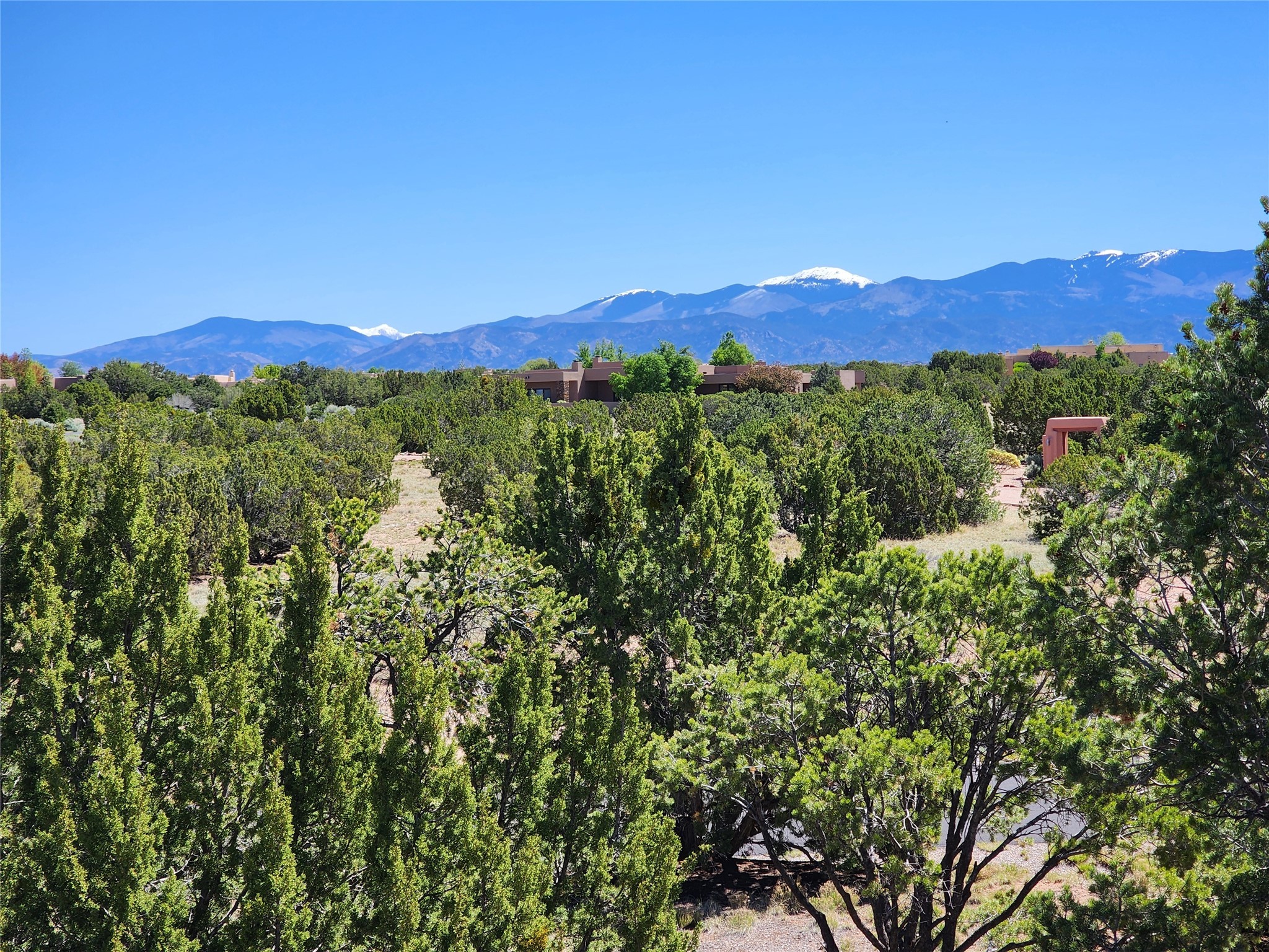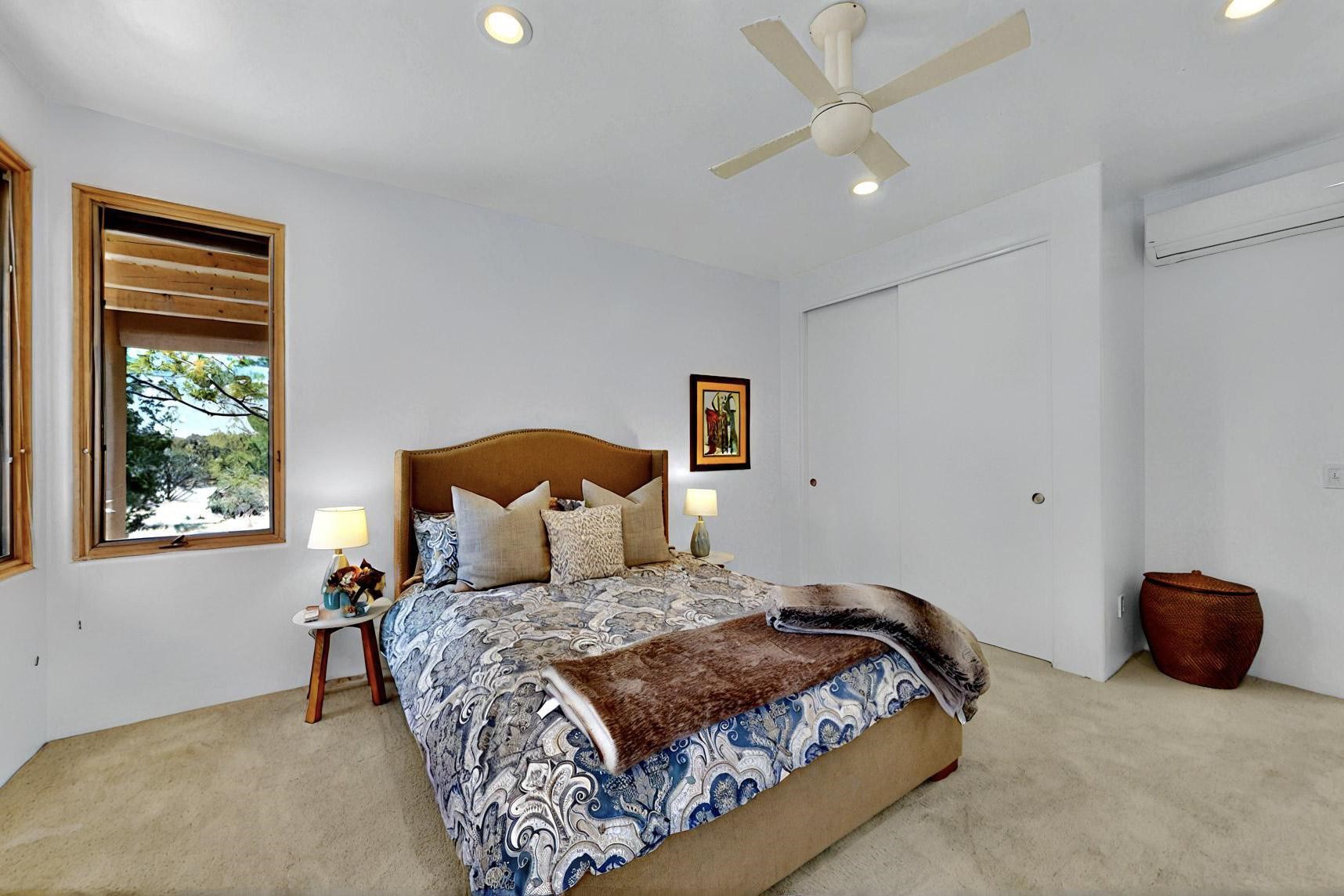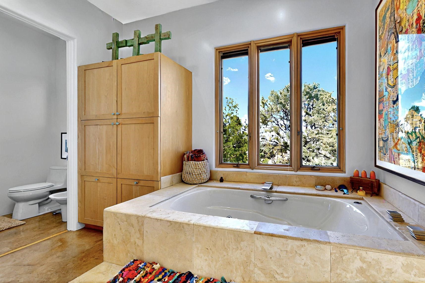 This 4 bedroom, 4 bath home, of which 1 Bedroom and 1 Bath are in an attached guest suite, is perfectly located with proximity to the Las Campanas clubhouse, spa, golf course, and equestrian center. The contemporary style with exposed beams, high ceilings, 4 fireplaces, and open floor plan enhance the spaciousness of the home. The primary suite is spacious and secluded with two separate bathrooms connected by a large shower. The guest spaces are at the other end of the home for privacy. The living area flows to a large portal with fireplace for easy living and entertaining. The portal overlooks a fully enclosed garden space from which to enjoy sunset and mountain views. Enjoy more views and stargaze from the roof deck. The spacious kitchen with pantry is an entertainer's and chef's delight with prep sink, two islands, double ovens, two dishwashers, a 6-burner gas cooktop with griddle, wine cooler, drink refrigerator and a Sub-Zero refrigerator. The attached 2 car heated garage has direct access to the home and guest spaces.