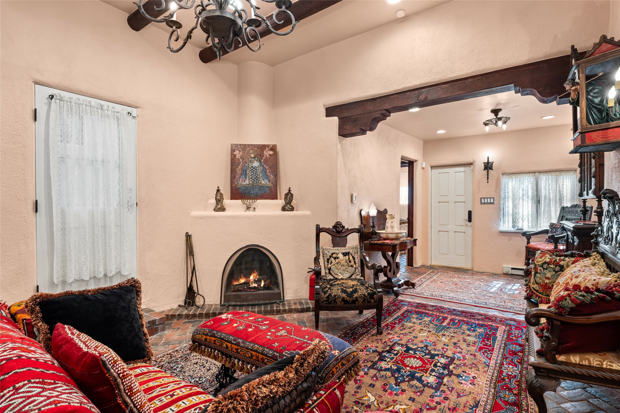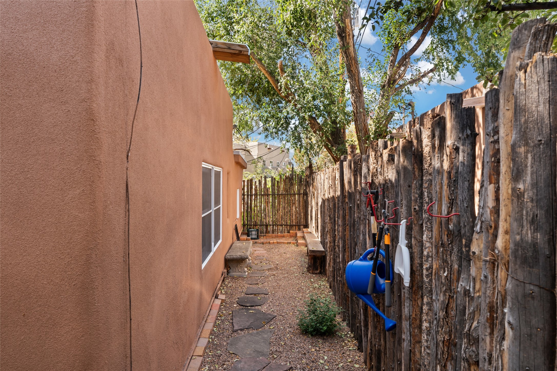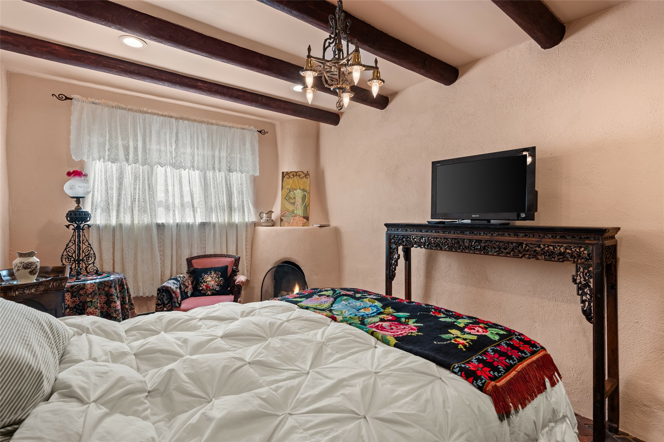 Perfectly redone, perfectly located and perfectly charming, this one bedroom one bath condo is oozing Santa Fe style, while just blocks from the Plaza and steps from Ft. Marcy Park with swimming, walking, playground and pickle ball! One of 3 condos in this little compound on Artist, the casita has had the roof raised with new roof and insulation, not to mention fabulous vigas, beautiful chandeliers and recessed lighting, with upgraded electrical wiring in the house. Most everything has a fresh coat of paint, and the floors are now antique brick except in the kitchen and bath. Both the living room and the bedroom enjoy corner kiva fireplaces, for cozy Santa Fe night ambiance . The kitchen is whimsical and functional, with plenty of storage and a new vintage looking matching fridge, new dishwasher and microwave; and the washer and dryer are also new! There are two outdoor spaces to enjoy - the front entry with it's sunny South face and new 3 ft wall and flower beds, and the shady summer side patio with a new coyote fence and good privacy is the perfect cool summer alfresco dining spot!