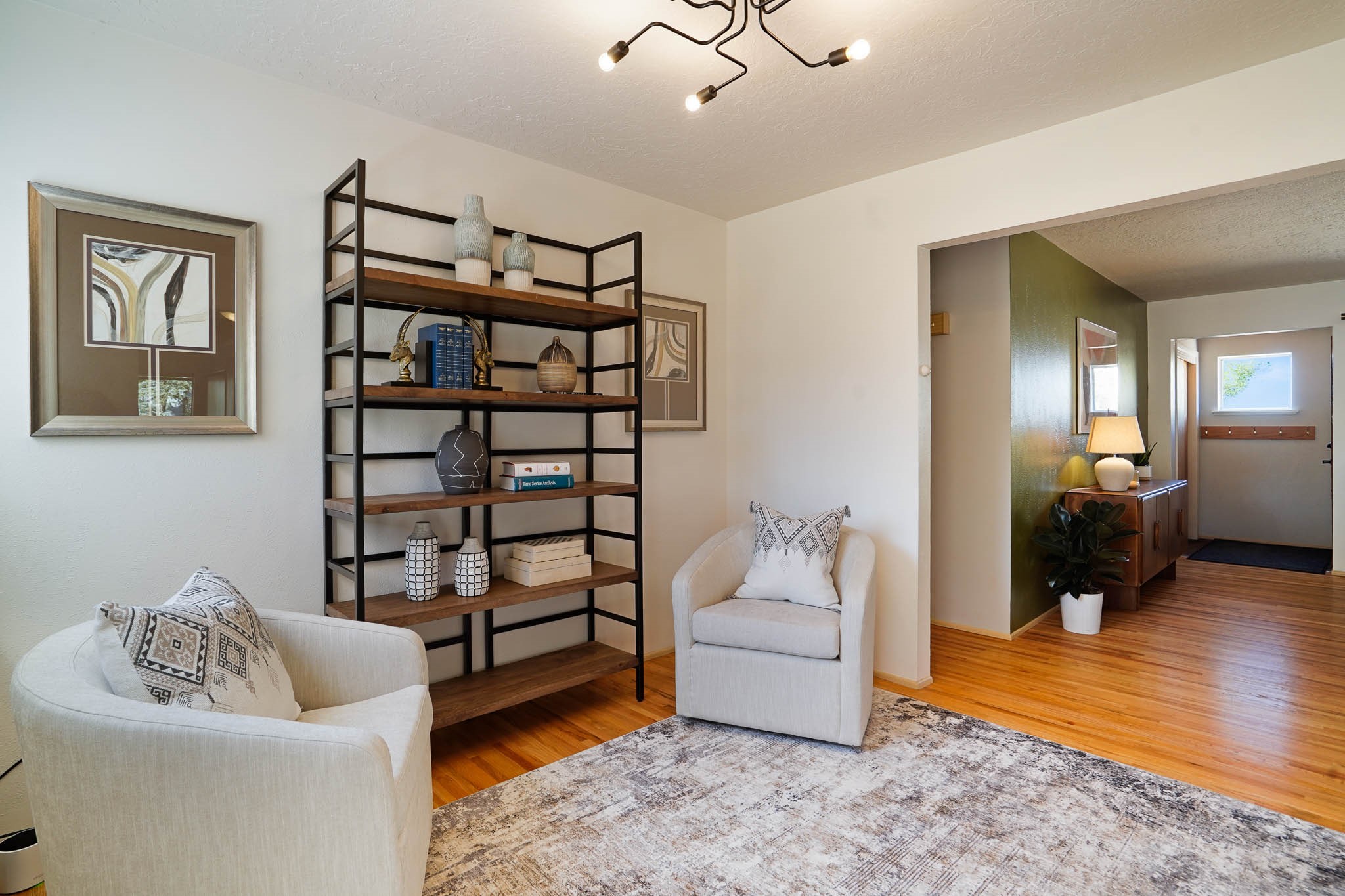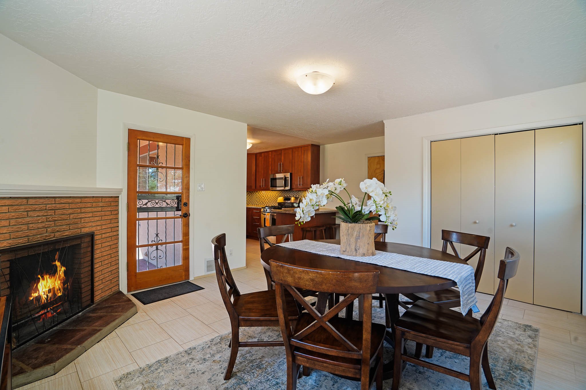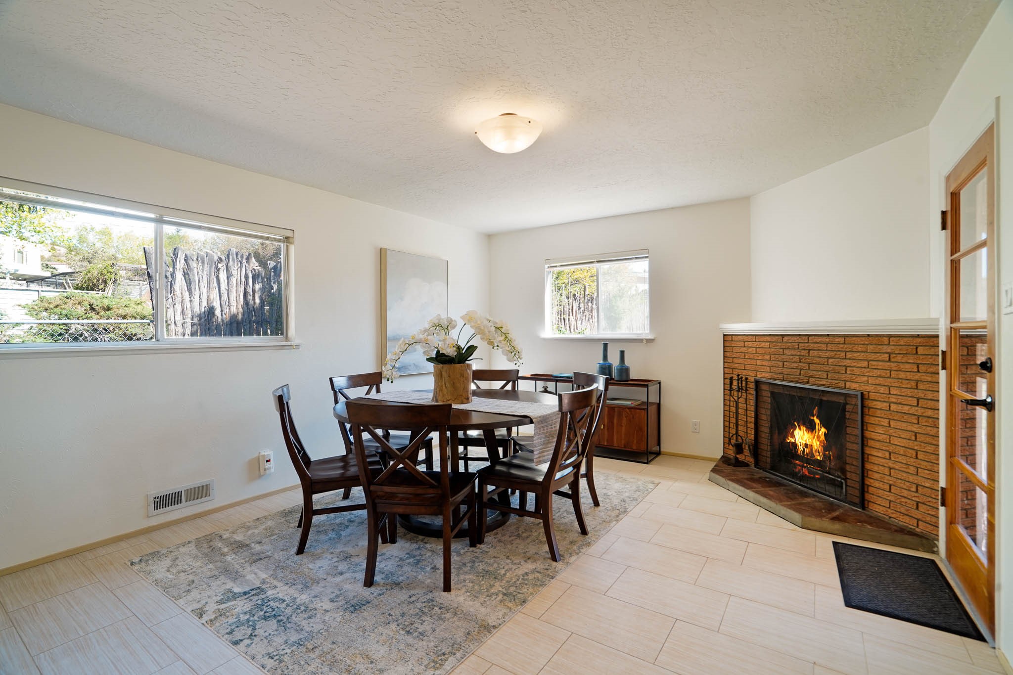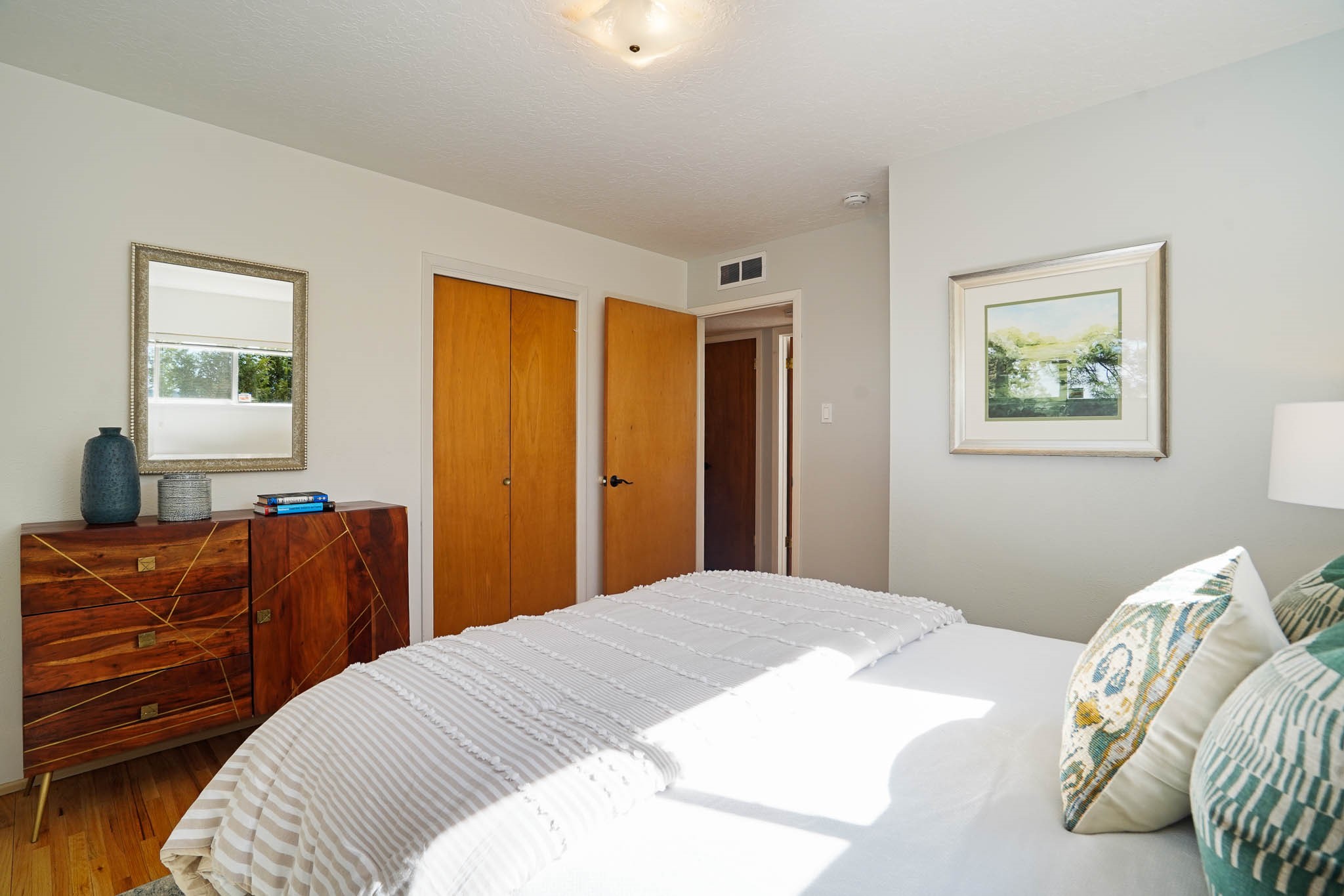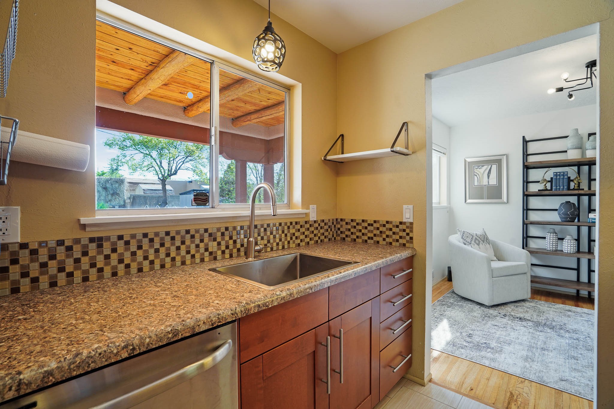 This updated 3-bed Stamm home blends classic charm with modern comfort. Original oak floors run through the living, dining, and bedrooms. The primary suite features a private 3/4 bath, while the other bedrooms share a full bath. Enjoy an open kitchen and cozy den with a wood-burning fireplace, plus direct access to a fully fenced backyard with mountain views. A bricked portal, coyote fencing, and a carport/trailer storage and versatility. Just steps from Casa Solana pool and minutes to the Plaza!