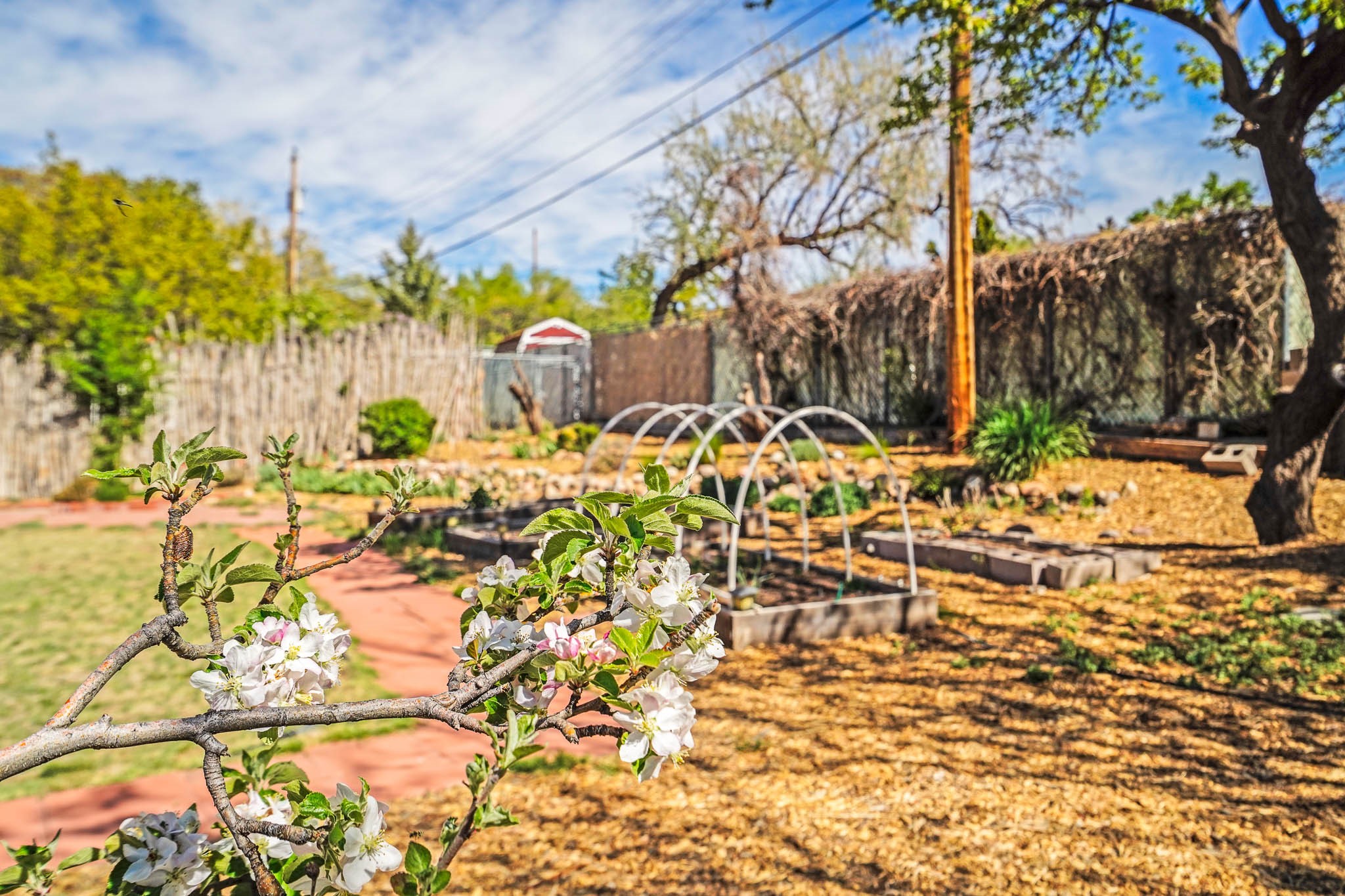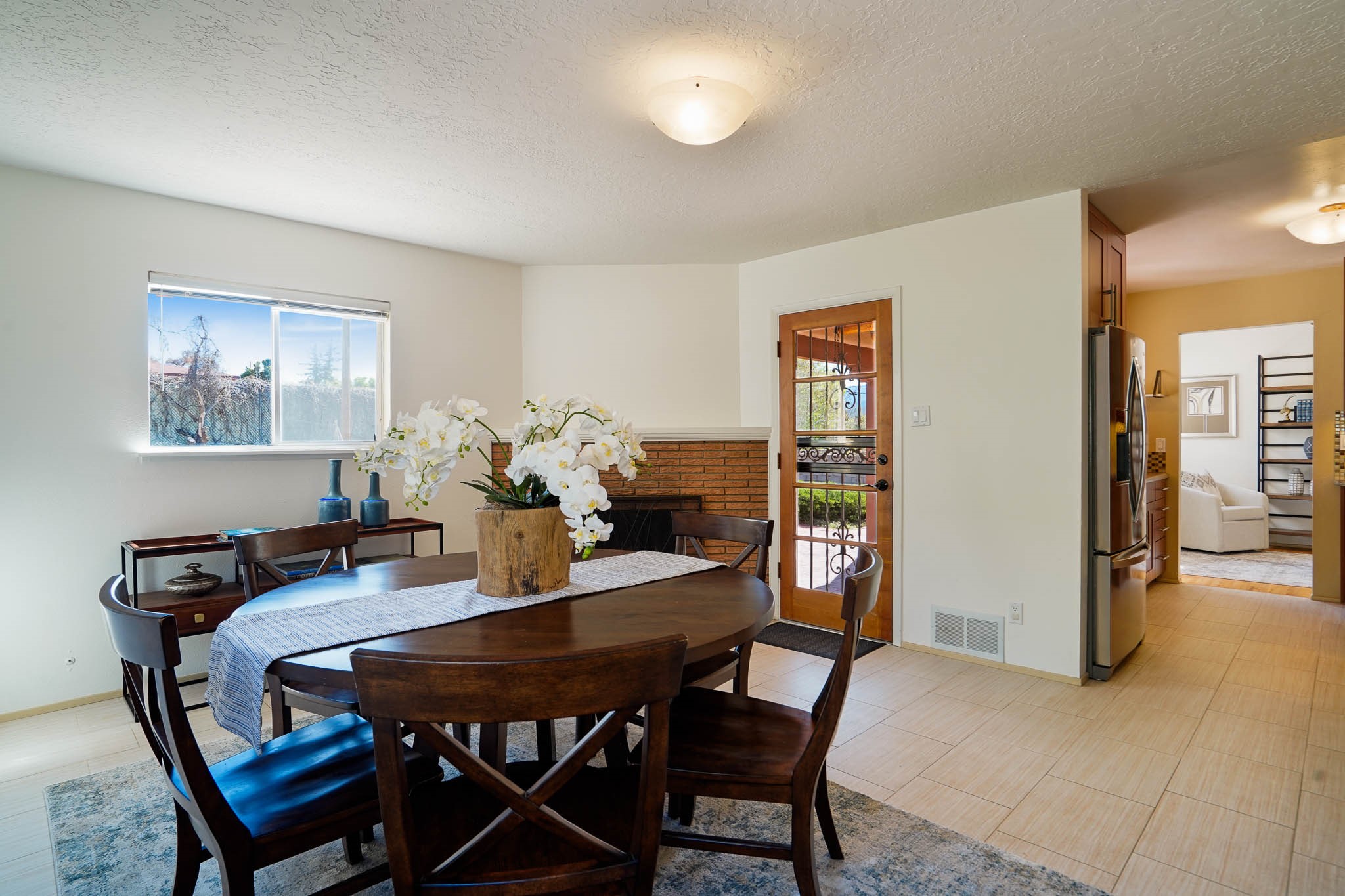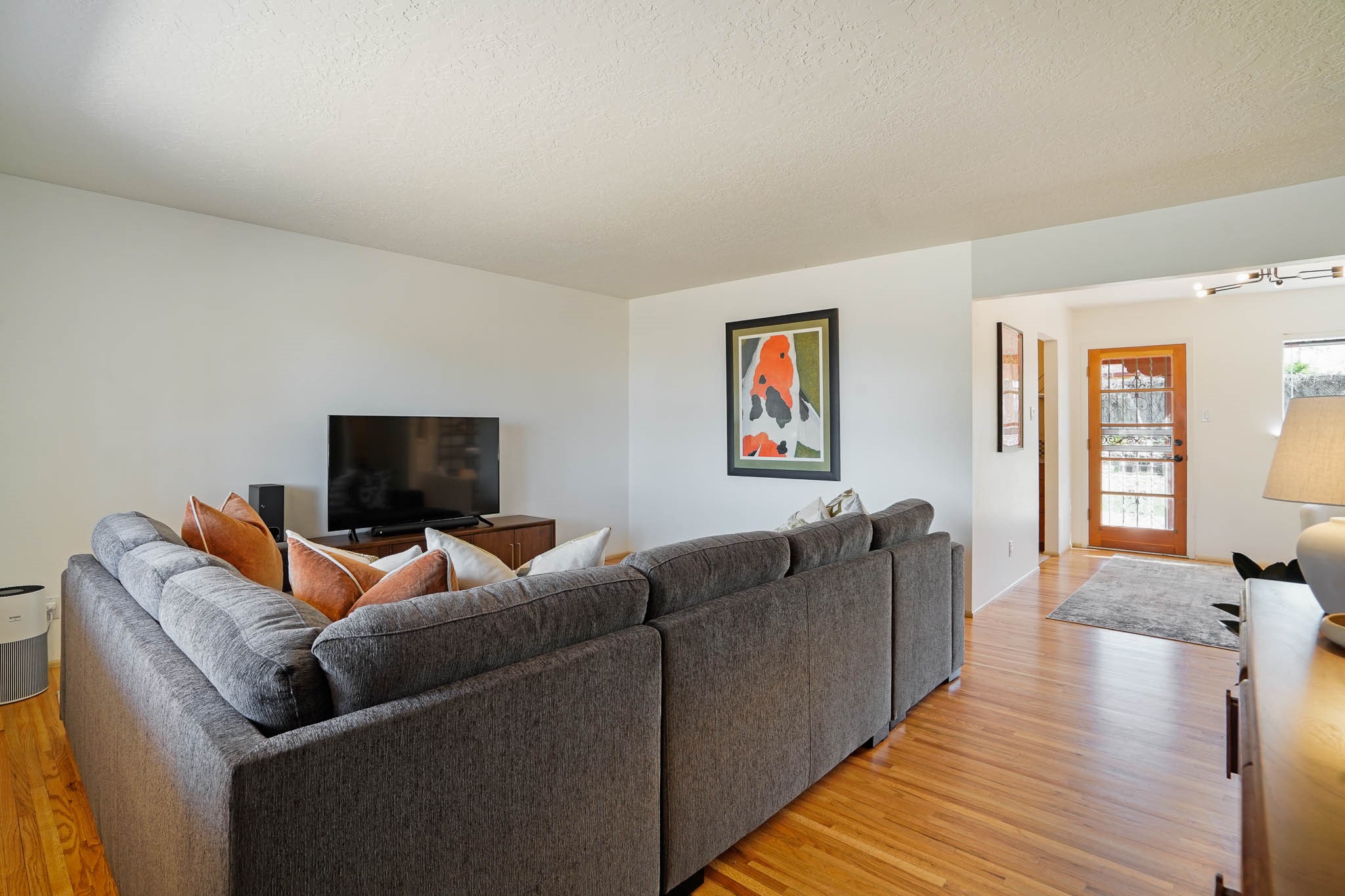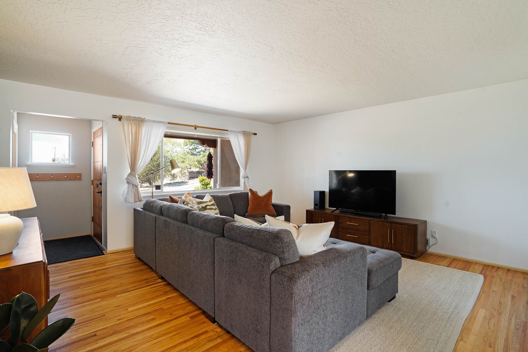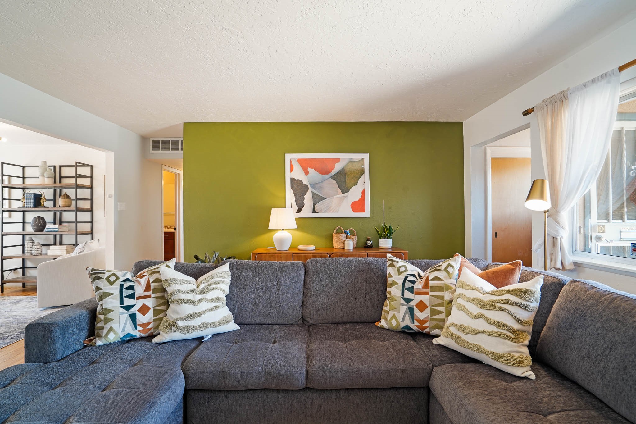 This updated 3-bed Stamm home blends classic charm with modern comfort. Original oak floors run through the living, dining, and bedrooms. The primary suite features a private 3/4 bath, while the other bedrooms share a full bath. Enjoy an open kitchen and cozy den with a wood-burning fireplace, plus direct access to a fully fenced backyard with mountain views. A bricked portal, coyote fencing, and a carport/trailer storage and versatility. Just steps from Casa Solana pool and minutes to the Plaza!