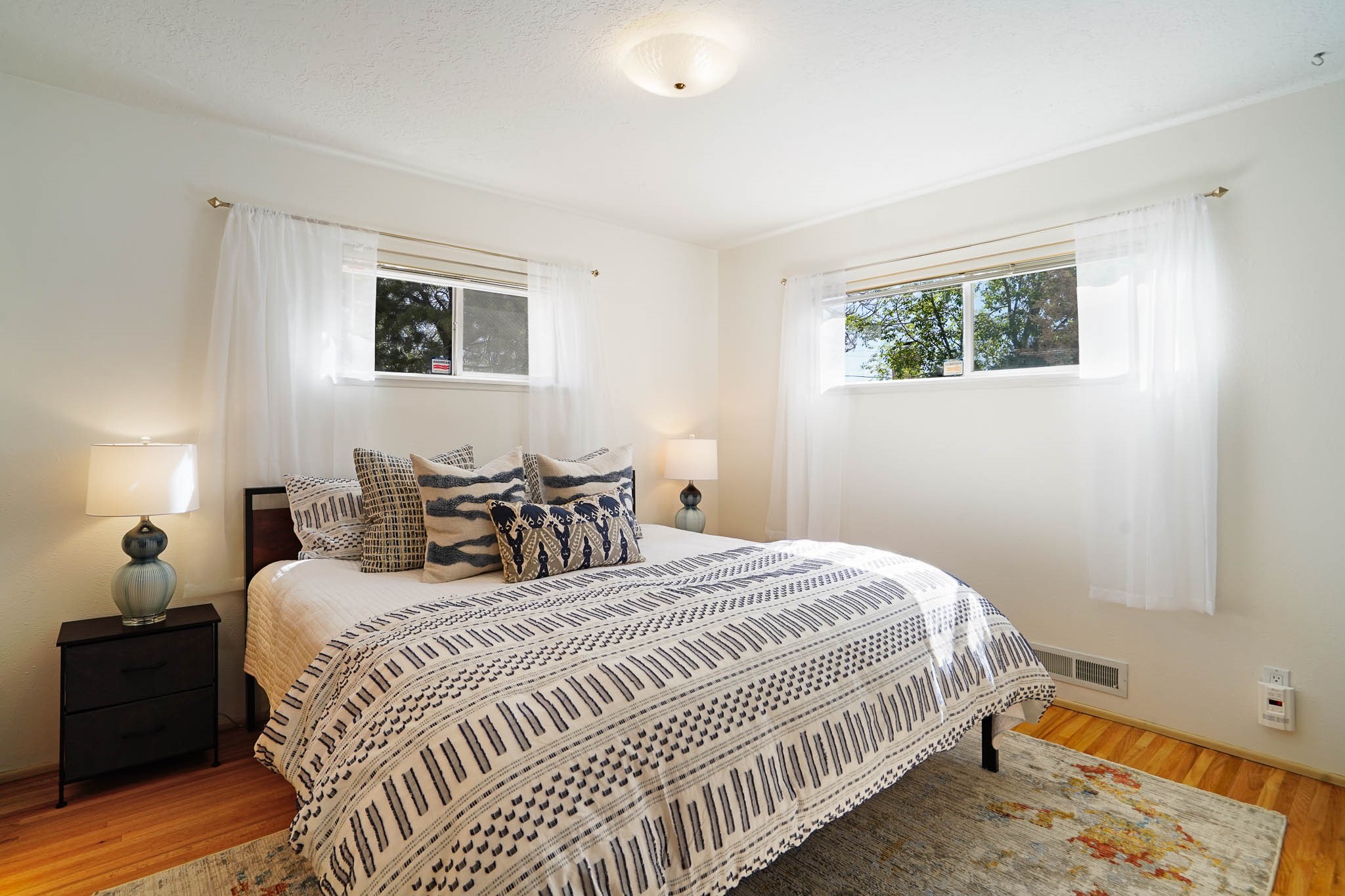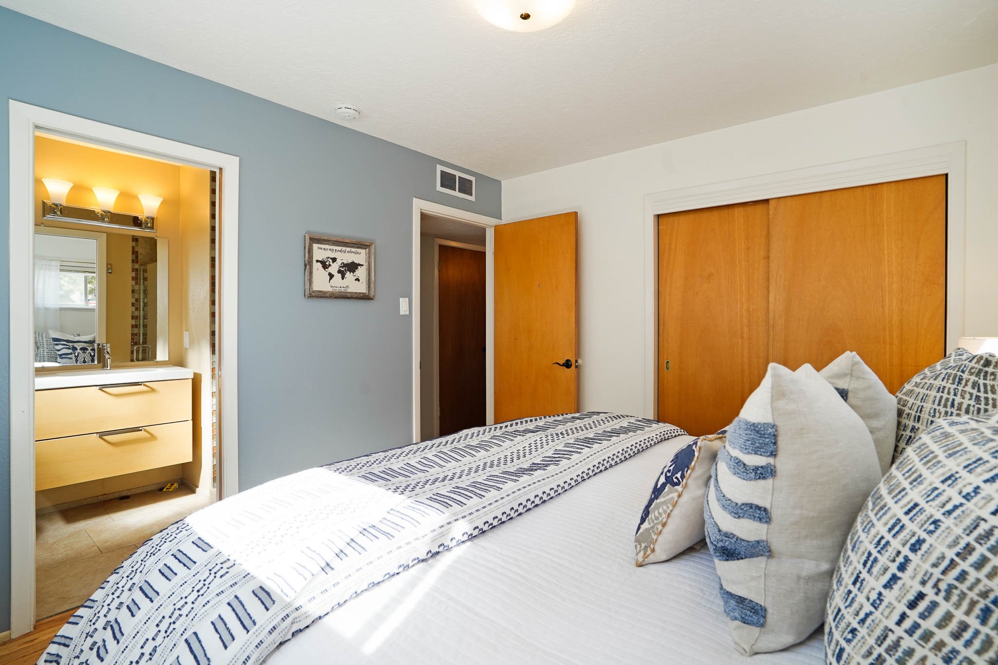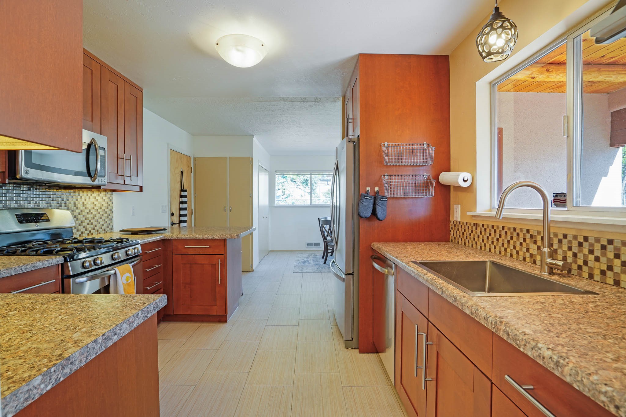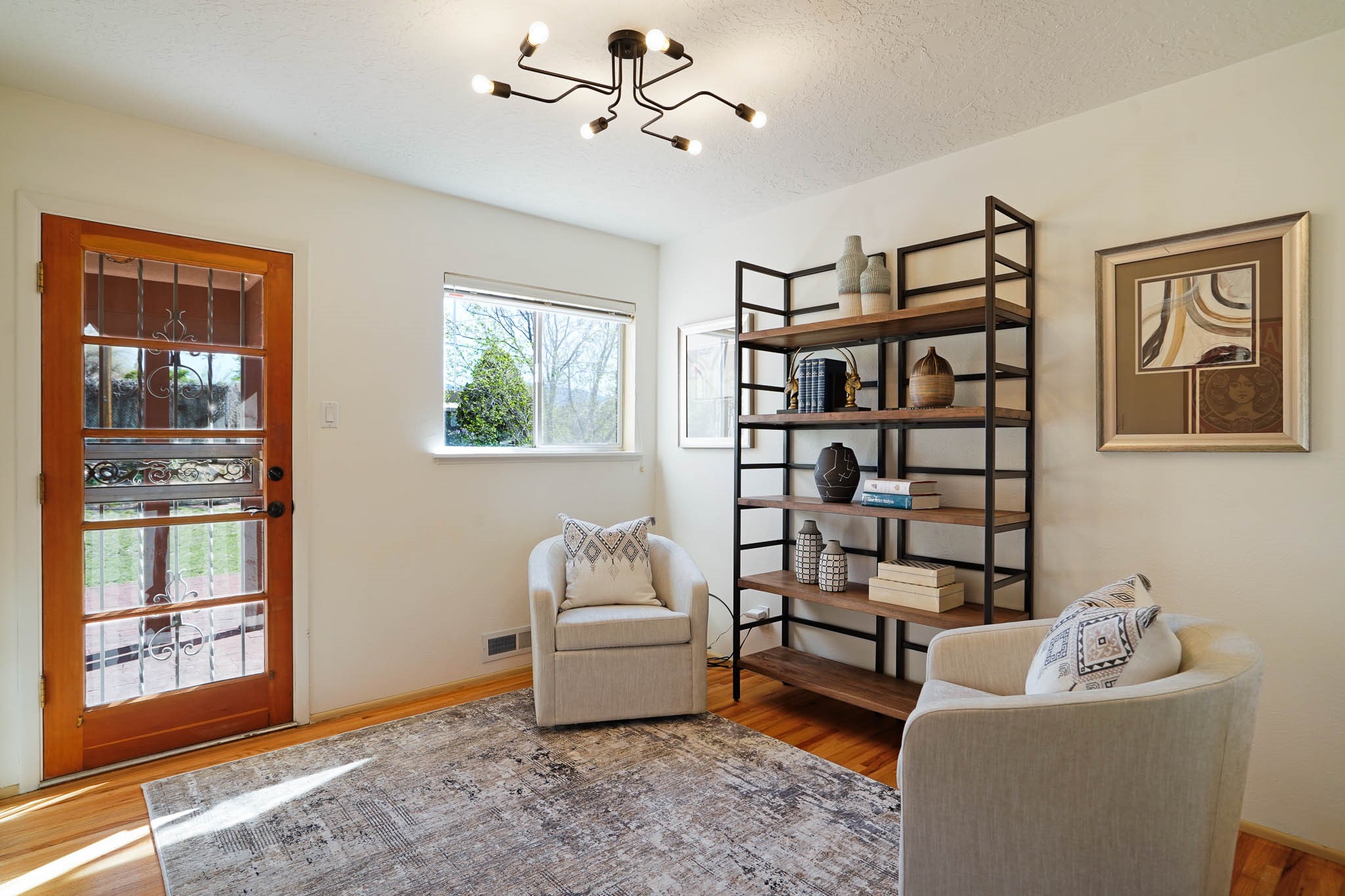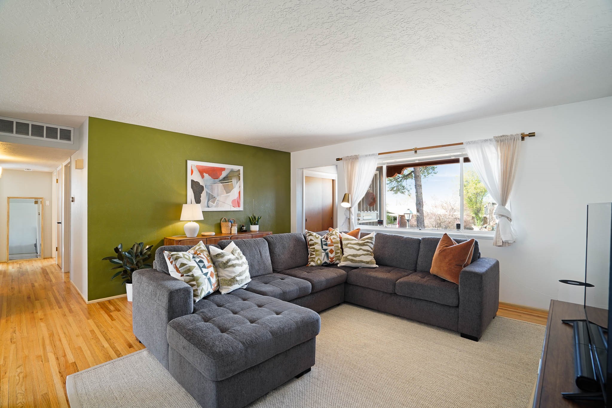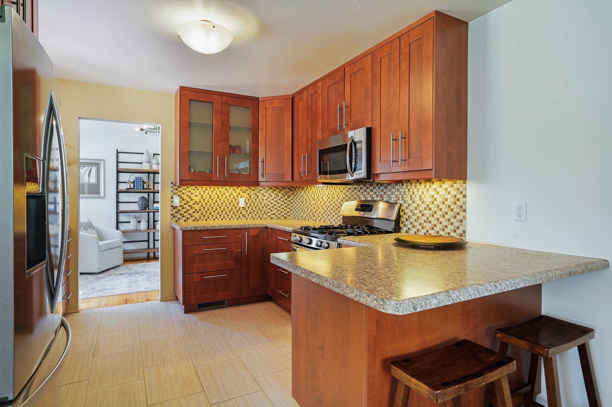 This updated 3-bed Stamm home blends classic charm with modern comfort. Original oak floors run through the living, dining, and bedrooms. The primary suite features a private 3/4 bath, while the other bedrooms share a full bath. Enjoy an open kitchen and cozy den with a wood-burning fireplace, plus direct access to a fully fenced backyard with mountain views. A bricked portal, coyote fencing, and a carport/trailer storage and versatility. Just steps from Casa Solana pool and minutes to the Plaza!