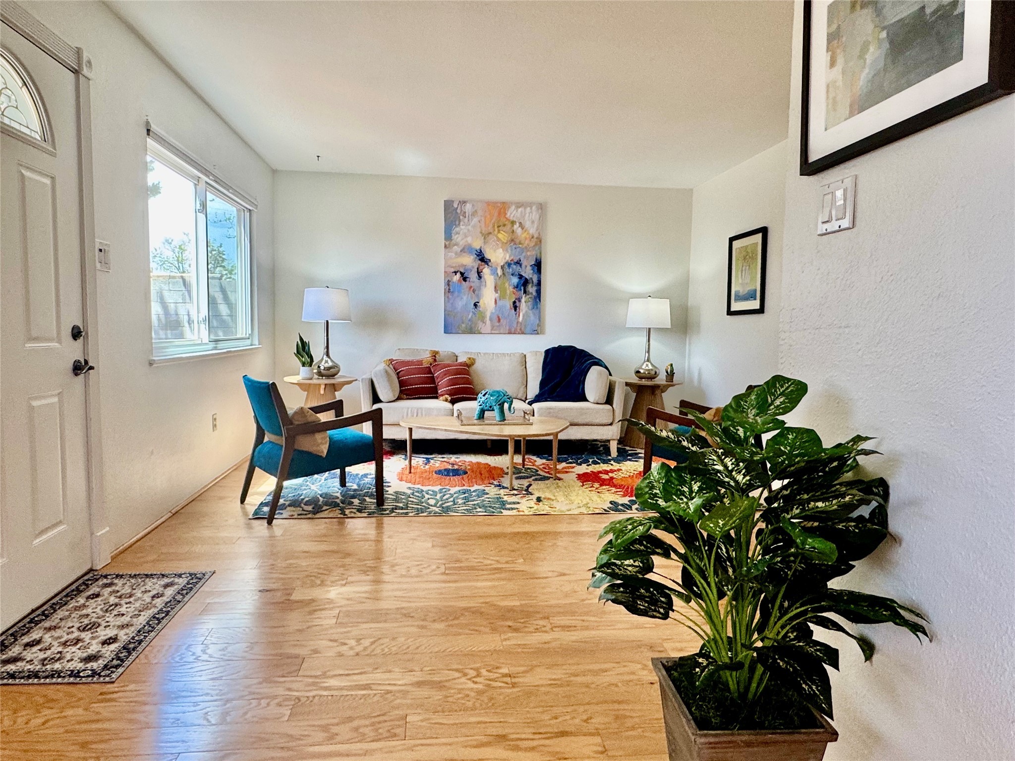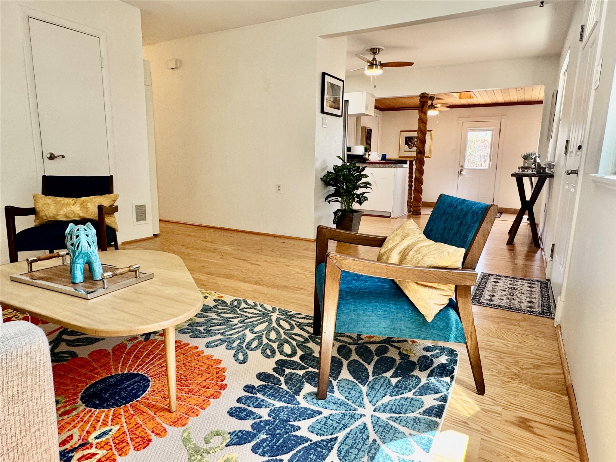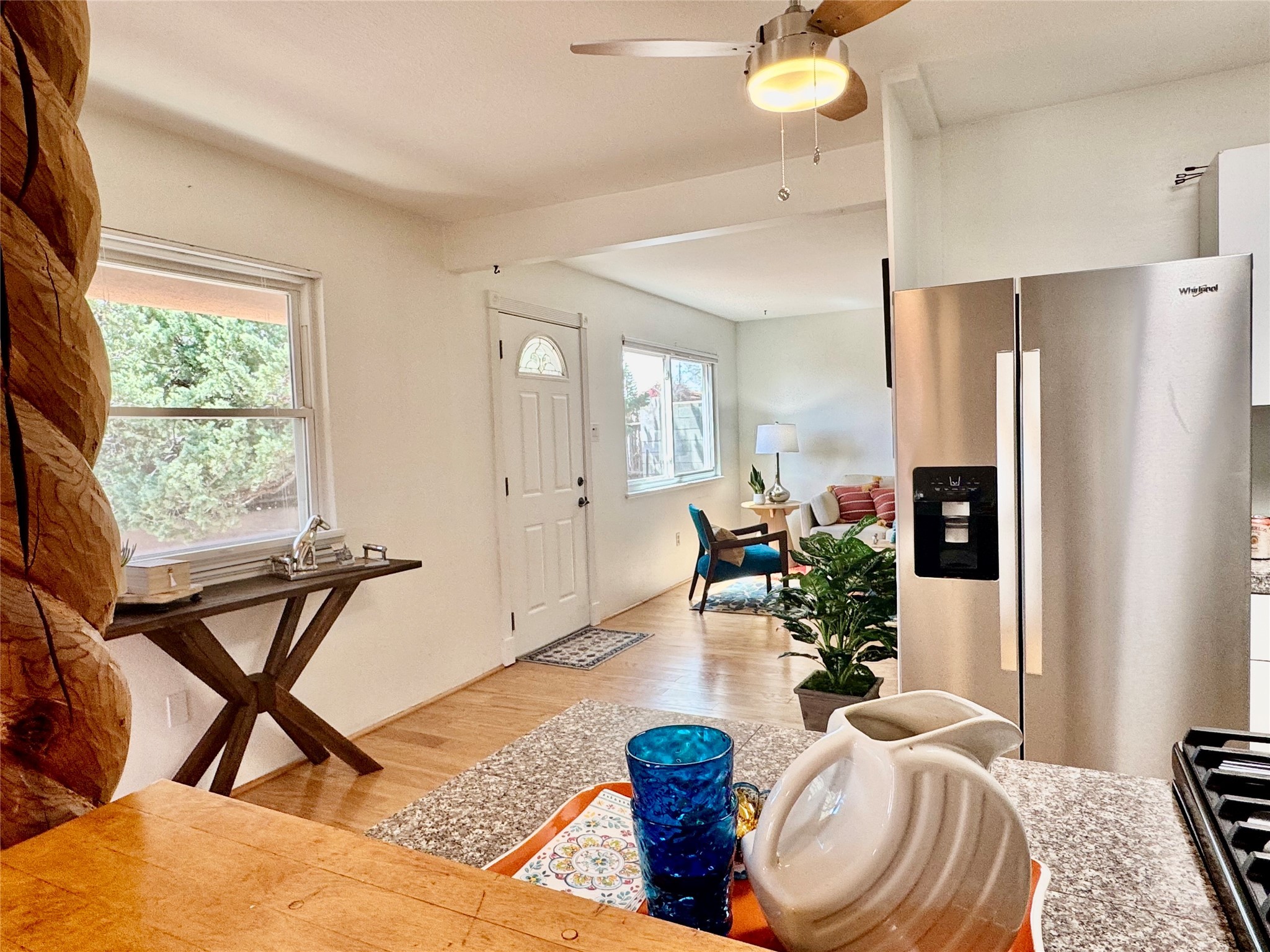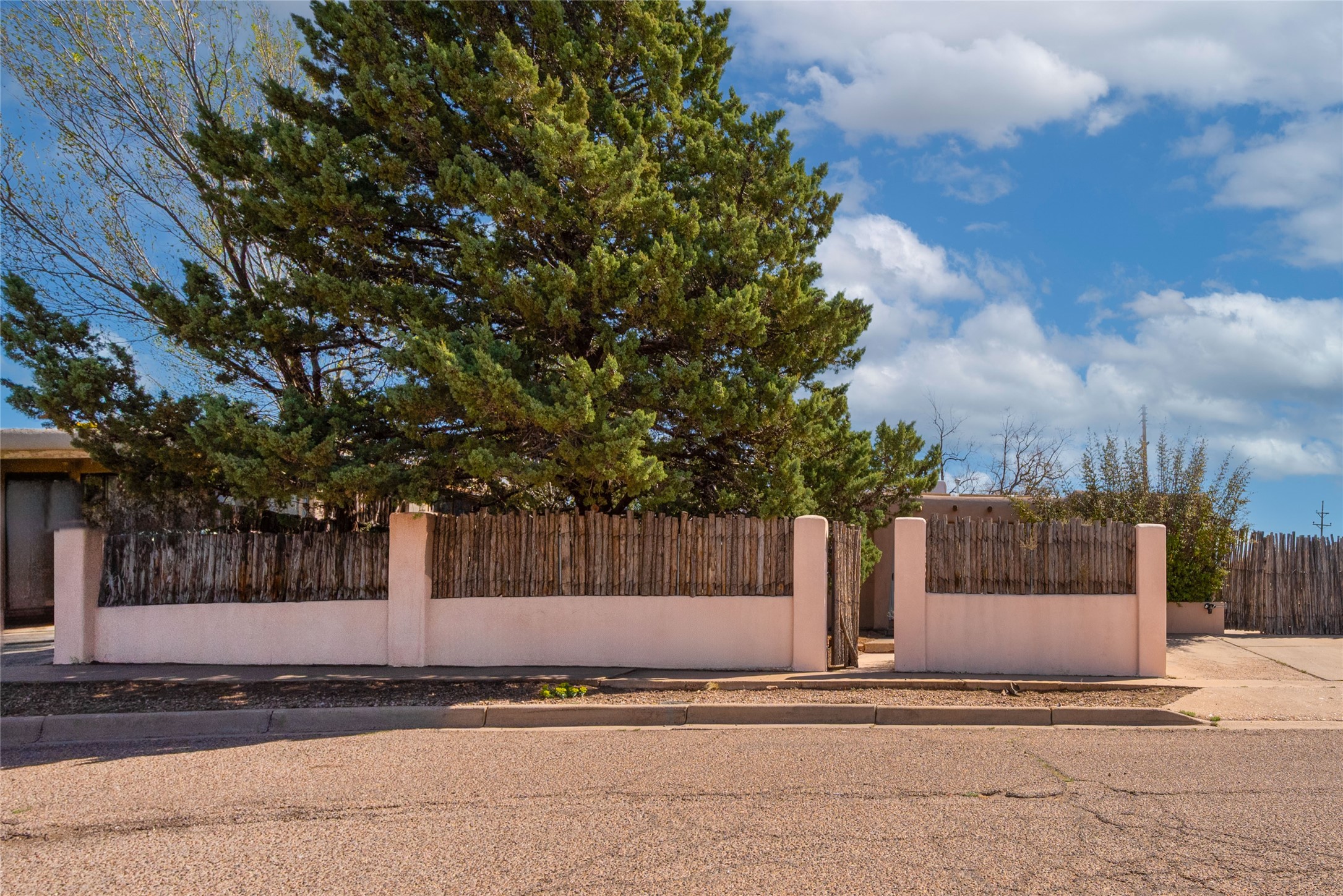 Life is sweet at this well-loved and charming home in mid-town Santa Fe. In summer, the spacious primary suite opens with two sliding doors onto a flagstone backyard with lush garden, and in winter, it is a cosy retreat with the kiva fireplace casting its glow. The front of the house features a living room, kitchen with bar seating and a flex space perfect for an office or dining room. New floors, furnace, and water heater were all added in the last 5 years. Seven skylights, a picture living room window, and a plant window make this a bright, happy home, and a workshop, two sheds, water catchment, pet door, motion detection lights, and an EV charger make this a practical home. The walled front yard with a mature tree offers perfect privacy (and a branch for a swing) while the side and back yards are a surprise delight. The garden has coyote fencing and a grapevine. You'll receive plenty of "volunteer" plants from seasons past, but there is room to make this garden your own. See summer photos. This house has sweet vibes.