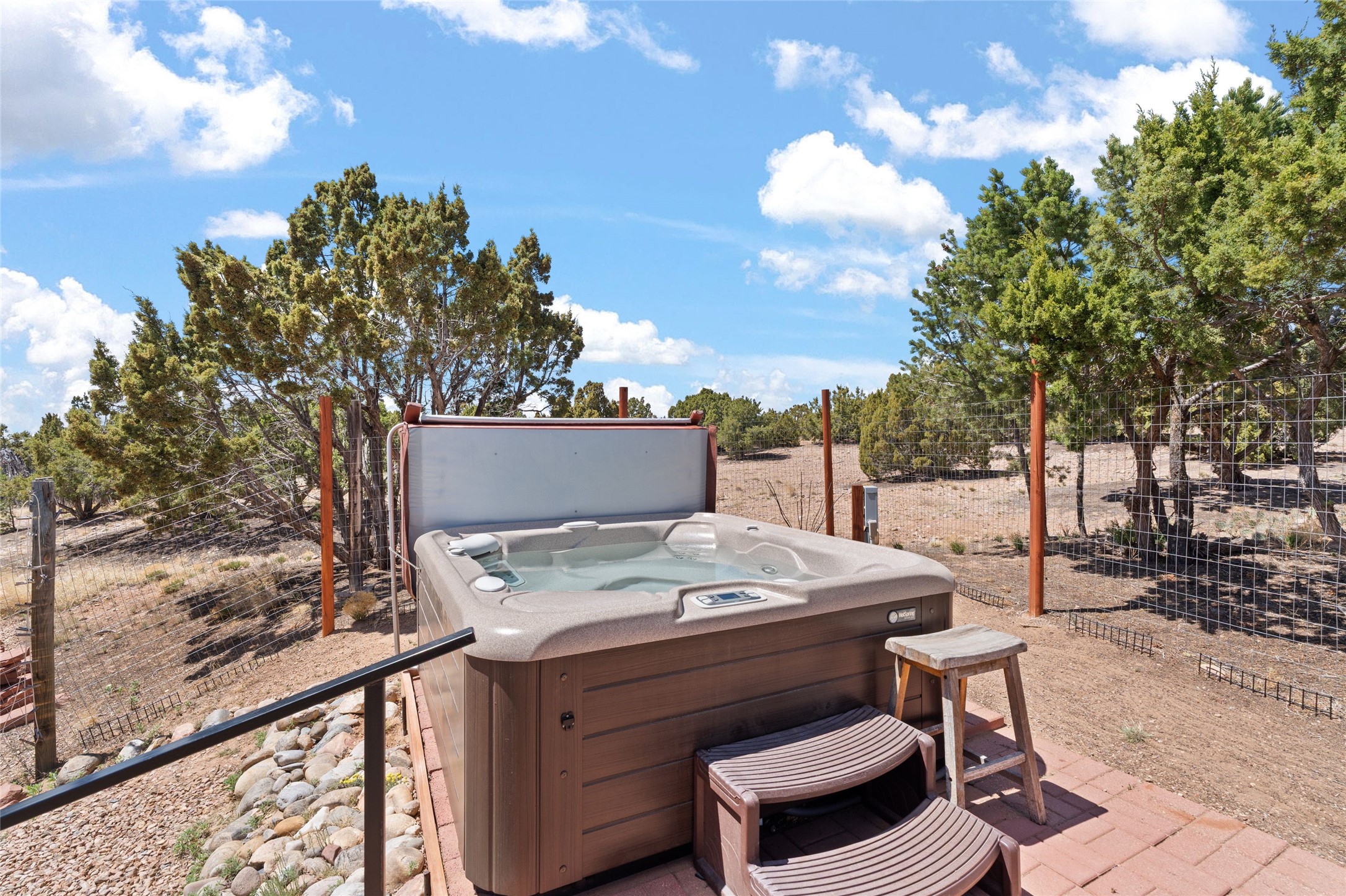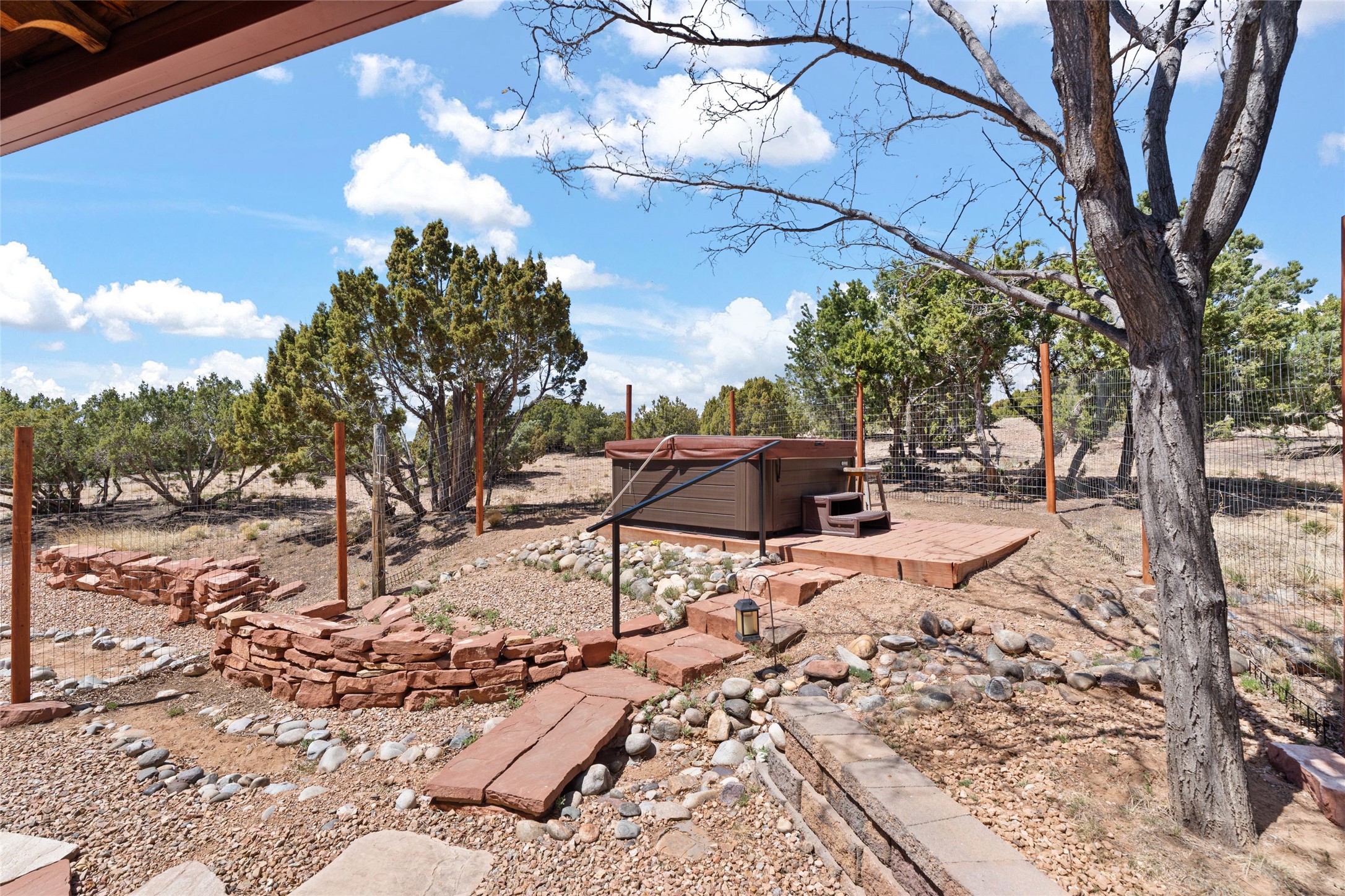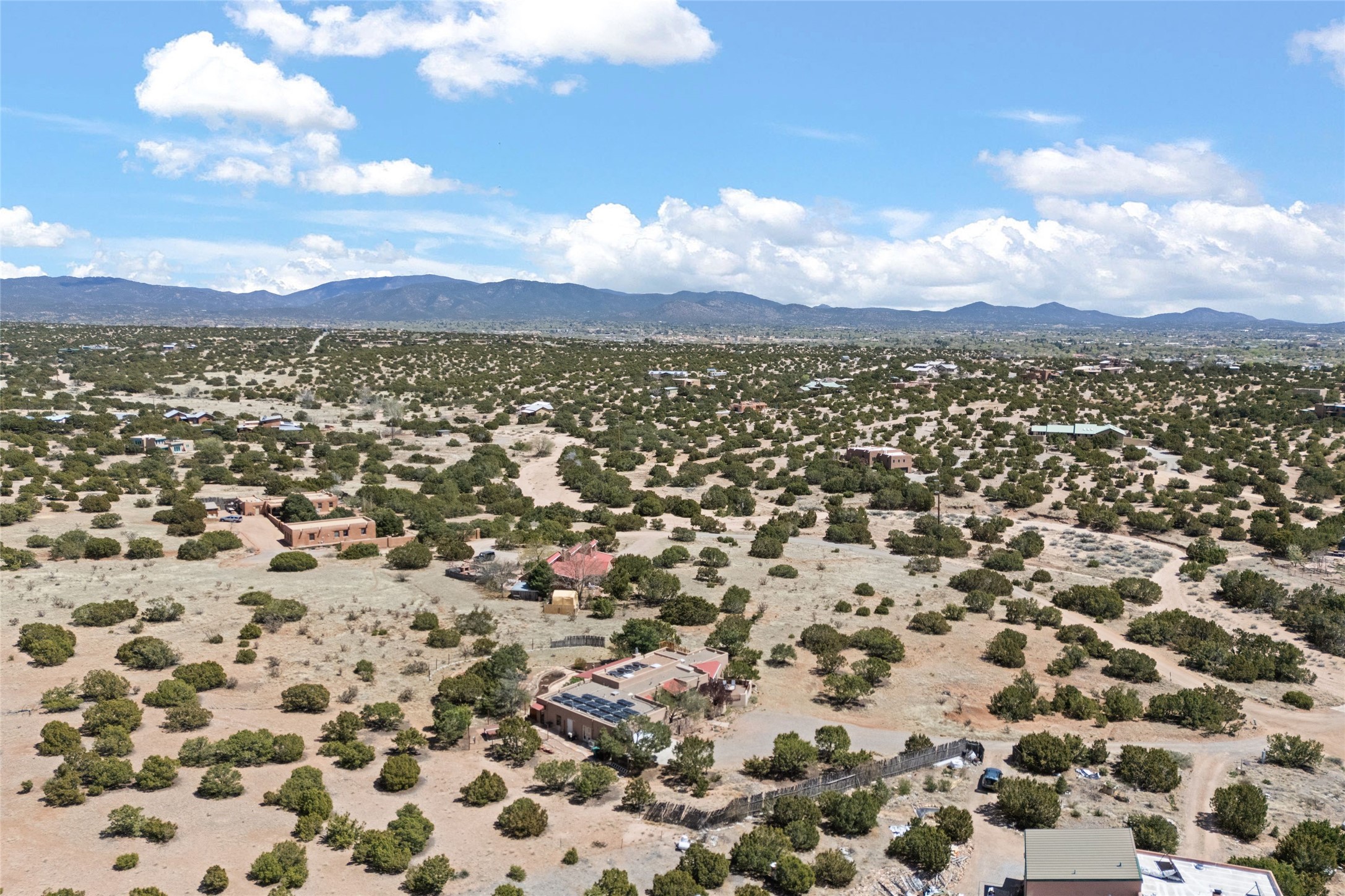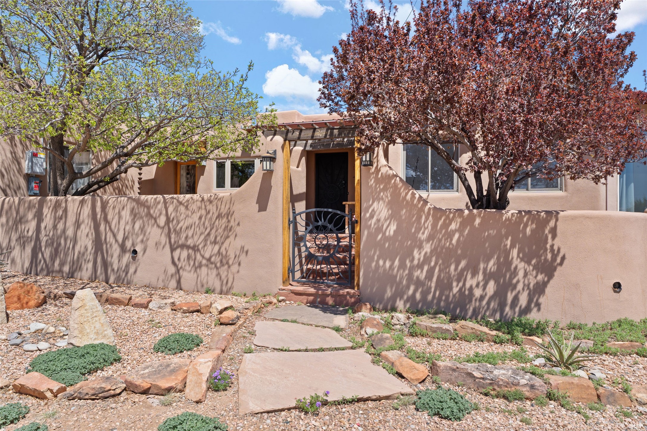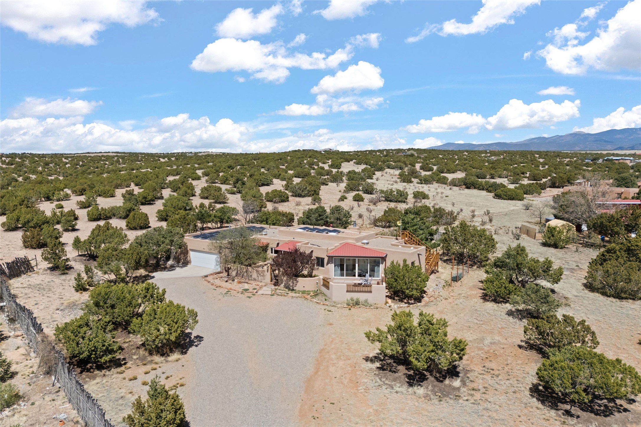 Welcome home to country living in the city with beautiful views in every direction! Enjoy the sunrise over the Sangre de Cristo's in the tastefully landscaped back portal and the sunset over the Jemez and Sandia mountains on the viewing deck off the sunroom or escape the sun in the spa off the primary bedroom at the north of the home. This 3 bedroom 2 bathroom pueblo style getaway has sleek concrete floors and a light and airy open living area with an extra space prime for a den. Peaceful and tranquil, 2.5 acres of lovely high desert expanse only a few miles from the downtown, ideally situated less than a mile off West Alameda. Oversized garage, solar powered, stairway to the roof to stargaze, fruit trees and pollinator garden and hiking trails all around. Also a great spot for dogs, with a large fenced in back yard and complete with custom doggie doors. Come and see, you'll be glad you did!