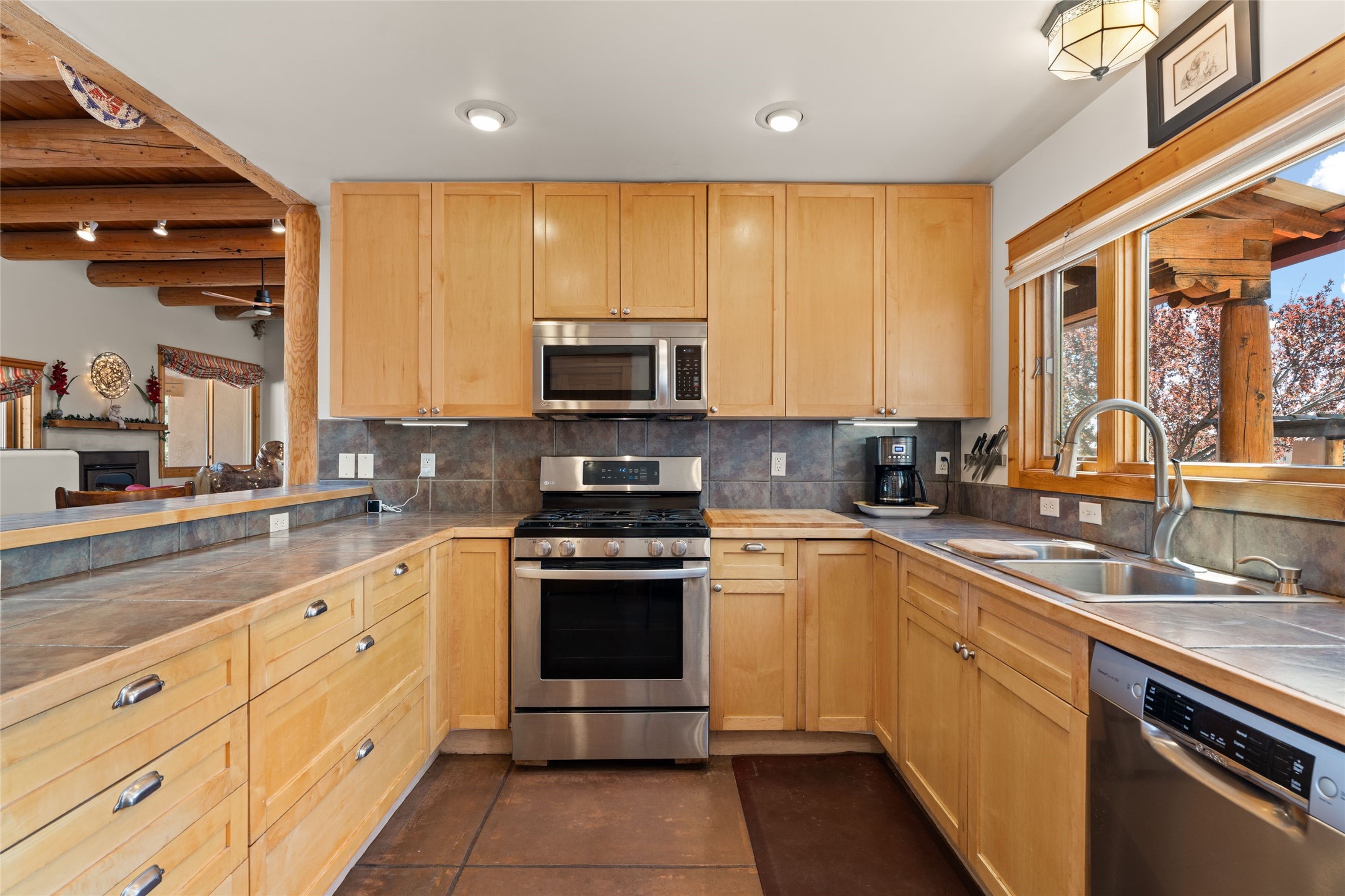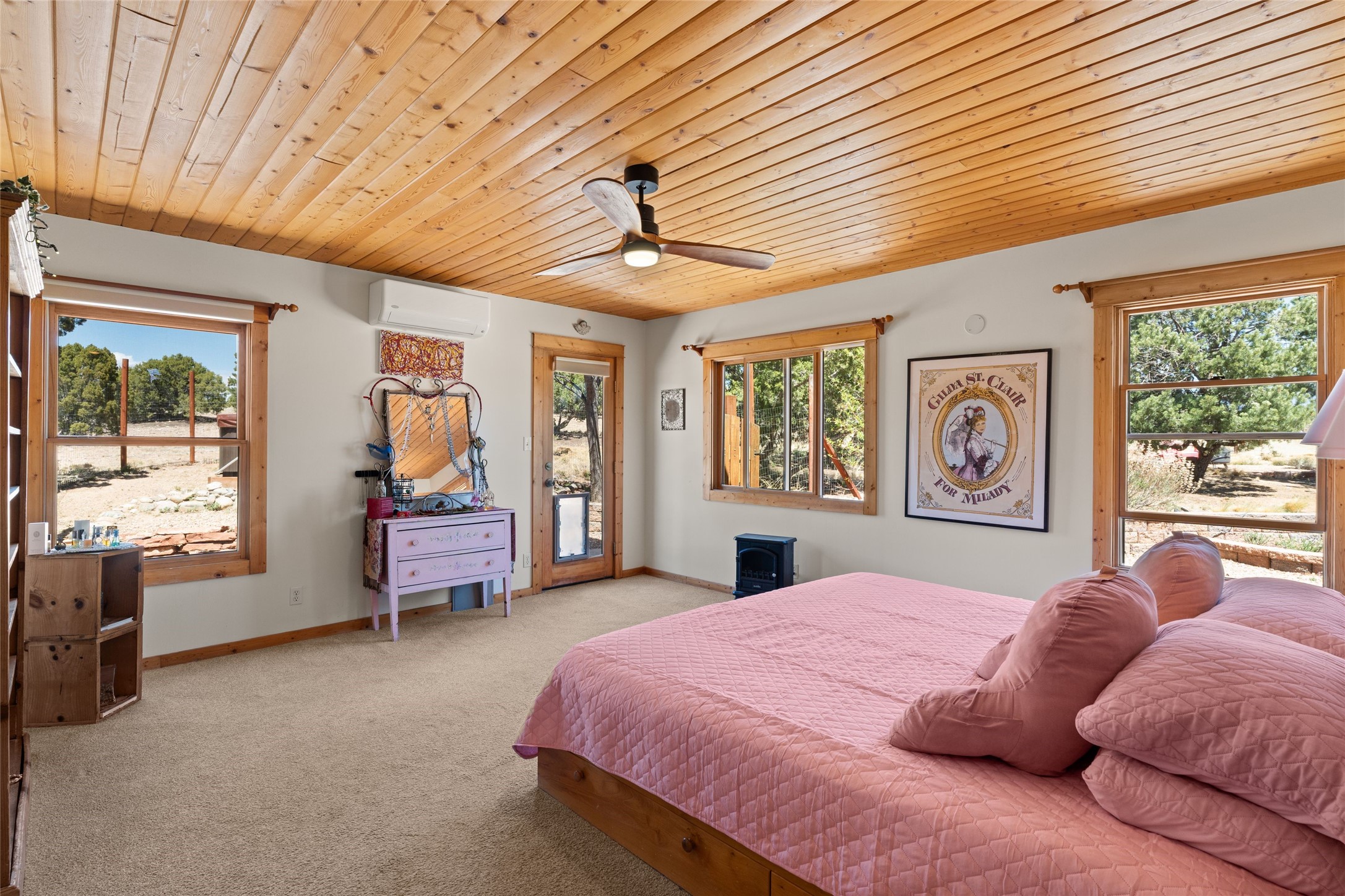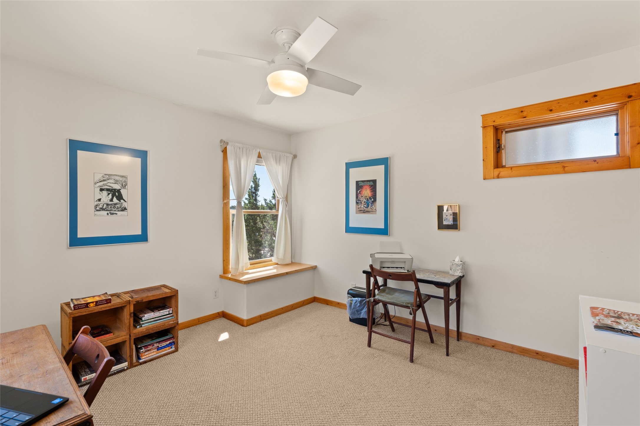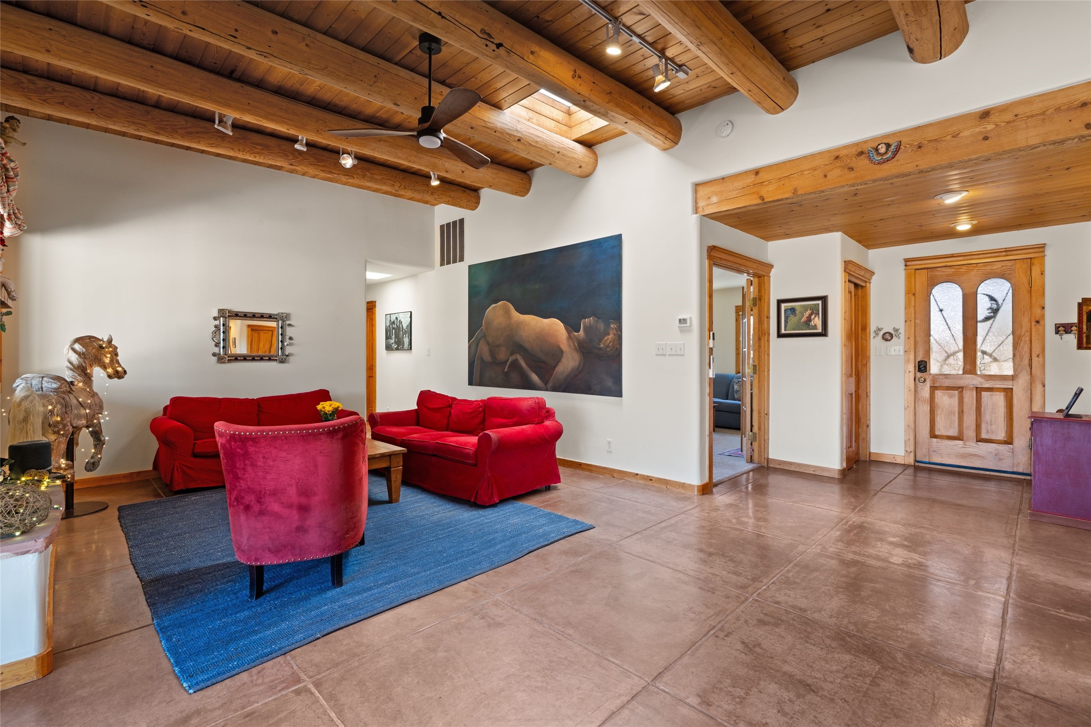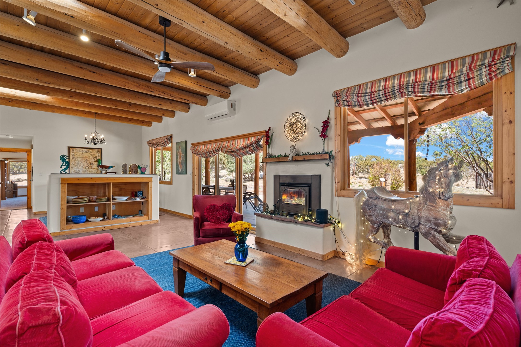 Welcome home to country living in the city with beautiful views in every direction! Enjoy the sunrise over the Sangre de Cristo's in the tastefully landscaped back portal and the sunset over the Jemez and Sandia mountains on the viewing deck off the sunroom or escape the sun in the spa off the primary bedroom at the north of the home. This 3 bedroom 2 bathroom pueblo style getaway has sleek concrete floors and a light and airy open living area with an extra space prime for a den. Peaceful and tranquil, 2.5 acres of lovely high desert expanse only a few miles from the downtown, ideally situated less than a mile off West Alameda. Oversized garage, solar powered, stairway to the roof to stargaze, fruit trees and pollinator garden and hiking trails all around. Also a great spot for dogs, with a large fenced in back yard and complete with custom doggie doors. Come and see, you'll be glad you did!