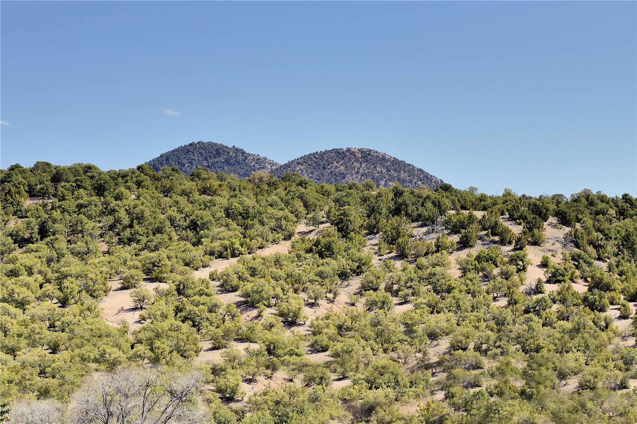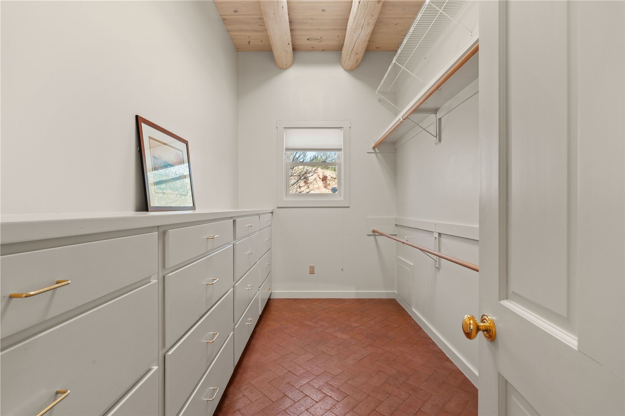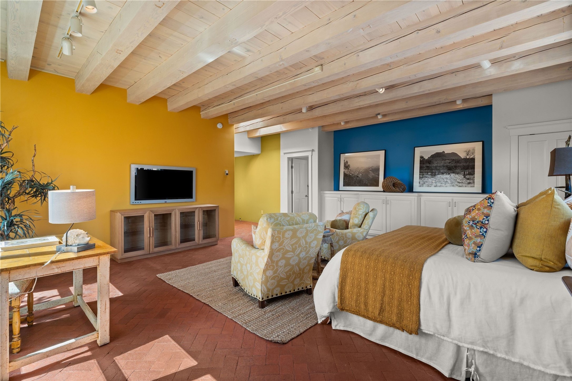 This unique and beautiful 3-bedroom, 3-bath modified Territorial-style, adobe home features unobstructed east-west mountain views and a tableau of breathtaking sunrises and sunsets. Designed by Doug Atwill, a Santa Fe builder/artist with exceptional vision, this home also features 13 ft. high beamed ceilings, 23 skylights, and radiant-heated brick floors complemented by 3 fireplaces. As you enter, a wide and gracious hallway welcomes and guides you to the back portal with stunning views of the eastern mountains. Situated to align with the summer solstice, this central hallway enjoys abundant light and provides a perfect place for displaying artwork. Public areas of the home, including elegant living room, library/media room, and spacious kitchen/dining room, are located on the south side of the hall while the private bedrooms are located on the north side. An outdoor grilling/barbecue station, hot tub, and multiple portals/patios, provide ample space for relaxation and entertaining. Gardeners and chefs alike will delight in the property's mature fruit trees and 2 waist-high irrigated planting beds. Oversized (built 2020) two-car detached garage features heating/cooling, floor-to-ceiling cabinets, art storage, EV charger, 220-volt RV charger and rooftop viewing/entertainment deck with panoramic mountain views. Environmentally conscious buyers will appreciate the green features including the solar photovoltaic electric system. Water monitoring and shut off system. Located less than one mile north of Fort Marcy and the historic Santa Fe Plaza.