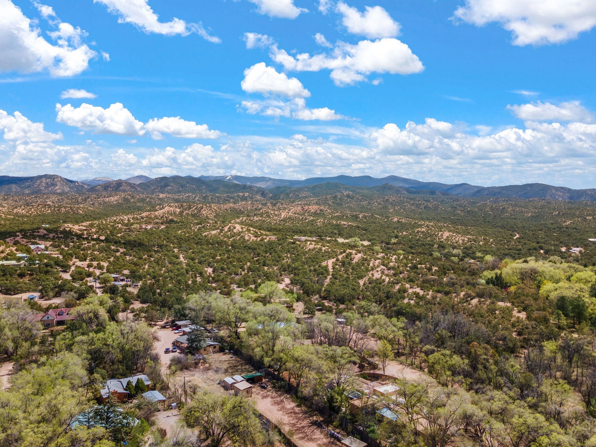 Nestled on a quiet, wooded lane just moments from the beloved Tesuque Market, this enchanting adobe residence, with its metal propanel roof, offers timeless New Mexico charm paired with thoughtful updates and serene outdoor living. A meandering brick pathway, lined with blooming tulips and spring bulbs, leads you from the front gate to a welcoming portal, setting the tone for the beauty that awaits inside. Step through the door and into a world of warmth and authenticity--hand-troweled plaster walls, Saltillo tile floors, and wide plank wood flooring create a rich, textured palette. The living room is a showstopper, infused with character featuring Mesquite wood end cut flooring. Eat-in kitchen area is grounded in history with rare 400-year-old walnut flooring. Coved ceilings with hand-hewn vigas add depth and tradition throughout the home. The sun-filled dining room is the heart of the home, featuring a striking corner Kiva fireplace with a cozy banco, perfect for intimate gatherings or peaceful mornings. A large picture window frames the lush, landscaped gardens like a living painting, making every meal feel like a celebration of nature. Newer windows throughout the home invite natural light while enhancing comfort and efficiency. Outside, your private oasis awaits. A tranquil onyx fountain adds gentle music to the air just below the shaded patio--an ideal setting for both relaxed lounging and al fresco dining. The fully fenced lot offers peace, privacy, and a connection to nature that's hard to find so close to town.This is more than a home--it's a soulful retreat that captures the essence of Tesuque living.