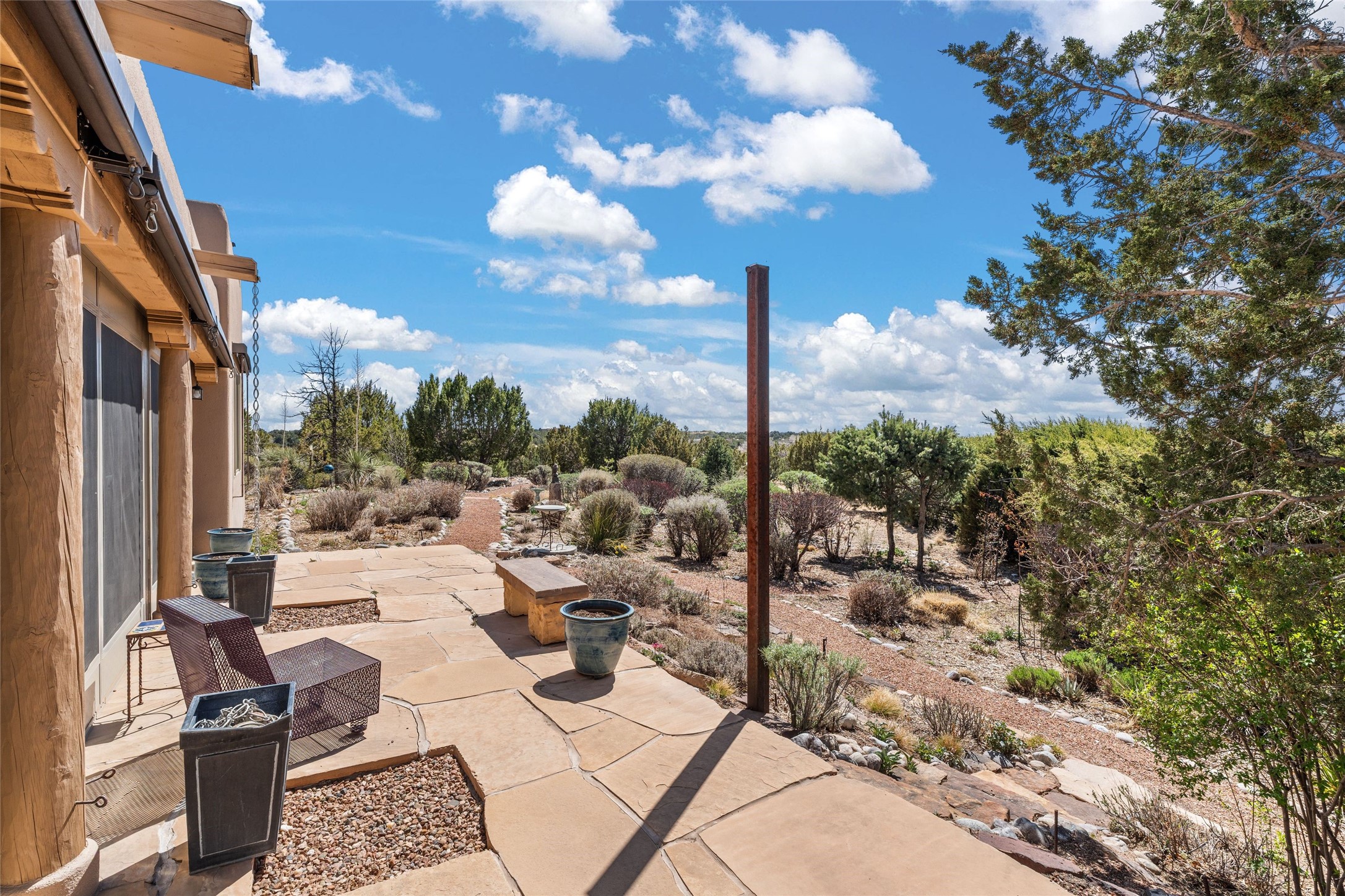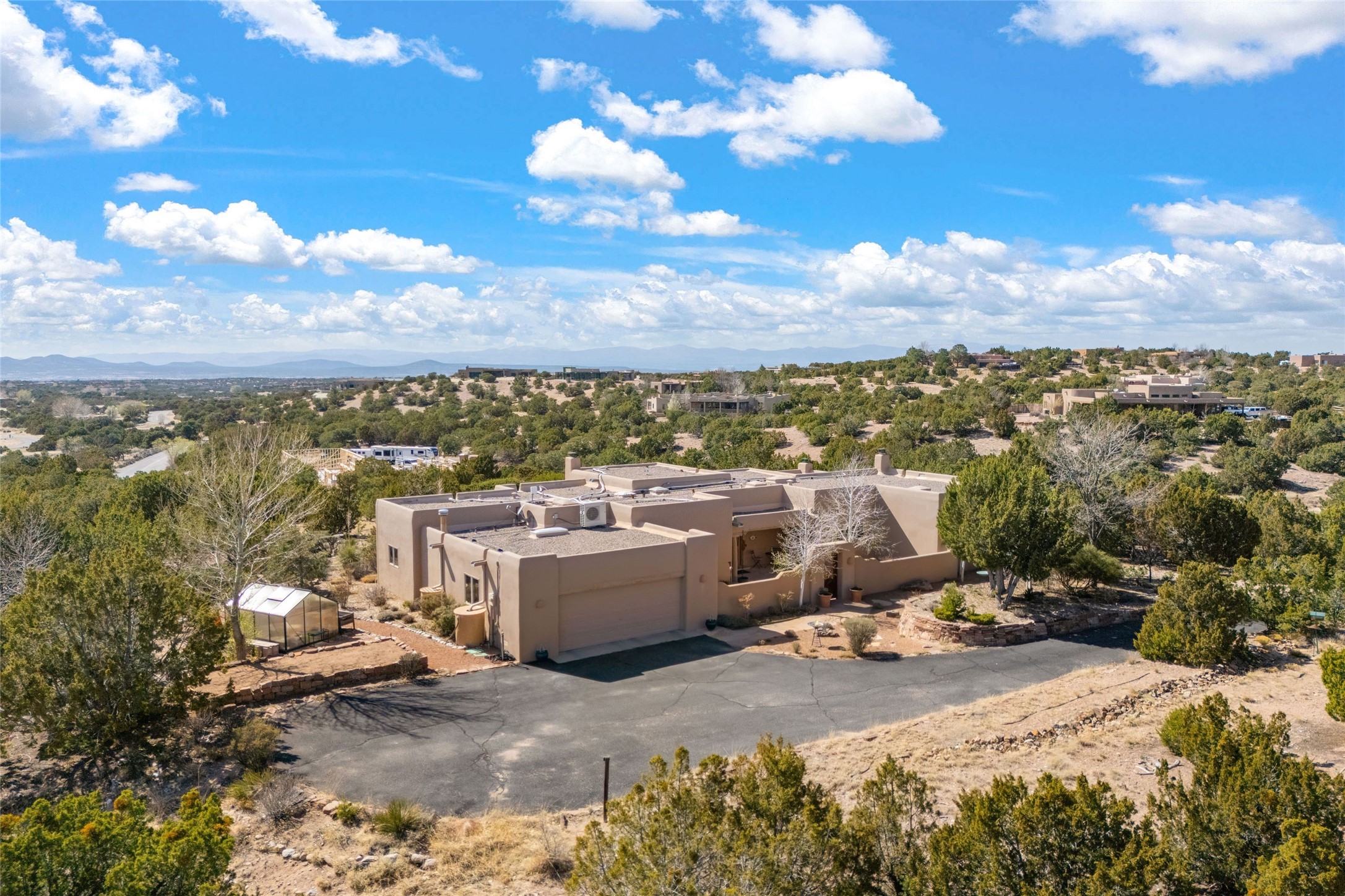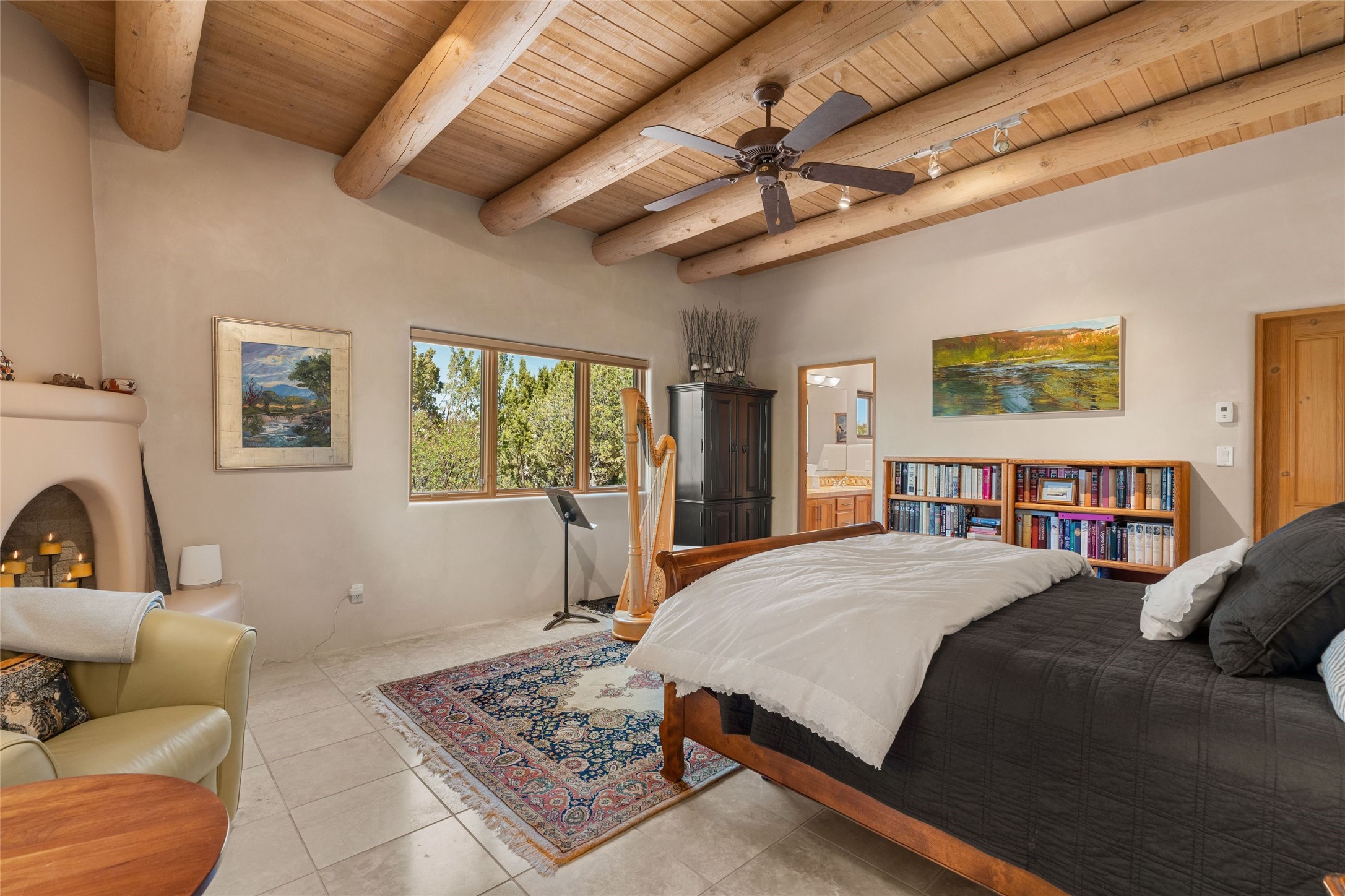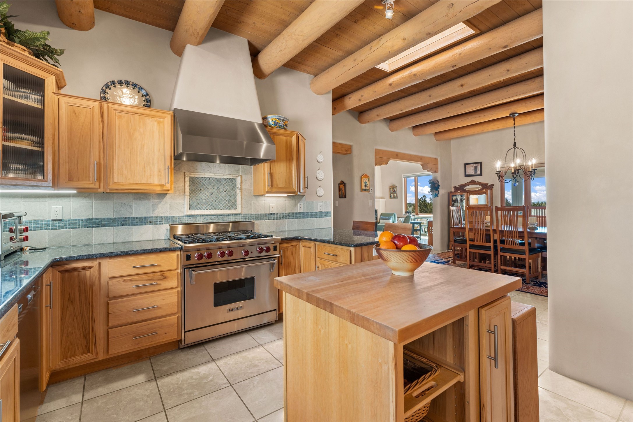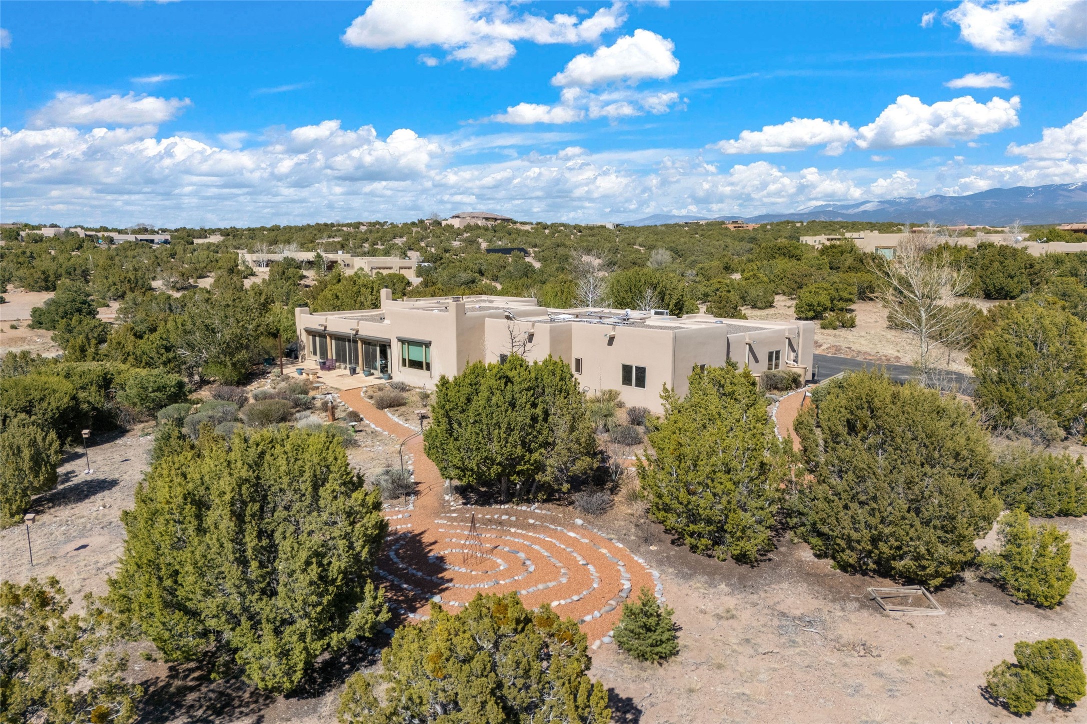 This stunning single-level home features four spacious bedrooms and two and a half baths, all designed without any interior steps for seamless accessibility. The home showcases elegant plastered walls and traditional vigas throughout, creating a warm and inviting atmosphere perfect for entertaining. A gated entry leads you to a welcoming courtyard, while the enclosed sunroom, complete with a wood-burning fireplace, offers a perfect space for relaxation. The gourmet kitchen is a chef's dream, featuring a center island, breakfast bar, Wolf range, and Miele dishwasher, all set on luxurious travertine floors that flow effortlessly throughout the home. The primary suite not only includes a deep jacuzzi tub and fireplace but also grants access to the sunroom, enhancing the living experience. Guests will appreciate the custom Murphy bed in one of the bedrooms, which can easily transform into an office or studio space as needed. Custom Santa Fe awning covers for the skylights modulate climate control during summer months. Enjoy breathtaking sunsets and picturesque views of the Jemez Mountains right from your backyard. Outdoor enthusiasts will appreciate the proximity to La Tierra's extensive walking and hiking trail systems, making it easy to explore the natural beauty of the area. Additionally, this prime location is just a quick drive away from the vibrant downtown plaza, the renowned Canyon Road, and the Santa Fe Opera.