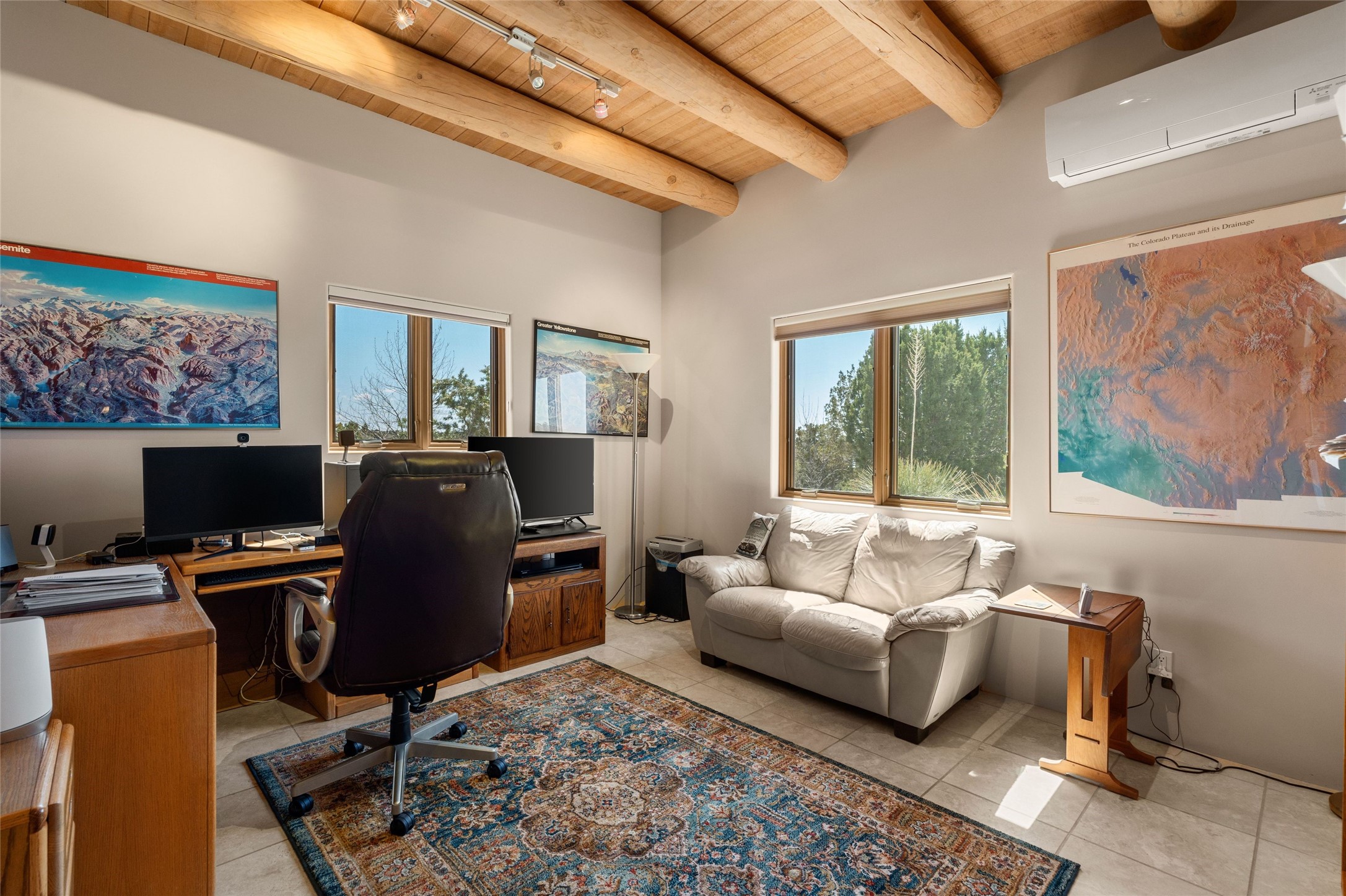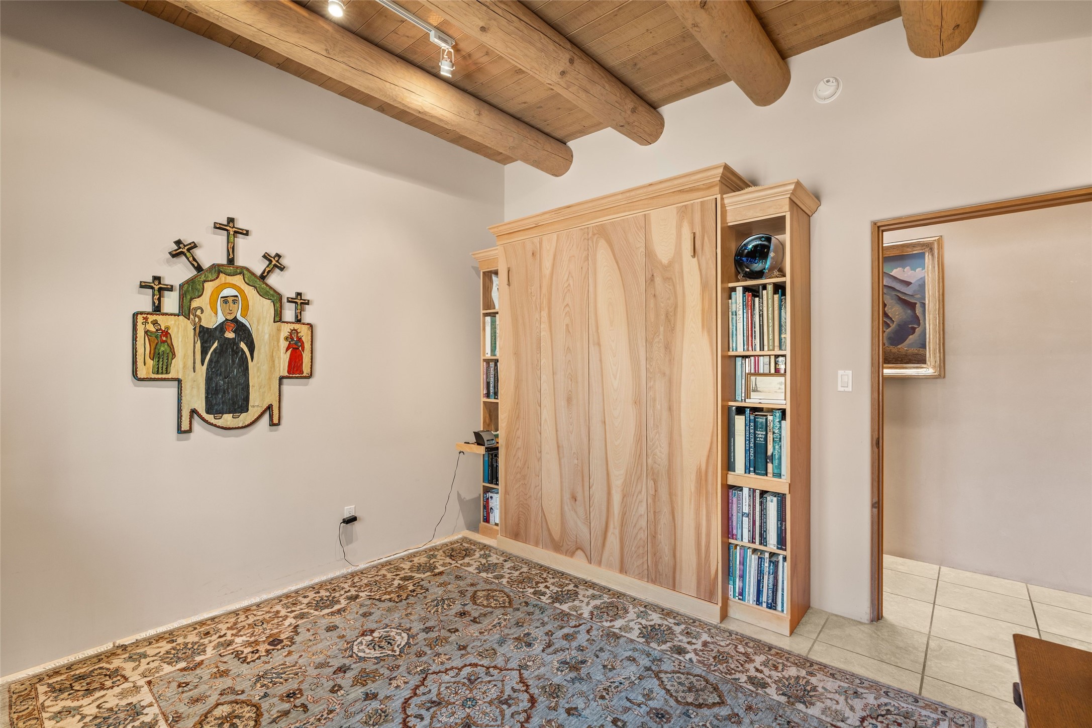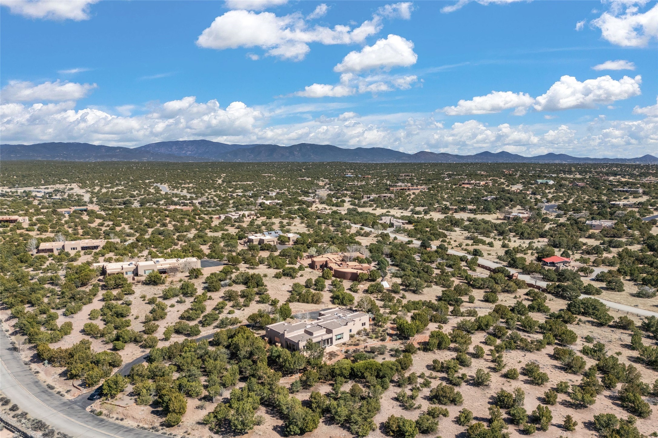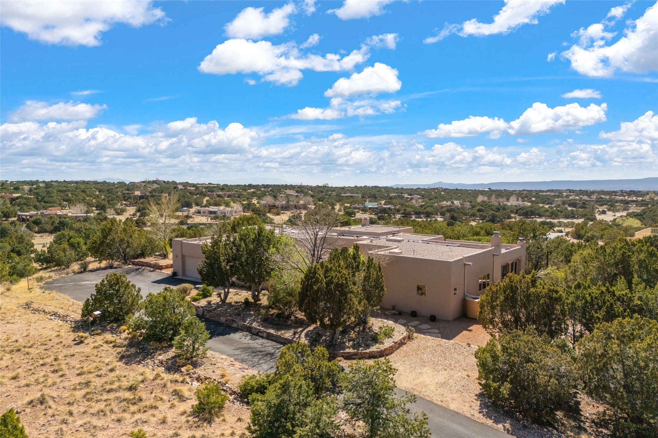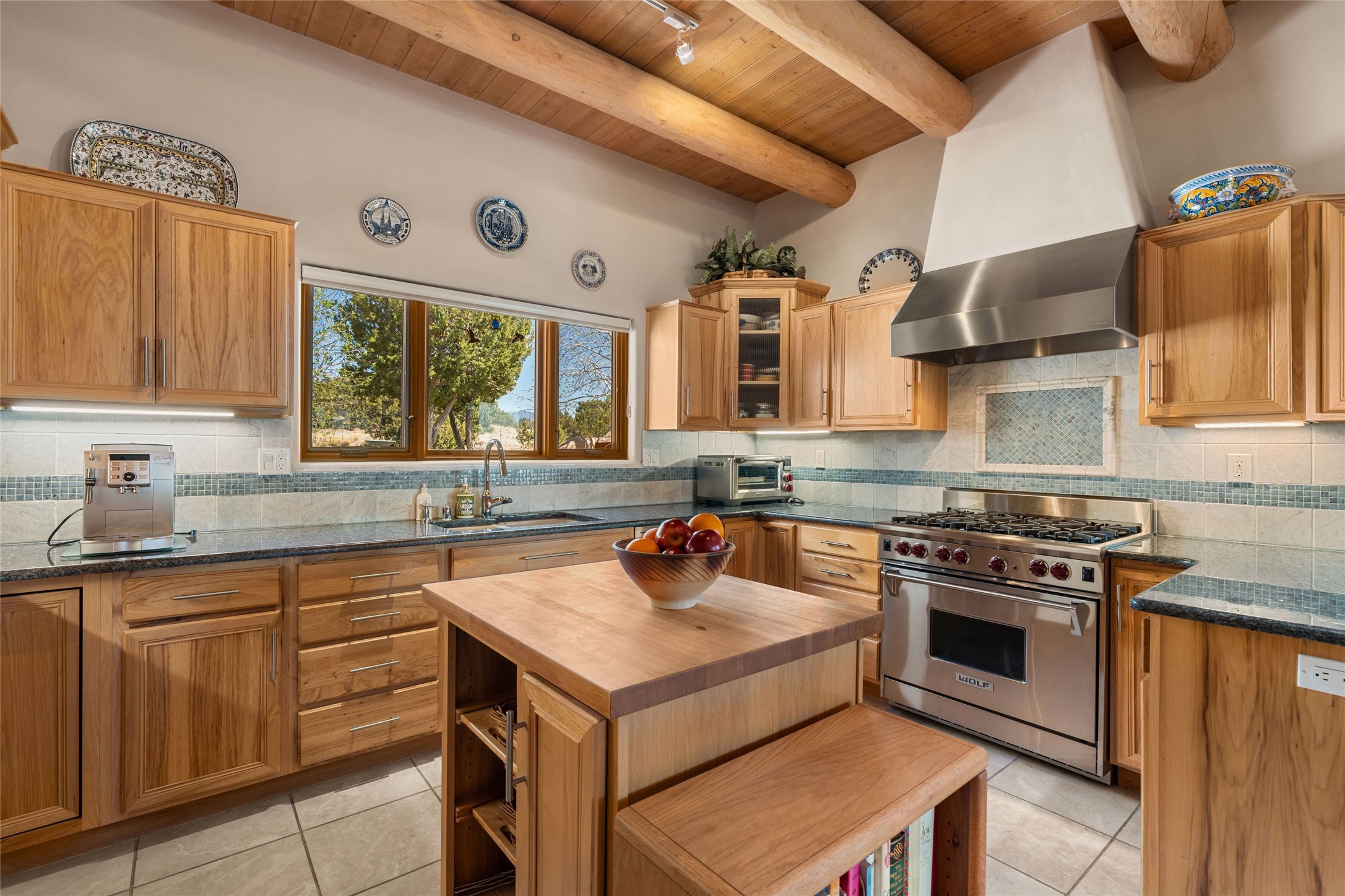 This stunning single-level home features four spacious bedrooms and two and a half baths, all designed without any interior steps for seamless accessibility. The home showcases elegant plastered walls and traditional vigas throughout, creating a warm and inviting atmosphere perfect for entertaining. A gated entry leads you to a welcoming courtyard, while the enclosed sunroom, complete with a wood-burning fireplace, offers a perfect space for relaxation. The gourmet kitchen is a chef's dream, featuring a center island, breakfast bar, Wolf range, and Miele dishwasher, all set on luxurious travertine floors that flow effortlessly throughout the home. The primary suite not only includes a deep jacuzzi tub and fireplace but also grants access to the sunroom, enhancing the living experience. Guests will appreciate the custom Murphy bed in one of the bedrooms, which can easily transform into an office or studio space as needed. Custom Santa Fe awning covers for the skylights modulate climate control during summer months. Enjoy breathtaking sunsets and picturesque views of the Jemez Mountains right from your backyard. Outdoor enthusiasts will appreciate the proximity to La Tierra's extensive walking and hiking trail systems, making it easy to explore the natural beauty of the area. Additionally, this prime location is just a quick drive away from the vibrant downtown plaza, the renowned Canyon Road, and the Santa Fe Opera.