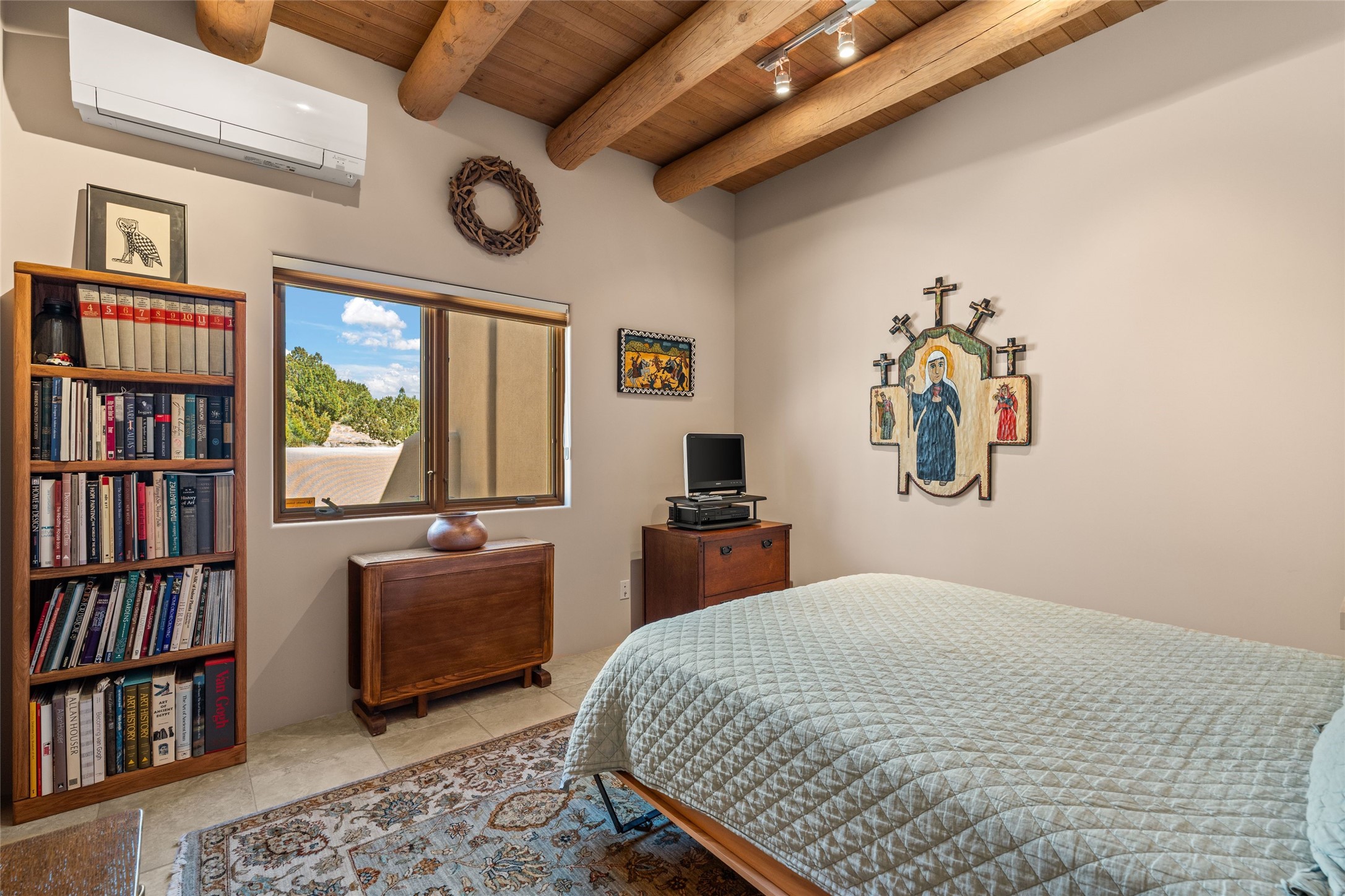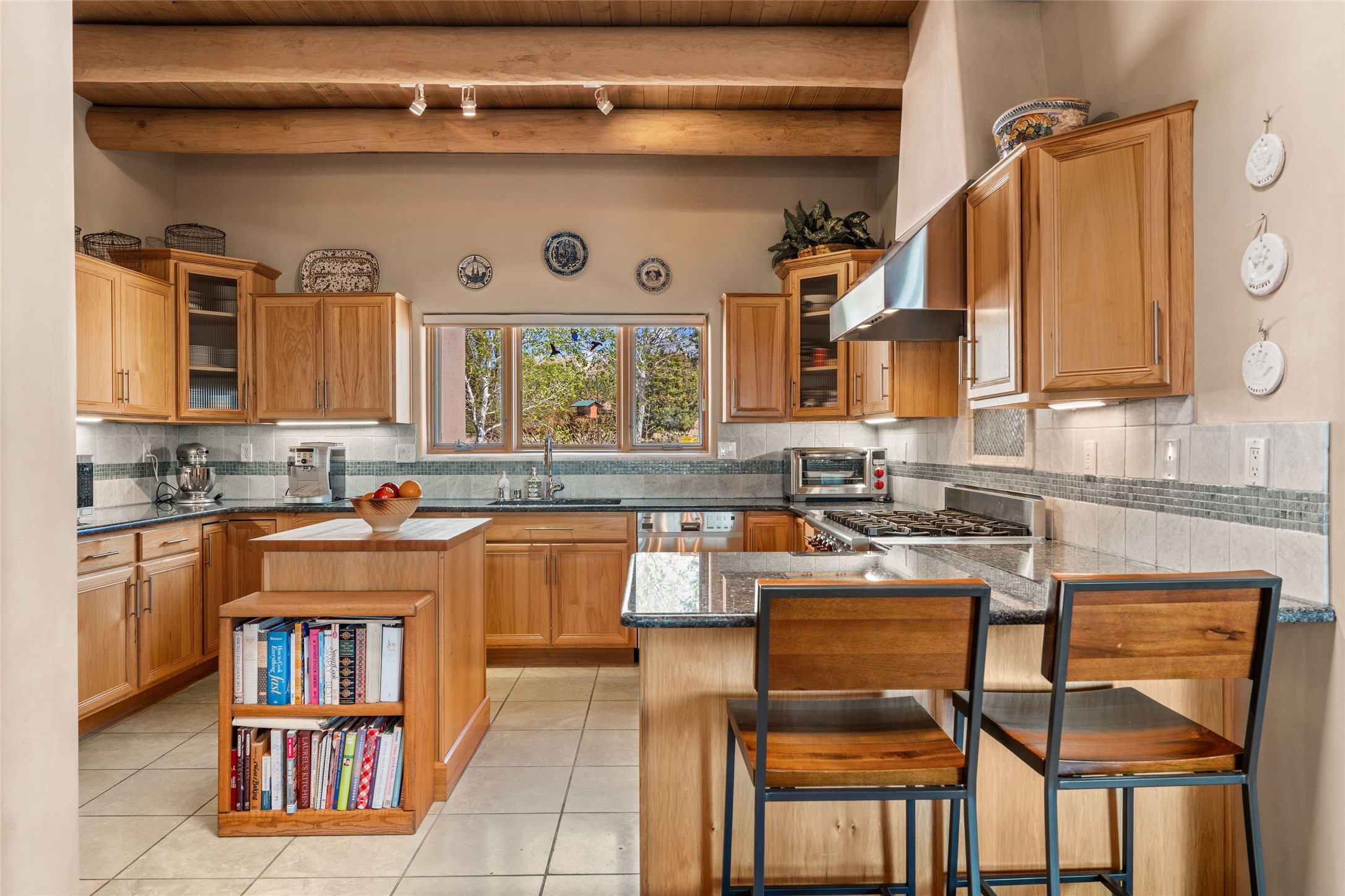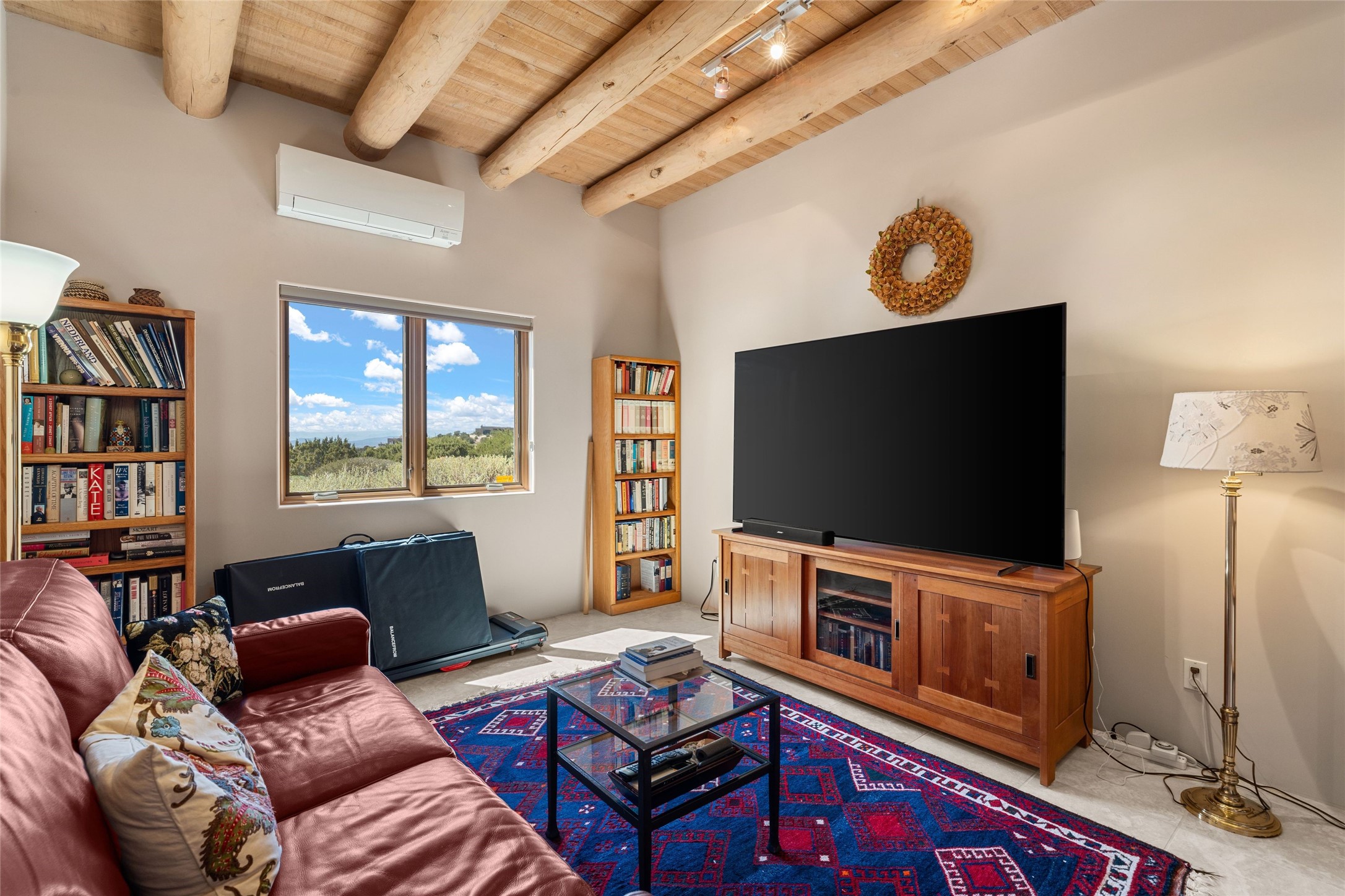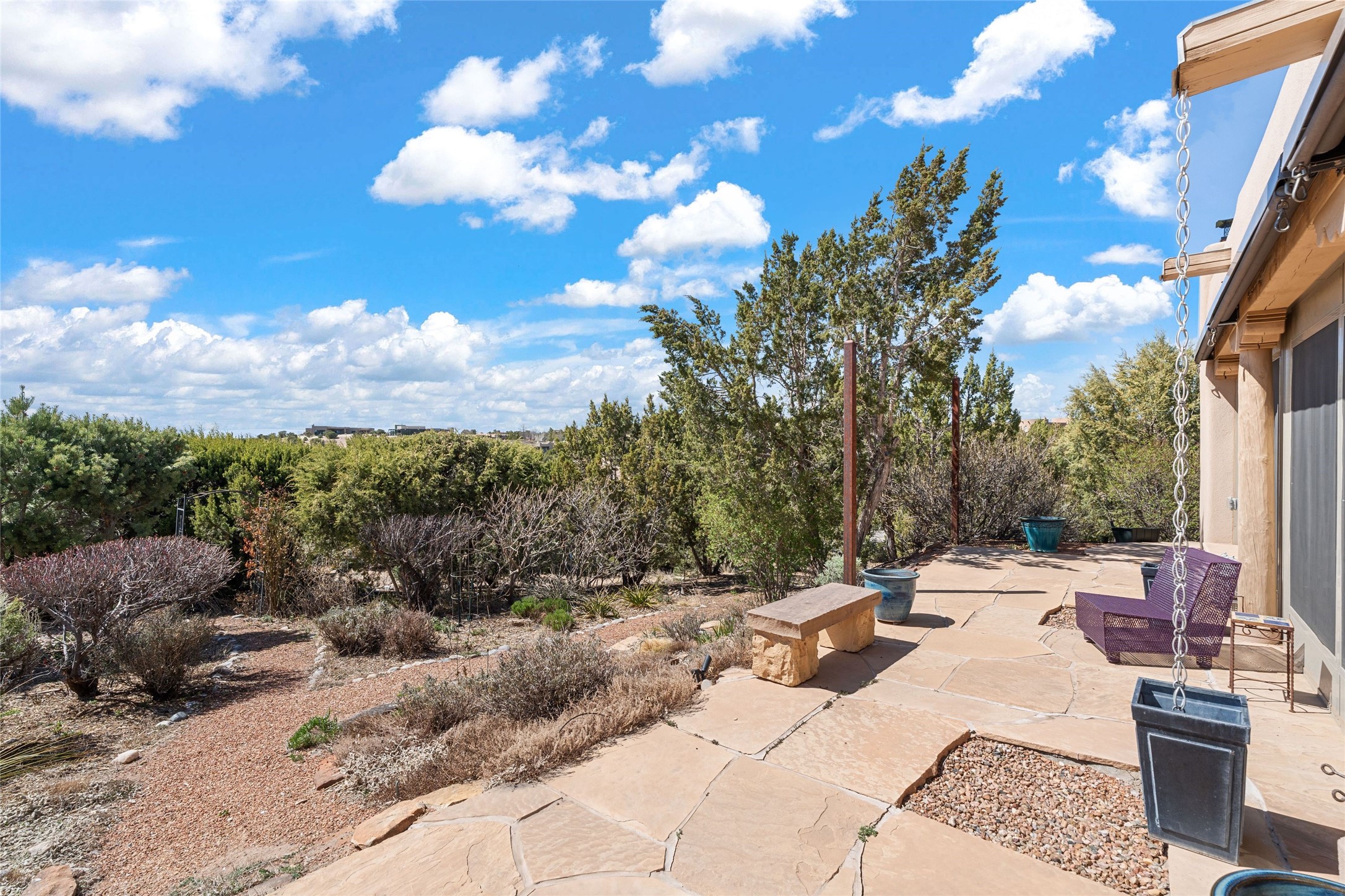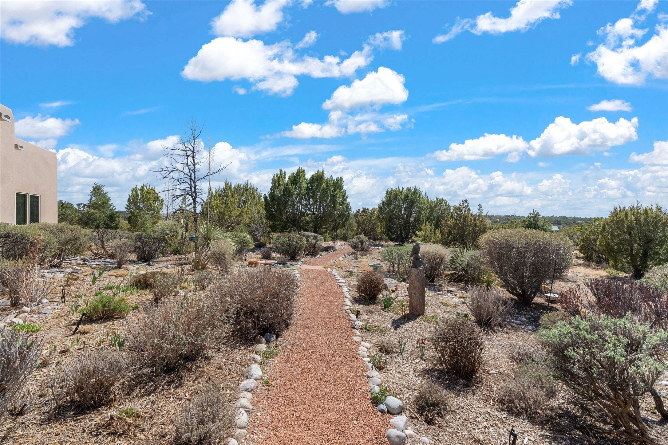 This stunning single-level home features four spacious bedrooms and two and a half baths, all designed without any interior steps for seamless accessibility. The home showcases elegant plastered walls and traditional vigas throughout, creating a warm and inviting atmosphere perfect for entertaining. A gated entry leads you to a welcoming courtyard, while the enclosed sunroom, complete with a wood-burning fireplace, offers a perfect space for relaxation. The gourmet kitchen is a chef's dream, featuring a center island, breakfast bar, Wolf range, and Miele dishwasher, all set on luxurious travertine floors that flow effortlessly throughout the home. The primary suite not only includes a deep jacuzzi tub and fireplace but also grants access to the sunroom, enhancing the living experience. Guests will appreciate the custom Murphy bed in one of the bedrooms, which can easily transform into an office or studio space as needed. Custom Santa Fe awning covers for the skylights modulate climate control during summer months. Enjoy breathtaking sunsets and picturesque views of the Jemez Mountains right from your backyard. Outdoor enthusiasts will appreciate the proximity to La Tierra's extensive walking and hiking trail systems, making it easy to explore the natural beauty of the area. Additionally, this prime location is just a quick drive away from the vibrant downtown plaza, the renowned Canyon Road, and the Santa Fe Opera.