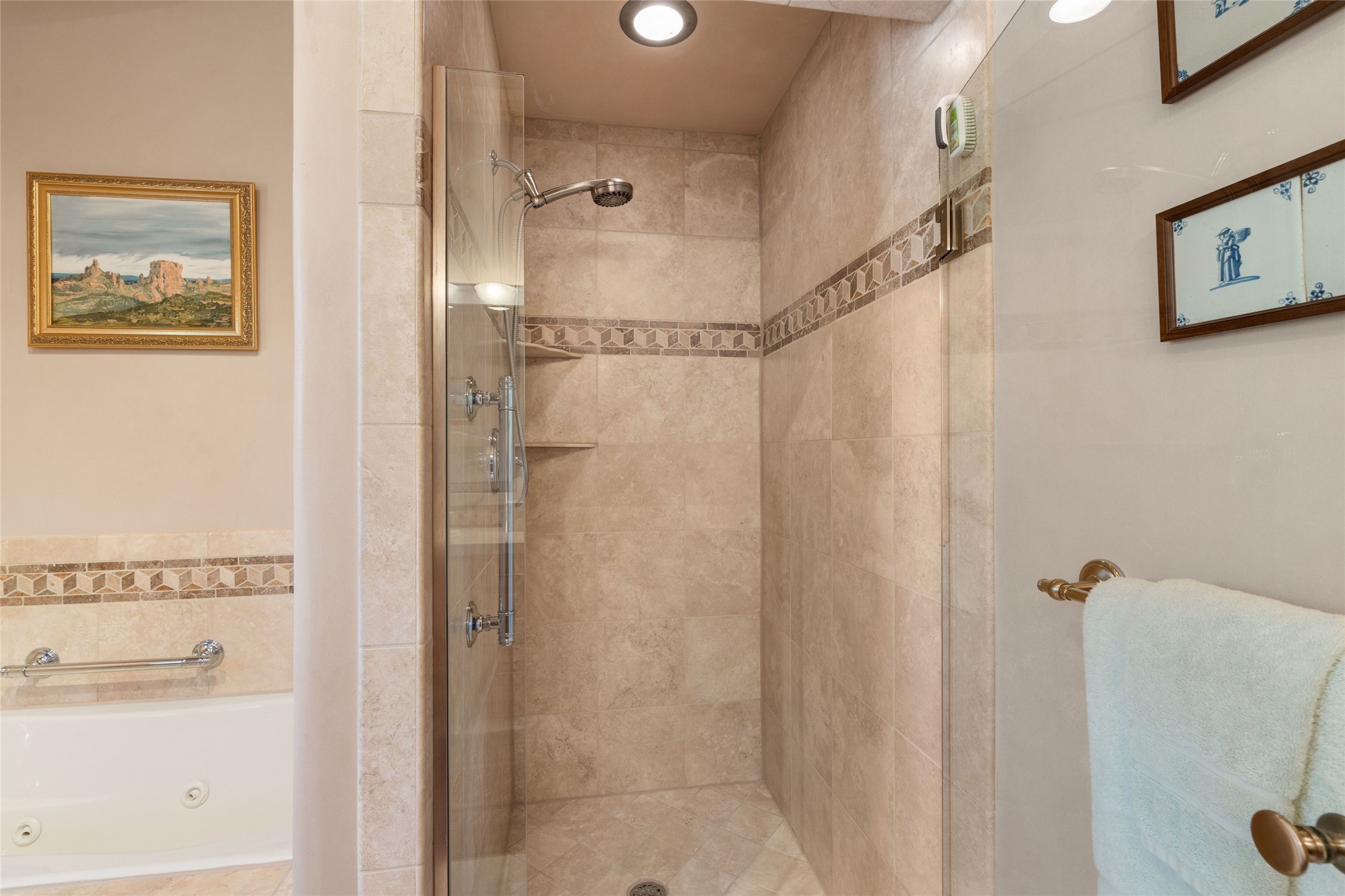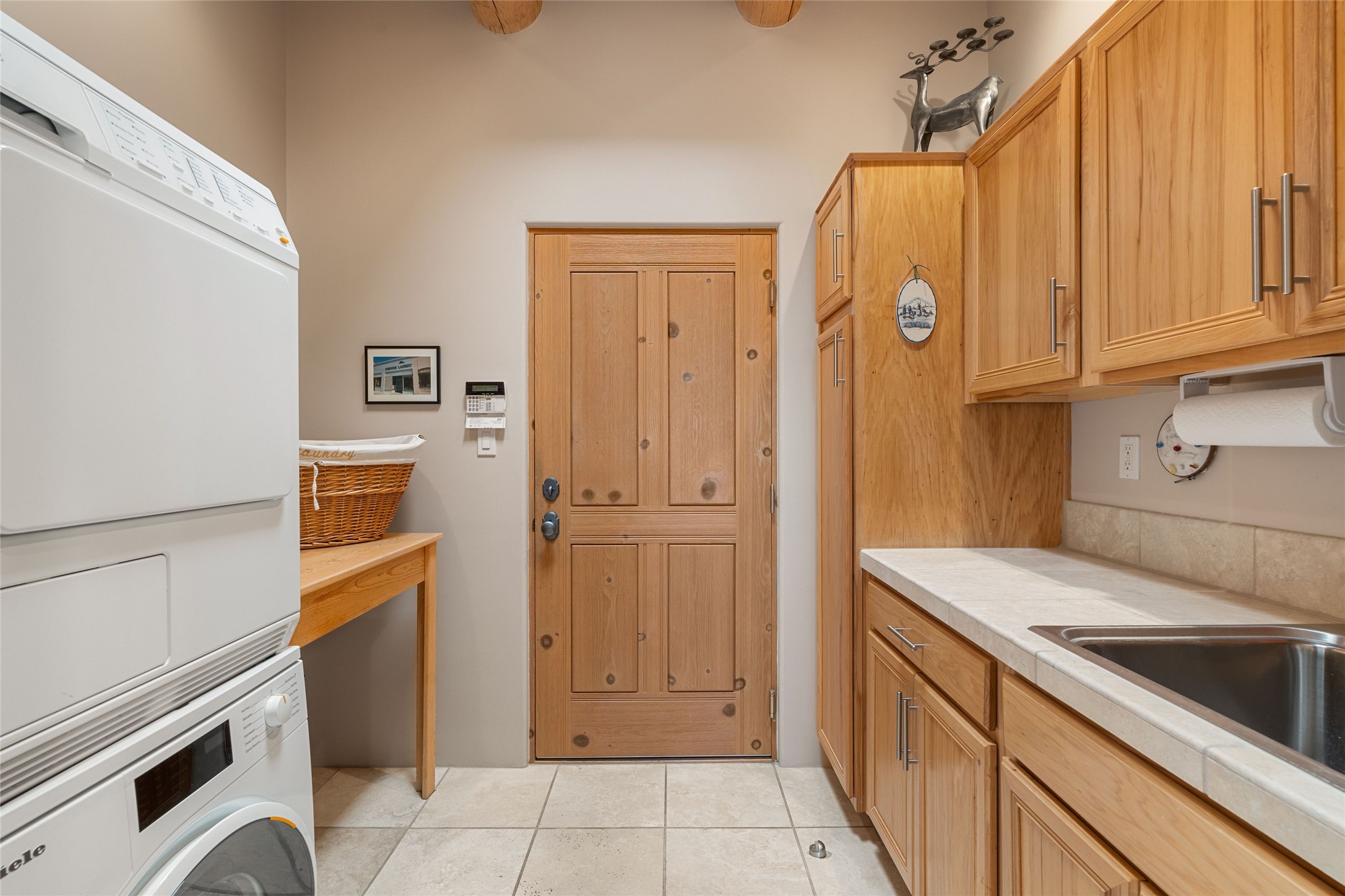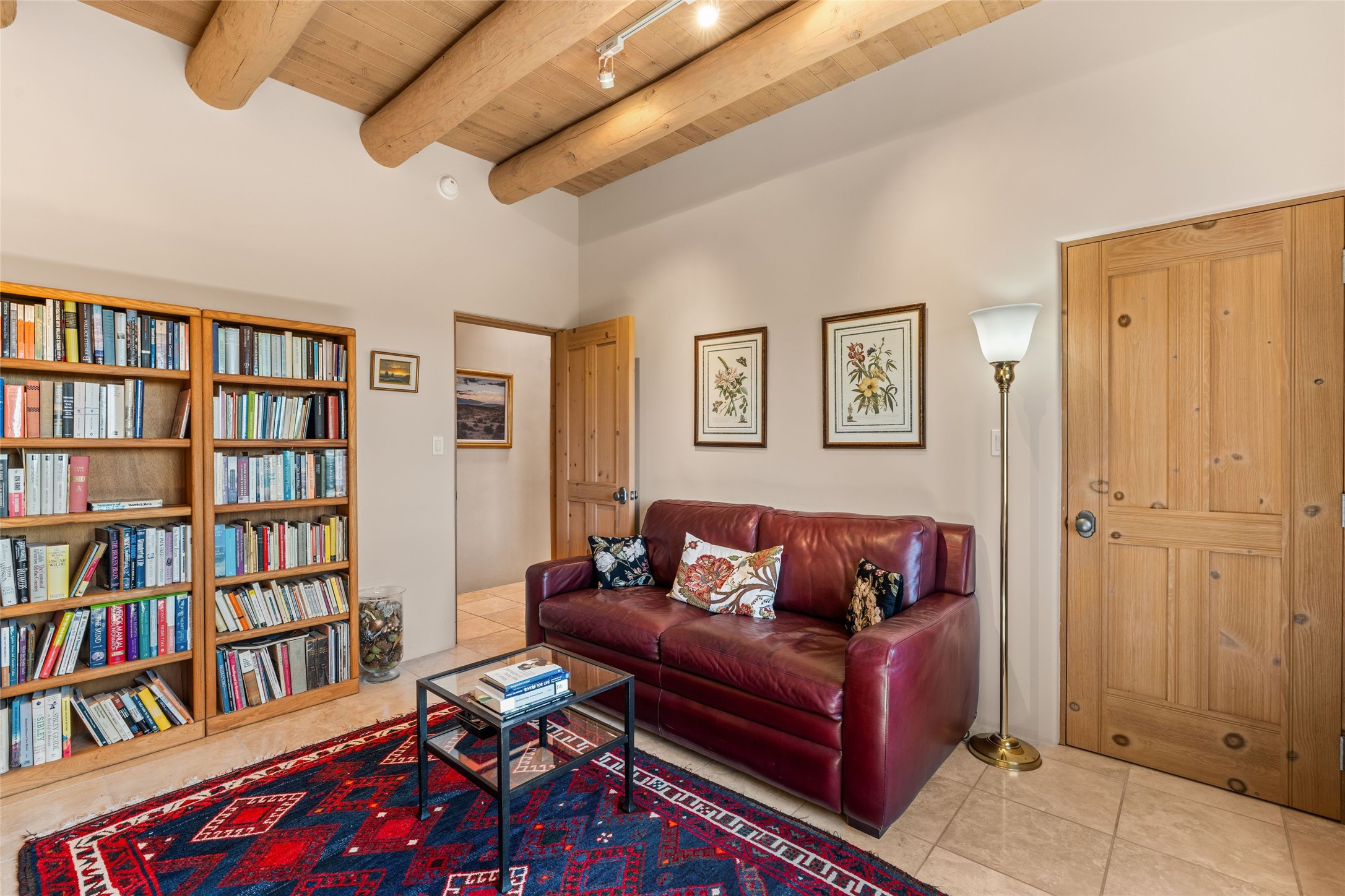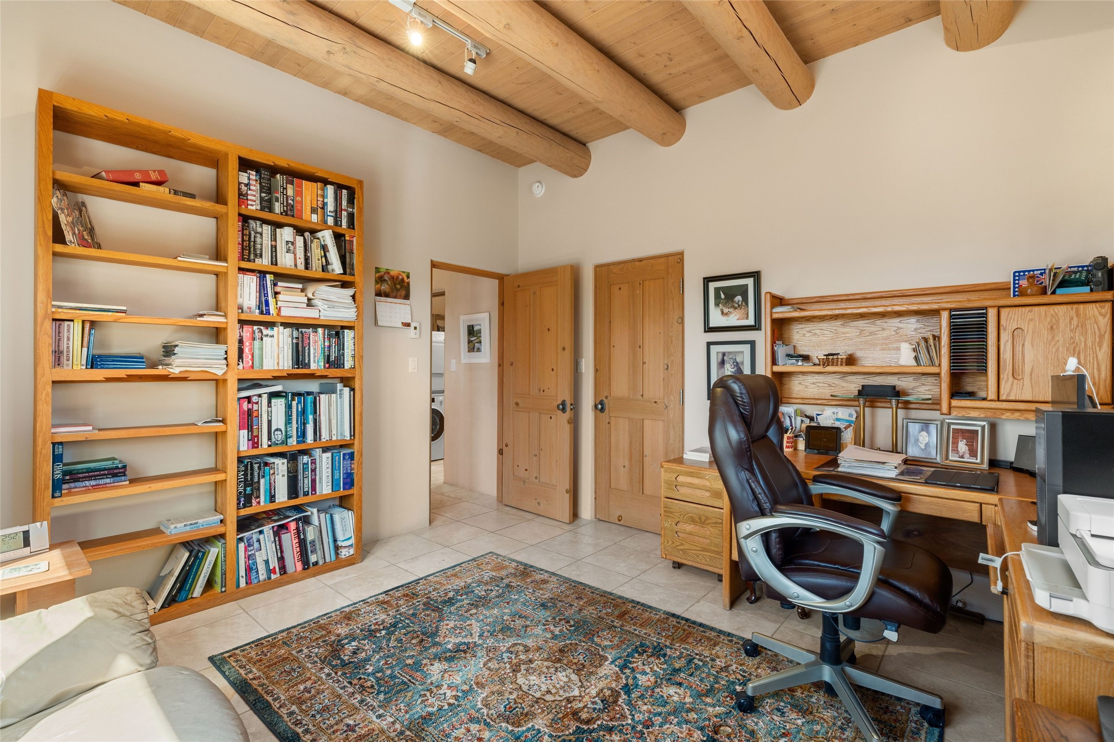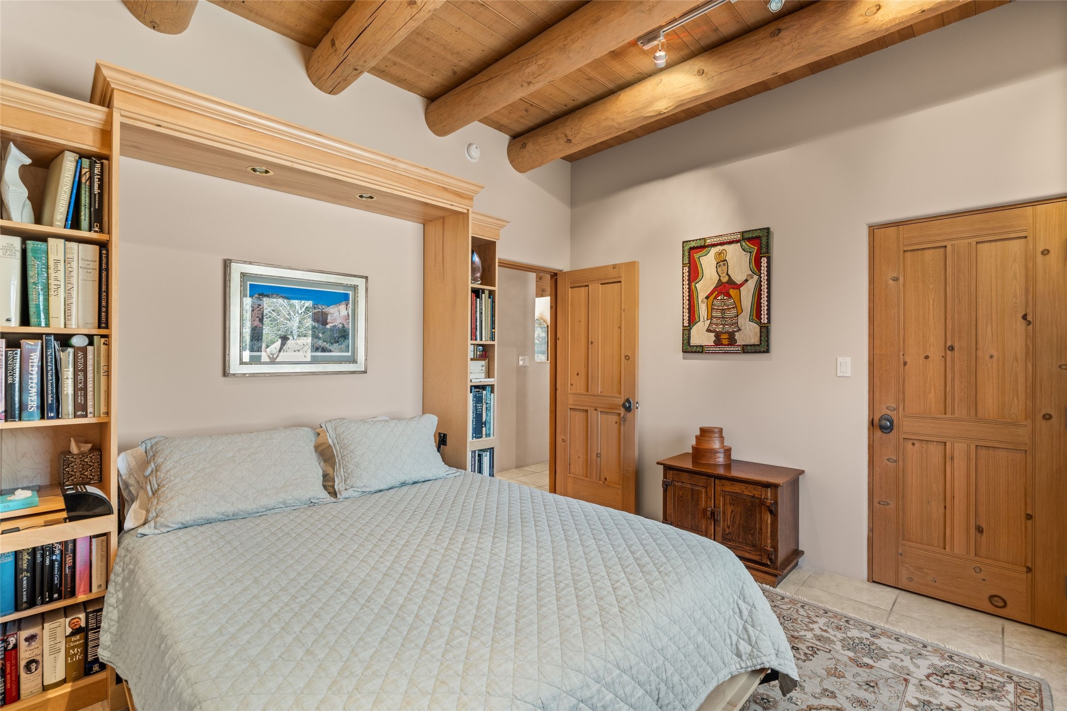 This stunning single-level home features four spacious bedrooms and two and a half baths, all designed without any interior steps for seamless accessibility. The home showcases elegant plastered walls and traditional vigas throughout, creating a warm and inviting atmosphere perfect for entertaining. A gated entry leads you to a welcoming courtyard, while the enclosed sunroom, complete with a wood-burning fireplace, offers a perfect space for relaxation. The gourmet kitchen is a chef's dream, featuring a center island, breakfast bar, Wolf range, and Miele dishwasher, all set on luxurious travertine floors that flow effortlessly throughout the home. The primary suite not only includes a deep jacuzzi tub and fireplace but also grants access to the sunroom, enhancing the living experience. Guests will appreciate the custom Murphy bed in one of the bedrooms, which can easily transform into an office or studio space as needed. Custom Santa Fe awning covers for the skylights modulate climate control during summer months. Enjoy breathtaking sunsets and picturesque views of the Jemez Mountains right from your backyard. Outdoor enthusiasts will appreciate the proximity to La Tierra's extensive walking and hiking trail systems, making it easy to explore the natural beauty of the area. Additionally, this prime location is just a quick drive away from the vibrant downtown plaza, the renowned Canyon Road, and the Santa Fe Opera.
