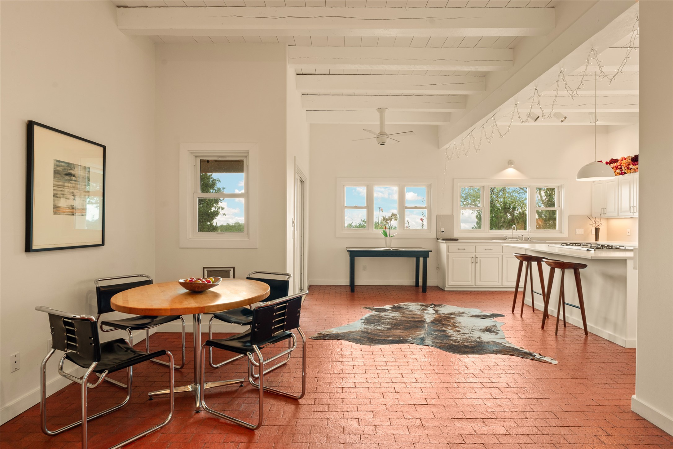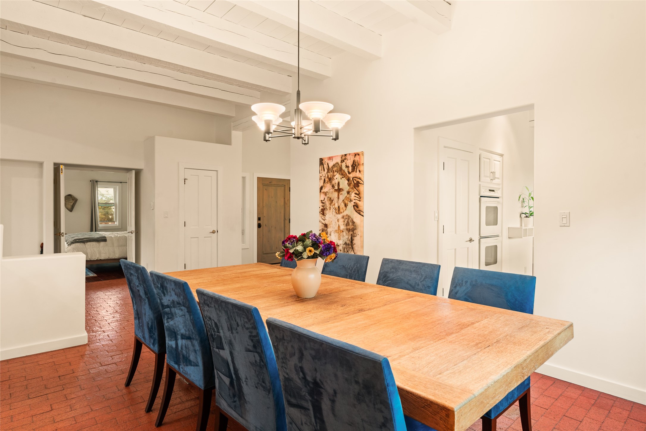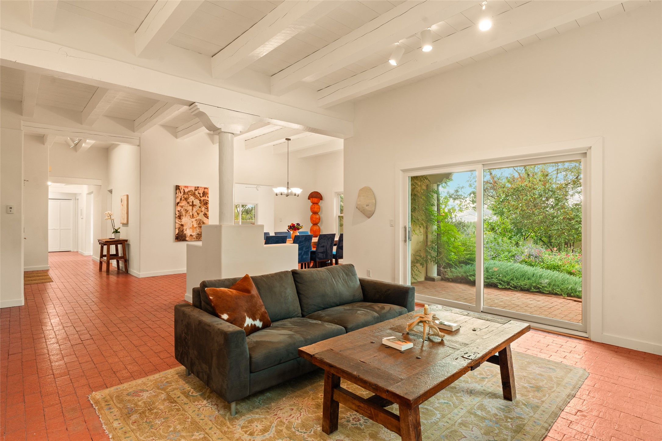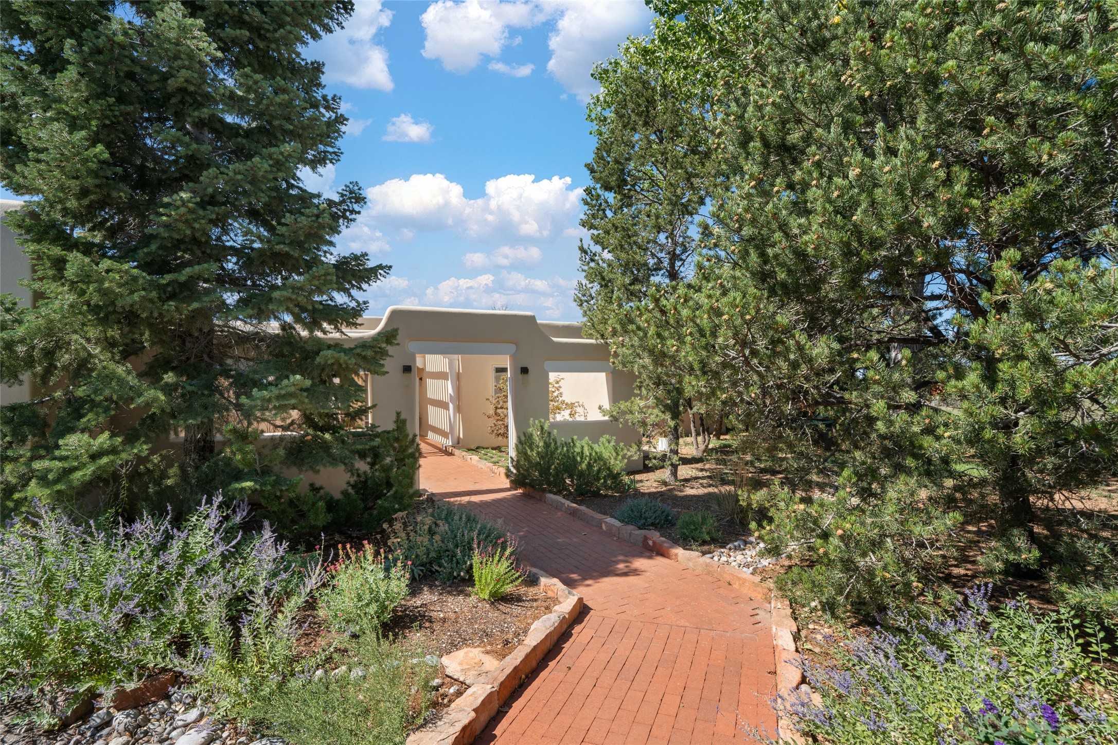 This timeless and sophisticated property is situated in a quiet and horse-friendly Santa Fe location just a short distance from the Arroyo Hondo Open Space trails and the famed Harry's Roadhouse restaurant. This 2,956 sq.ft. single-story constructed home has recently been completely updated and exudes a classic Santa Fe style surrounded by 6.041 acres of fenced, gated and usable land with wraparound views of the Sangre, Ortiz and Jemez mountains. Private sitting and entertaining spaces surround the home with lush, seasonal and mature landscaping, including fruit trees in the orchard. The home consists of a primary ensuite, two secondary bedrooms, 2.5 baths, and a separate office or flex room, all with classic bricked floors and whitewashed vigas throughout. The formal living/dining area's focal point is a gas burning fireplace. The updated kitchen features a large island, quartz countertops, walk-in pantry storage, and a sweet kiva fireplace with access to the covered patio. Functional amenities include radiant floor heat, on-demand hot water and mini-split AC/heating in the owners suite and office. A studio/workshop/3rd bay garage is adjacent to the deep 2-car attached garage. A nearby concrete pad has electricity stubbed-in, ideal for a future barn or casita. Completely updated (including roof, stucco, windows, mechanicals, and a new gas stove in the island) and perfectly maintained, this is a property not to be missed in an idyllic Santa Fe location.