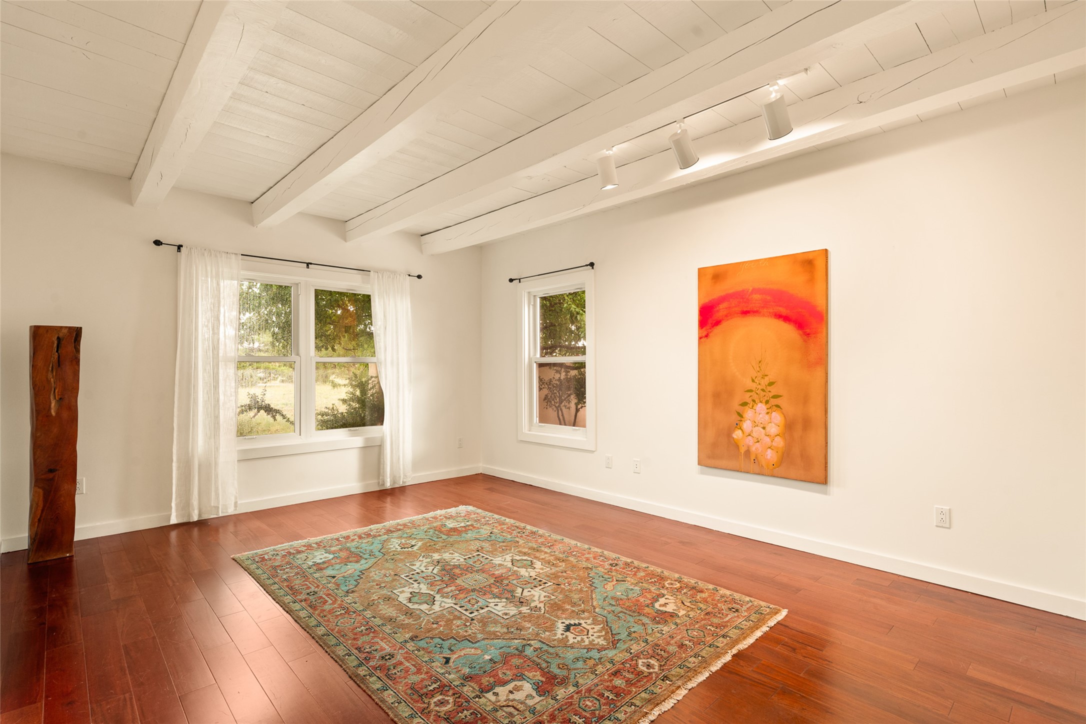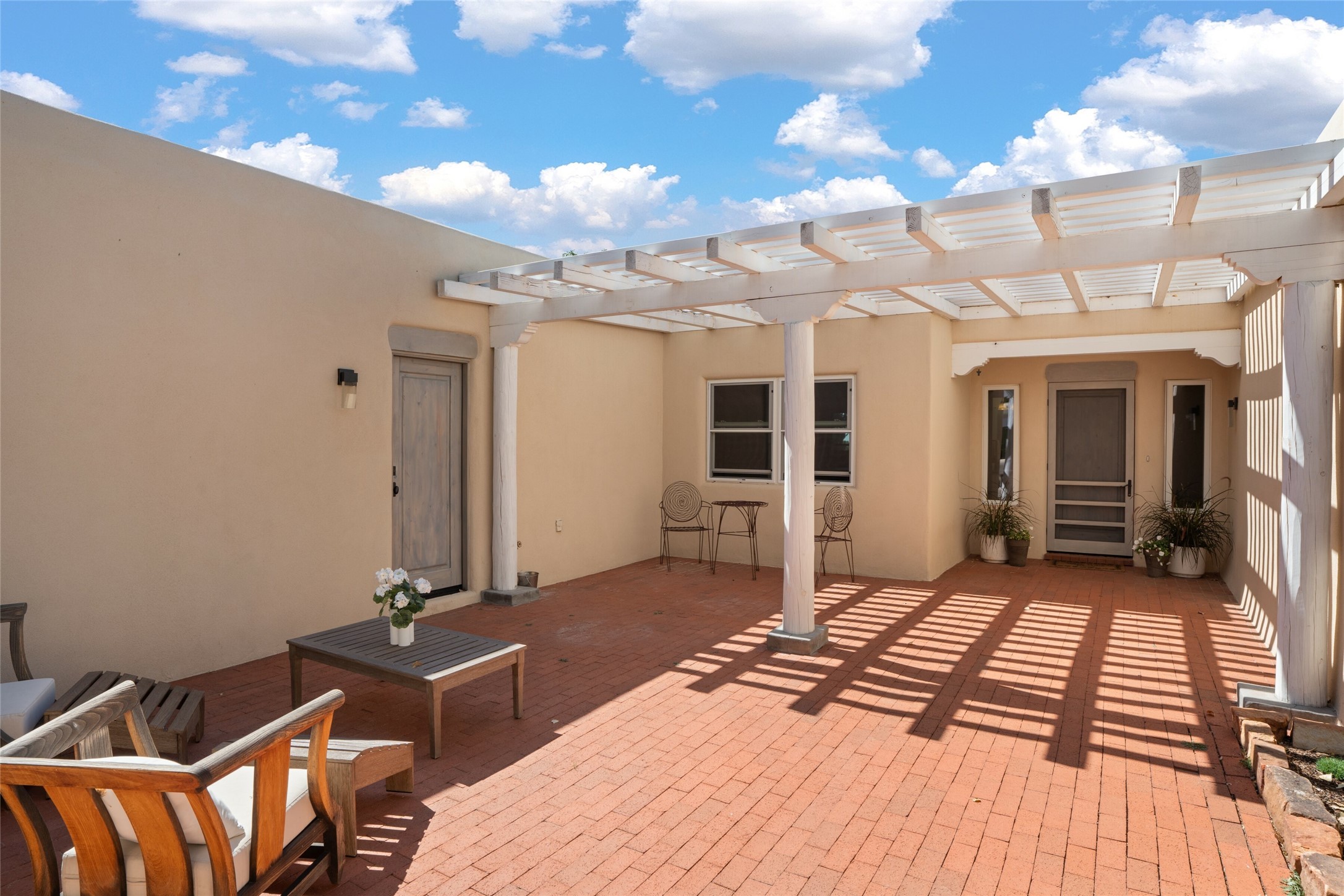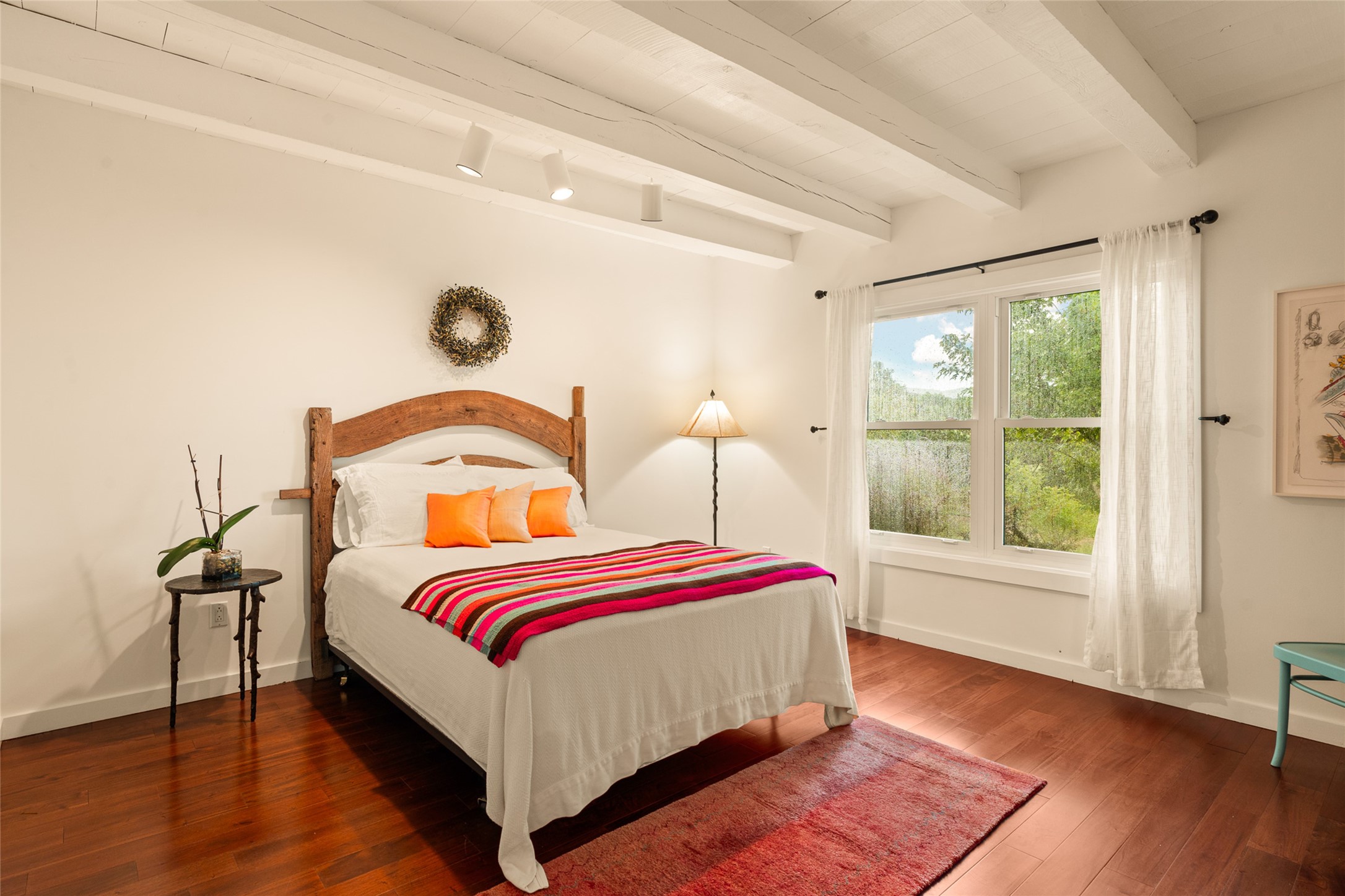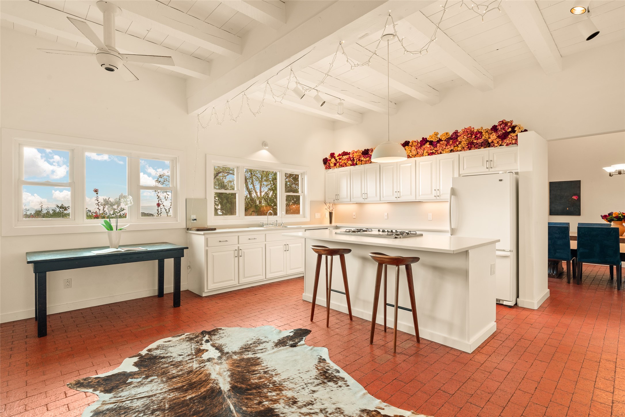 This timeless and sophisticated property is situated in a quiet and horse-friendly Santa Fe location just a short distance from the Arroyo Hondo Open Space trails and the famed Harry's Roadhouse restaurant. This 2,956 sq.ft. single-story constructed home has recently been completely updated and exudes a classic Santa Fe style surrounded by 6.041 acres of fenced, gated and usable land with wraparound views of the Sangre, Ortiz and Jemez mountains. Private sitting and entertaining spaces surround the home with lush, seasonal and mature landscaping, including fruit trees in the orchard. The home consists of a primary ensuite, two secondary bedrooms, 2.5 baths, and a separate office or flex room, all with classic bricked floors and whitewashed vigas throughout. The formal living/dining area's focal point is a gas burning fireplace. The updated kitchen features a large island, quartz countertops, walk-in pantry storage, and a sweet kiva fireplace with access to the covered patio. Functional amenities include radiant floor heat, on-demand hot water and mini-split AC/heating in the owners suite and office. A studio/workshop/3rd bay garage is adjacent to the deep 2-car attached garage. A nearby concrete pad has electricity stubbed-in, ideal for a future barn or casita. Completely updated (including roof, stucco, windows, mechanicals, and a new gas stove in the island) and perfectly maintained, this is a property not to be missed in an idyllic Santa Fe location.