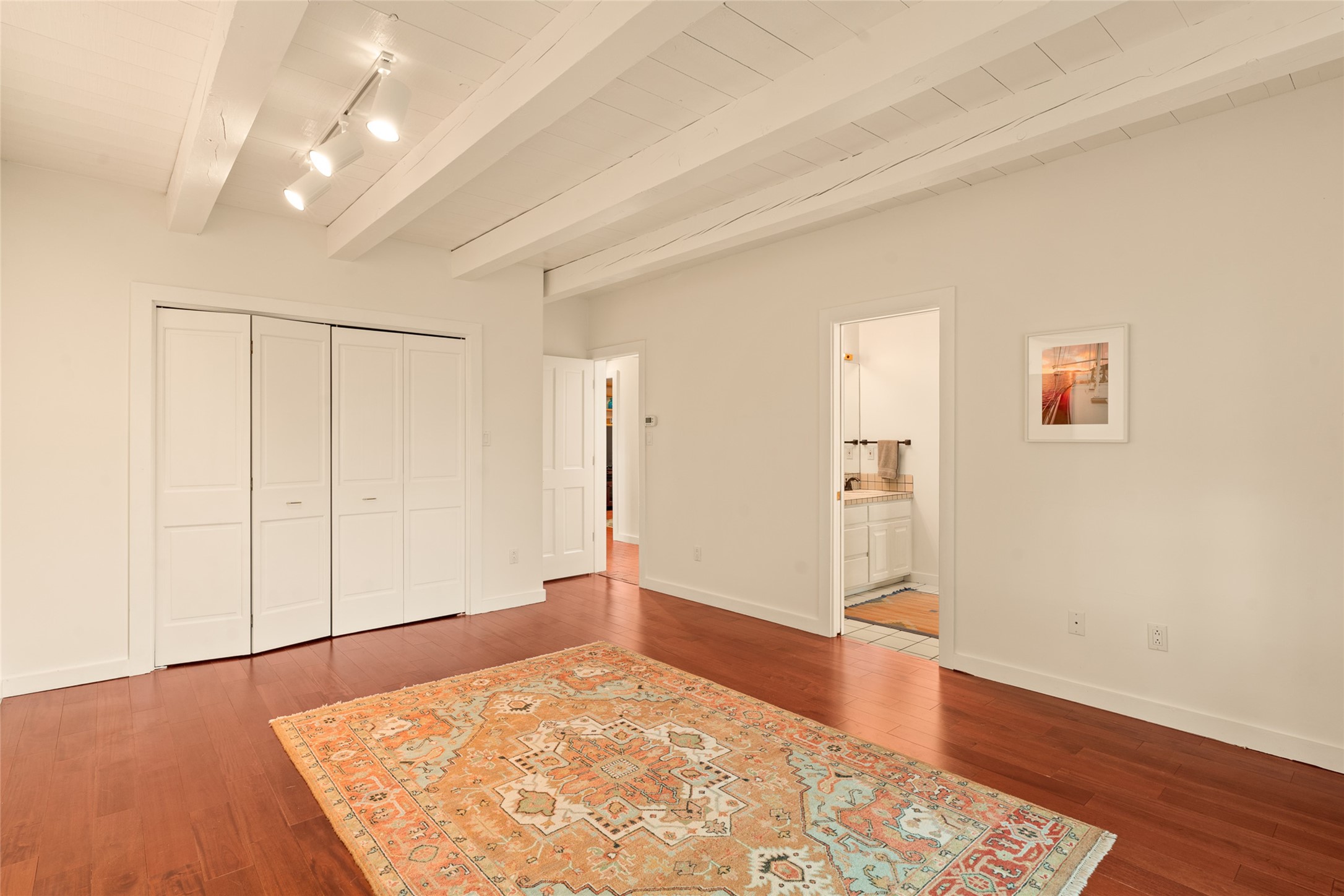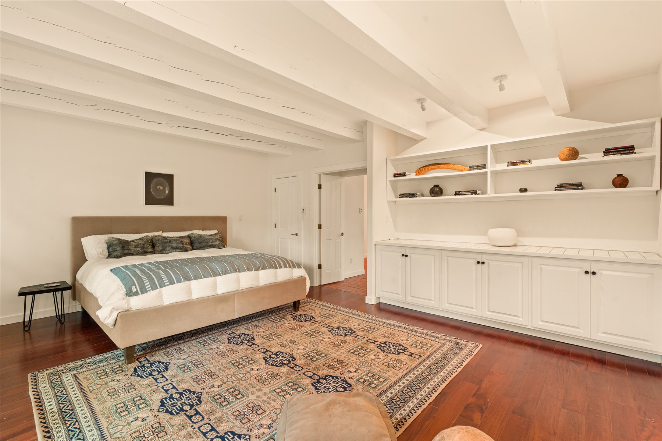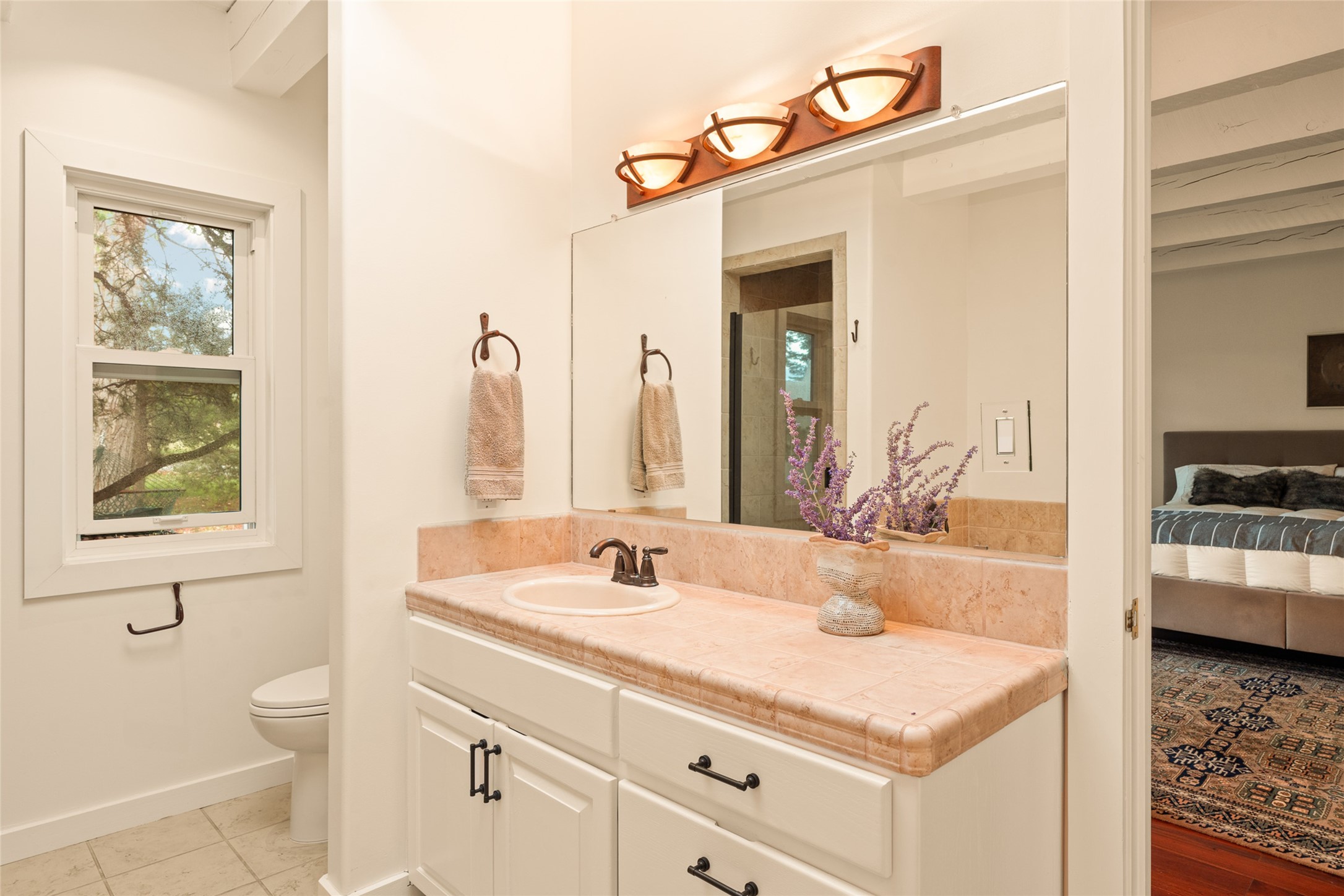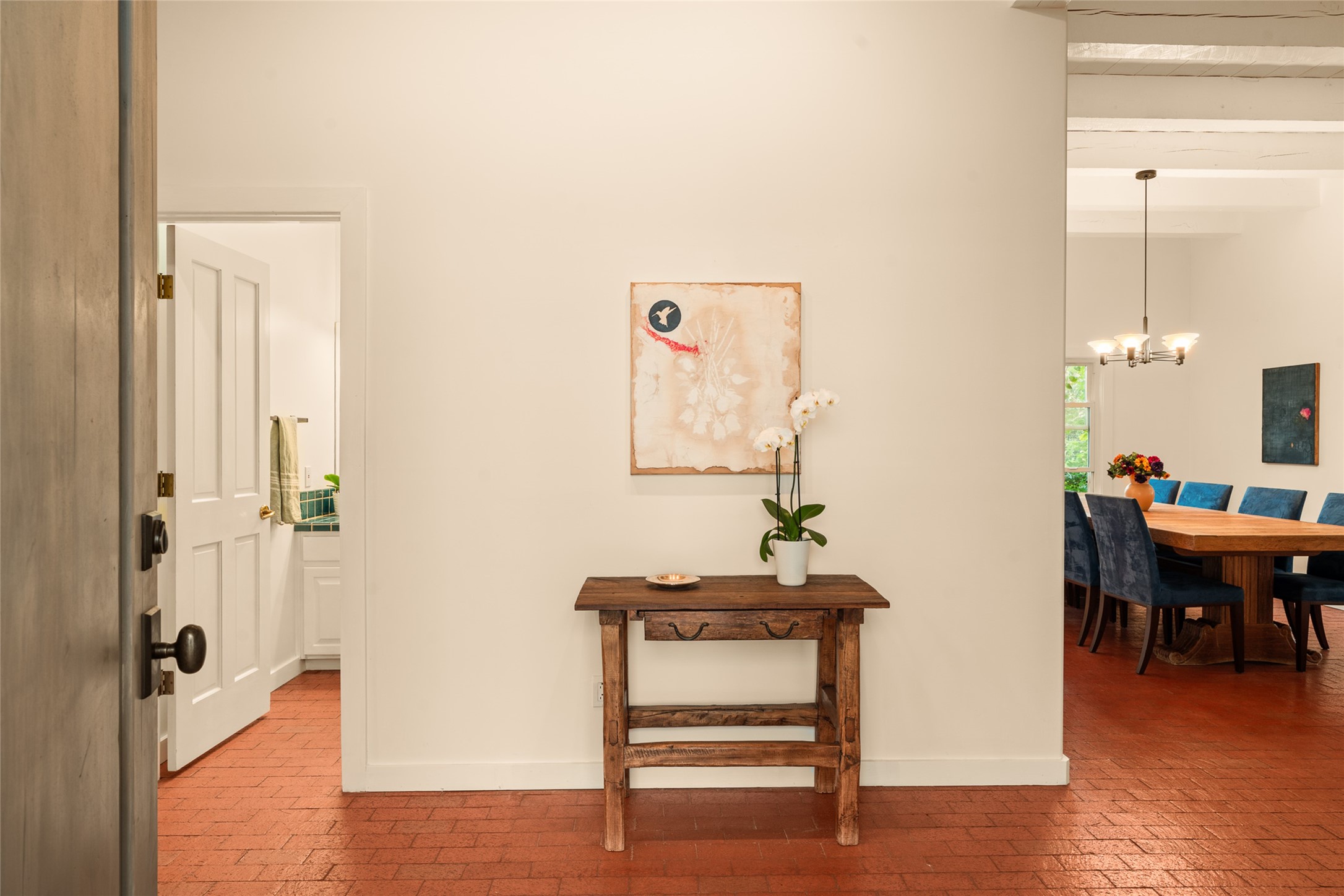 This timeless and sophisticated property is situated in a quiet and horse-friendly Santa Fe location just a short distance from the Arroyo Hondo Open Space trails and the famed Harry's Roadhouse restaurant. This 2,956 sq.ft. single-story constructed home has recently been completely updated and exudes a classic Santa Fe style surrounded by 6.041 acres of fenced, gated and usable land with wraparound views of the Sangre, Ortiz and Jemez mountains. Private sitting and entertaining spaces surround the home with lush, seasonal and mature landscaping, including fruit trees in the orchard. The home consists of a primary ensuite, two secondary bedrooms, 2.5 baths, and a separate office or flex room, all with classic bricked floors and whitewashed vigas throughout. The formal living/dining area's focal point is a gas burning fireplace. The updated kitchen features a large island, quartz countertops, walk-in pantry storage, and a sweet kiva fireplace with access to the covered patio. Functional amenities include radiant floor heat, on-demand hot water and mini-split AC/heating in the owners suite and office. A studio/workshop/3rd bay garage is adjacent to the deep 2-car attached garage. A nearby concrete pad has electricity stubbed-in, ideal for a future barn or casita. Completely updated (including roof, stucco, windows, mechanicals, and a new gas stove in the island) and perfectly maintained, this is a property not to be missed in an idyllic Santa Fe location.