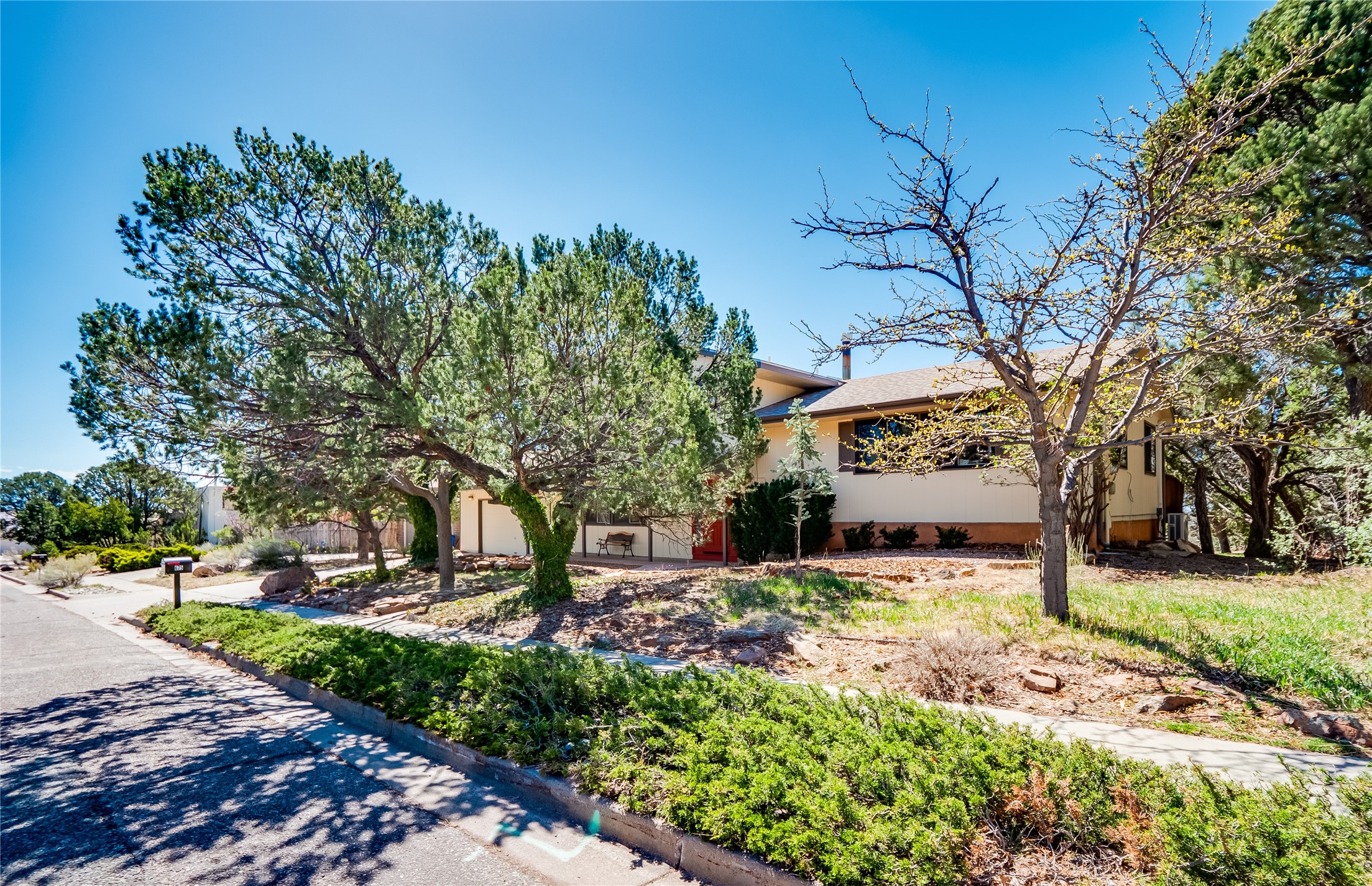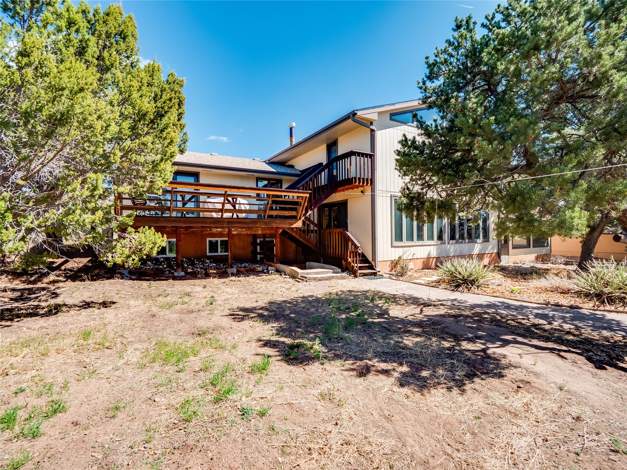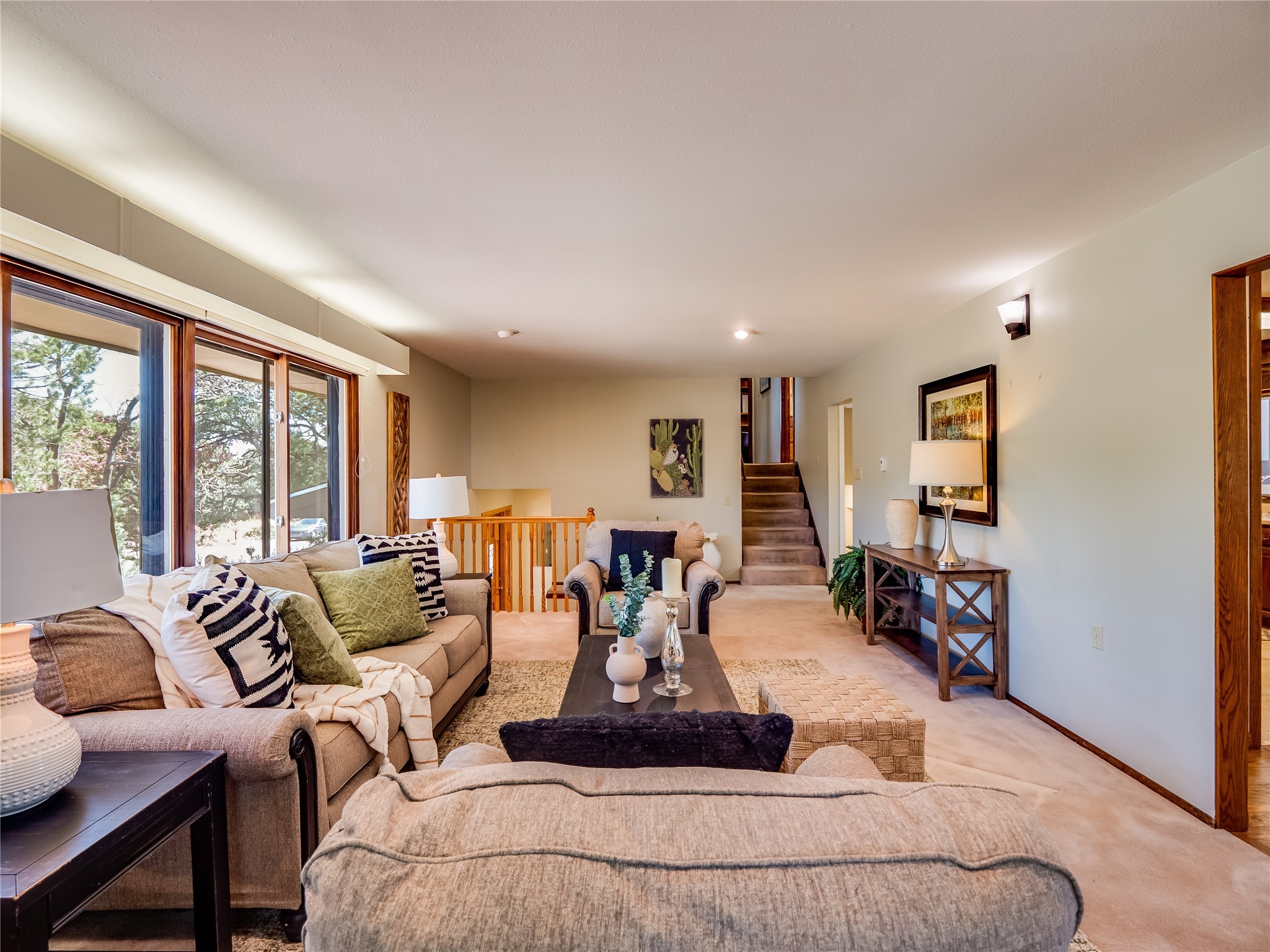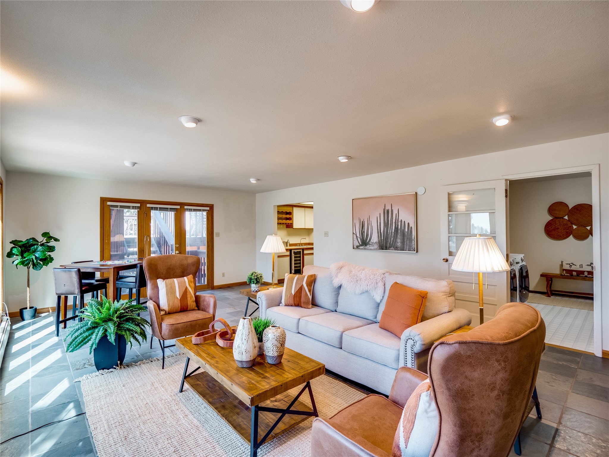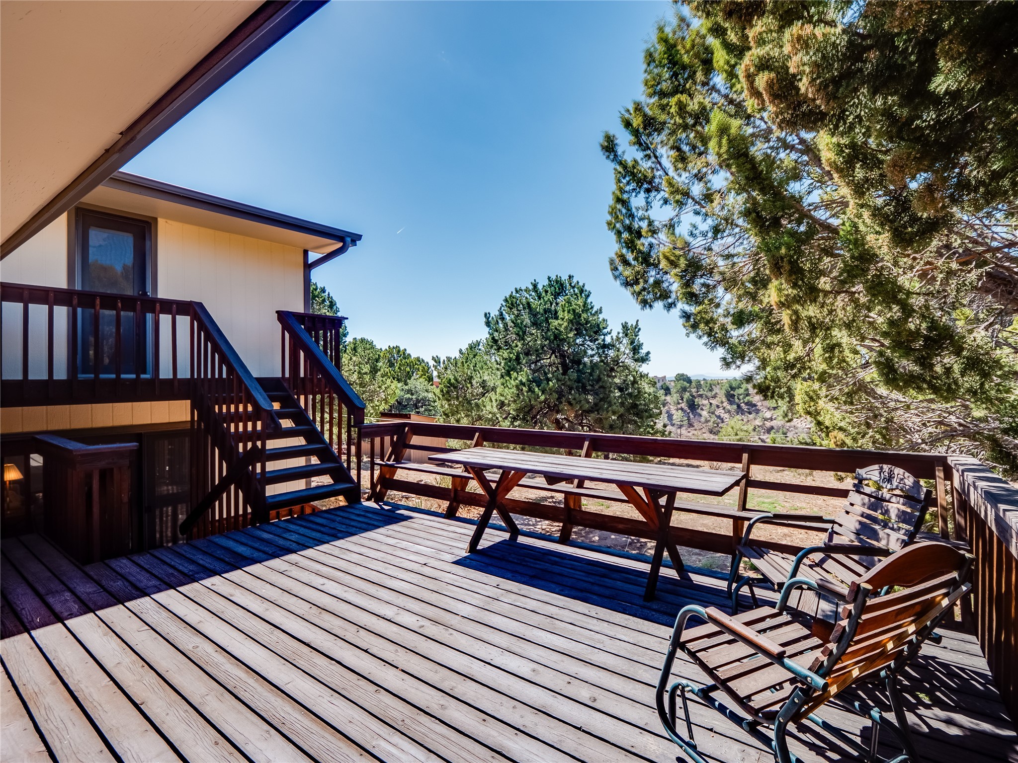Tucked into the canyon edge, this stunning multi-level custom home offers breathtaking views, unique features, and a flexible layout ideal for entertaining or a quiet retreat. With beautiful curb appeal, the home is framed by mature landscaping and towering trees. Step into the welcoming foyer and head up to a spacious, sun-filled living room with plush carpet and large windows that flood the space with natural light. The connected open dining room has sliding glass doors to the back deck--perfect for BBQing. The kitchen is both functional and stylish, featuring wood cabinetry, a peninsula island with bar seating and under-storage, stainless steel appliances, hard surface counters, tile backsplash, and tile flooring throughout. A few steps down, you'll find a wet bar that flows into the bright family room, where a wall of windows captures the beauty of the backyard and canyon beyond. French doors open to the back deck, while a wood fireplace adds warmth and charm. This level also features a spacious guest bedroom and a guest bath with a double sink vanity and a walk-in shower. Down the hall, the laundry room offers access to the garage and a spiral staircase leading to the top floor. There's an indoor spa room with a tranquil pond. Upstairs, you'll find two additional guest bedrooms, a full guest bathroom, and a luxurious primary en-suite. The primary bedroom is a true retreat with vaulted beamed ceilings, a wall of windows, a private deck, and direct access to the main deck. Enjoy two large walk-in closets with built-in organizers and a spa-like bathroom with a double sink vanity, an additional single vanity, and a tiled walk-in shower with dual shower heads. The basement adds even more space, with a kitchenette and an additional 728 sq ft not included in the total square footage. The large backyard boasts canyon views, built-in bench seating on the deck, and room to relax or entertain. With views, ample storage, and charm, Don't miss this one-of-a-kind canyon home!