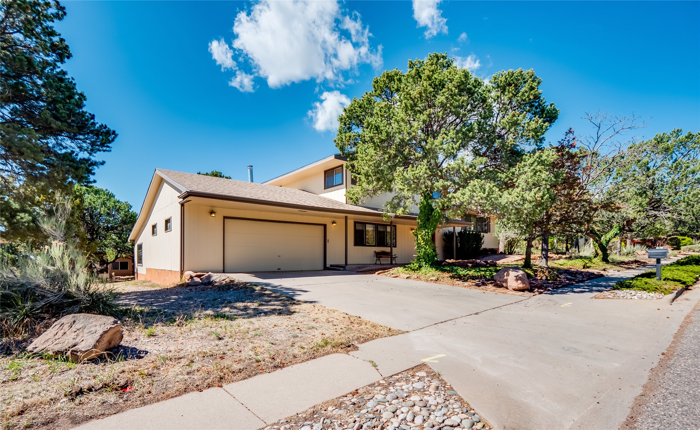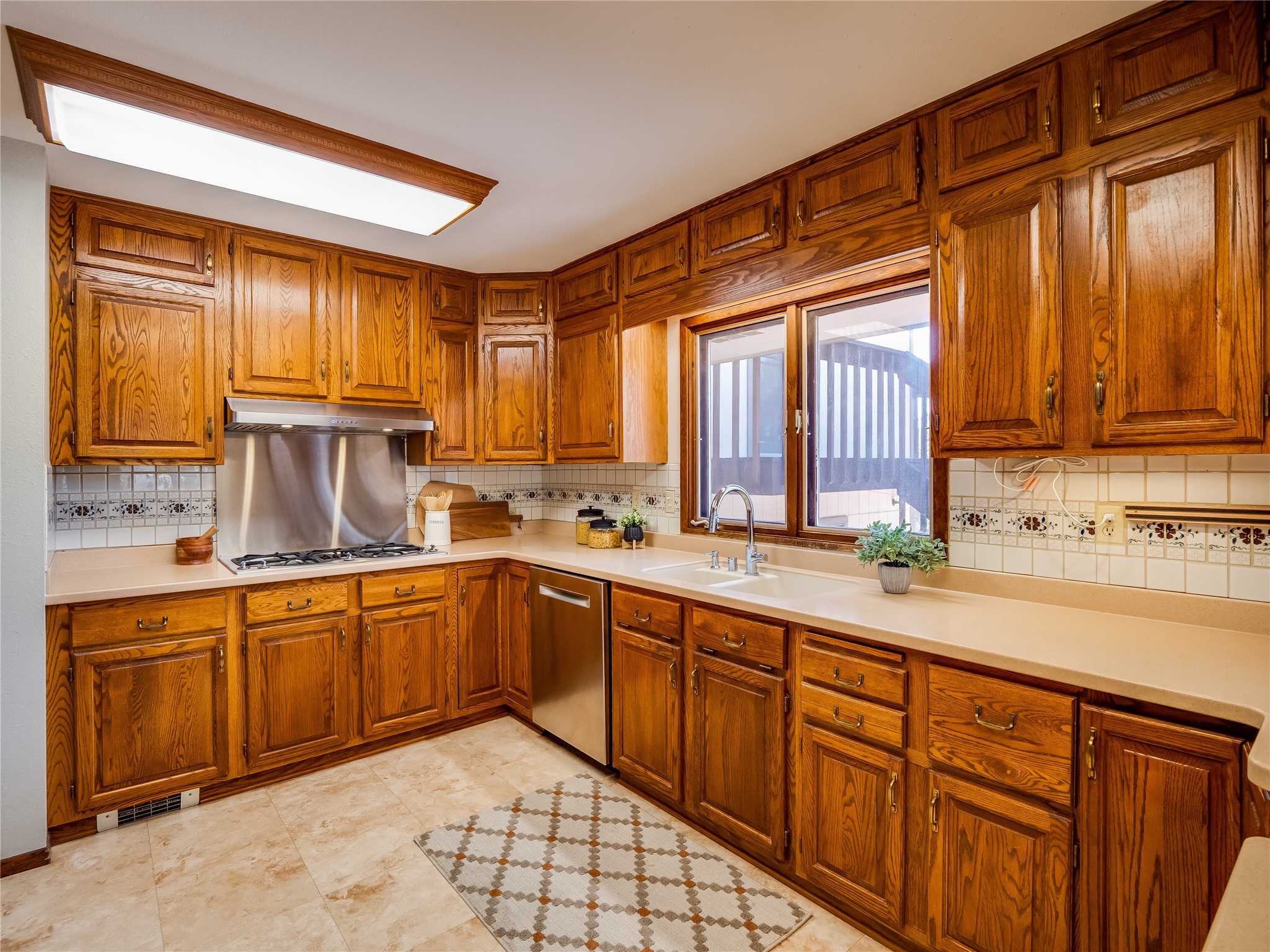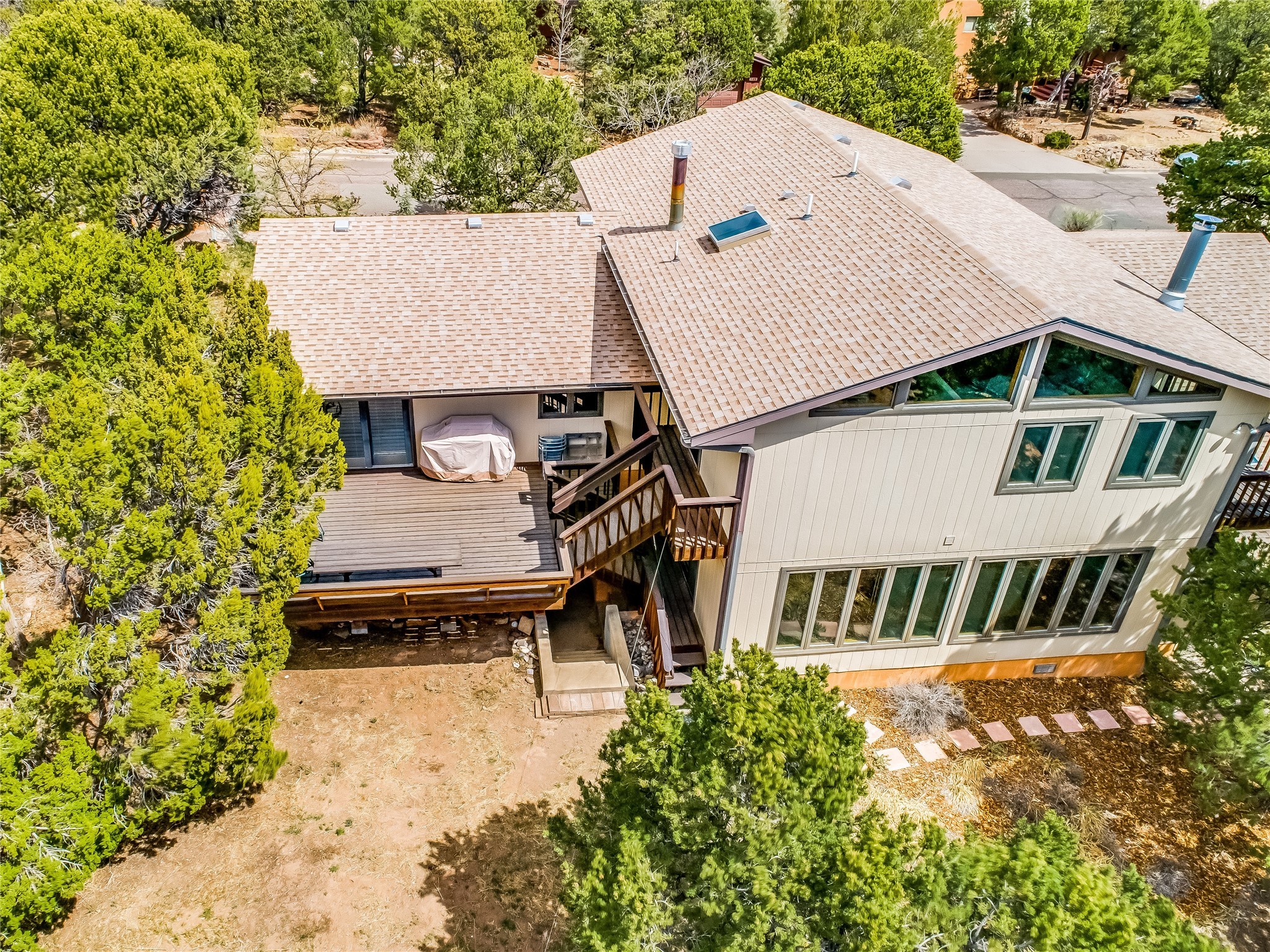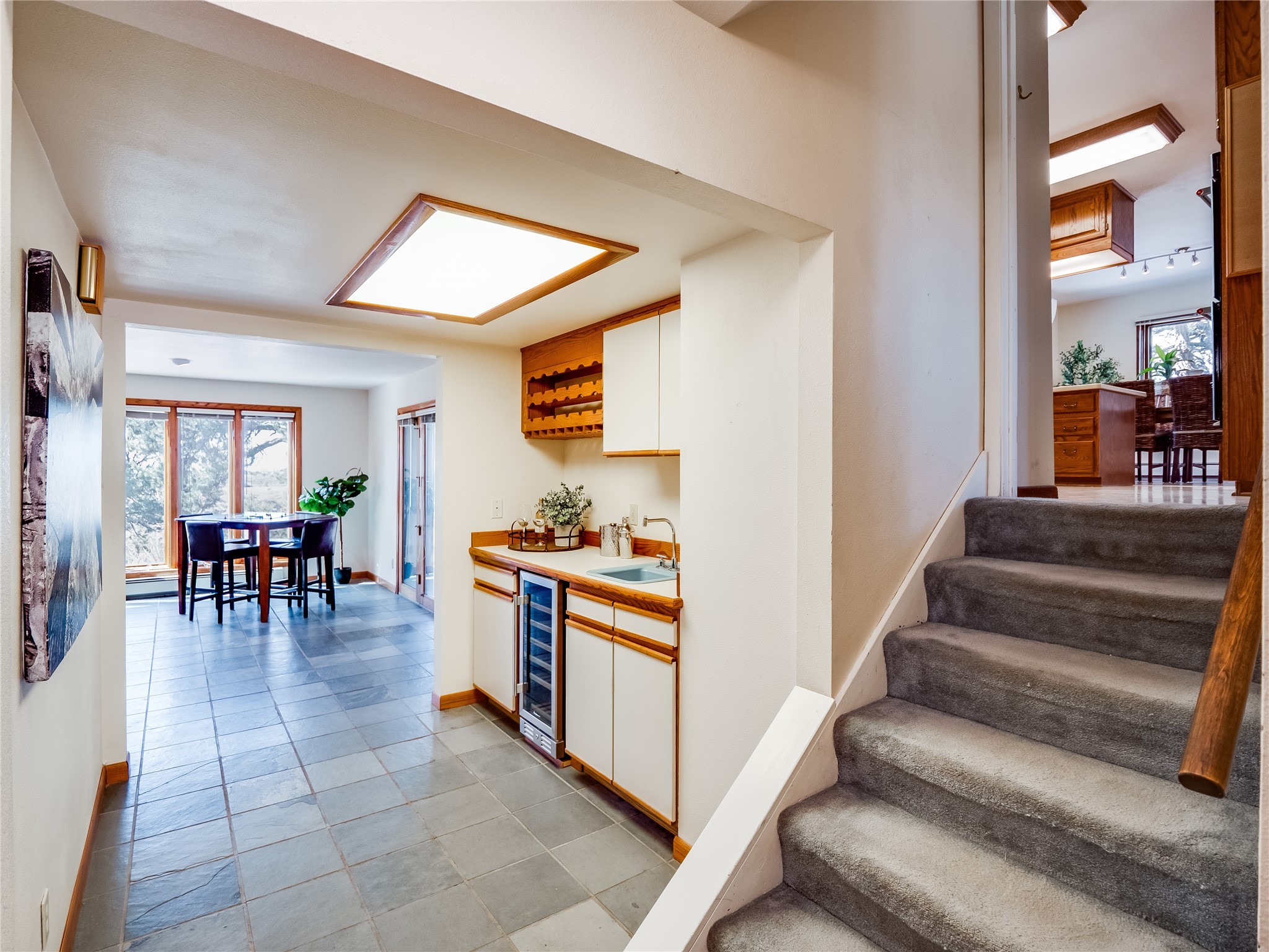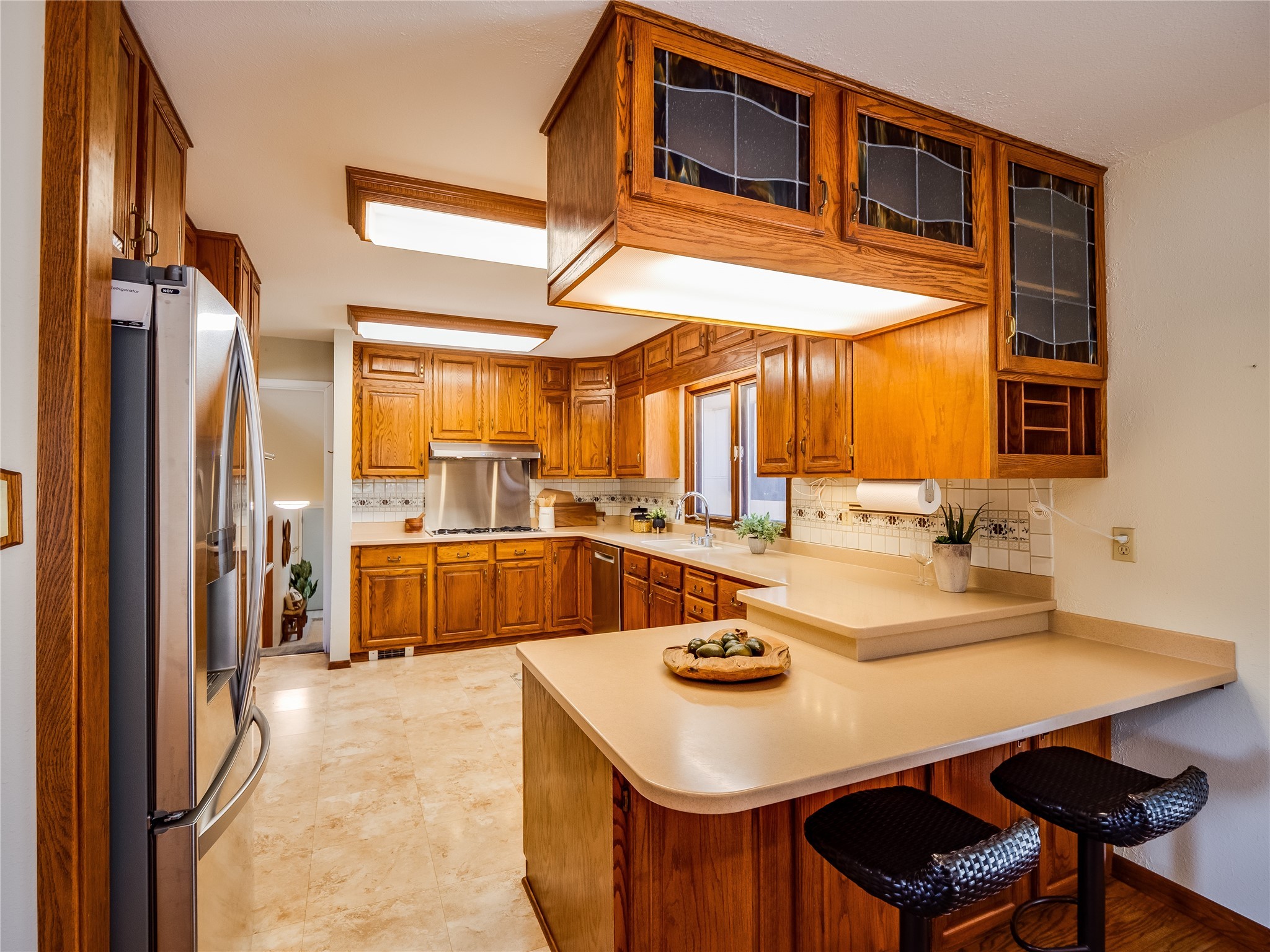 Tucked into the canyon edge, this stunning multi-level custom home offers breathtaking views, unique features, and a flexible layout ideal for entertaining or a quiet retreat. With beautiful curb appeal, the home is framed by mature landscaping and towering trees. Step into the welcoming foyer and head up to a spacious, sun-filled living room with plush carpet and large windows that flood the space with natural light. The connected open dining room has sliding glass doors to the back deck--perfect for BBQing. The kitchen is both functional and stylish, featuring wood cabinetry, a peninsula island with bar seating and under-storage, stainless steel appliances, hard surface counters, tile backsplash, and tile flooring throughout. A few steps down, you'll find a wet bar that flows into the bright family room, where a wall of windows captures the beauty of the backyard and canyon beyond. French doors open to the back deck, while a wood fireplace adds warmth and charm. This level also features a spacious guest bedroom and a guest bath with a double sink vanity and a walk-in shower. Down the hall, the laundry room offers access to the garage and a spiral staircase leading to the top floor. There's an indoor spa room with a tranquil pond. Upstairs, you'll find two additional guest bedrooms, a full guest bathroom, and a luxurious primary en-suite. The primary bedroom is a true retreat with vaulted beamed ceilings, a wall of windows, a private deck, and direct access to the main deck. Enjoy two large walk-in closets with built-in organizers and a spa-like bathroom with a double sink vanity, an additional single vanity, and a tiled walk-in shower with dual shower heads. The basement adds even more space, with a kitchenette and an additional 728 sq ft not included in the total square footage. The large backyard boasts canyon views, built-in bench seating on the deck, and room to relax or entertain. With views, ample storage, and charm, Don't miss this one-of-a-kind canyon home!
