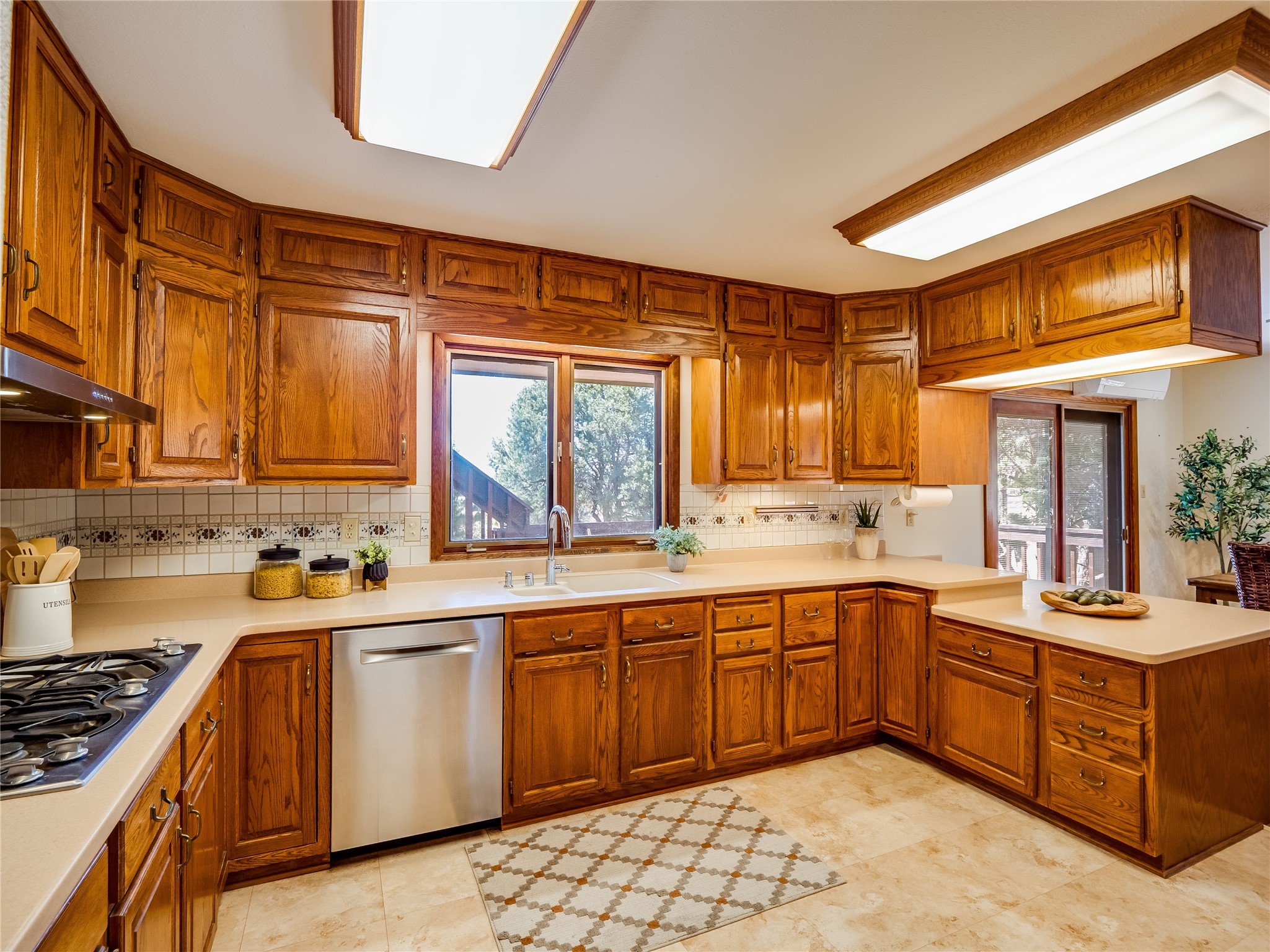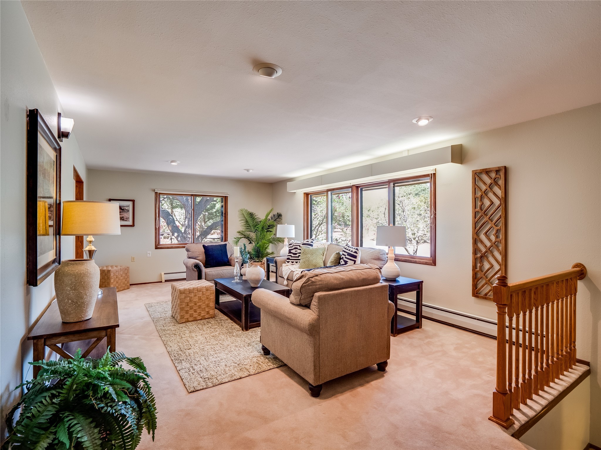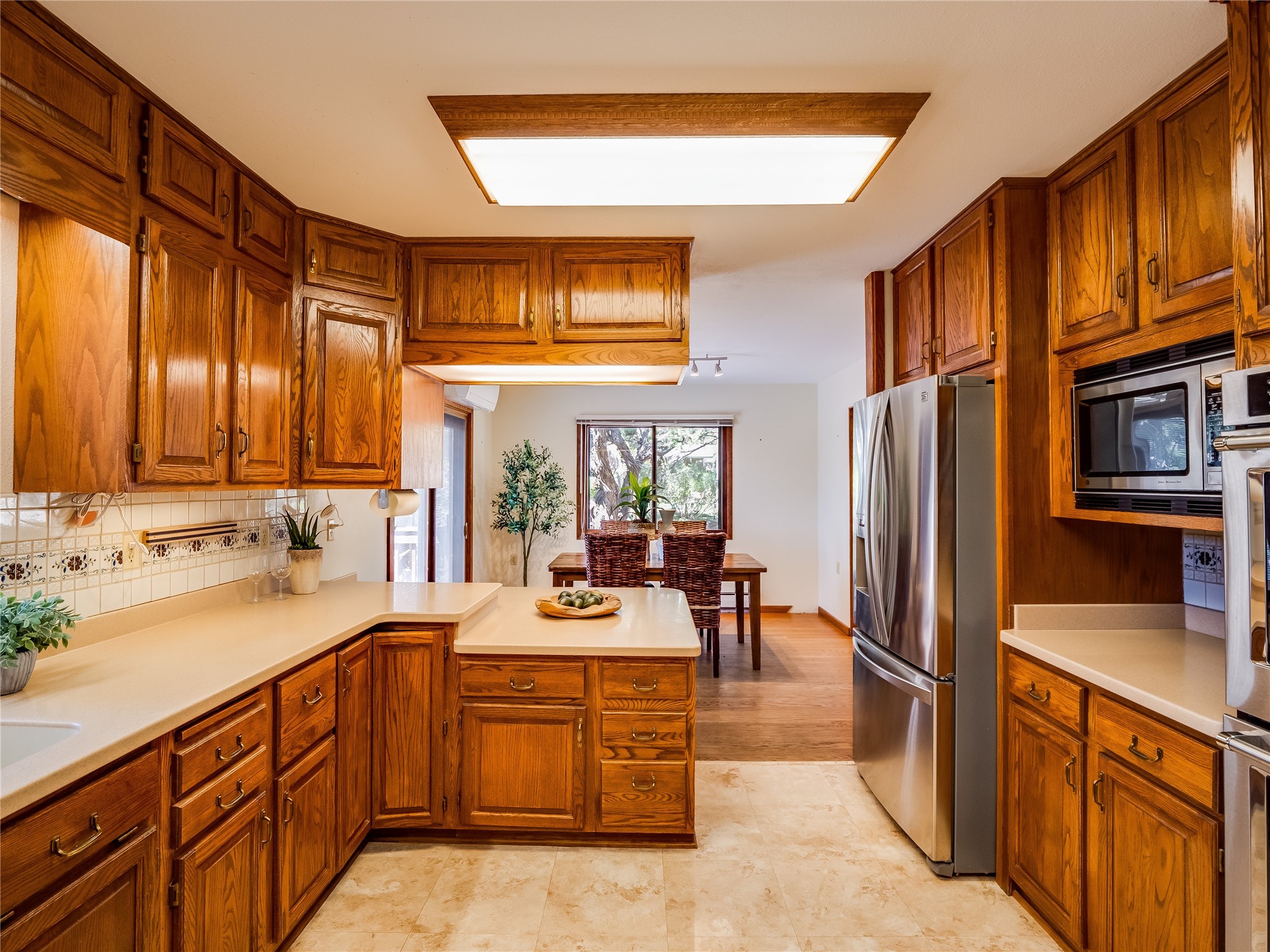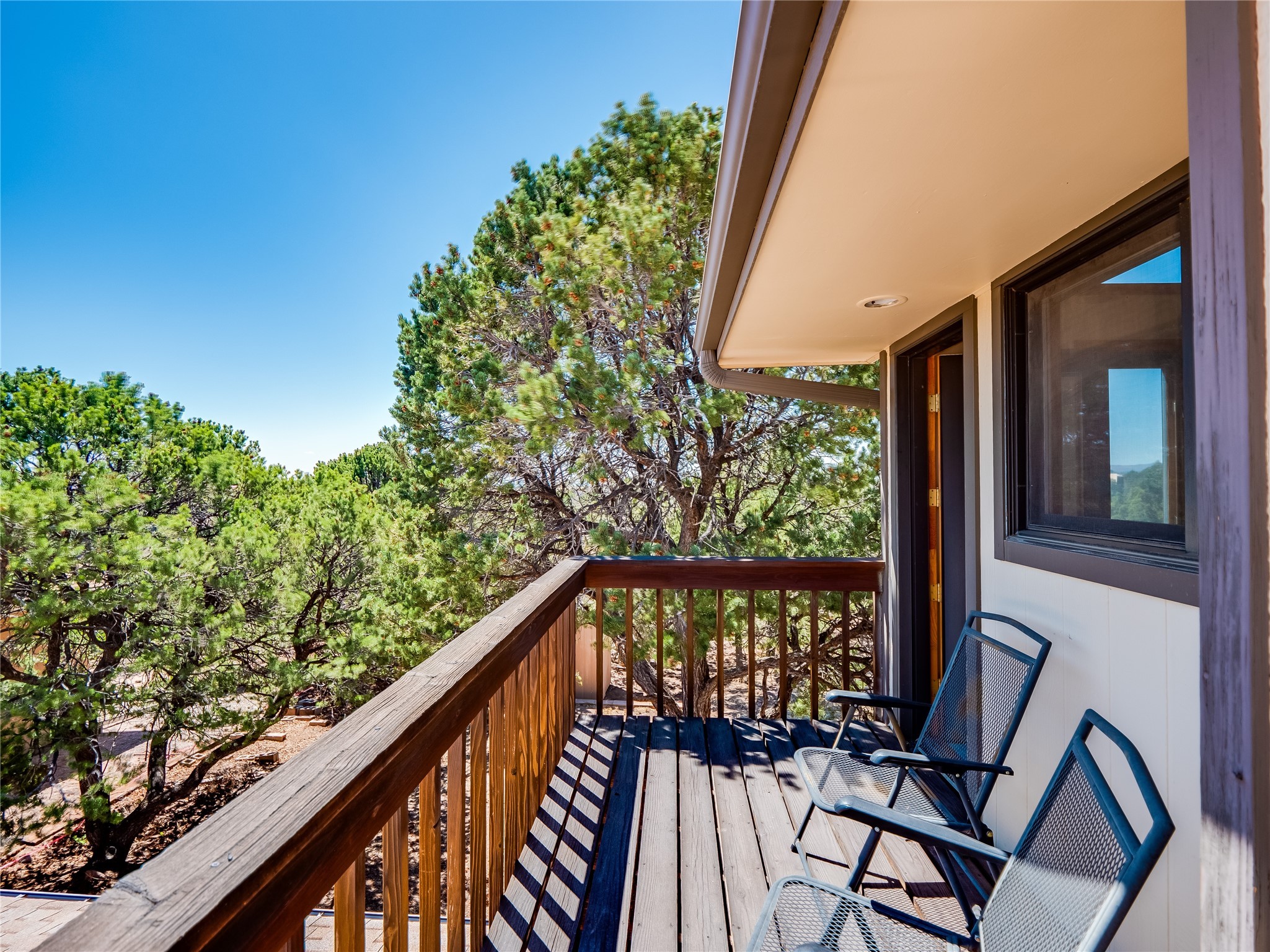 Tucked into the canyon edge, this stunning multi-level custom home offers breathtaking views, unique features, and a flexible layout ideal for entertaining or a quiet retreat. With beautiful curb appeal, the home is framed by mature landscaping and towering trees. Step into the welcoming foyer and head up to a spacious, sun-filled living room with plush carpet and large windows that flood the space with natural light. The connected open dining room has sliding glass doors to the back deck--perfect for BBQing. The kitchen is both functional and stylish, featuring wood cabinetry, a peninsula island with bar seating and under-storage, stainless steel appliances, hard surface counters, tile backsplash, and tile flooring throughout. A few steps down, you'll find a wet bar that flows into the bright family room, where a wall of windows captures the beauty of the backyard and canyon beyond. French doors open to the back deck, while a wood fireplace adds warmth and charm. This level also features a spacious guest bedroom and a guest bath with a double sink vanity and a walk-in shower. Down the hall, the laundry room offers access to the garage and a spiral staircase leading to the top floor. There's an indoor spa room with a tranquil pond. Upstairs, you'll find two additional guest bedrooms, a full guest bathroom, and a luxurious primary en-suite. The primary bedroom is a true retreat with vaulted beamed ceilings, a wall of windows, a private deck, and direct access to the main deck. Enjoy two large walk-in closets with built-in organizers and a spa-like bathroom with a double sink vanity, an additional single vanity, and a tiled walk-in shower with dual shower heads. The basement adds even more space, with a kitchenette and an additional 728 sq ft not included in the total square footage. The large backyard boasts canyon views, built-in bench seating on the deck, and room to relax or entertain. With views, ample storage, and charm, Don't miss this one-of-a-kind canyon home!