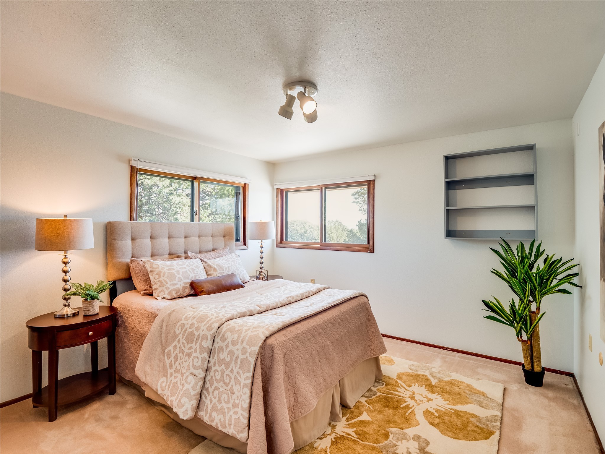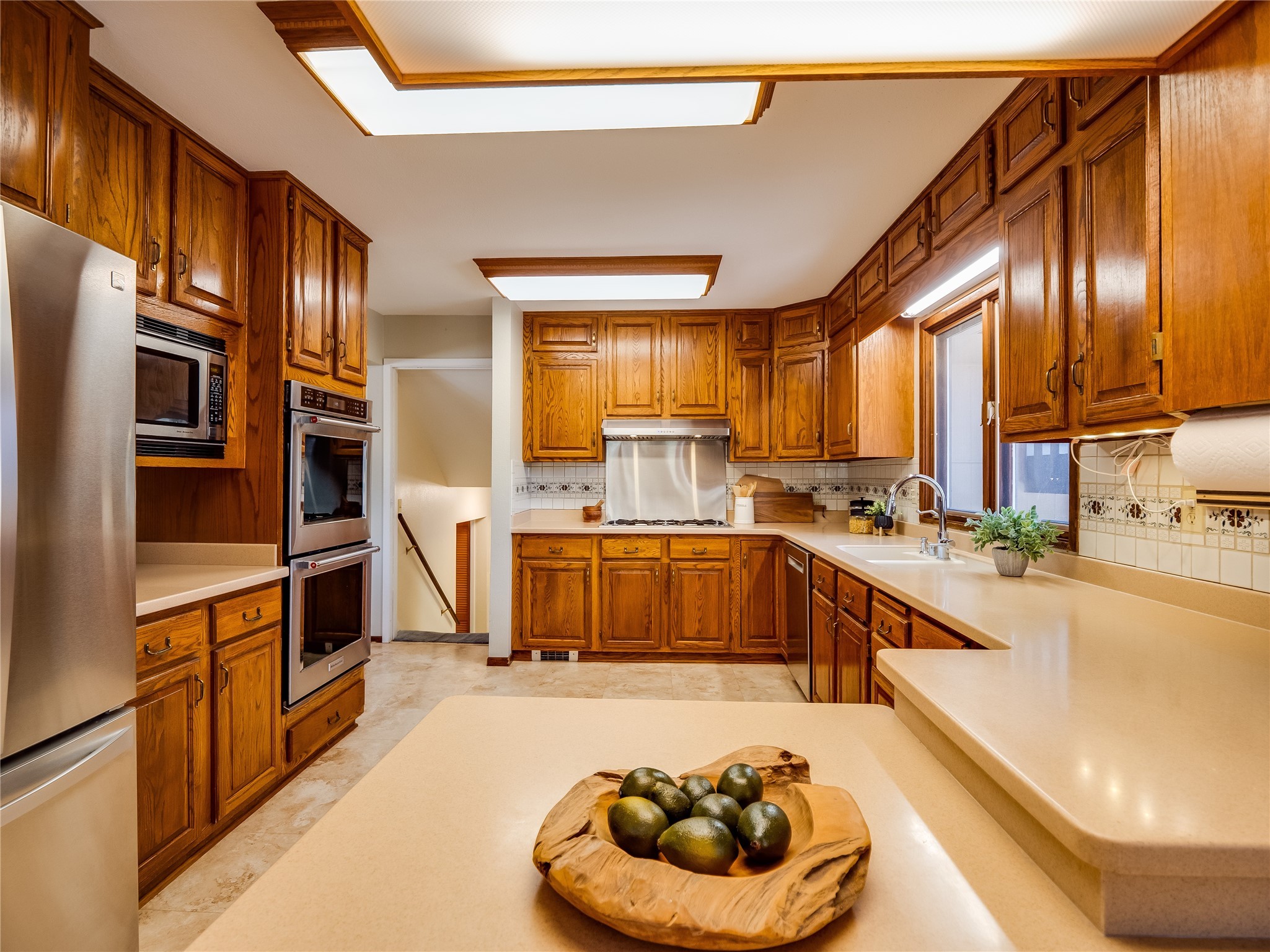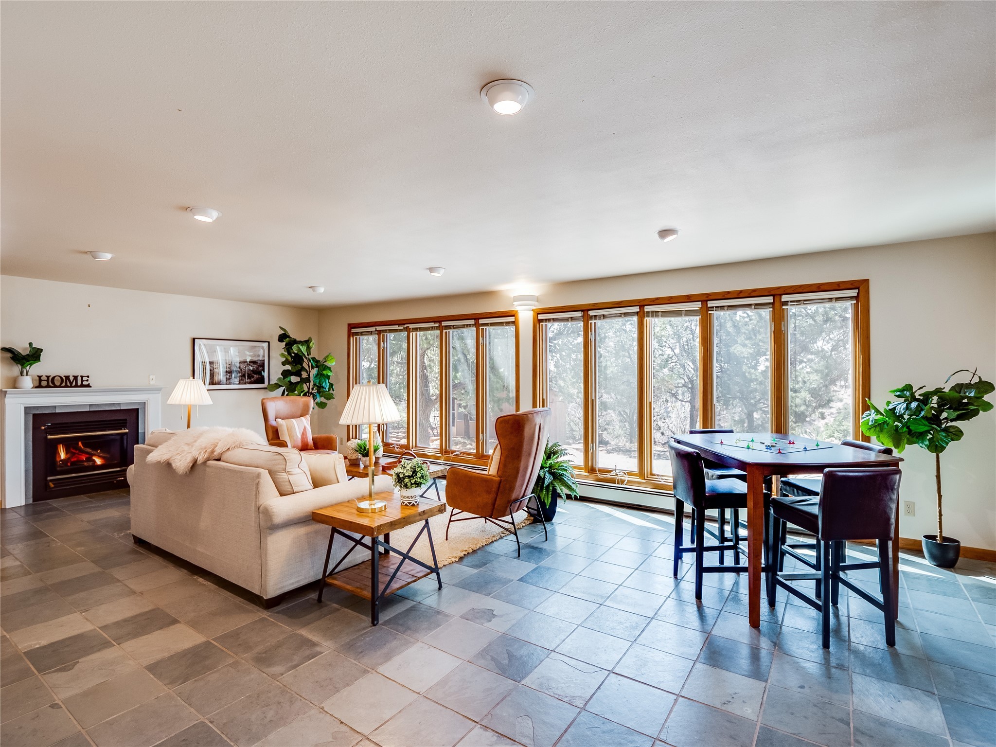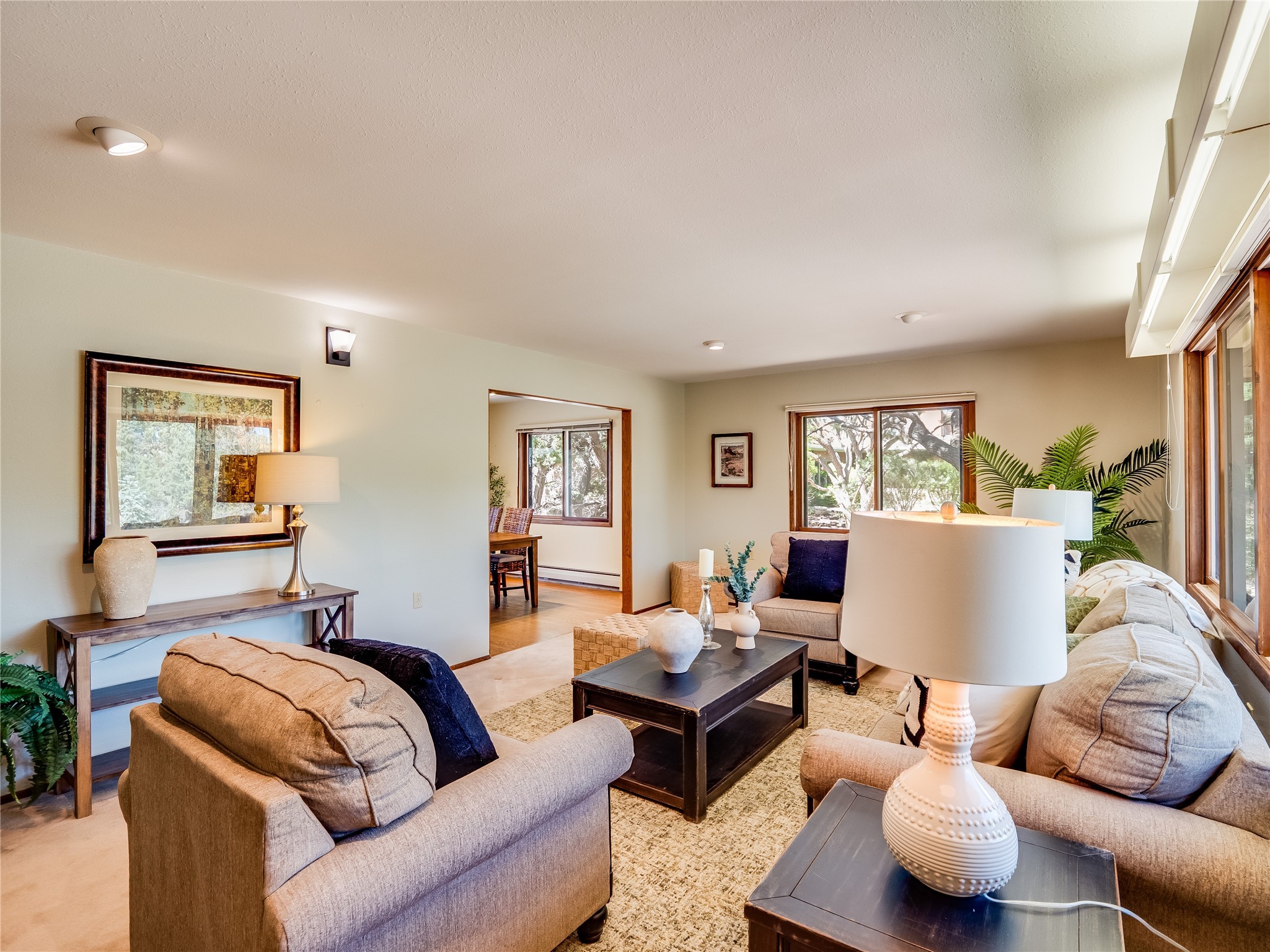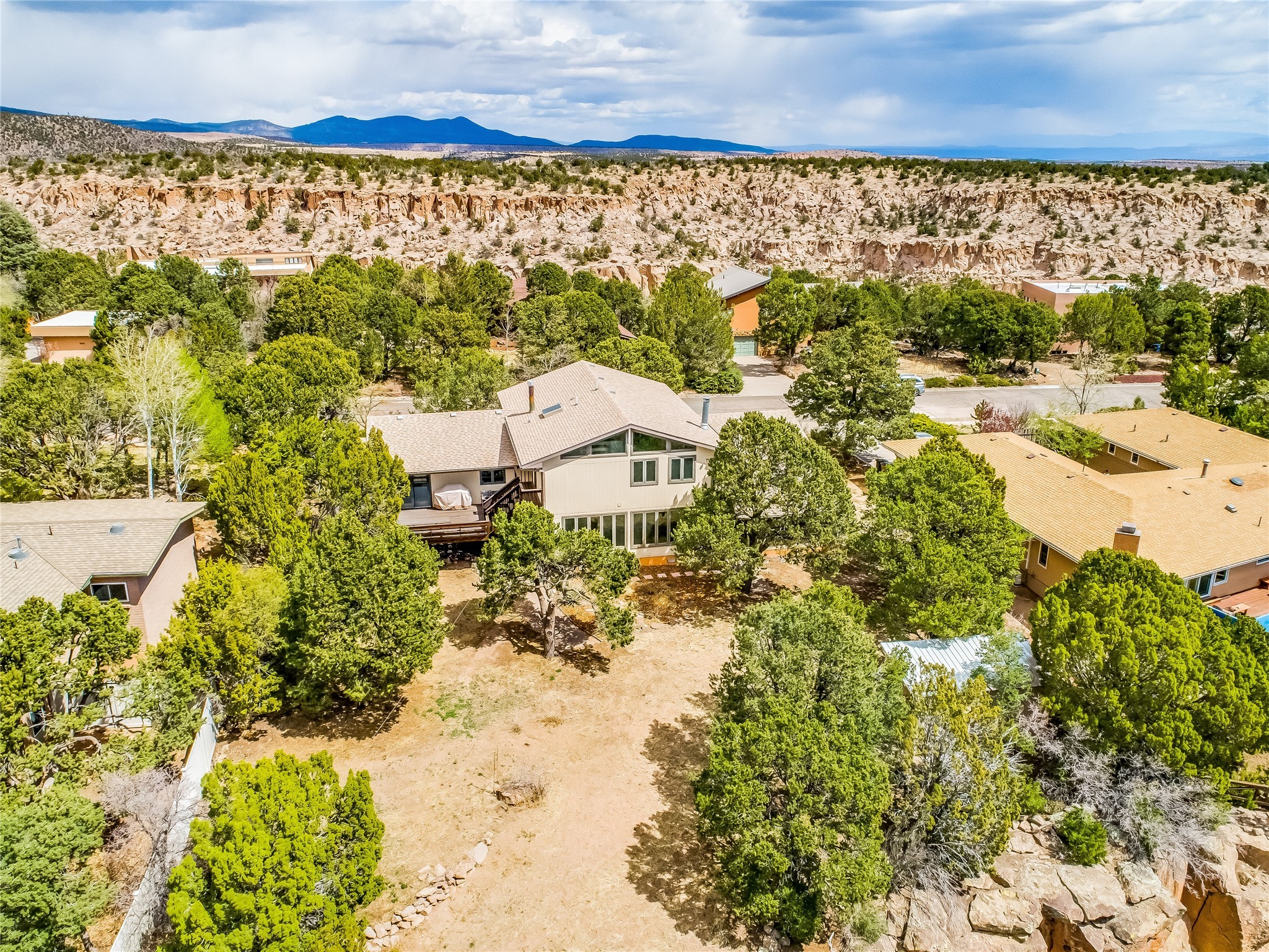 Tucked into the canyon edge, this stunning multi-level custom home offers breathtaking views, unique features, and a flexible layout ideal for entertaining or a quiet retreat. With beautiful curb appeal, the home is framed by mature landscaping and towering trees. Step into the welcoming foyer and head up to a spacious, sun-filled living room with plush carpet and large windows that flood the space with natural light. The connected open dining room has sliding glass doors to the back deck--perfect for BBQing. The kitchen is both functional and stylish, featuring wood cabinetry, a peninsula island with bar seating and under-storage, stainless steel appliances, hard surface counters, tile backsplash, and tile flooring throughout. A few steps down, you'll find a wet bar that flows into the bright family room, where a wall of windows captures the beauty of the backyard and canyon beyond. French doors open to the back deck, while a wood fireplace adds warmth and charm. This level also features a spacious guest bedroom and a guest bath with a double sink vanity and a walk-in shower. Down the hall, the laundry room offers access to the garage and a spiral staircase leading to the top floor. There's an indoor spa room with a tranquil pond. Upstairs, you'll find two additional guest bedrooms, a full guest bathroom, and a luxurious primary en-suite. The primary bedroom is a true retreat with vaulted beamed ceilings, a wall of windows, a private deck, and direct access to the main deck. Enjoy two large walk-in closets with built-in organizers and a spa-like bathroom with a double sink vanity, an additional single vanity, and a tiled walk-in shower with dual shower heads. The basement adds even more space, with a kitchenette and an additional 728 sq ft not included in the total square footage. The large backyard boasts canyon views, built-in bench seating on the deck, and room to relax or entertain. With views, ample storage, and charm, Don't miss this one-of-a-kind canyon home!