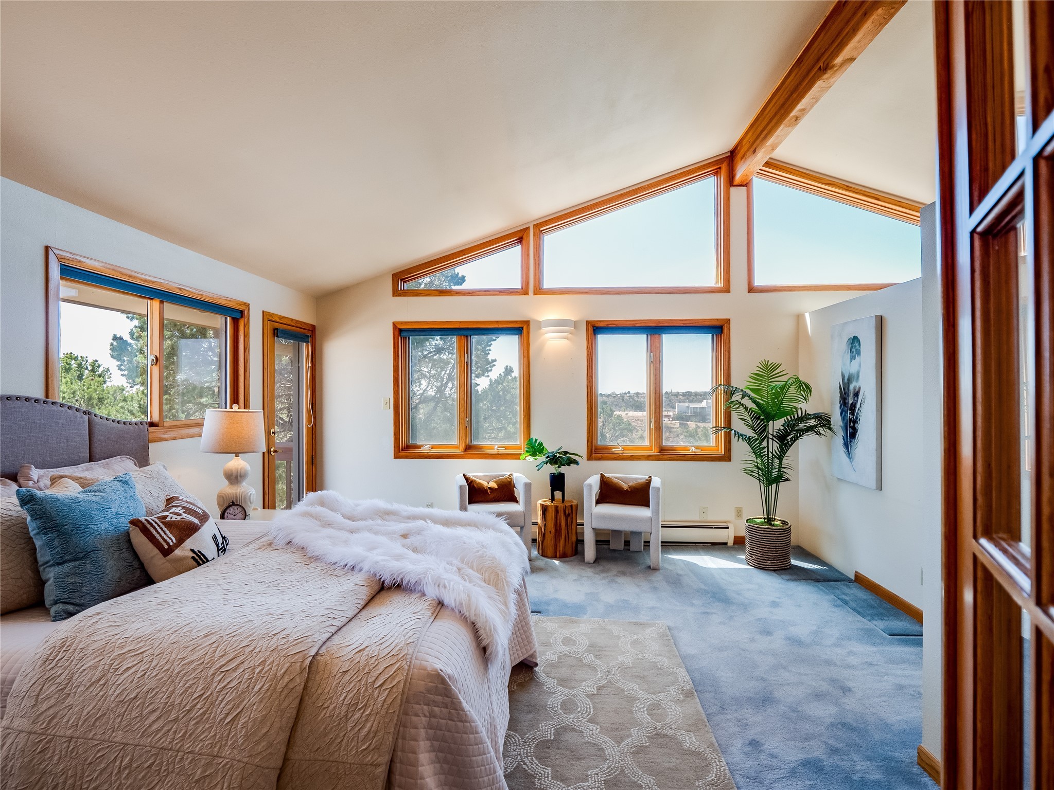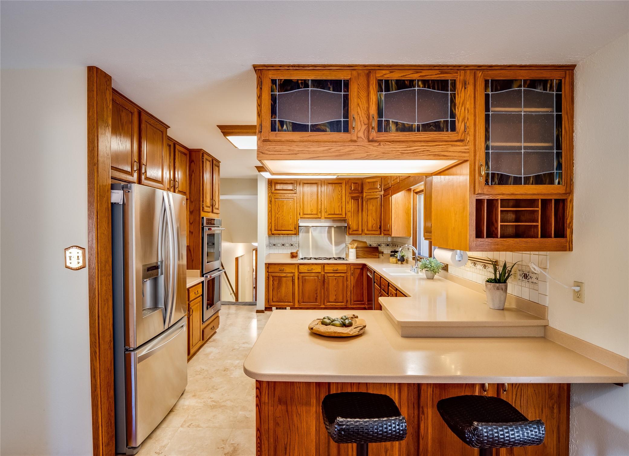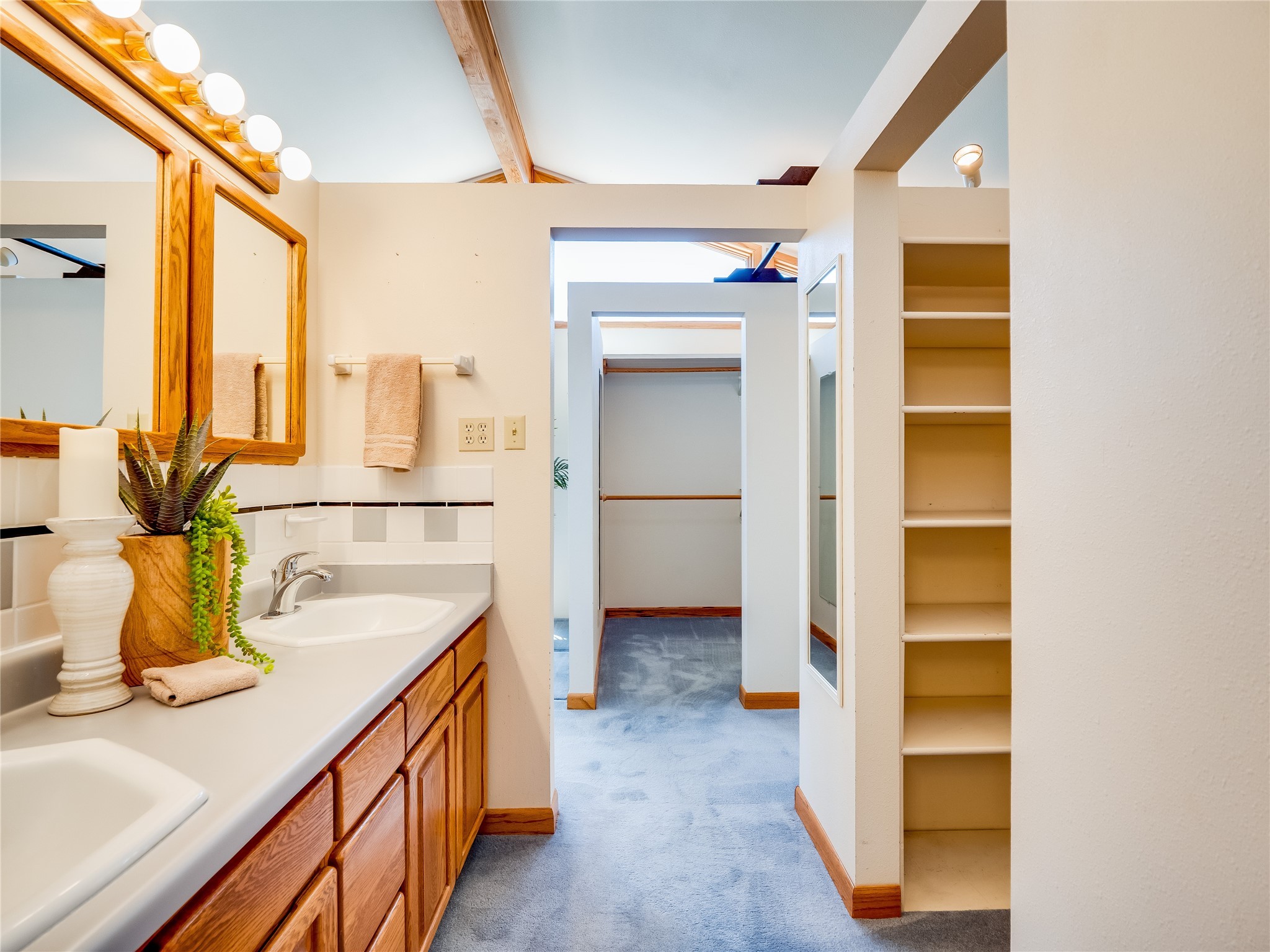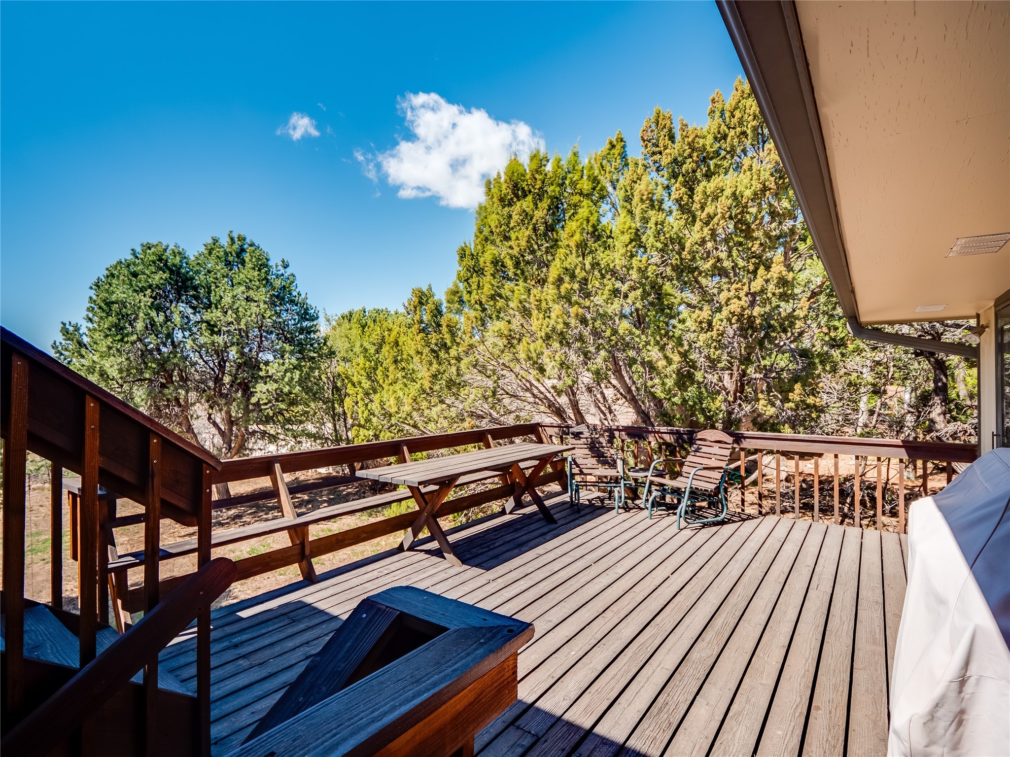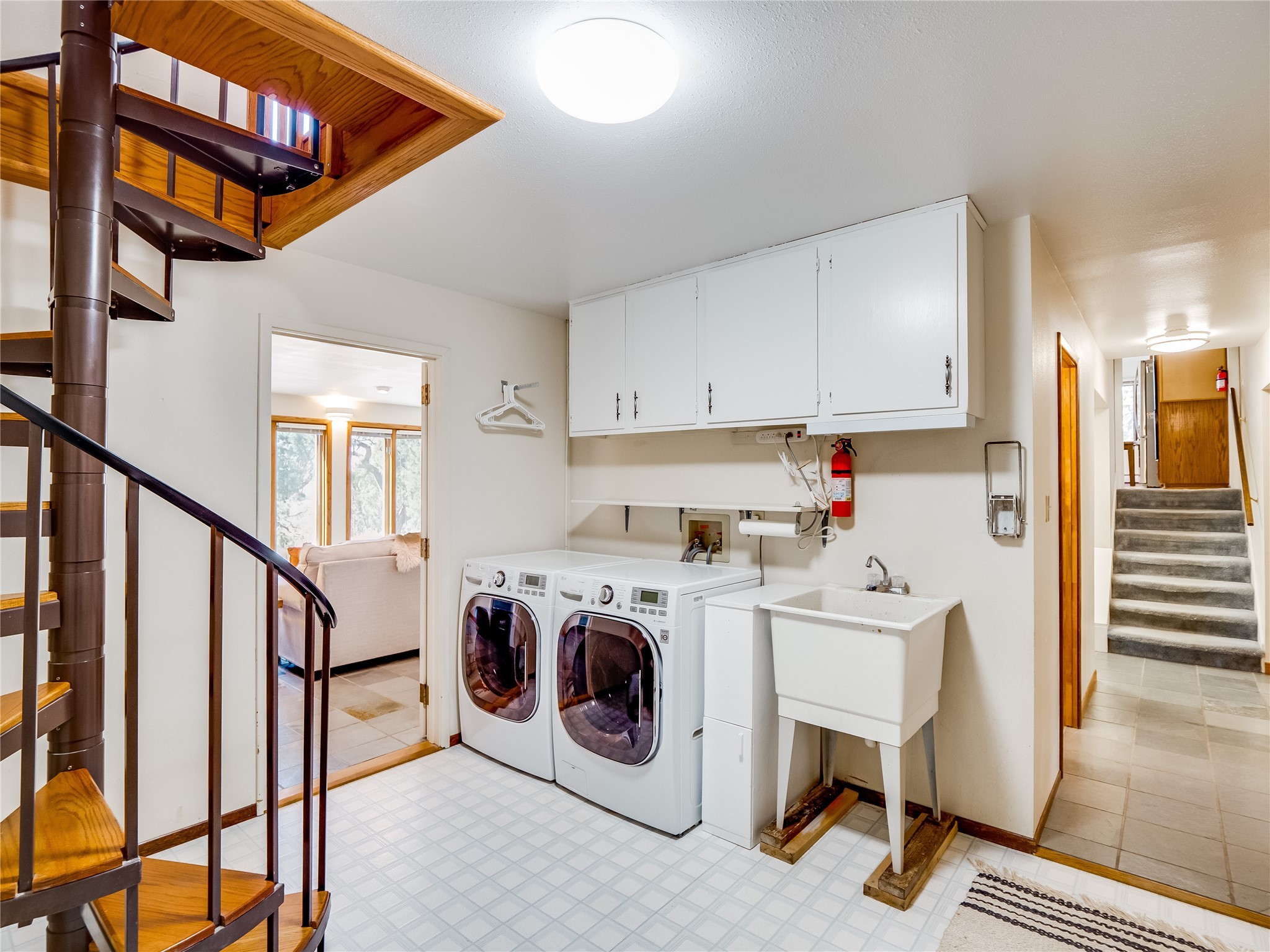 Tucked into the canyon edge, this stunning multi-level custom home offers breathtaking views, unique features, and a flexible layout ideal for entertaining or a quiet retreat. With beautiful curb appeal, the home is framed by mature landscaping and towering trees. Step into the welcoming foyer and head up to a spacious, sun-filled living room with plush carpet and large windows that flood the space with natural light. The connected open dining room has sliding glass doors to the back deck--perfect for BBQing. The kitchen is both functional and stylish, featuring wood cabinetry, a peninsula island with bar seating and under-storage, stainless steel appliances, hard surface counters, tile backsplash, and tile flooring throughout. A few steps down, you'll find a wet bar that flows into the bright family room, where a wall of windows captures the beauty of the backyard and canyon beyond. French doors open to the back deck, while a wood fireplace adds warmth and charm. This level also features a spacious guest bedroom and a guest bath with a double sink vanity and a walk-in shower. Down the hall, the laundry room offers access to the garage and a spiral staircase leading to the top floor. There's an indoor spa room with a tranquil pond. Upstairs, you'll find two additional guest bedrooms, a full guest bathroom, and a luxurious primary en-suite. The primary bedroom is a true retreat with vaulted beamed ceilings, a wall of windows, a private deck, and direct access to the main deck. Enjoy two large walk-in closets with built-in organizers and a spa-like bathroom with a double sink vanity, an additional single vanity, and a tiled walk-in shower with dual shower heads. The basement adds even more space, with a kitchenette and an additional 728 sq ft not included in the total square footage. The large backyard boasts canyon views, built-in bench seating on the deck, and room to relax or entertain. With views, ample storage, and charm, Don't miss this one-of-a-kind canyon home!