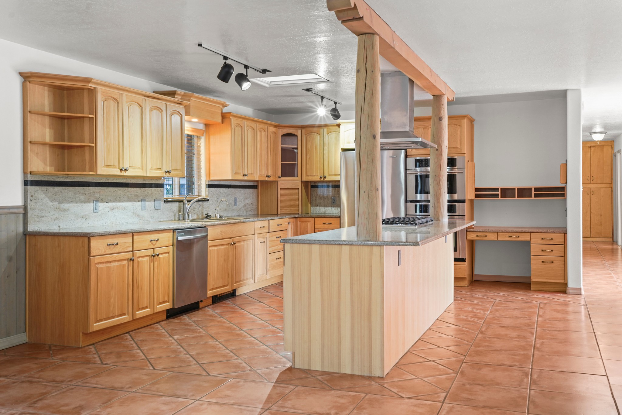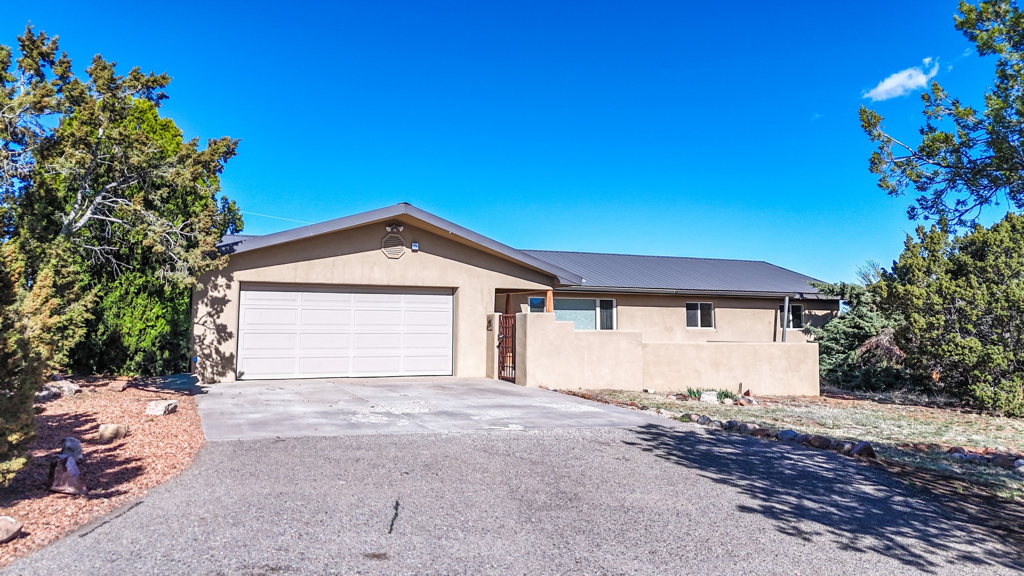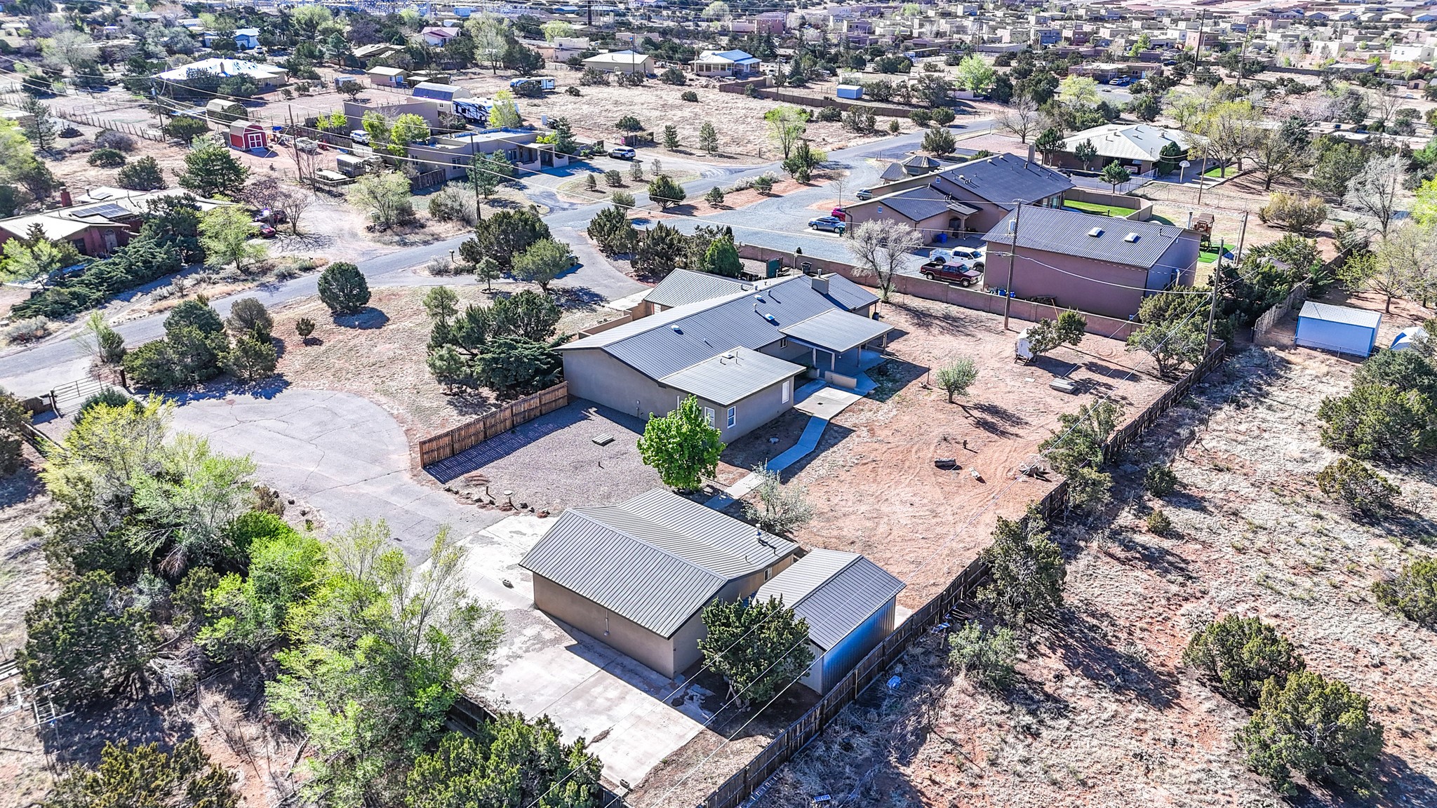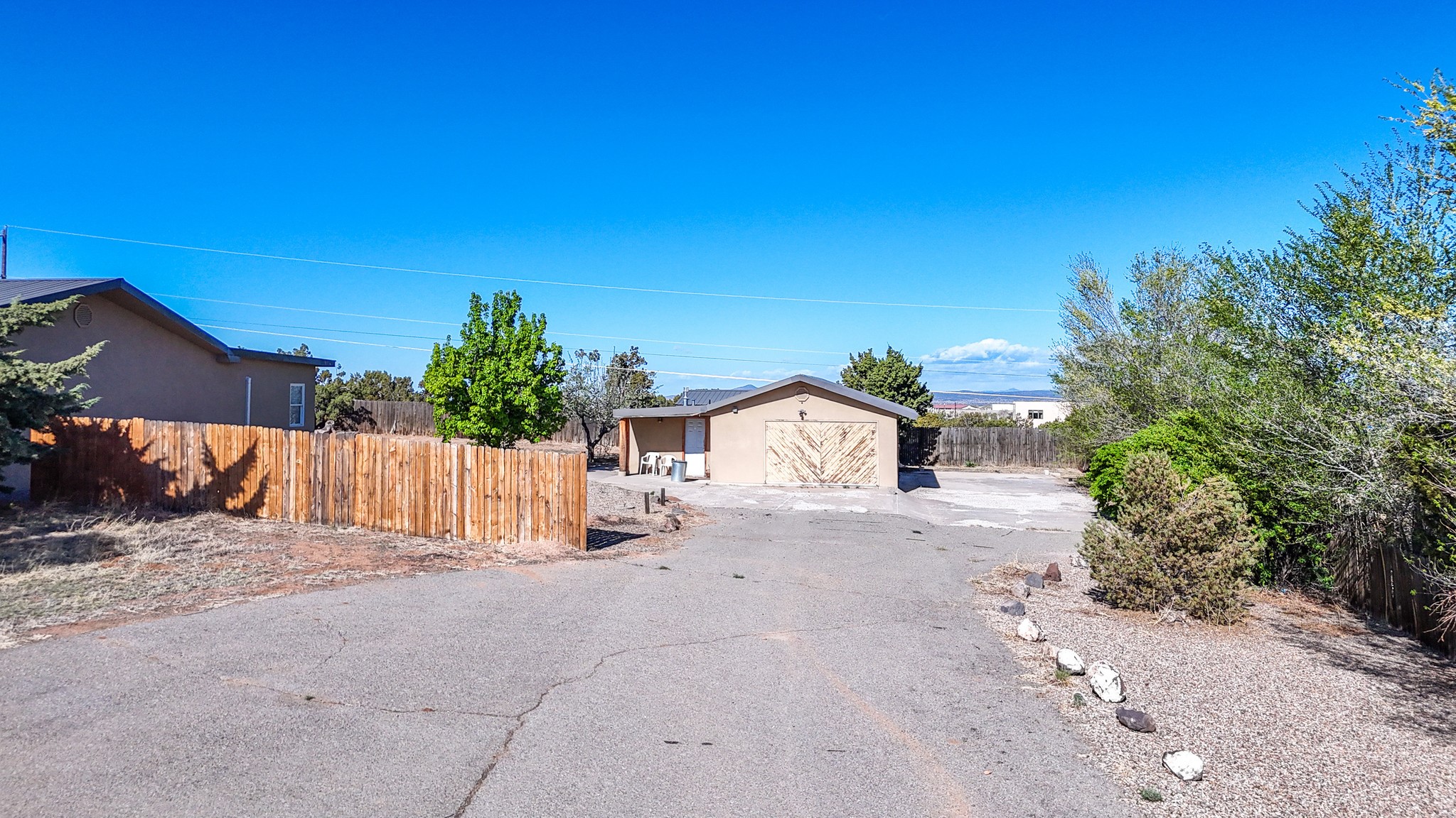 Amazing opportunity to own this versatile large home on a spacious rare one acre property with panoramic views in the heart of Santa Fe. Highly desirable area in the city limits with close proximity to everything that Santa Fe has to offer. Has a detached studio/workshop and dual driveways which is ideal for trade professionals or anyone seeking a flexible work setup with ample space to work with. The open-concept layout centers around a custom kitchen featuring a large granite island, stainless steel appliances, custom wood cabinetry, a built-in desk, and an oversized pantry, making it the perfect space for both everyday living and entertaining. The primary suite is generously sized and includes a private sitting area, along with a luxurious en-suite bathroom that features a walk-in shower and a classic pedestal tub. Natural gas fireplace in living area. In addition to the main home, this property includes several detached structures not included in the listed square footage, adding exceptional value and utility. A detached studio/workshop complete with its own bathroom, heating system, and water heater provides the ideal setup for a private office. The large detached workshop includes a utility sink and sits next to a separate storage unit, all accessible via a second private driveway--an excellent setup for equipment storage, tools, or home-based business operations.Additional features include an electric front gate with key fob entry, a custom front gate for added security, and an attached two-car garage. The lot offers plenty of space for RV or boat parking. Whether you need dedicated workspace, storage for your business, or are simply looking for a multi-functional property with income potential, this home checks all the boxes and offers a unique opportunity for both personal and professional use. Come see for yourself why this spectacular property is one of the great values available in todays market.