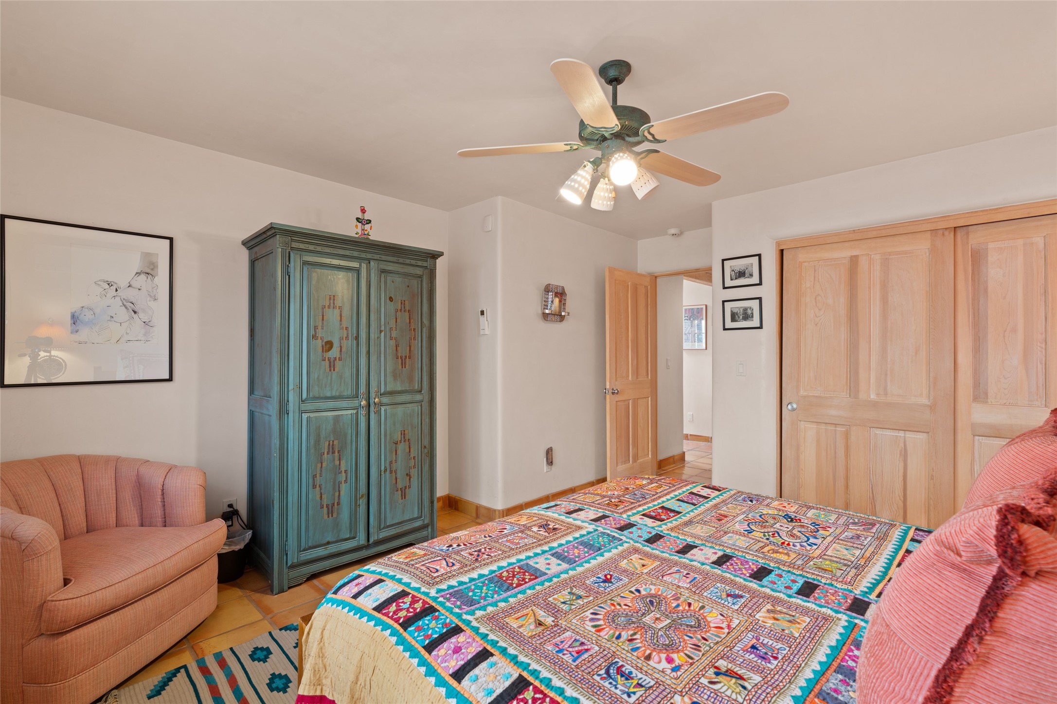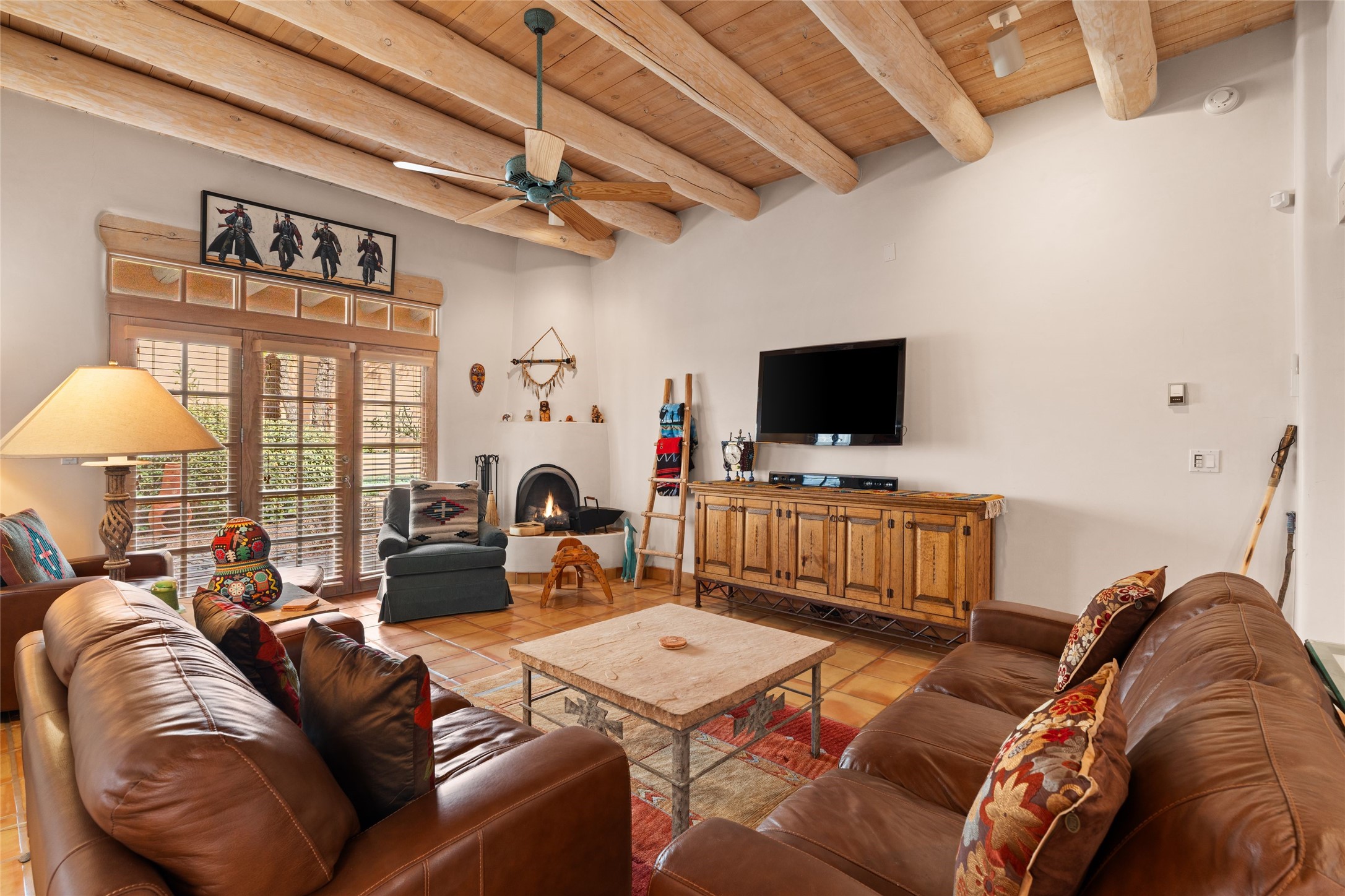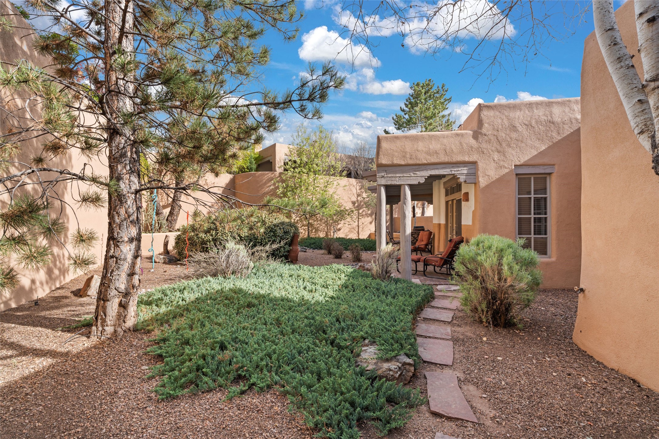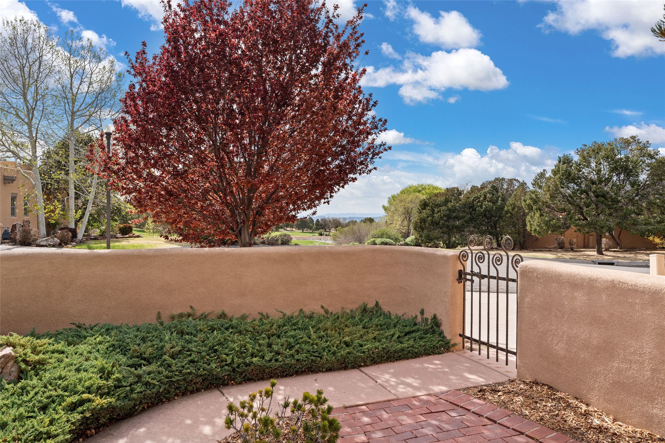 Classic Quail Run Pinon B with delightful outdoor spaces, charming Santa Fe style and an ideal floorplan. Enter through the spacious front courtyard which showcases views of the first green and those fabulous sunsets. The home will greet you with Saltillo floors, open living and optimal separation of bedrooms. Light filled kitchen nook compliments a spacious kitchen which extends to an alluring dining and living area. Sizable primary bedroom features a wood burning Kiva and opens to an ample back portal with lovely high desert landscape. Located on a quiet cul de sac in the midst of Santa Fe's premier condominium resort. Ownership at Quail Run includes 24 hour hosted security, beautiful grounds, state of the art gym and pool, multiple fitness classes, engaging 9 hole golf course, pickleball, tennis and much more. Come and experience!
