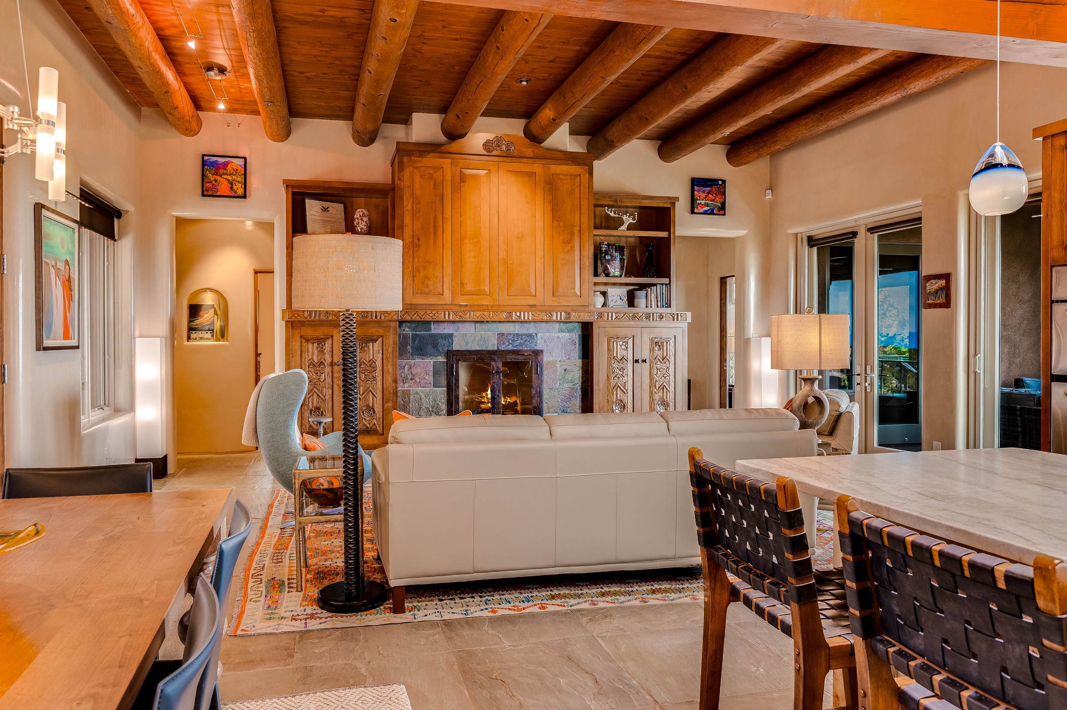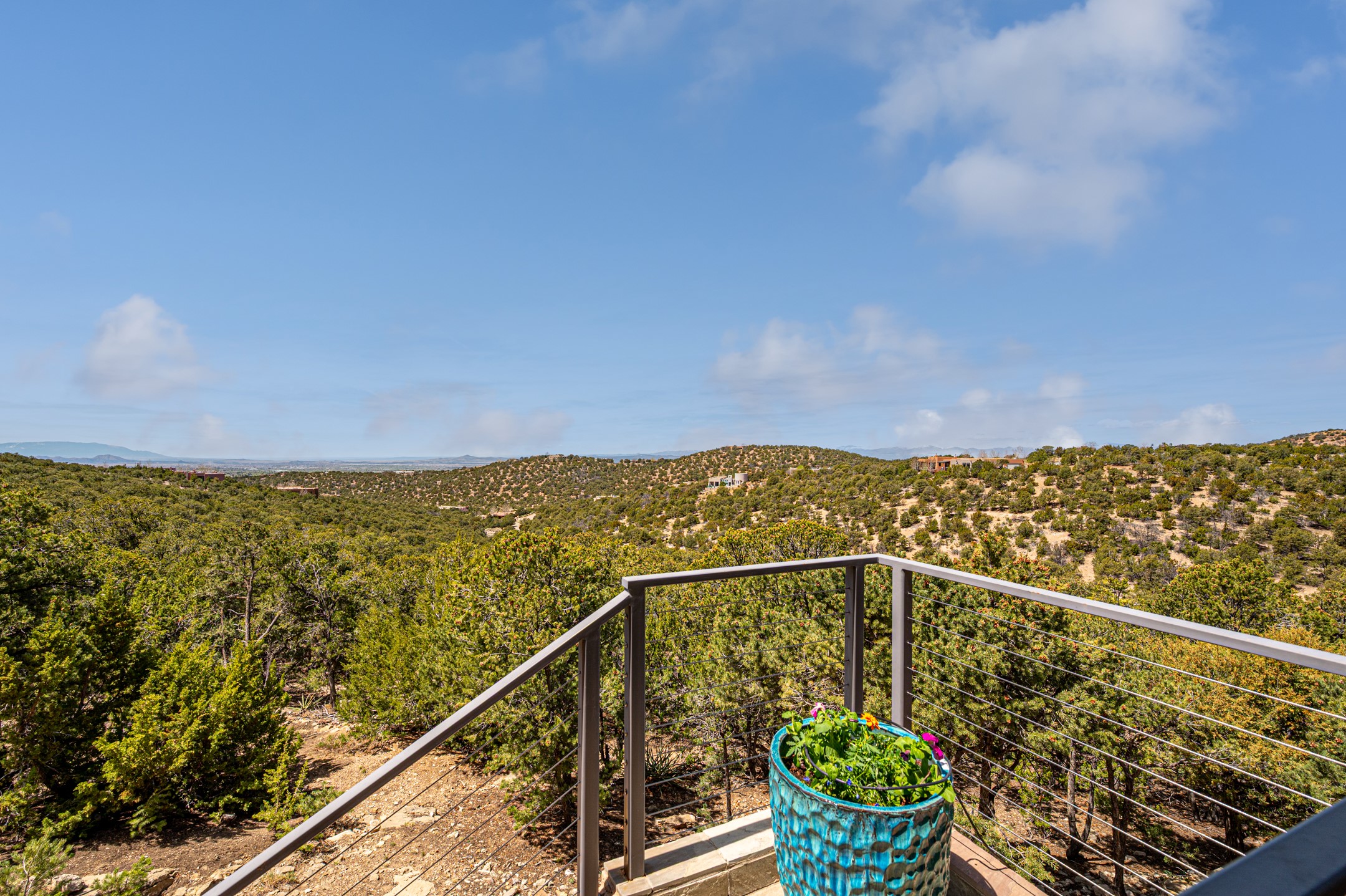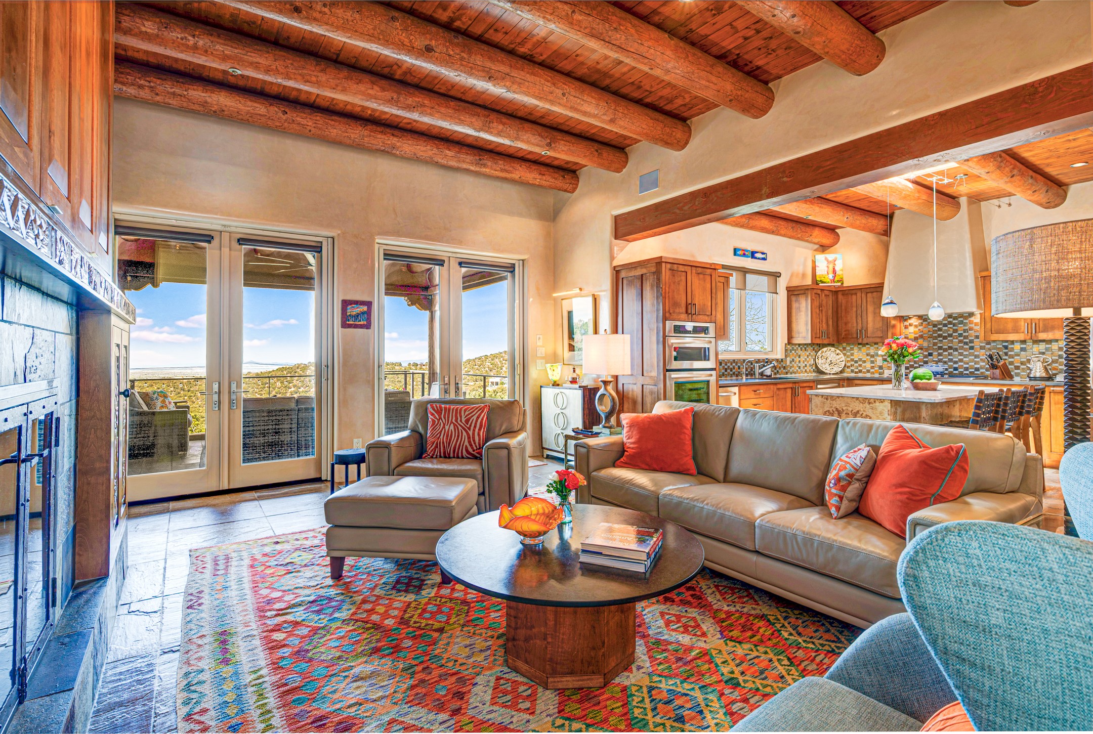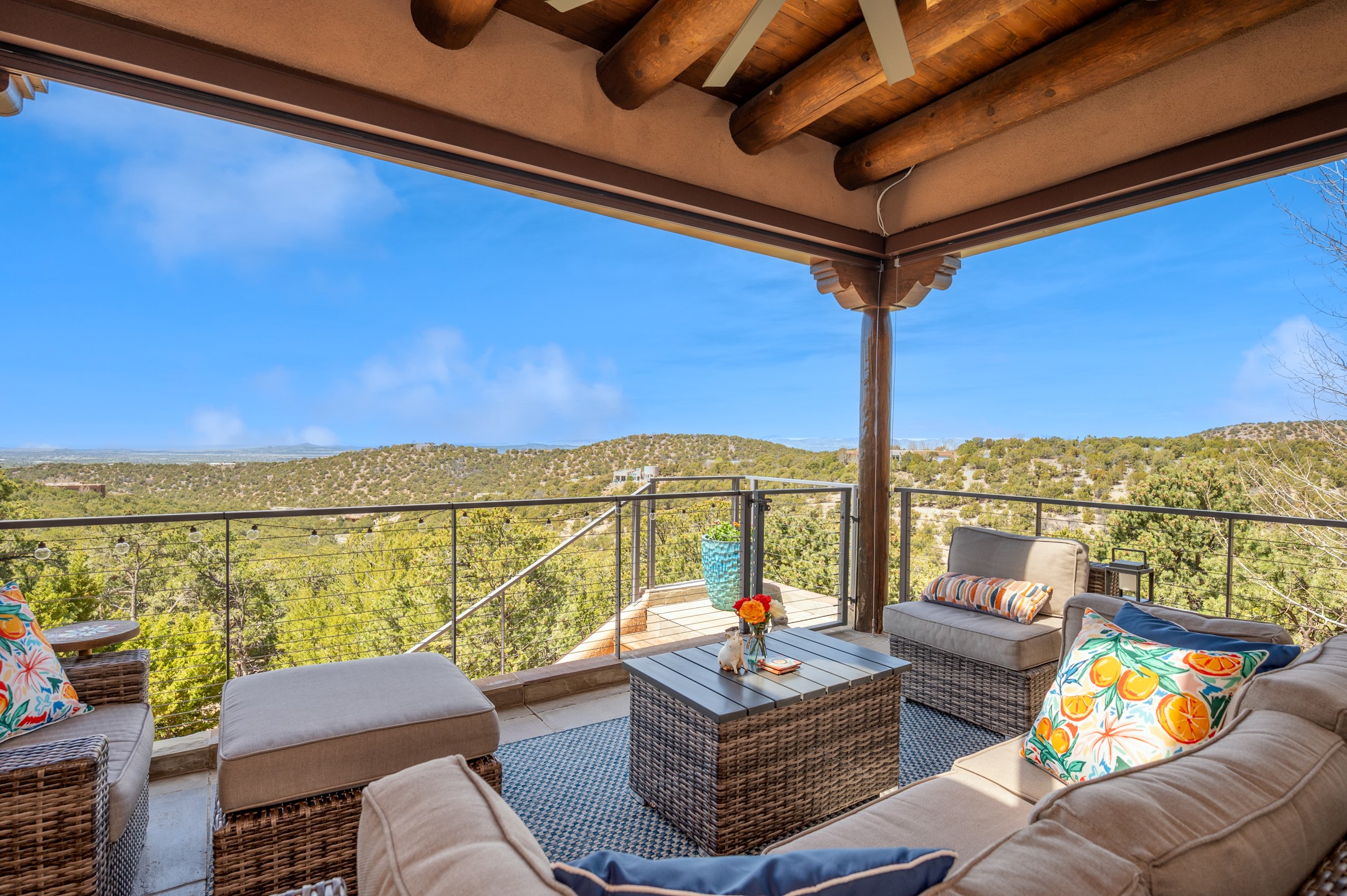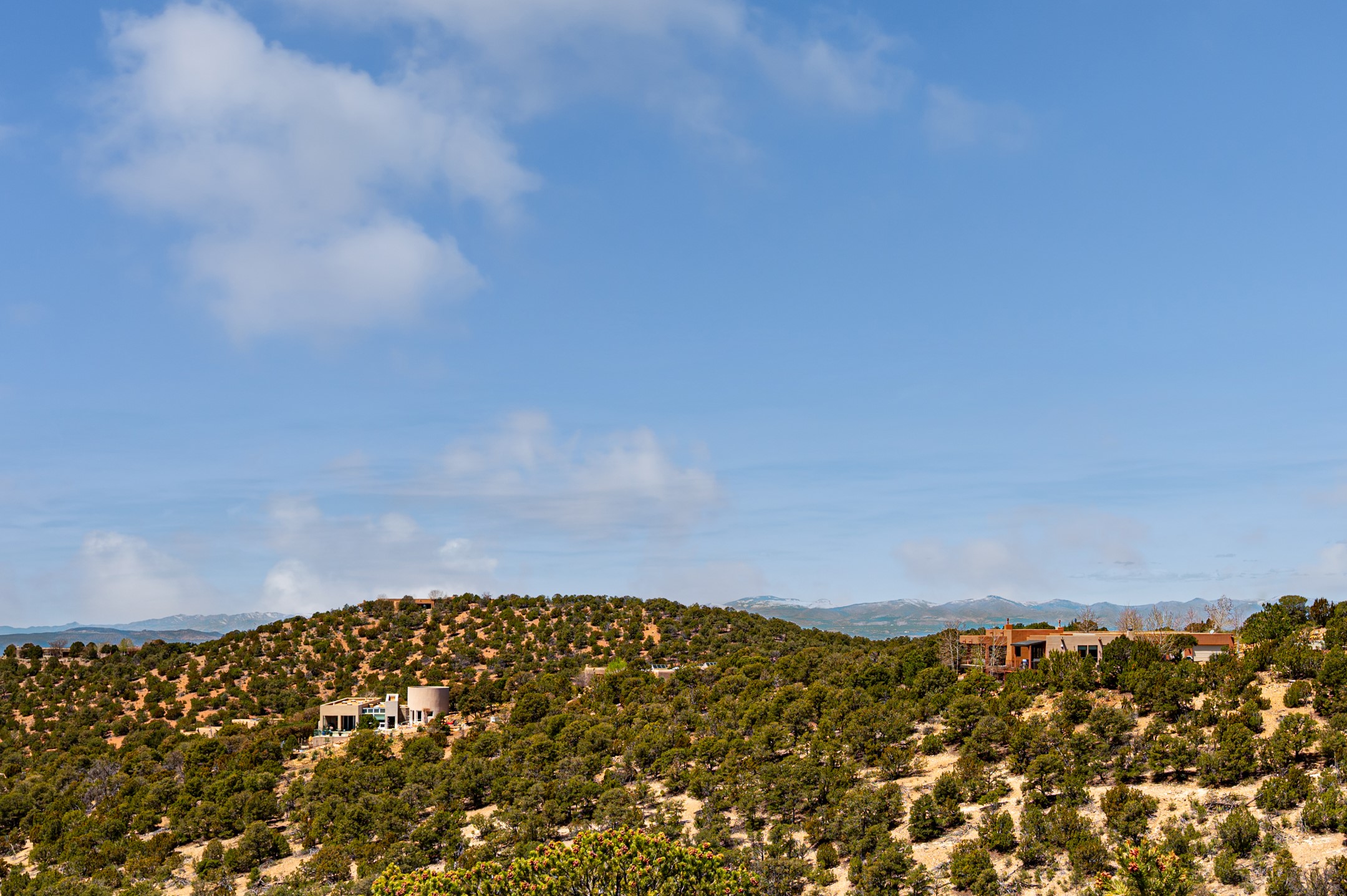Located in the exclusive, gated High Summit community above Santa Fe, this stunning residence offers a rare blend of privacy, convenience, and breathtaking natural beauty and views. Located just minutes from Ten Thousand Waves, the Santa Fe Ski Basin, and the renowned Dale Ball Trail system--with direct access from your own backyard--this home is a true sanctuary for those who cherish the outdoors and Santa Fe's iconic landscape. Set against the serene backdrop of the Santa Fe National Forest, with sweeping views of the Sandia and Jemez Mountains, sunsets, and city lights, this thoughtfully designed home exemplifies the best of Santa Fe style. Inside, rich architectural details abound--vigas and beams, smooth plaster walls, custom cabinetry and doors, and natural stone flooring create a warm, refined atmosphere. This home is appointed with high-end finishes throughout. The gourmet kitchen is equipped with premium appliances, a generous island, and breakfast bar--ideal for everyday living or effortless entertaining. A gas log fireplace anchors the living room, while a cozy kiva fireplace adds charm to the bedroom suite. Comfort meets efficiency with central cooling, as well as radiant in-floor heating. The beautifully landscaped grounds are complemented by an outdoor view portal with automatic sunshades, seamlessly blending indoor and outdoor living. Built in 2013, the home has 2 bedrooms, 2 baths, private office/study/den plus an additional room currently the perfect home gym. Also included is a large storage room with built-in shelving and 2 car garage. All of this, with paved, maintained roads and city utilities--just five miles from the heart of downtown Santa Fe, Canyon Road's galleries, and world-class dining. A unique opportunity to own an elegant mountain escape in one of Santa Fe's most desirable enclaves.