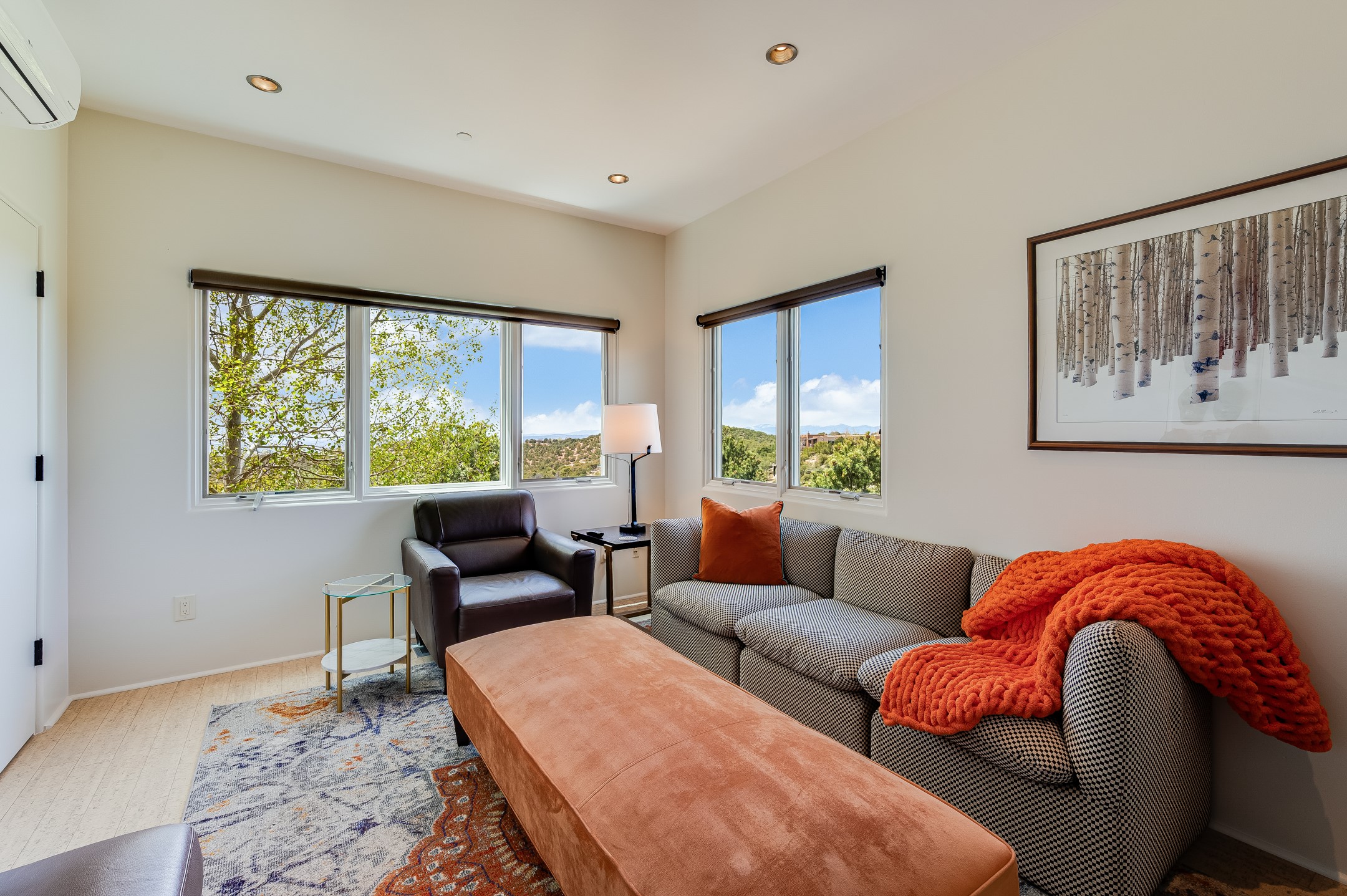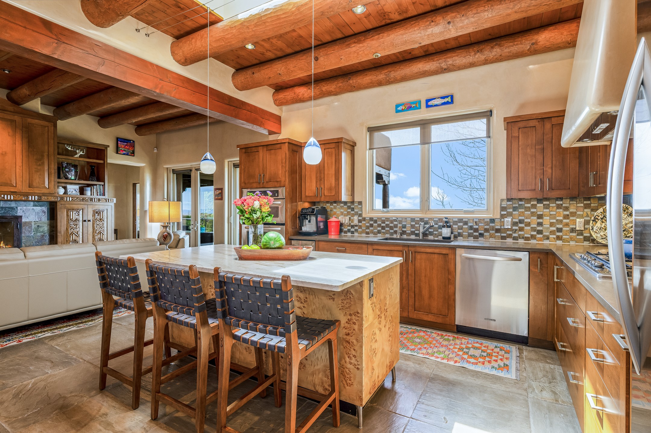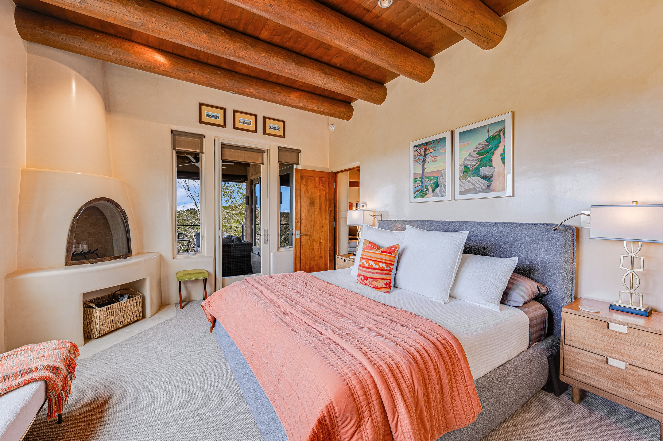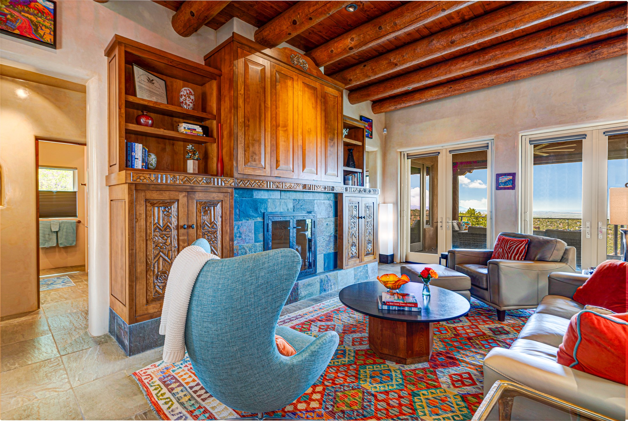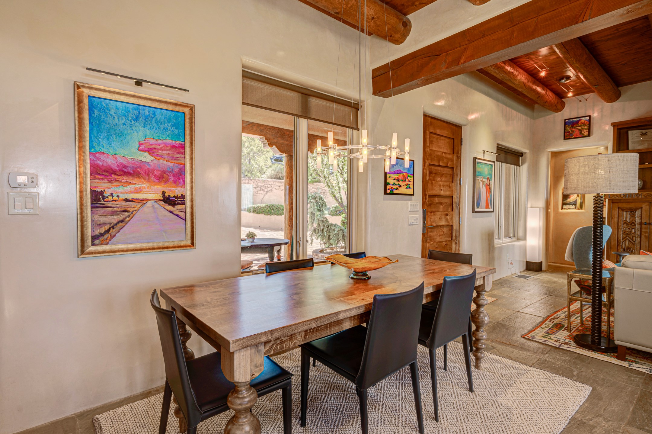 Located in the exclusive, gated High Summit community above Santa Fe, this stunning residence offers a rare blend of privacy, convenience, and breathtaking natural beauty and views. Located just minutes from Ten Thousand Waves, the Santa Fe Ski Basin, and the renowned Dale Ball Trail system--with direct access from your own backyard--this home is a true sanctuary for those who cherish the outdoors and Santa Fe's iconic landscape. Set against the serene backdrop of the Santa Fe National Forest, with sweeping views of the Sandia and Jemez Mountains, sunsets, and city lights, this thoughtfully designed home exemplifies the best of Santa Fe style. Inside, rich architectural details abound--vigas and beams, smooth plaster walls, custom cabinetry and doors, and natural stone flooring create a warm, refined atmosphere. This home is appointed with high-end finishes throughout. The gourmet kitchen is equipped with premium appliances, a generous island, and breakfast bar--ideal for everyday living or effortless entertaining. A gas log fireplace anchors the living room, while a cozy kiva fireplace adds charm to the bedroom suite. Comfort meets efficiency with central cooling, as well as radiant in-floor heating. The beautifully landscaped grounds are complemented by an outdoor view portal with automatic sunshades, seamlessly blending indoor and outdoor living. Built in 2013, the home has 2 bedrooms, 2 baths, private office/study/den plus an additional room currently the perfect home gym. Also included is a large storage room with built-in shelving and 2 car garage. All of this, with paved, maintained roads and city utilities--just five miles from the heart of downtown Santa Fe, Canyon Road's galleries, and world-class dining. A unique opportunity to own an elegant mountain escape in one of Santa Fe's most desirable enclaves.