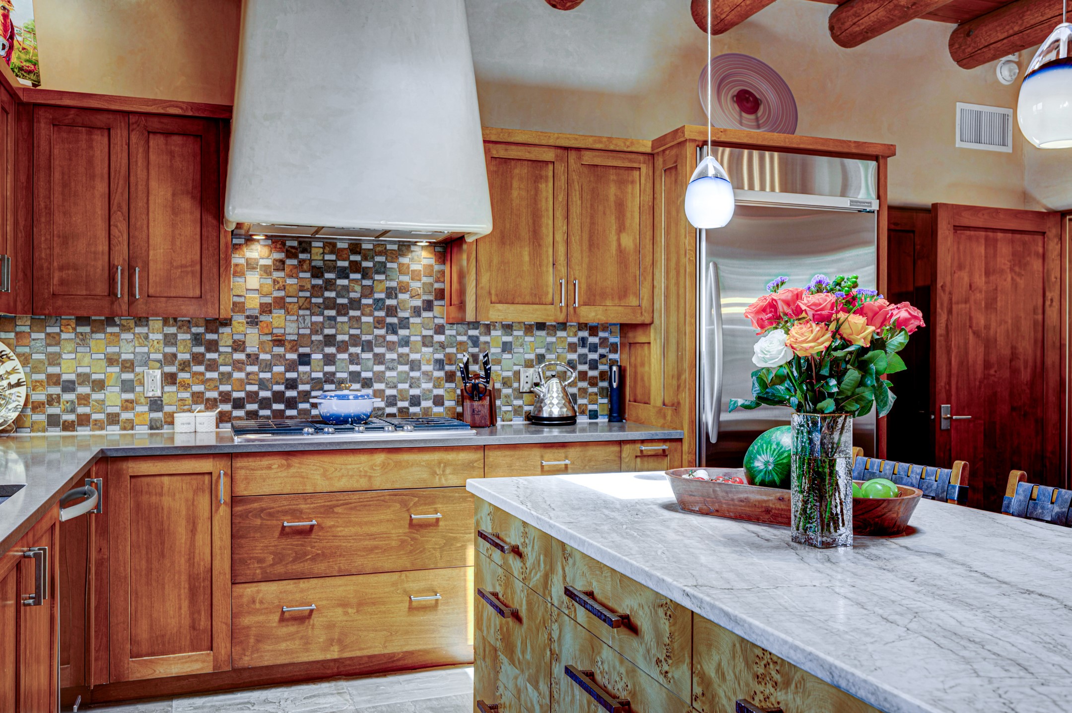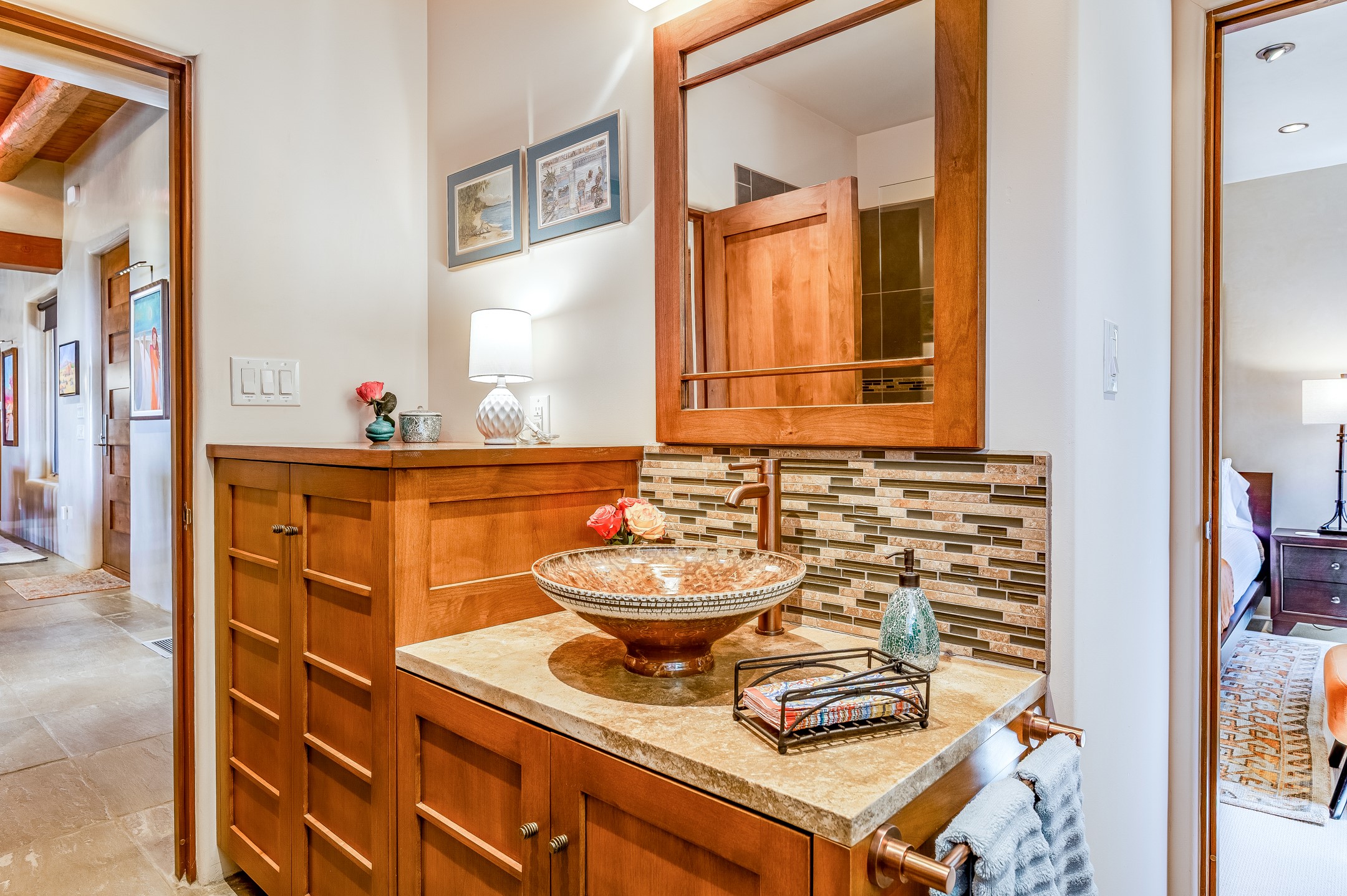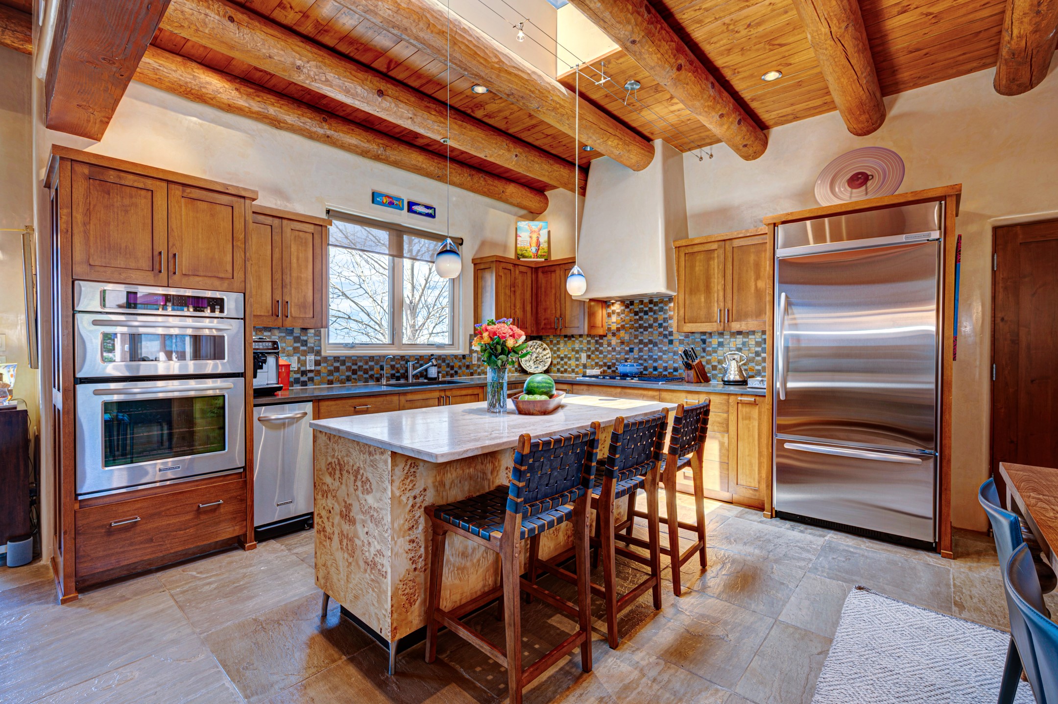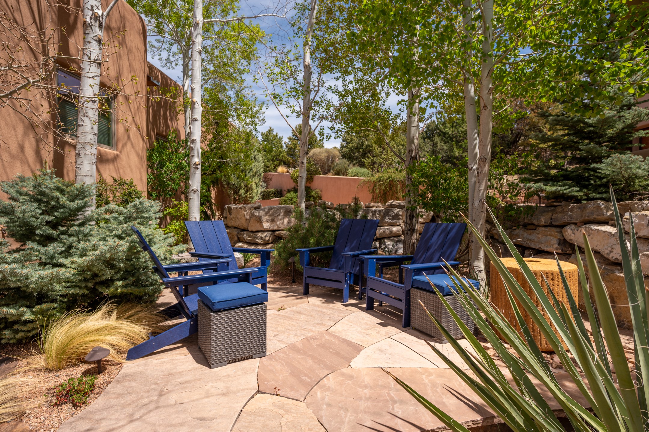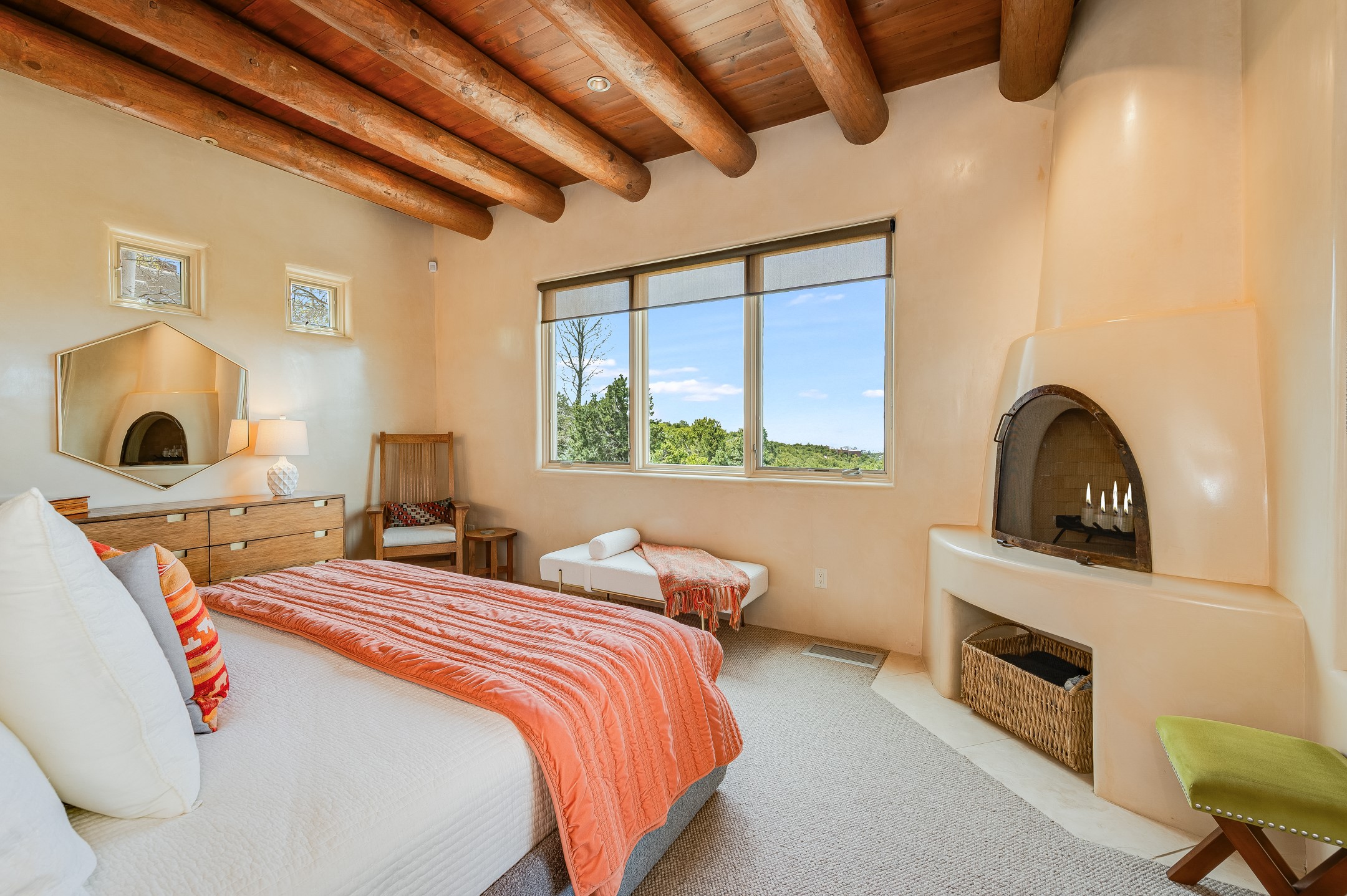 Located in the exclusive, gated High Summit community above Santa Fe, this stunning residence offers a rare blend of privacy, convenience, and breathtaking natural beauty and views. Located just minutes from Ten Thousand Waves, the Santa Fe Ski Basin, and the renowned Dale Ball Trail system--with direct access from your own backyard--this home is a true sanctuary for those who cherish the outdoors and Santa Fe's iconic landscape. Set against the serene backdrop of the Santa Fe National Forest, with sweeping views of the Sandia and Jemez Mountains, sunsets, and city lights, this thoughtfully designed home exemplifies the best of Santa Fe style. Inside, rich architectural details abound--vigas and beams, smooth plaster walls, custom cabinetry and doors, and natural stone flooring create a warm, refined atmosphere. This home is appointed with high-end finishes throughout. The gourmet kitchen is equipped with premium appliances, a generous island, and breakfast bar--ideal for everyday living or effortless entertaining. A gas log fireplace anchors the living room, while a cozy kiva fireplace adds charm to the bedroom suite. Comfort meets efficiency with central cooling, as well as radiant in-floor heating. The beautifully landscaped grounds are complemented by an outdoor view portal with automatic sunshades, seamlessly blending indoor and outdoor living. Built in 2013, the home has 2 bedrooms, 2 baths, private office/study/den plus an additional room currently the perfect home gym. Also included is a large storage room with built-in shelving and 2 car garage. All of this, with paved, maintained roads and city utilities--just five miles from the heart of downtown Santa Fe, Canyon Road's galleries, and world-class dining. A unique opportunity to own an elegant mountain escape in one of Santa Fe's most desirable enclaves.