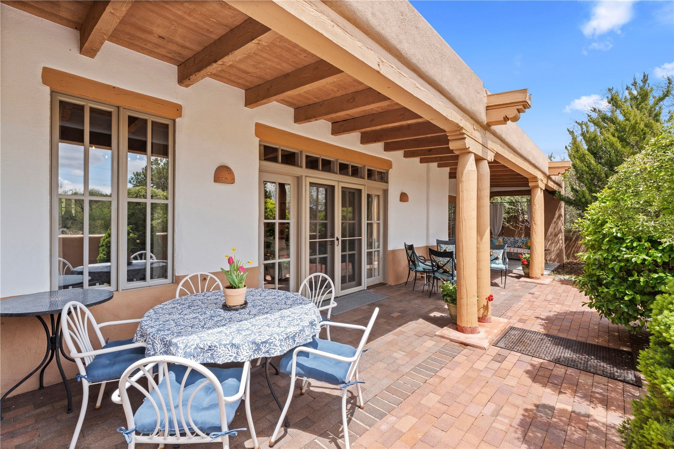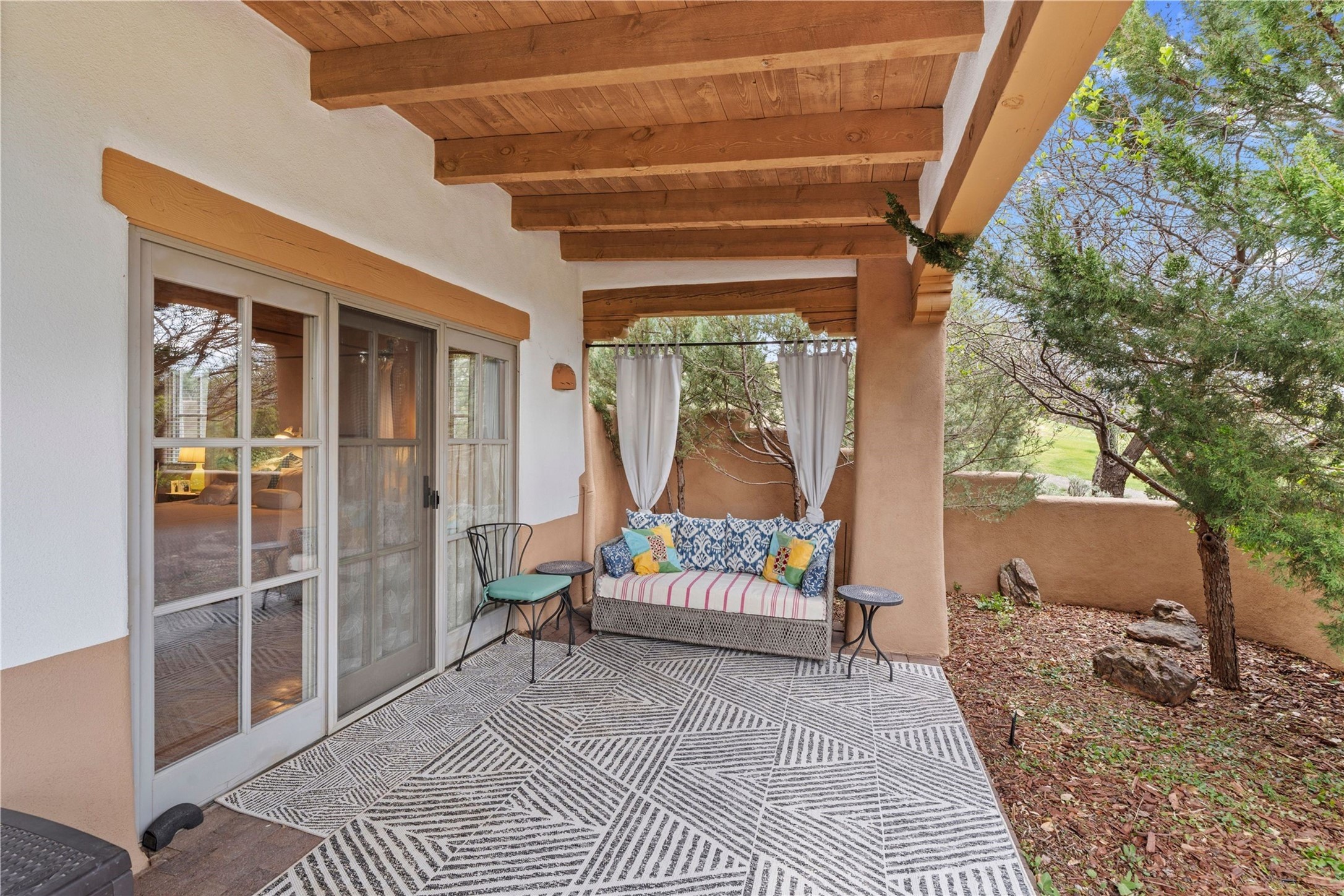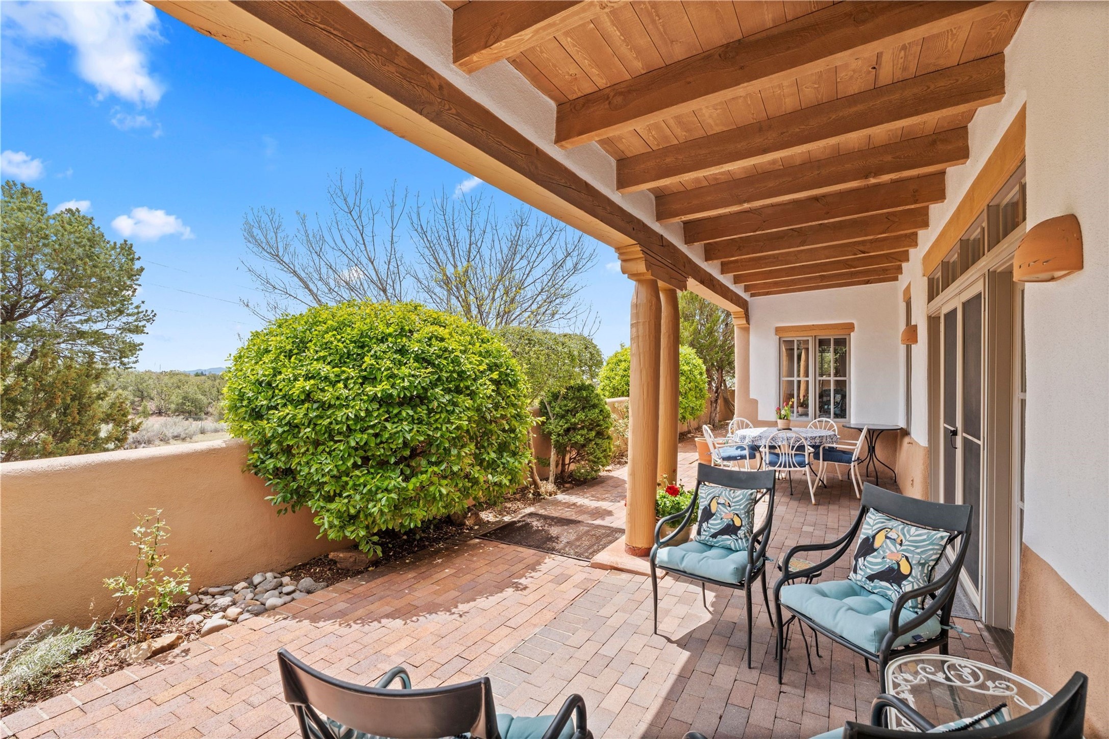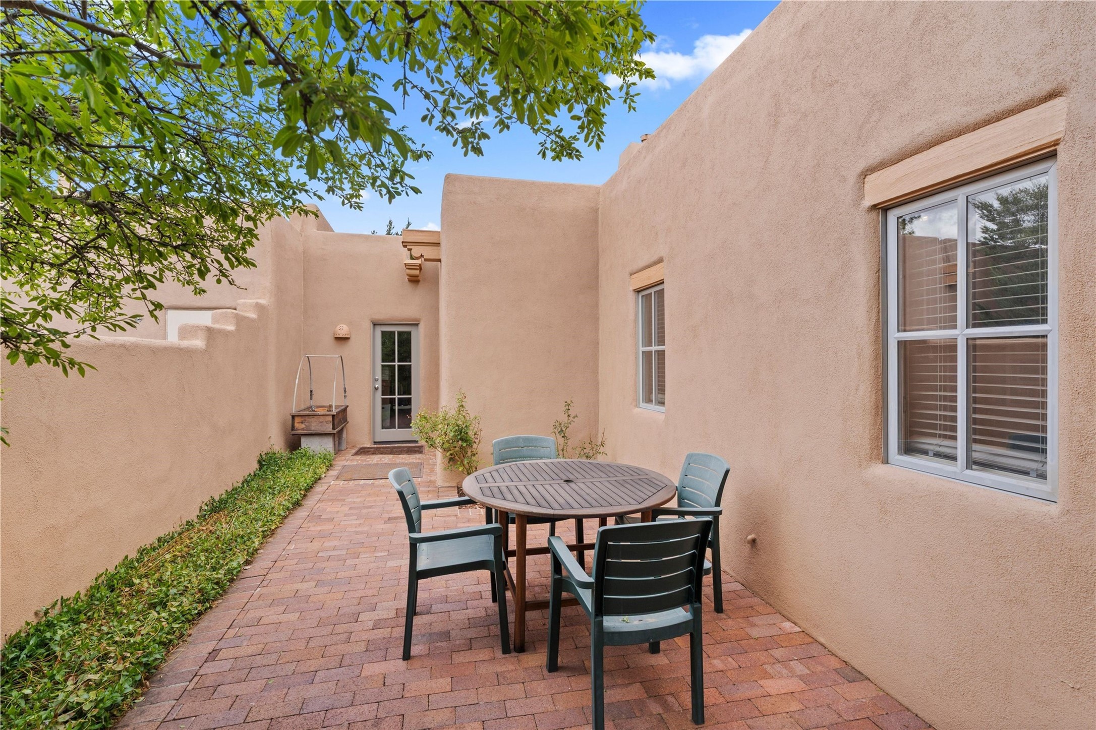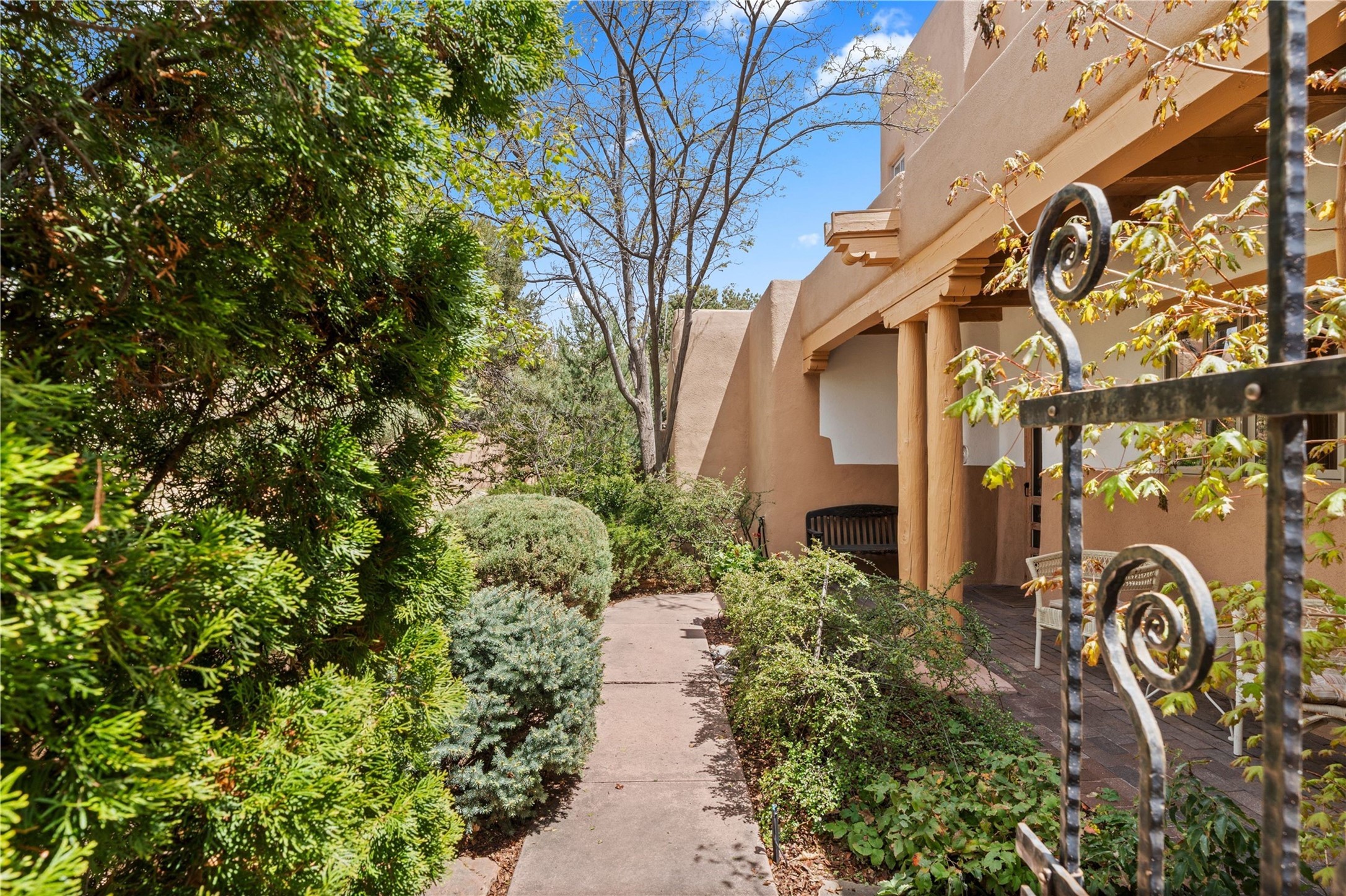 Sanctuary of Elegance in the Heart of Santa Fe. Welcome to 3101 Old Pecos Trail, Unit 690, a rare offering within Santa Fe's prestigious Quail Run community. This expansive 2,820 sq ft two-story detached condominium seamlessly blends the timeless charm of Pueblo-style architecture with the comfort and ease of modern living. Featuring four bedrooms and four bathrooms and a well-proportioned central living area, this light-filled home offers abundant space for both relaxation and effortless entertaining. Authentic vigas and beams, two kiva fireplaces, Saltillo tile floors, and hand-finished plaster walls create a warm, sophisticated ambiance throughout. One of the home's most remarkable features is its generous, private outdoor space amidst lush greenery offering refuge for morning coffee, alfresco dining or quiet reflection. Upstairs, a 600 sq ft rooftop deck captures panoramic mountain views, iconic sunsets, and star-studded night skies - the perfect setting for memorable gatherings and enjoying the abundant wildlife, especially birds. The primary suite is a true retreat complete with kiva fireplace and access to the long rear patio. The spacious guest suites provide flexibility for dual primary living, home offices, or creative spaces. Set in one of the most private and serene culs-de-sac within Quail Run, Unit 690 enjoys access to resort-style amenities, including a clubhouse with dining, fitness center, golf course, tennis courts, swimming pool, and 24-hour security. With HOA coverage for exterior maintenance, roof and more, this turnkey home offers security, luxury, convenience, and peace of mind - all just minutes from the heart of historic downtown Santa Fe and close to the Opera and Ski Basin.