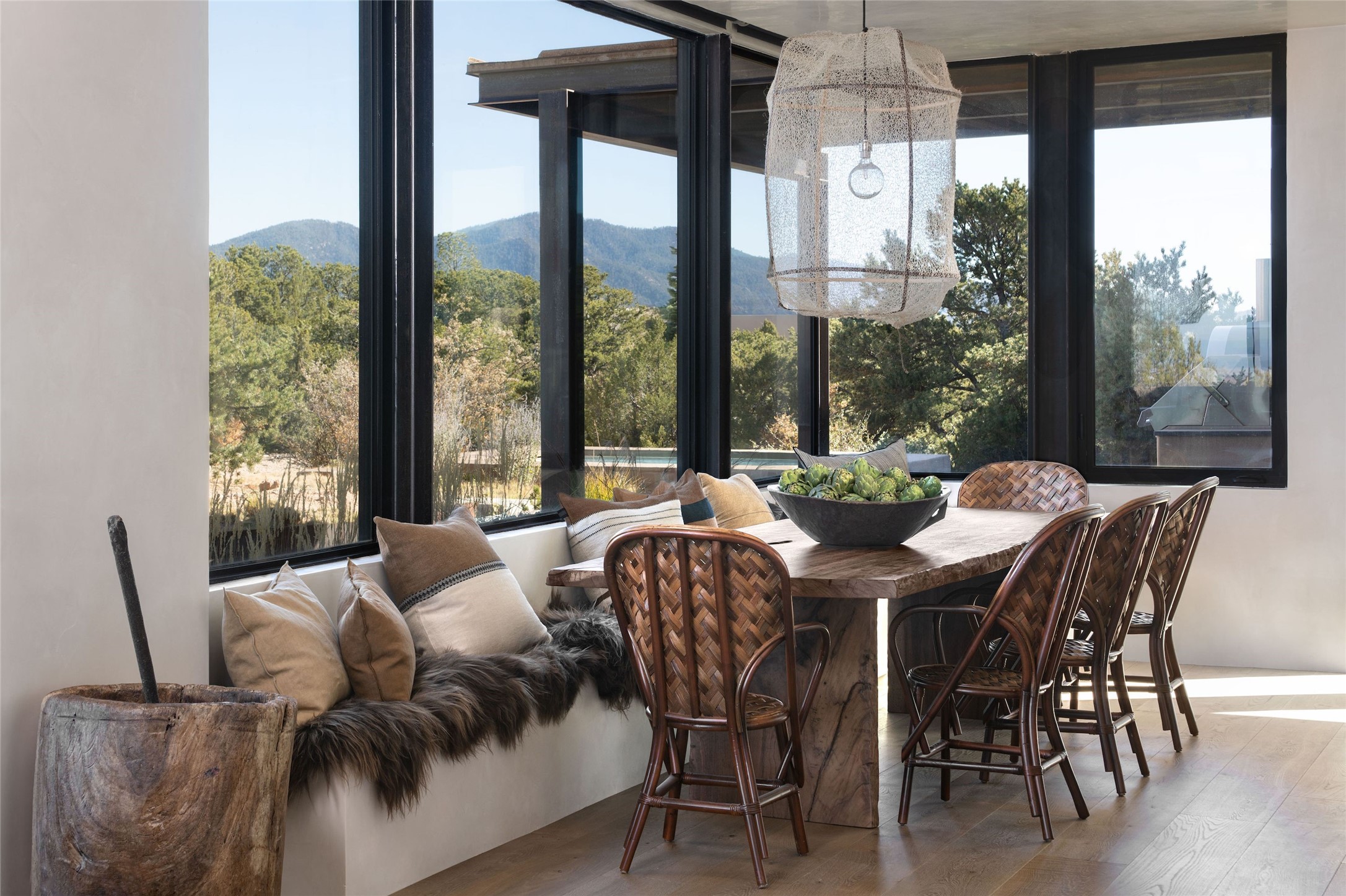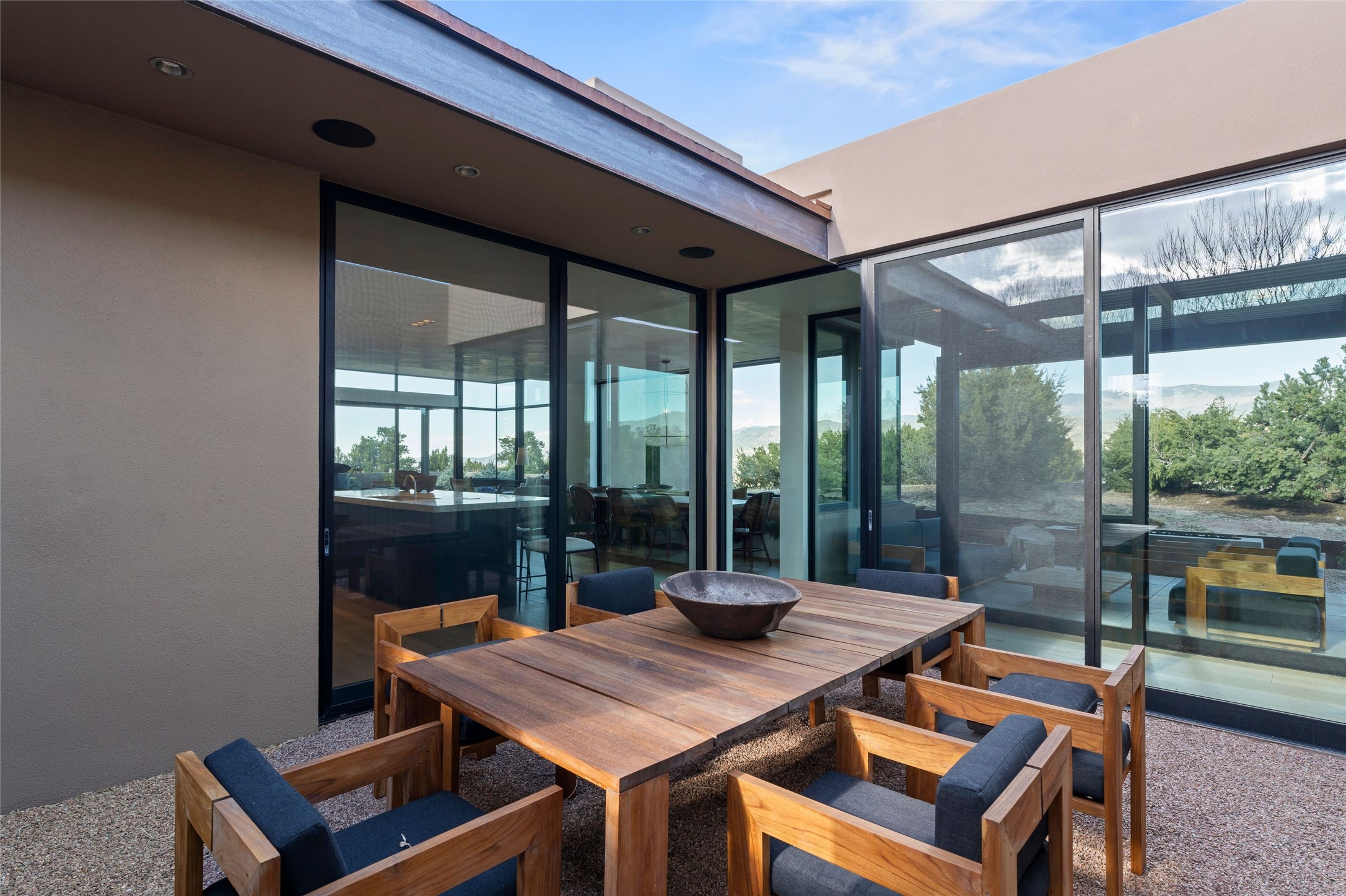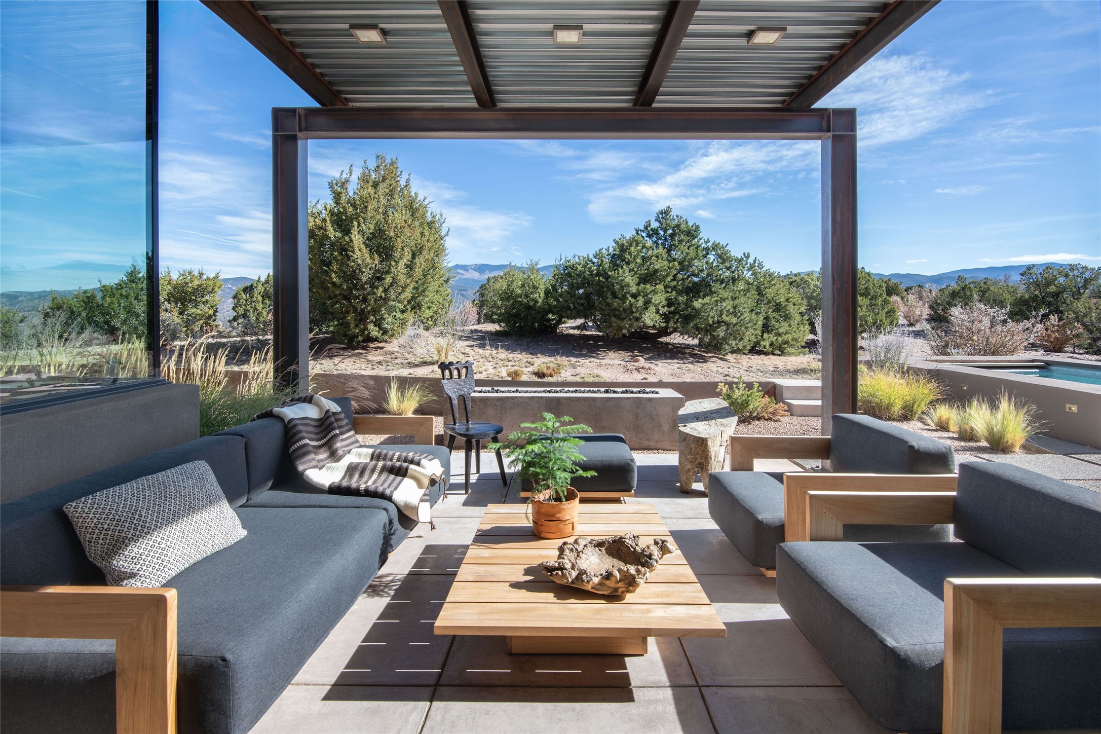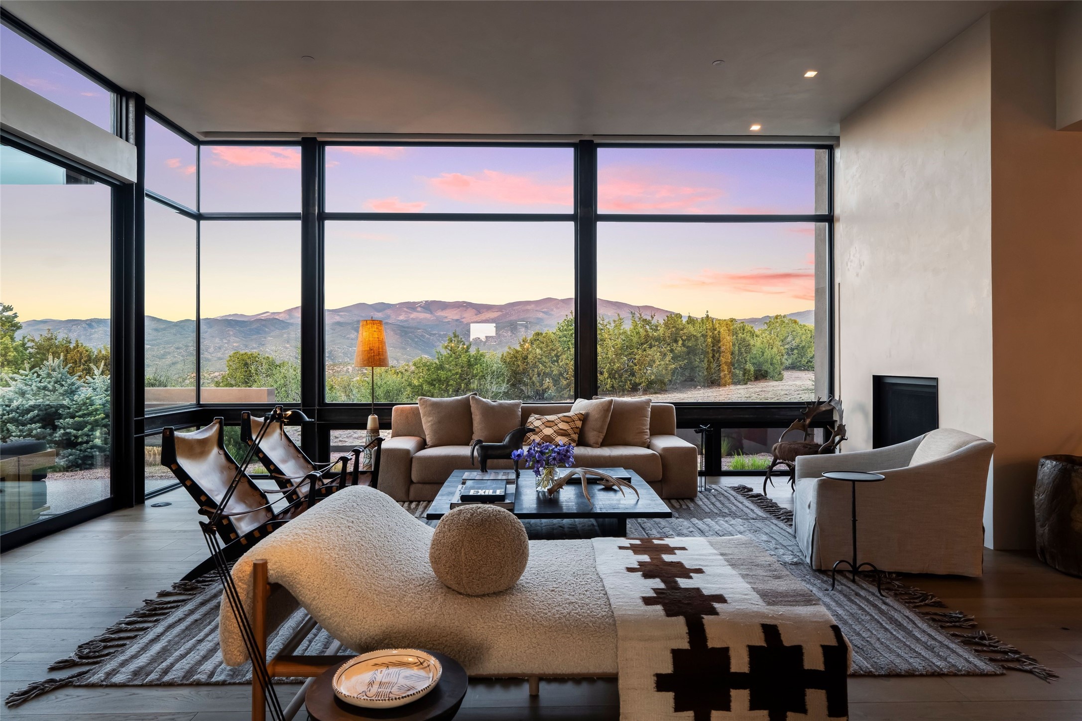 Experience the pinnacle of luxury living in this stunning 4-bedroom, 3.5-bath home, including an 878 sq. ft. guesthouse. Situated within the esteemed Monte Sereno community, this award-winning residence, designed by architect Robert Zachry and builder Scott Wong of Solterra, captures the essence of modern elegance. Perched on one of the highest lots in the community, with a private, gated entrance, enjoy 270-degree unobstructed views of the Sangre de Cristo Mountains, the Badlands, Ortiz/Sandia Mountains, and the twinkling lights of Santa Fe. This single-level home has recently been thoughtfully reimagined by designer Mary Clark with luxury finishes throughout. The flow from the living room to the dining area, kitchen, and outdoor portals creates an inviting atmosphere. The open kitchen includes custom oak cabinetry, travertine countertops, Gaggenau ovens, Thermador and Miele appliances, as well as a hidden scullery. Luxurious owner's suite provides privacy, featuring a Swedish wood burning stove, two walk-in closets, exercise room, and an en-suite bath with a travertine wet room, Waterworks soaking tub, Vola faucets and shower for two. Additional highlights include 32 solar panels, a heated driveway and sidewalks and a comprehensive audio system. The in-ground hot tub / plunge pool and outdoor custom kitchen, equipped with a Hestan grill and Alfa gas pizza oven, are ideal for entertaining. Low-water xeriscape landscaping enhances outdoor appeal, while the 2-car garage plus another in the guesthouse adds convenience. Discover unparalleled living in a convenient, close-in location where comfort and sophistication unite.