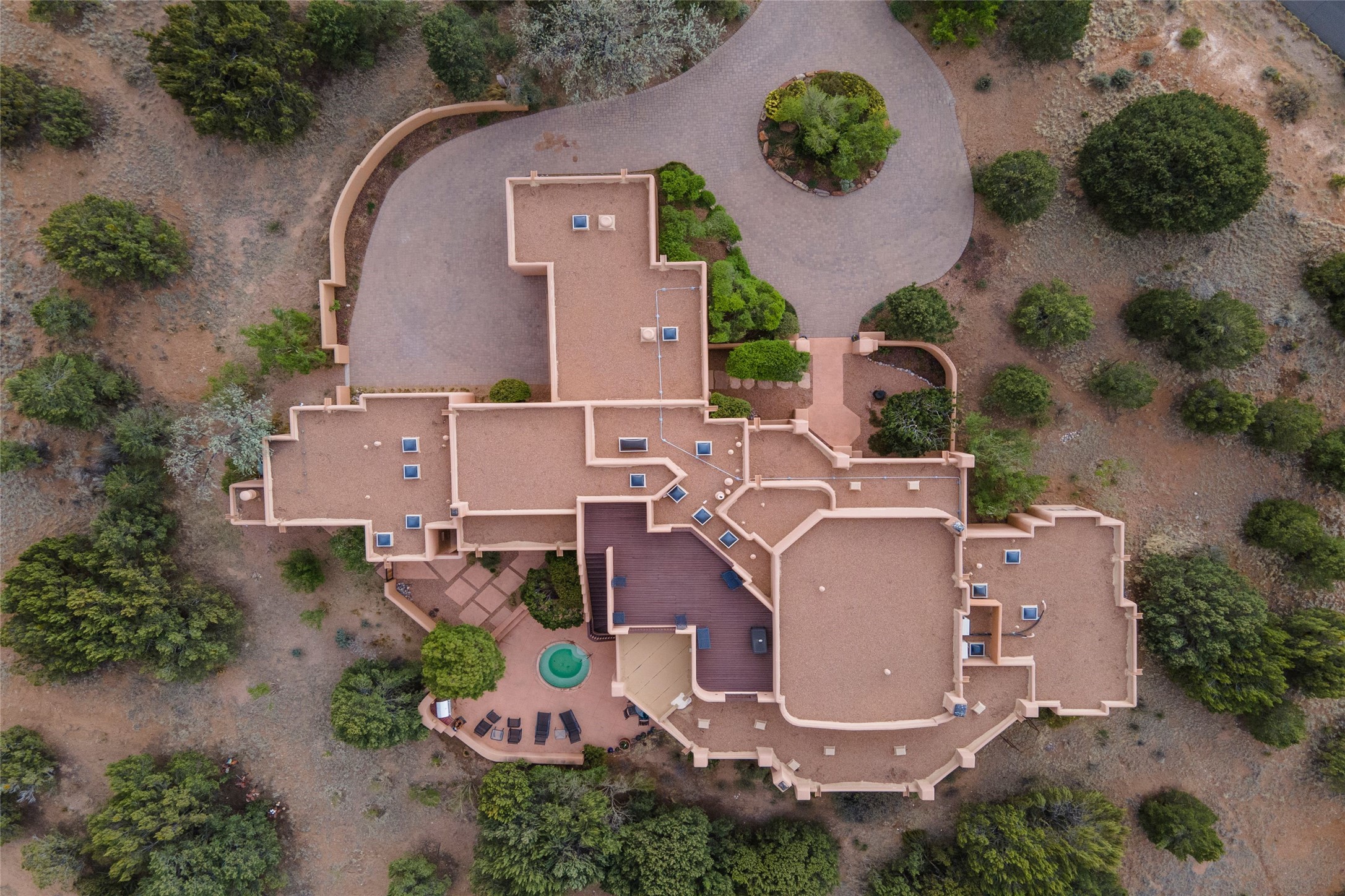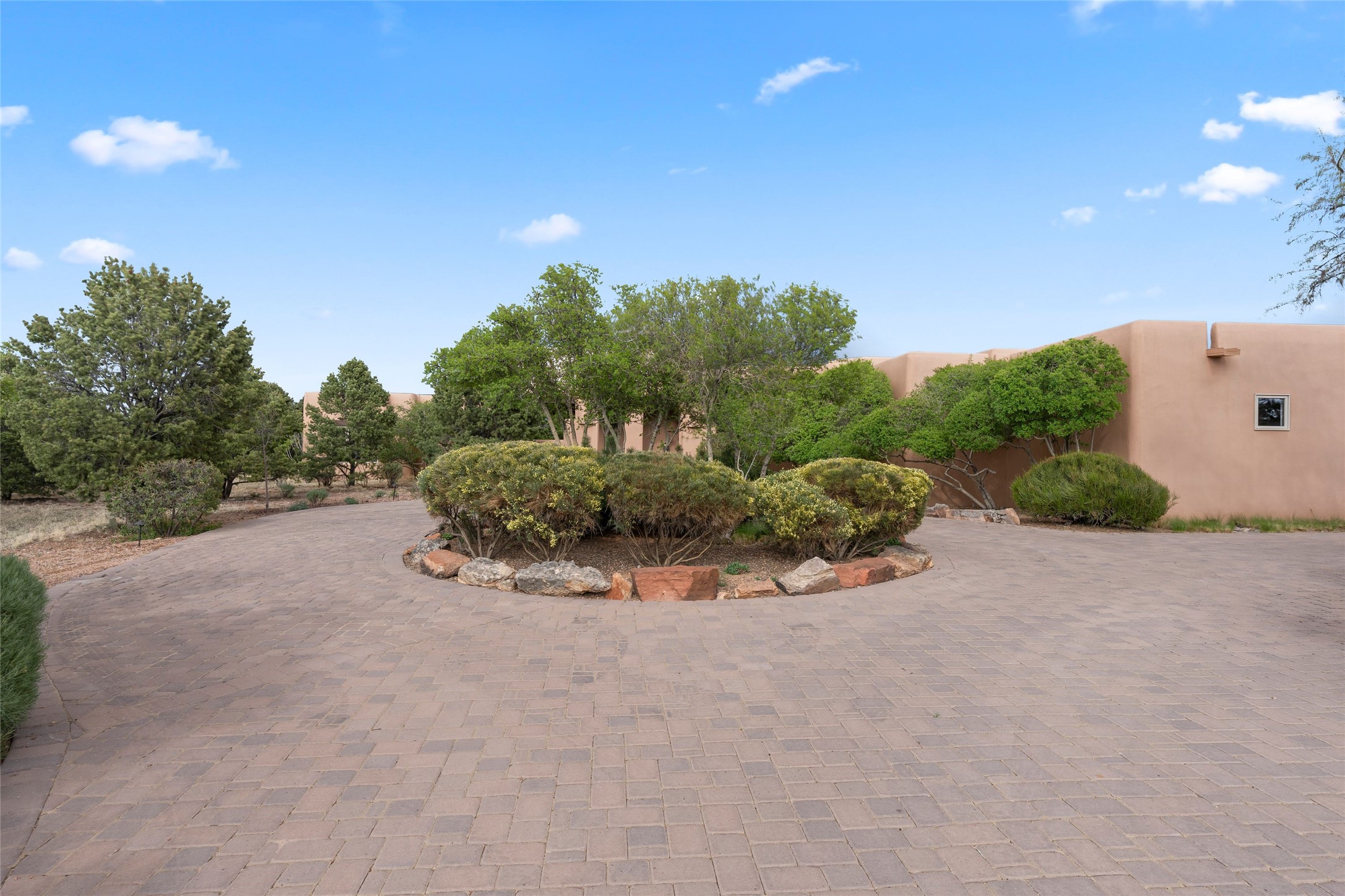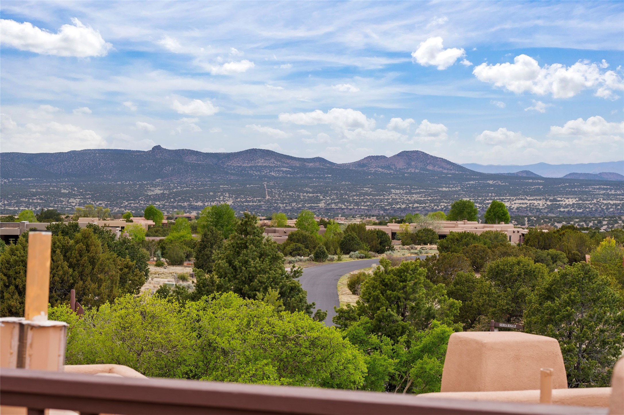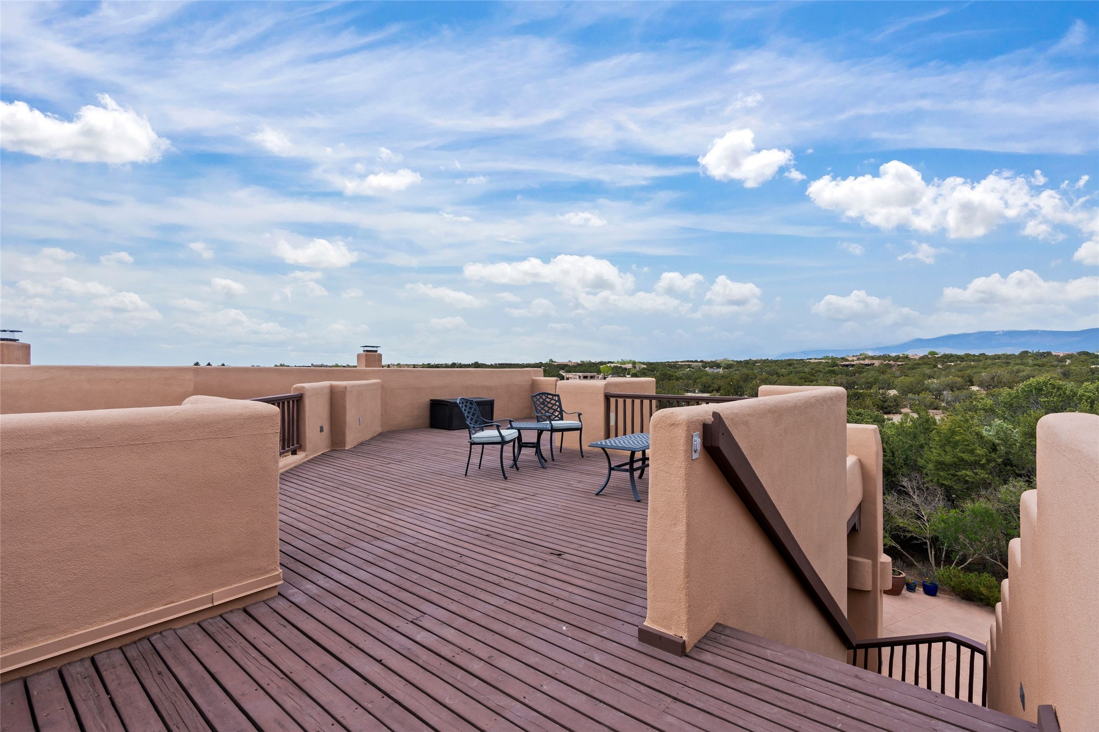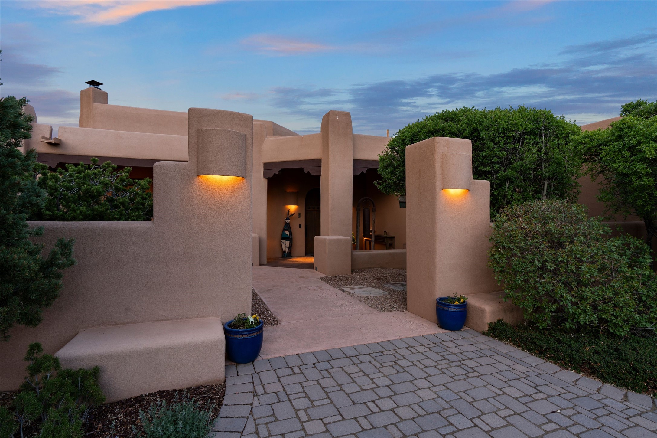 This Soft Contemporary 3-Bed + Den + Retreat / 3.5 -Bath home offers Sangre de Cristo Mountain Views in gated Las Campanas. The Great Room is truly Great, with 2 areas for socializing - One with a Kiva Fireplace, built-in TV / entertainment niche & doors to the Front Portal area. The other is a conversation area with a free-flowing kiva fireplace, wet bar, room for a Baby Grand Piano, Sangre de Cristo views plus access to the Back Portal area with wood-burning kiva fireplace. The Dining area is perfect for sharing meals & has access to the Back Portal area with Built-in BBQ & in-ground spa. The Kitchen has a Sub-Zero refrigerator, Bosch Dishwasher, Dacor Oven & Microwave plus a generous island with Dacor gas cooktop & prep sink. There is also a walk-in wine storage area plus Buffet & Butler's Pantry, both with ample storage. The Owner's Suite includes a kiva fireplace, walk-in closet & its own private portal with a Sangre de Cristo Mountain view. The Owner's Bath offers 2 separate vanities, 2 separate water closets, walk-in shower with body sprays & direct access to the In-ground Spa & outdoor shower. Also in the Owner's Suite wing, there is a private Den / Office with walk-in closet & outdoor access through double French doors as well as a south-facing Library / Retreat area. Two secondary bedrooms, each with their own bathrooms, are on the opposite side of the home, creating privacy from the Owner's Suite. The spacious outdoor area offers a multitude of desirable features - Private In-Ground Spa, Outdoor Shower, Built-in BBQ, Extensive shaded portal areas with wood-burning fireplace & a spacious roof deck with 360-degree Mountain Views. The 3-car garage includes a third, separate stall that can be used as a studio. This fabulous home checks all the boxes - 3 Bedrooms + Den + Retreat * 3 Baths * 3-Car Garage * In-ground Spa * Outdoor Shower * Spacious Roof Deck * Sangre de Cristo Mountain views - Make it yours Today!