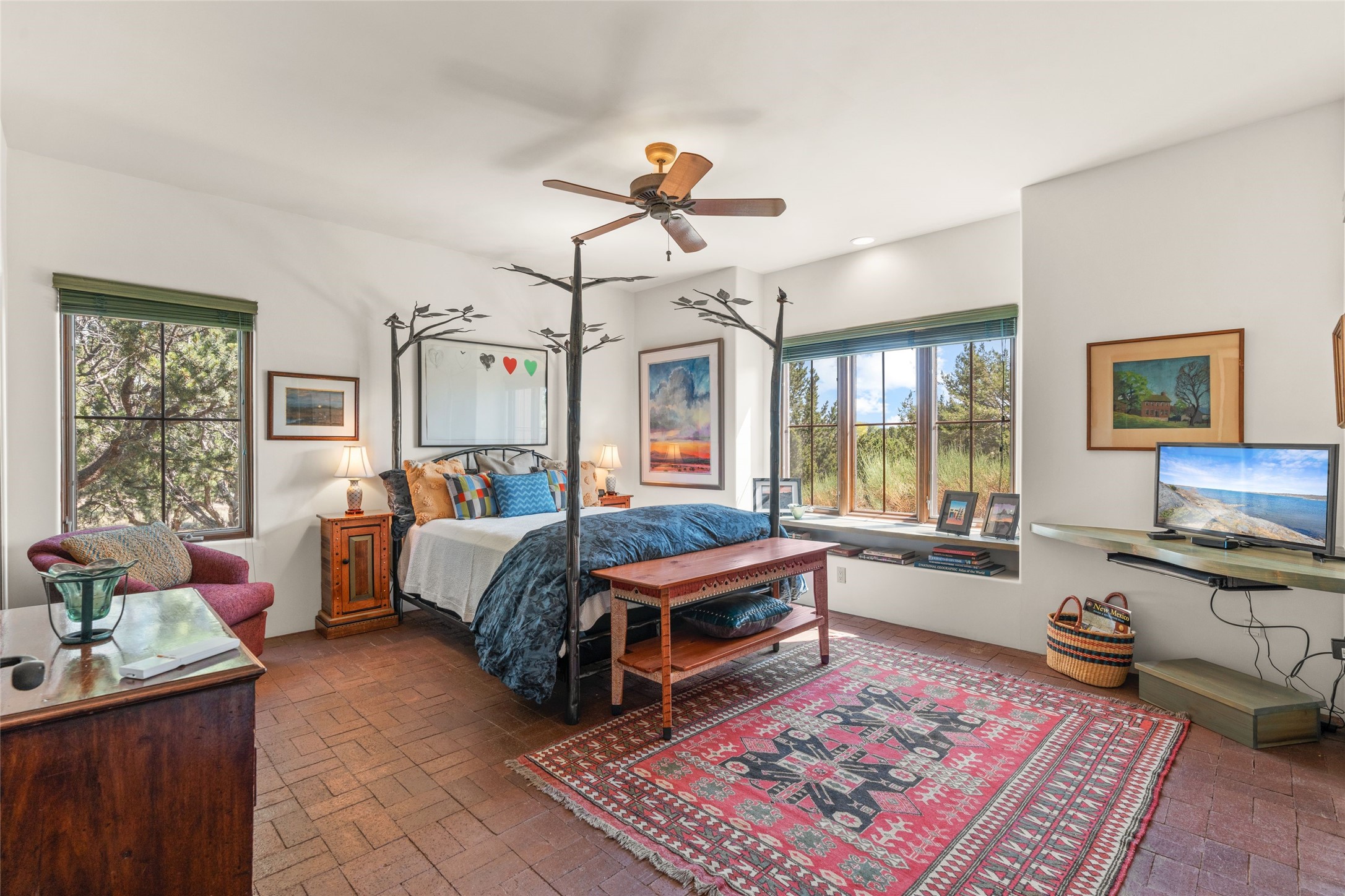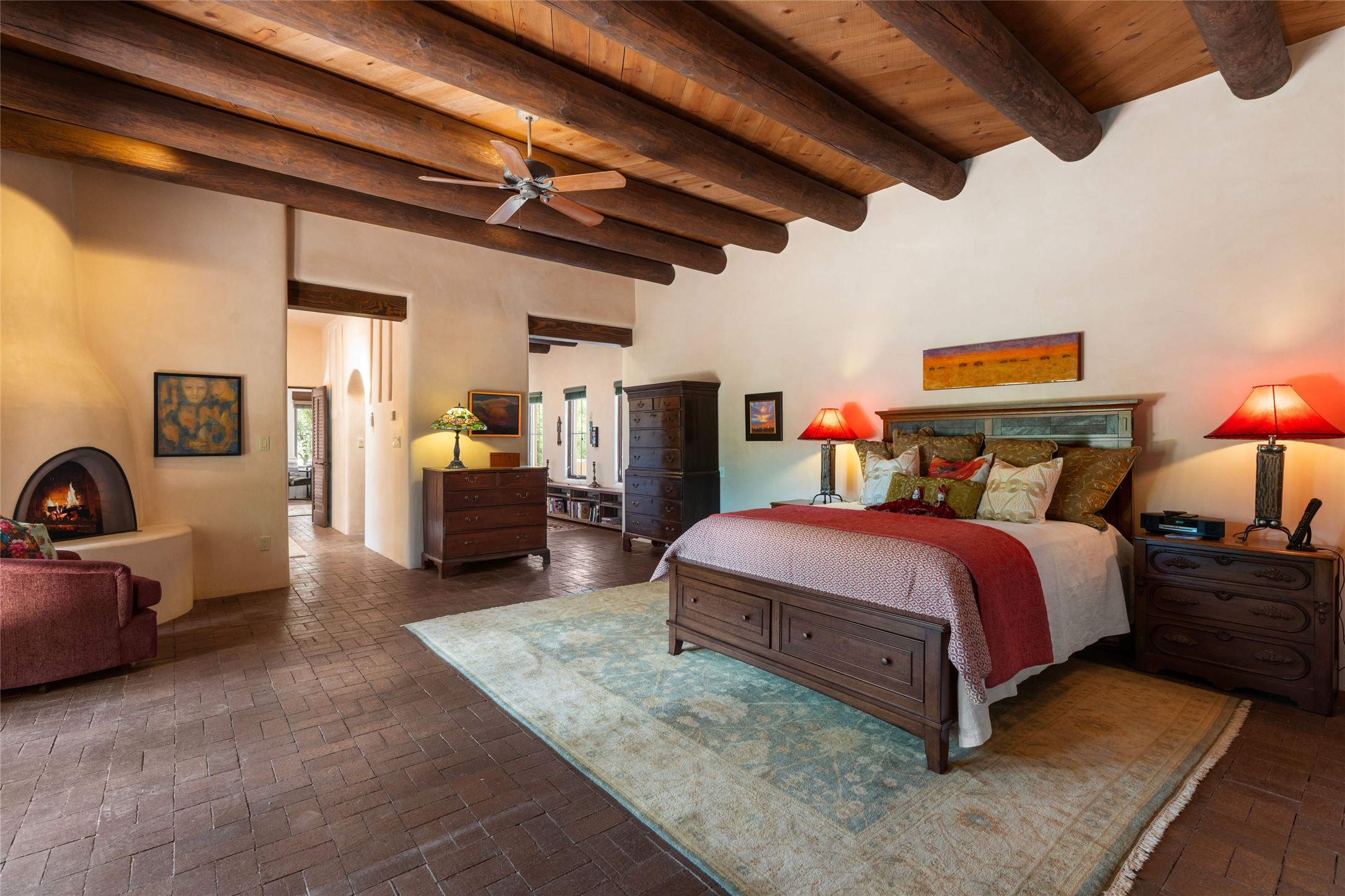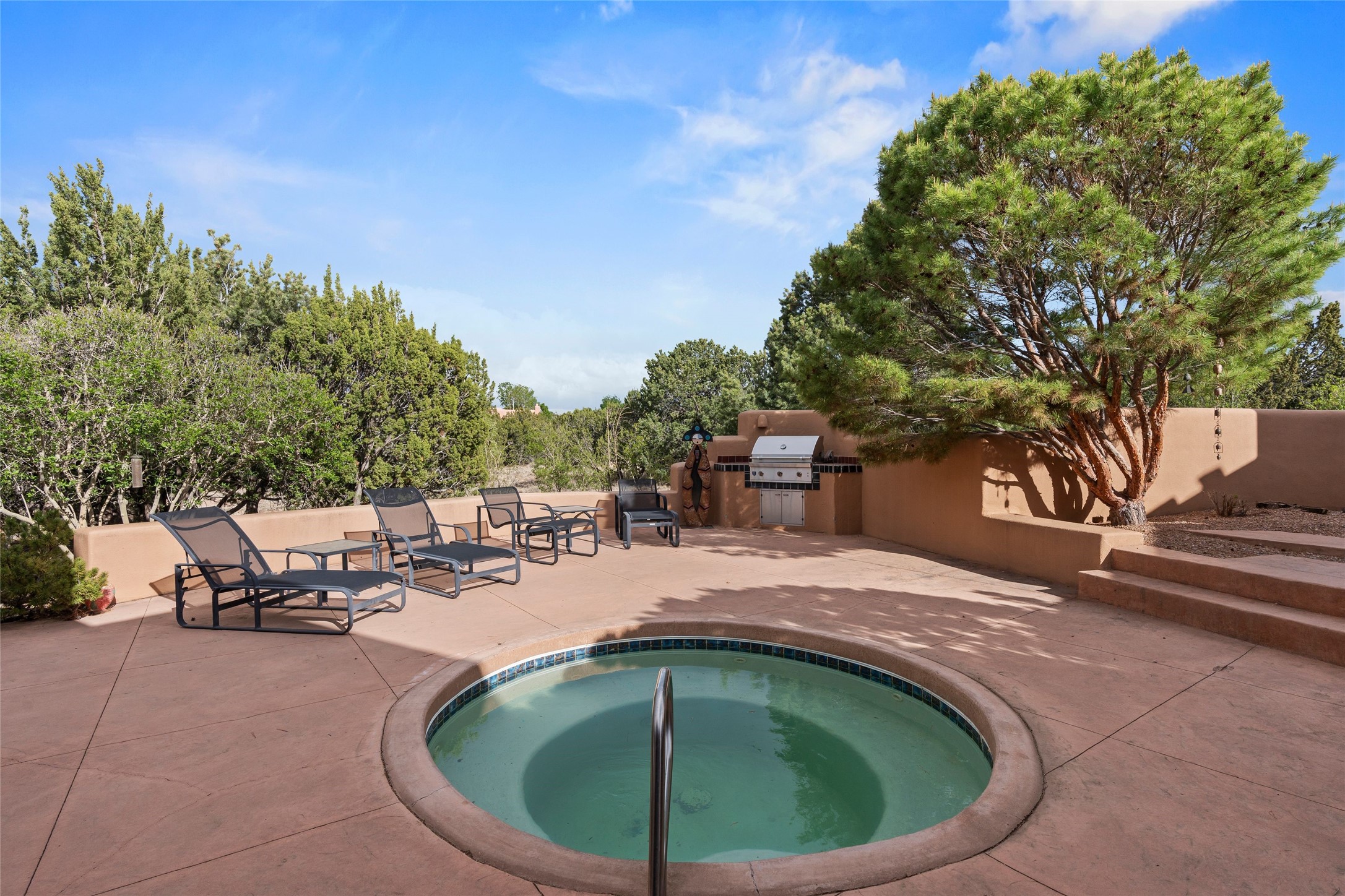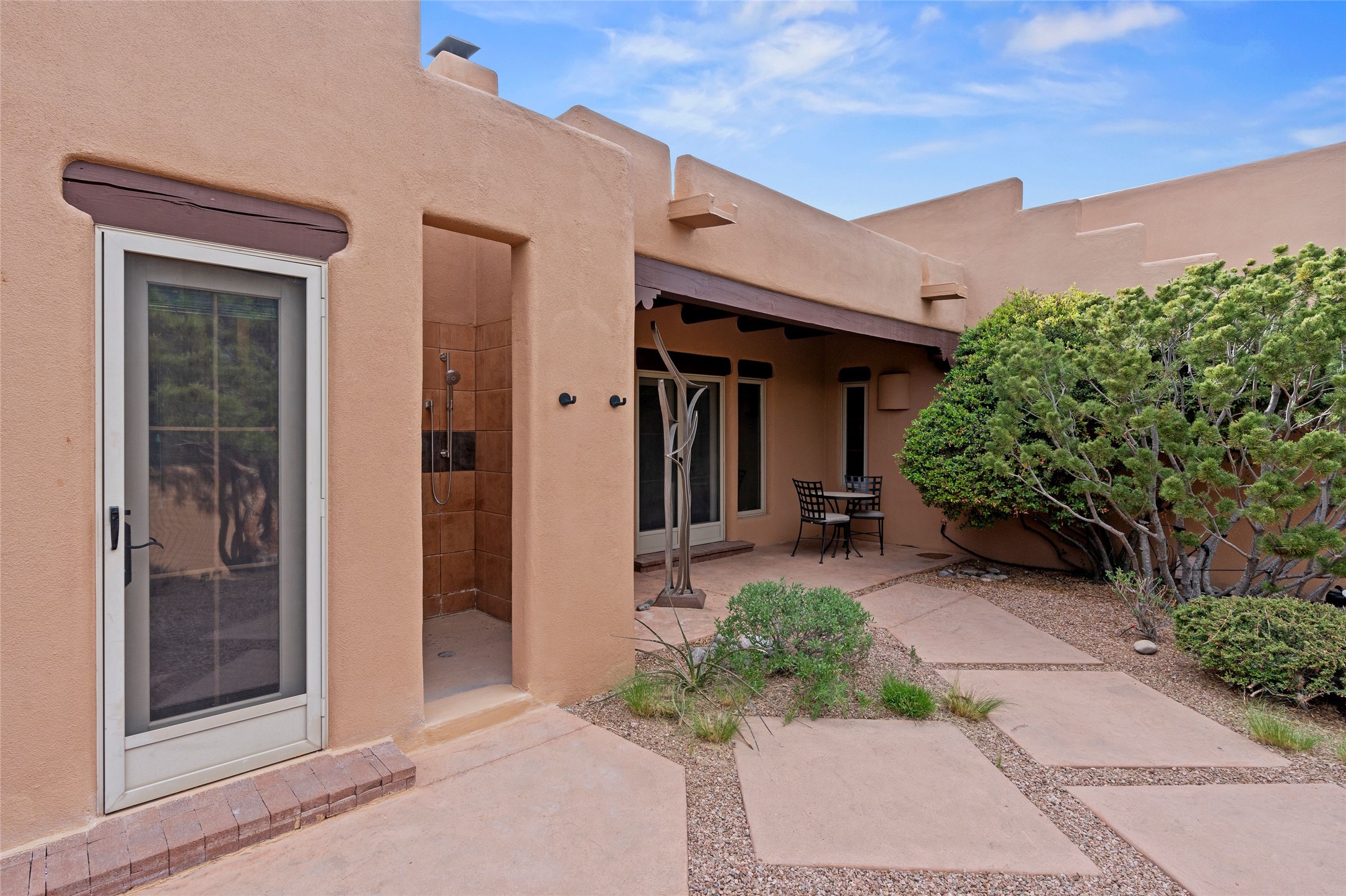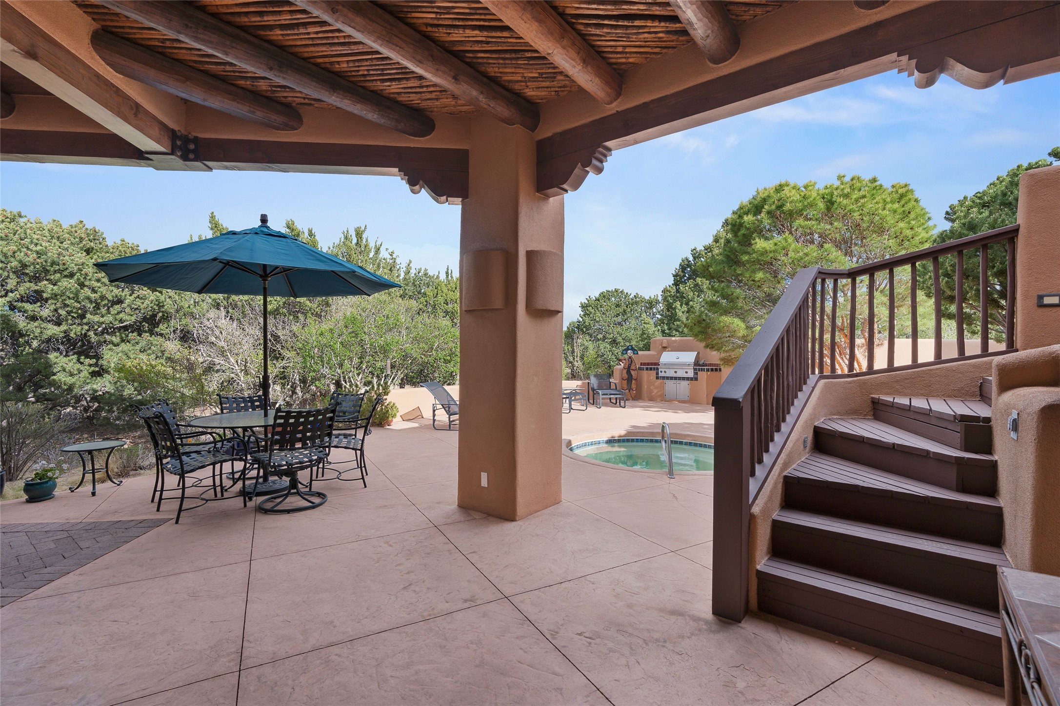 This Soft Contemporary 3-Bed + Den + Retreat / 3.5 -Bath home offers Sangre de Cristo Mountain Views in gated Las Campanas. The Great Room is truly Great, with 2 areas for socializing - One with a Kiva Fireplace, built-in TV / entertainment niche & doors to the Front Portal area. The other is a conversation area with a free-flowing kiva fireplace, wet bar, room for a Baby Grand Piano, Sangre de Cristo views plus access to the Back Portal area with wood-burning kiva fireplace. The Dining area is perfect for sharing meals & has access to the Back Portal area with Built-in BBQ & in-ground spa. The Kitchen has a Sub-Zero refrigerator, Bosch Dishwasher, Dacor Oven & Microwave plus a generous island with Dacor gas cooktop & prep sink. There is also a walk-in wine storage area plus Buffet & Butler's Pantry, both with ample storage. The Owner's Suite includes a kiva fireplace, walk-in closet & its own private portal with a Sangre de Cristo Mountain view. The Owner's Bath offers 2 separate vanities, 2 separate water closets, walk-in shower with body sprays & direct access to the In-ground Spa & outdoor shower. Also in the Owner's Suite wing, there is a private Den / Office with walk-in closet & outdoor access through double French doors as well as a south-facing Library / Retreat area. Two secondary bedrooms, each with their own bathrooms, are on the opposite side of the home, creating privacy from the Owner's Suite. The spacious outdoor area offers a multitude of desirable features - Private In-Ground Spa, Outdoor Shower, Built-in BBQ, Extensive shaded portal areas with wood-burning fireplace & a spacious roof deck with 360-degree Mountain Views. The 3-car garage includes a third, separate stall that can be used as a studio. This fabulous home checks all the boxes - 3 Bedrooms + Den + Retreat * 3 Baths * 3-Car Garage * In-ground Spa * Outdoor Shower * Spacious Roof Deck * Sangre de Cristo Mountain views - Make it yours Today!